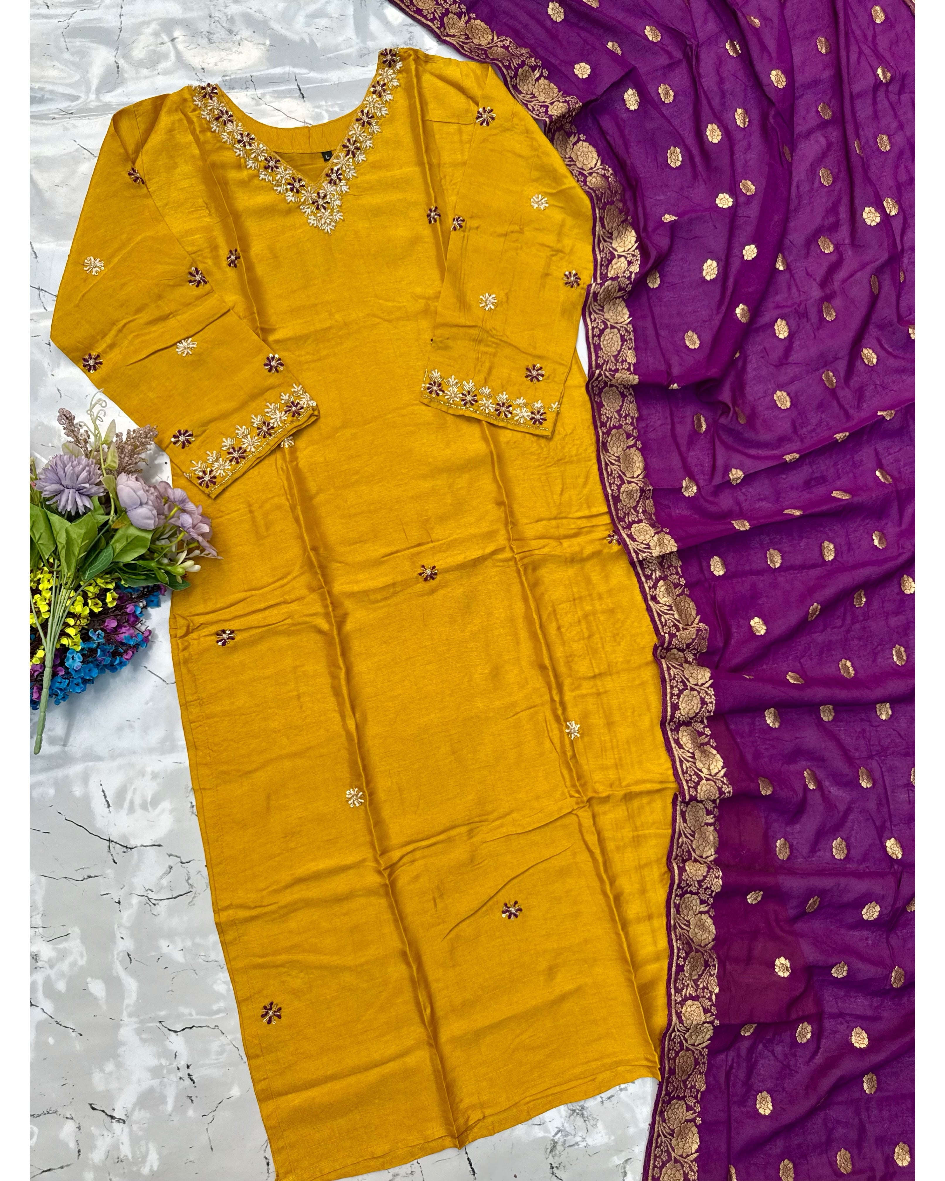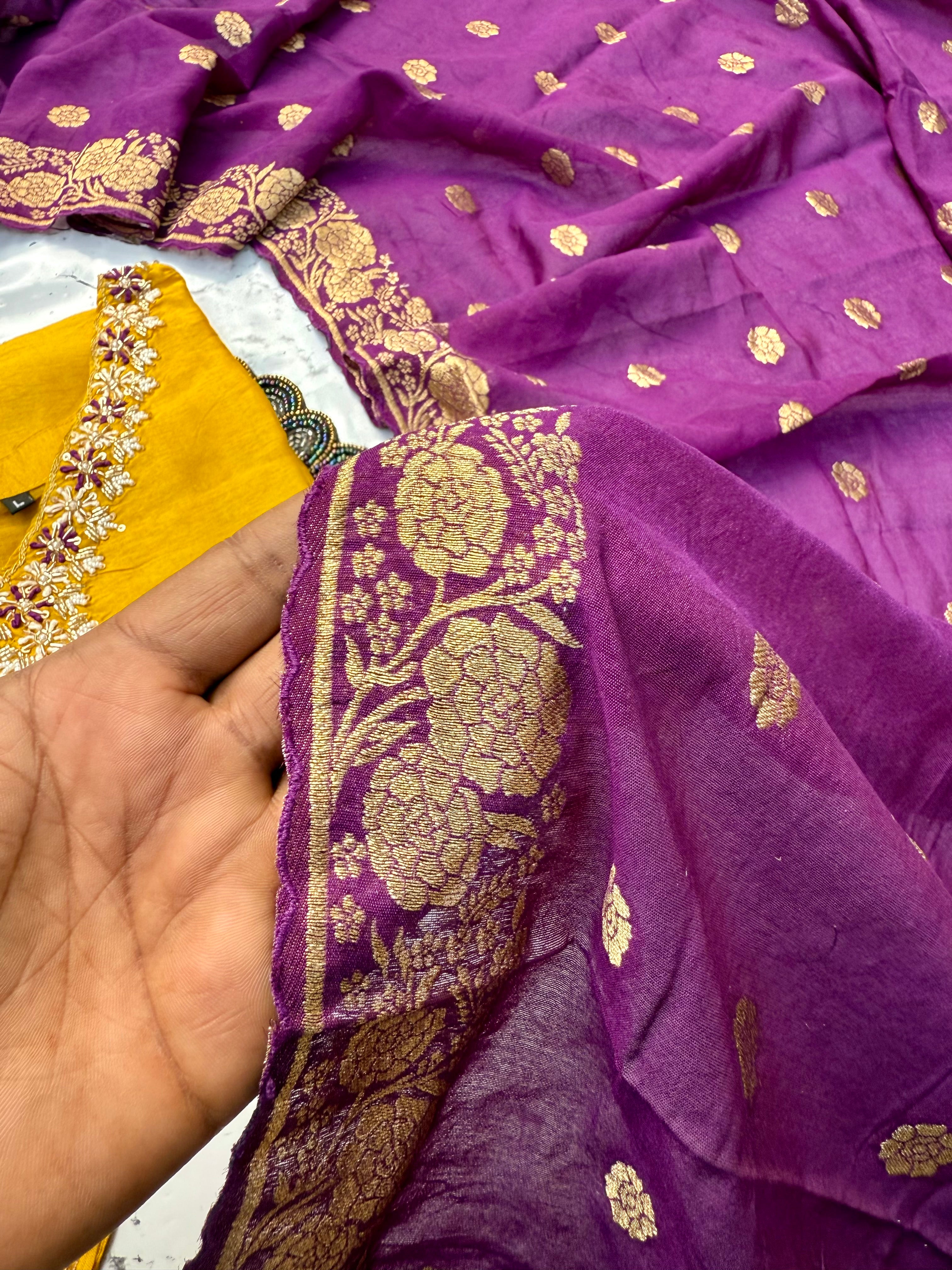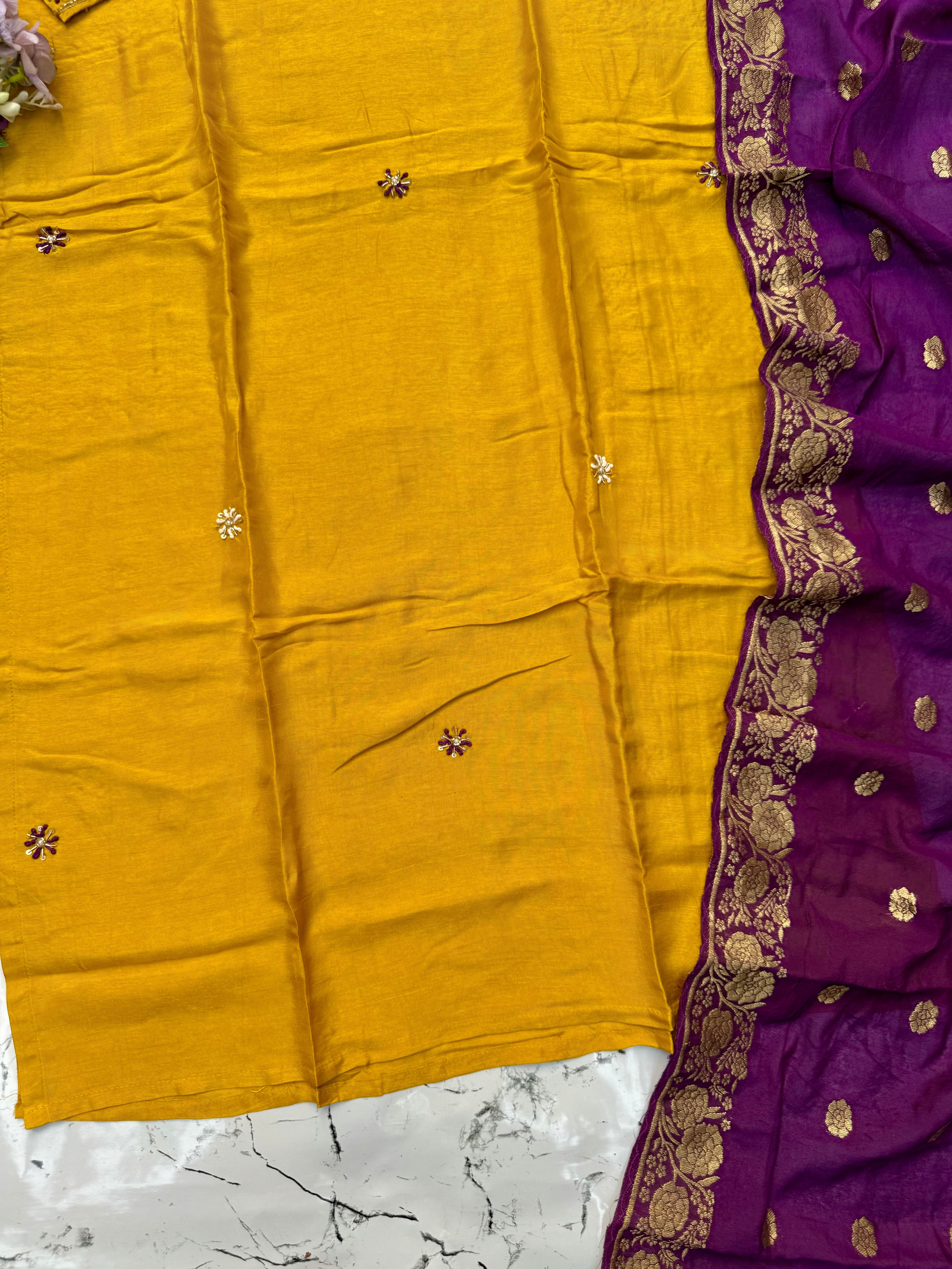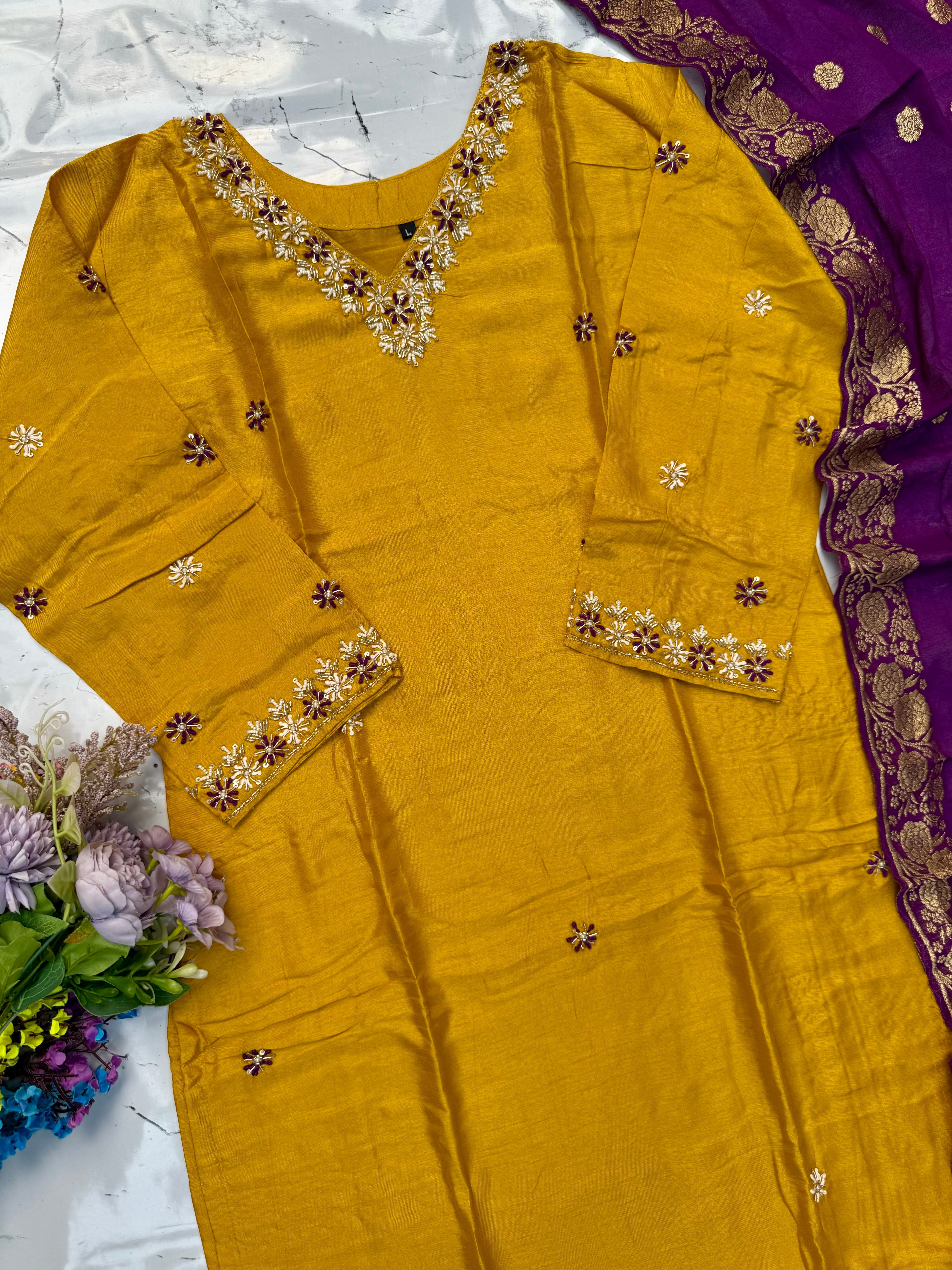 A very beautiful piece with heavy handwork on the yoke and sleeve of the kurta with a beautiful Banarsi dupatta and a dola silk bottom