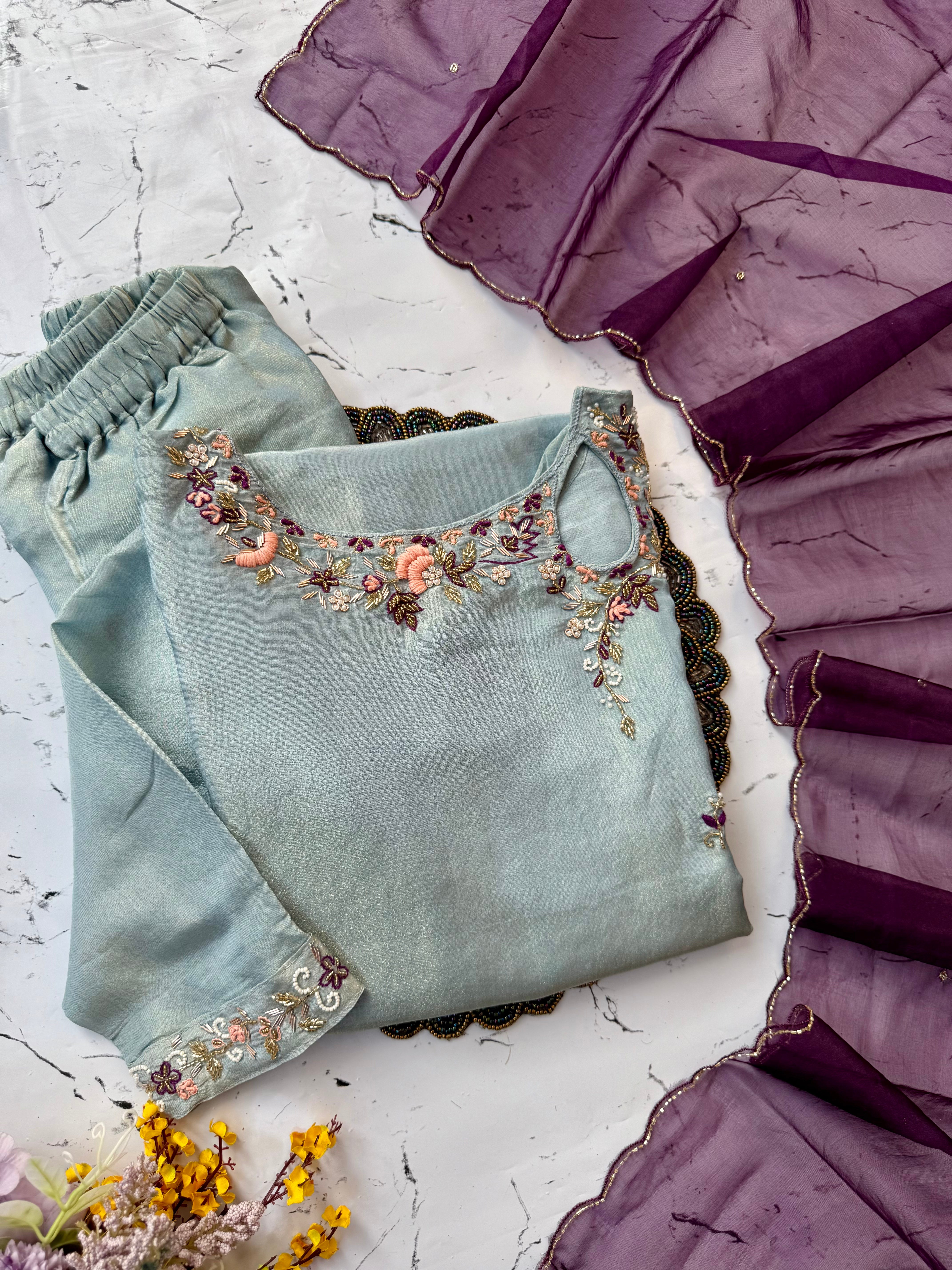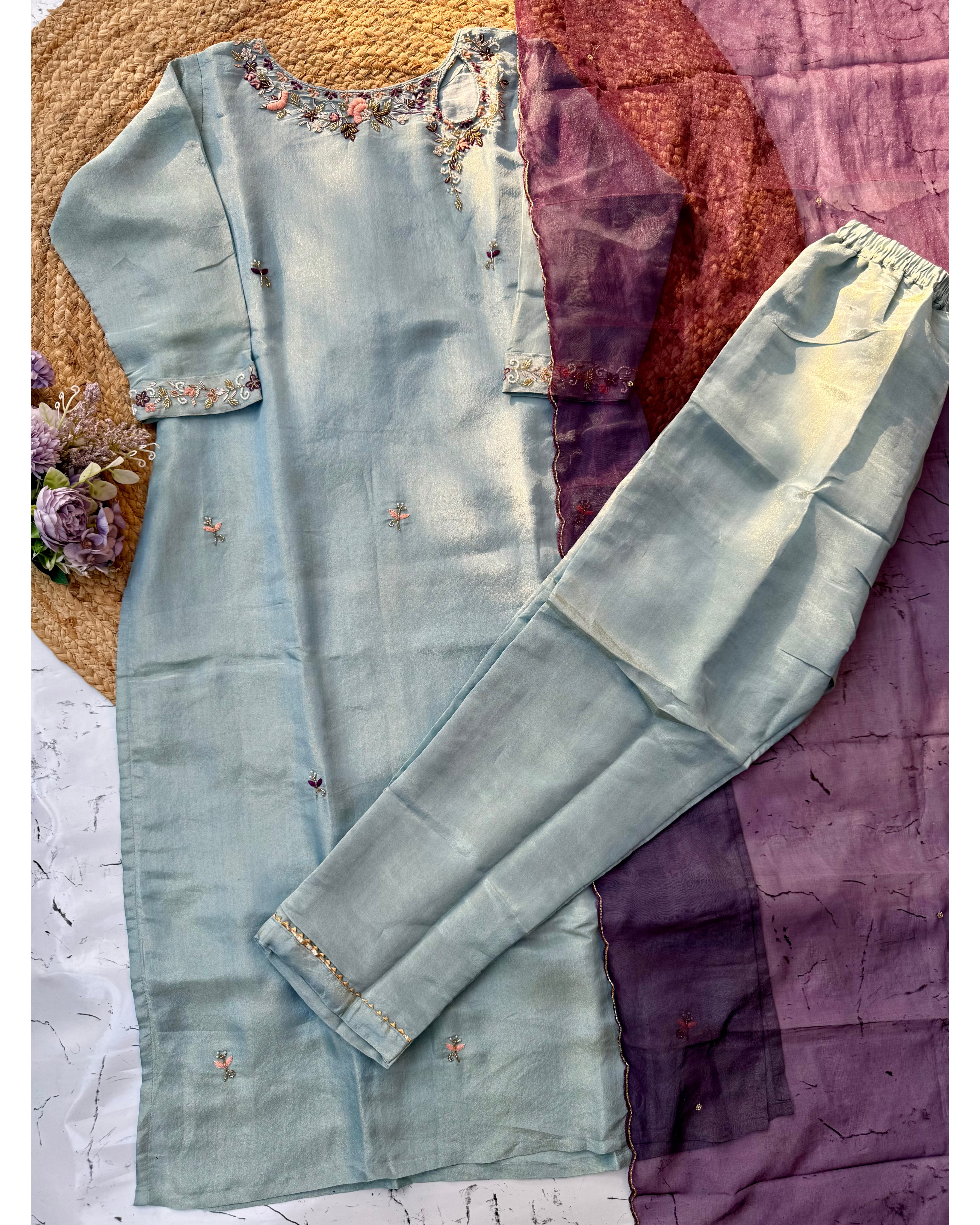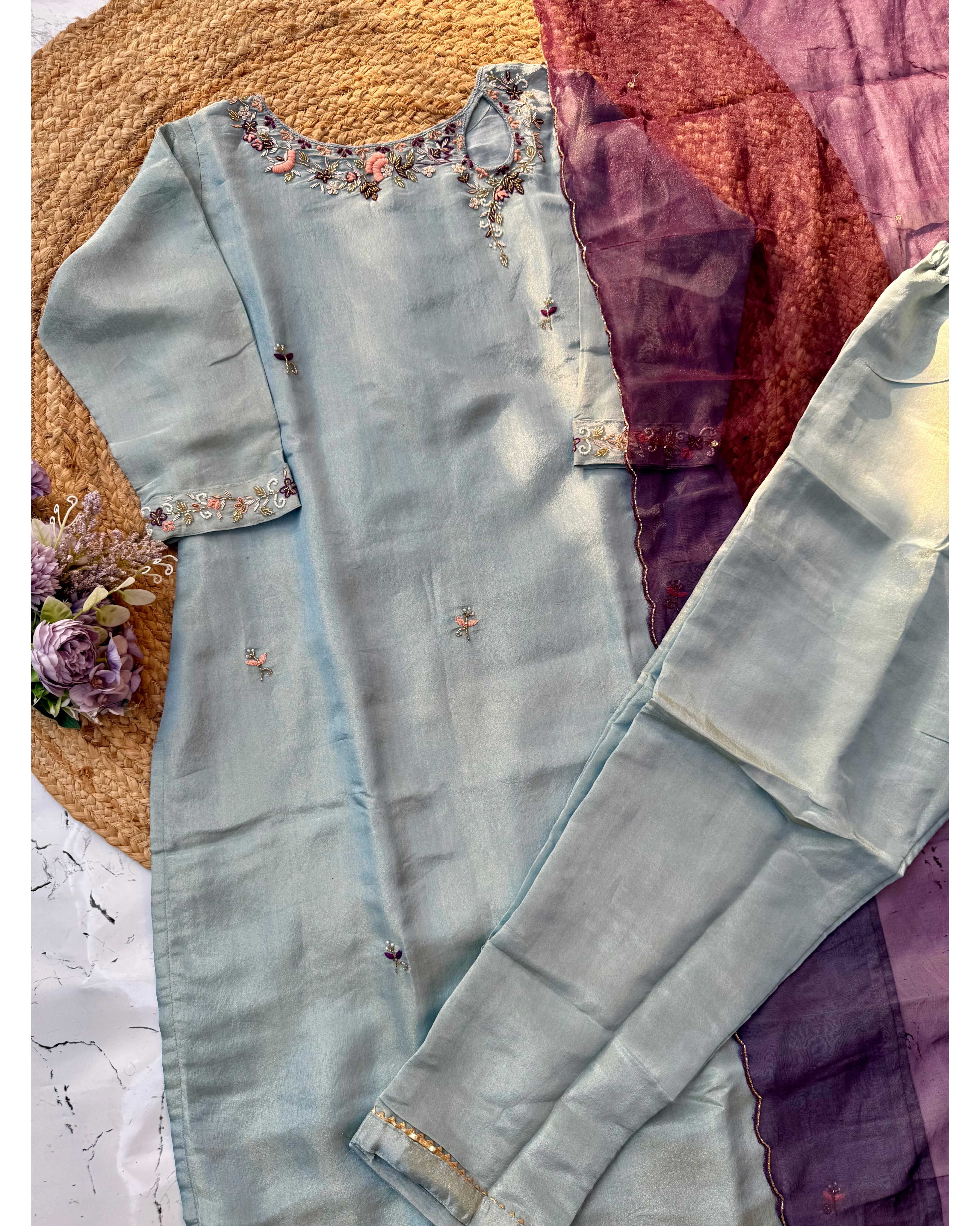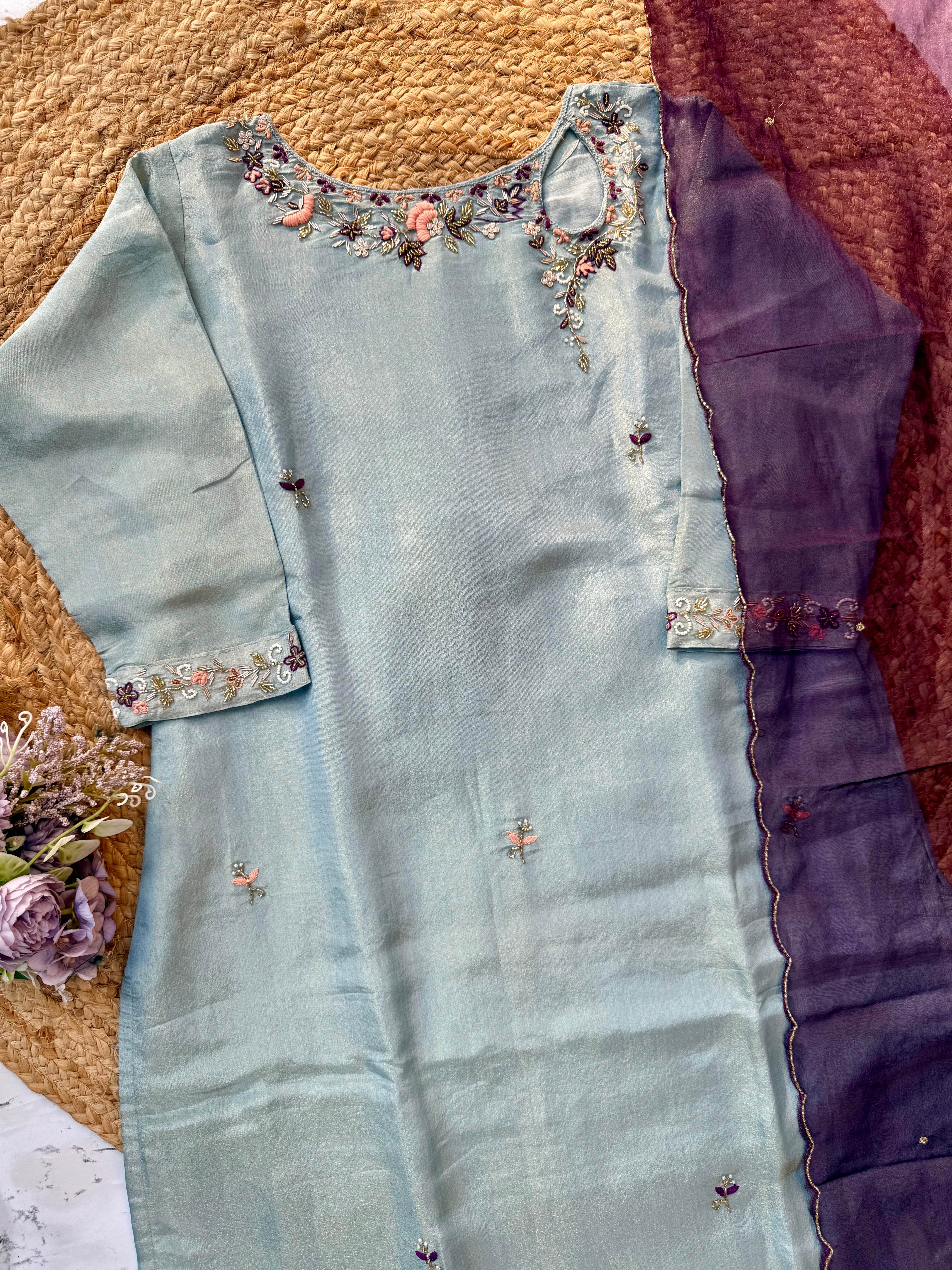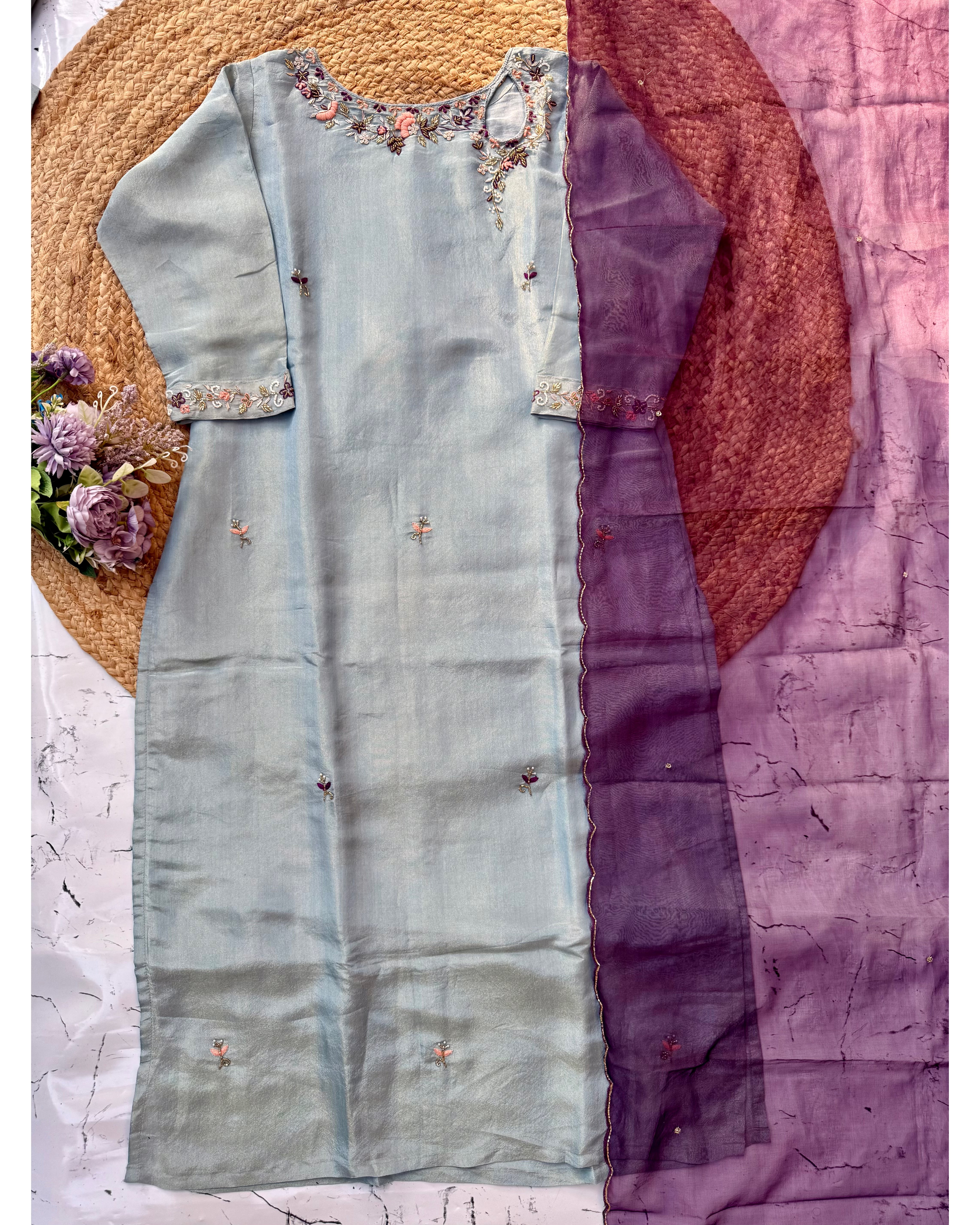 A very beautiful piece with handwork on the yoke and sleeve of the kurta with a beautiful sided scallop tissue organza dupatta and a tissue silk bottom