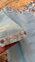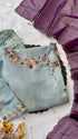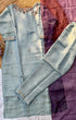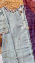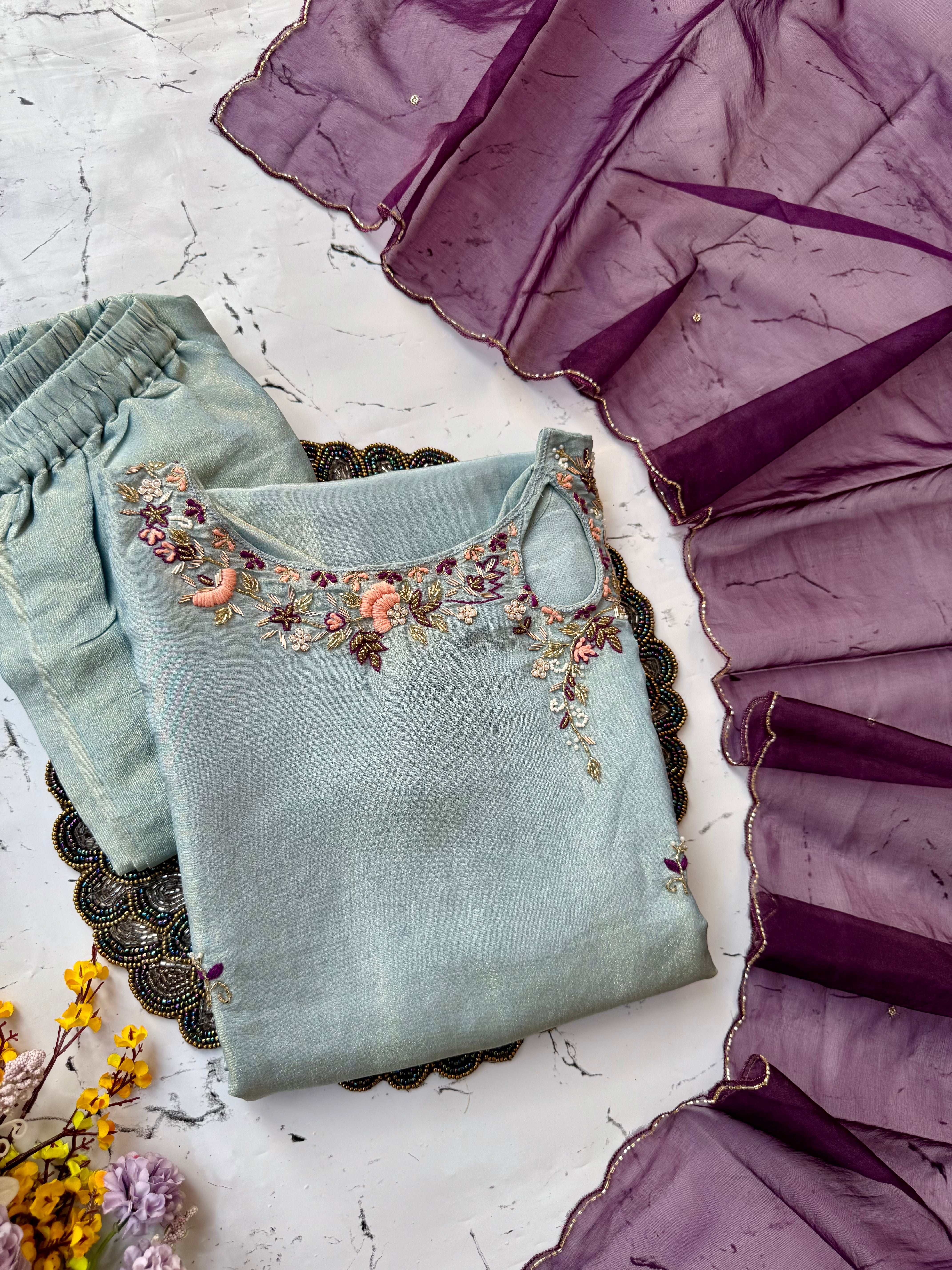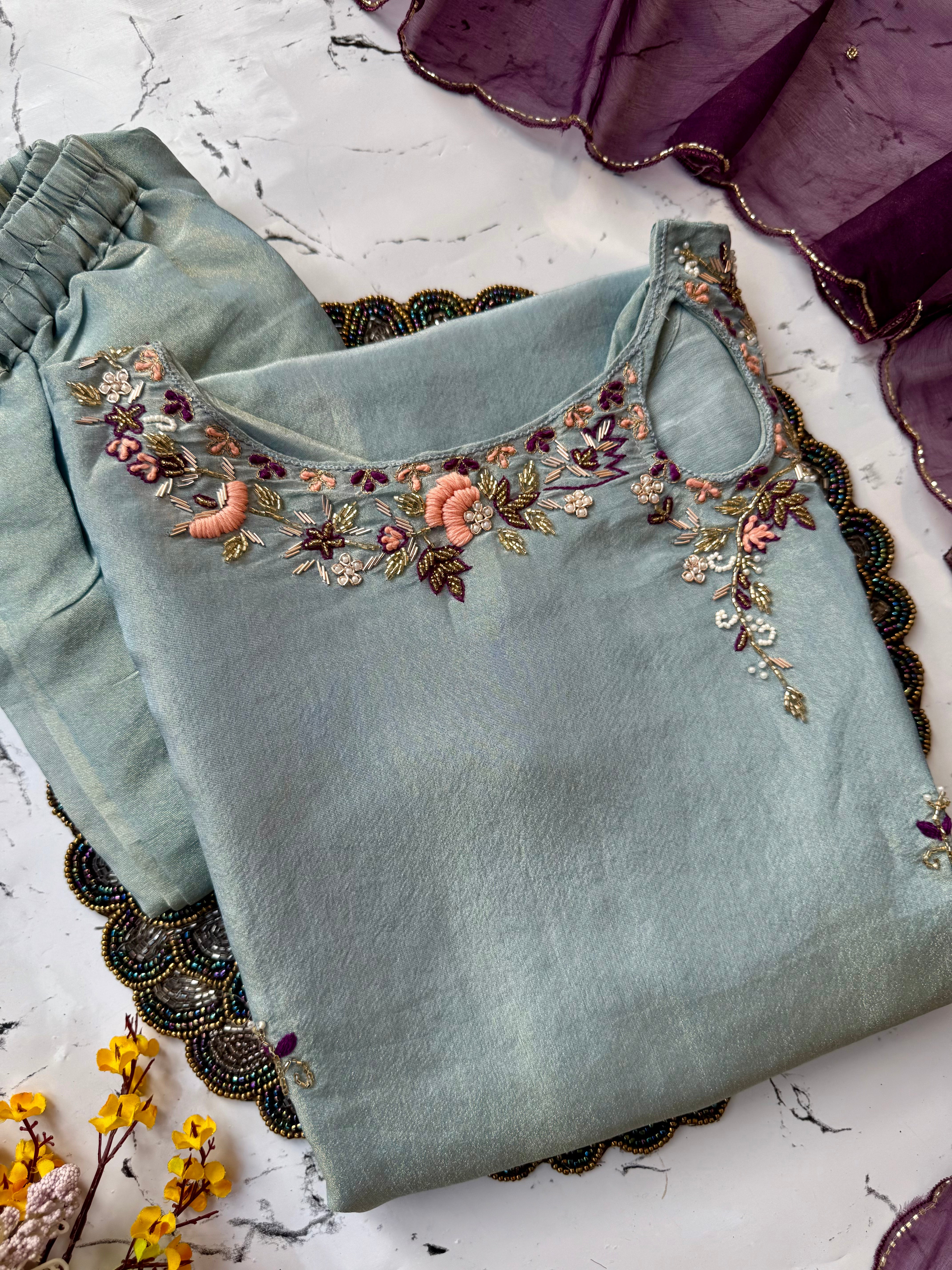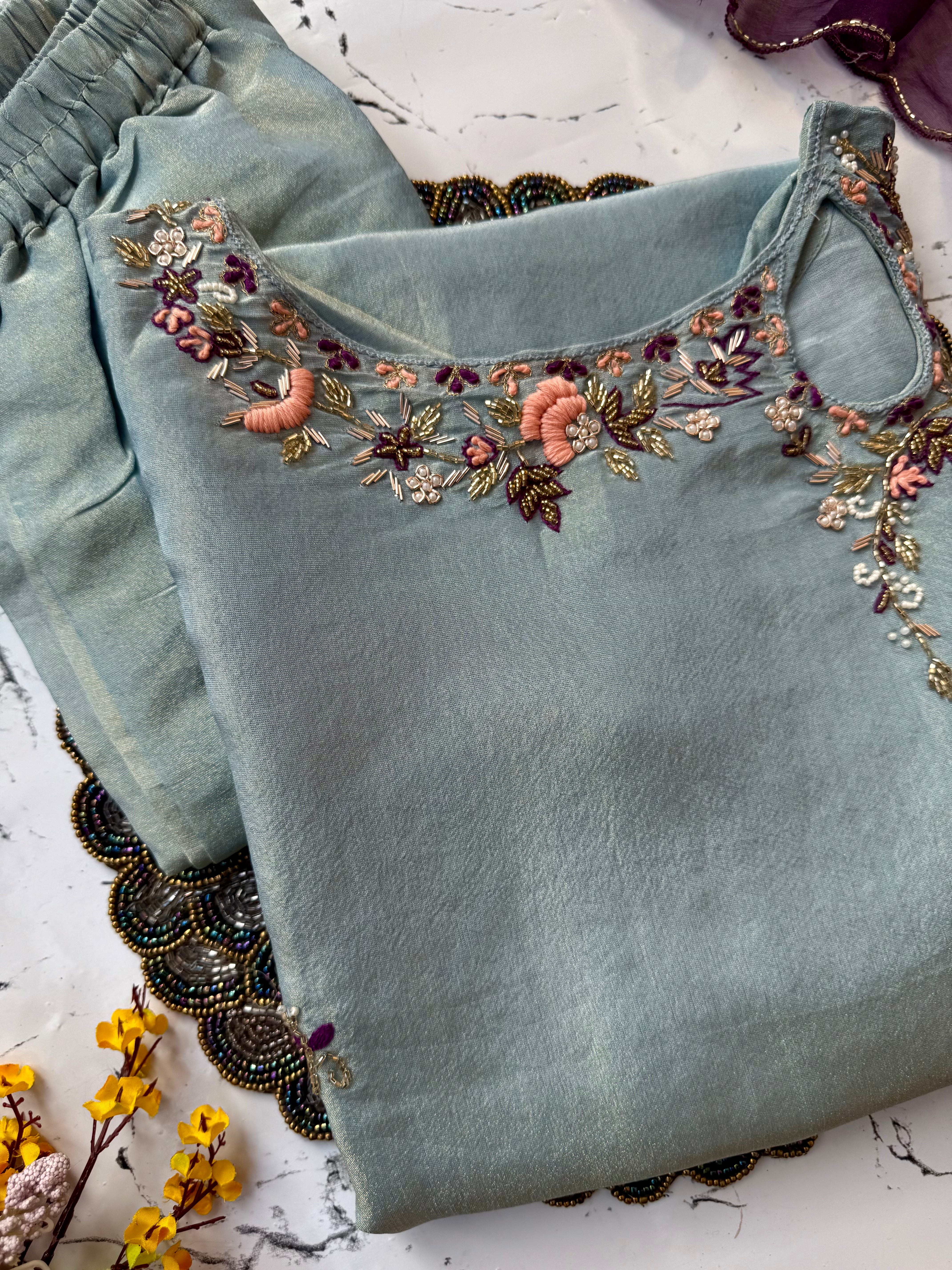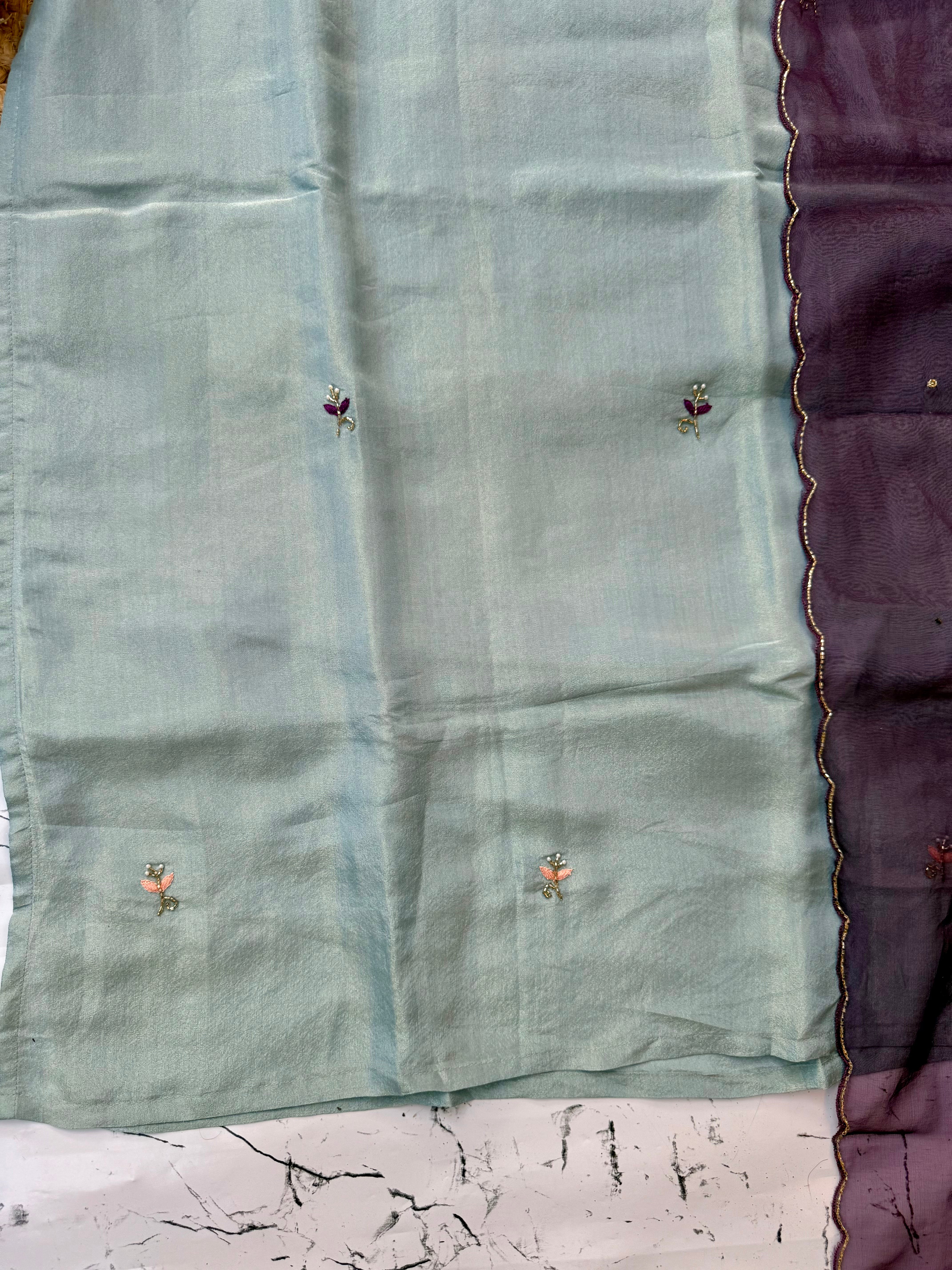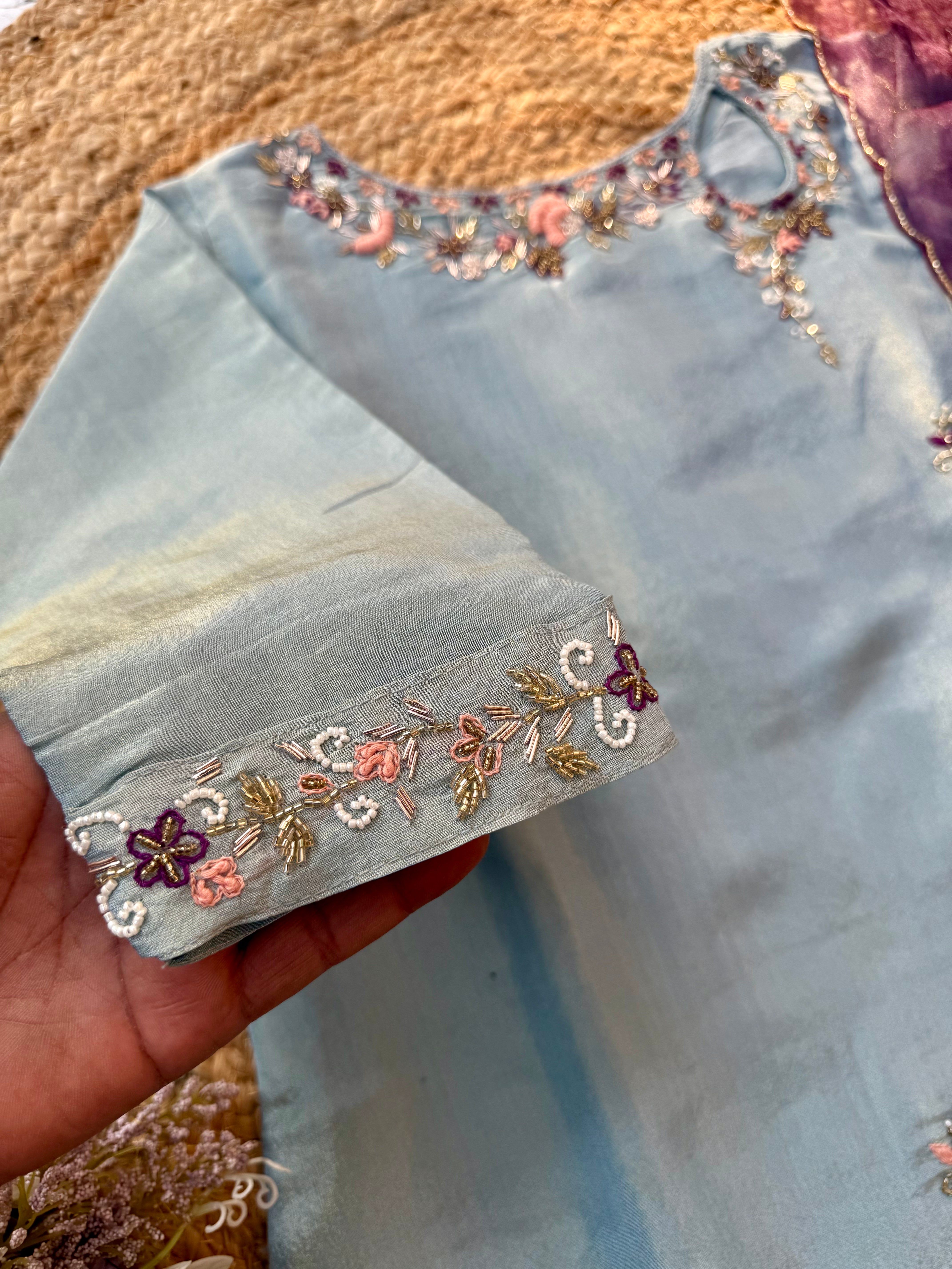 A very beautiful piece with handwork on the yoke and sleeve of the kurta with a beautiful sided scallop tissue organza dupatta and a tissue silk bottom