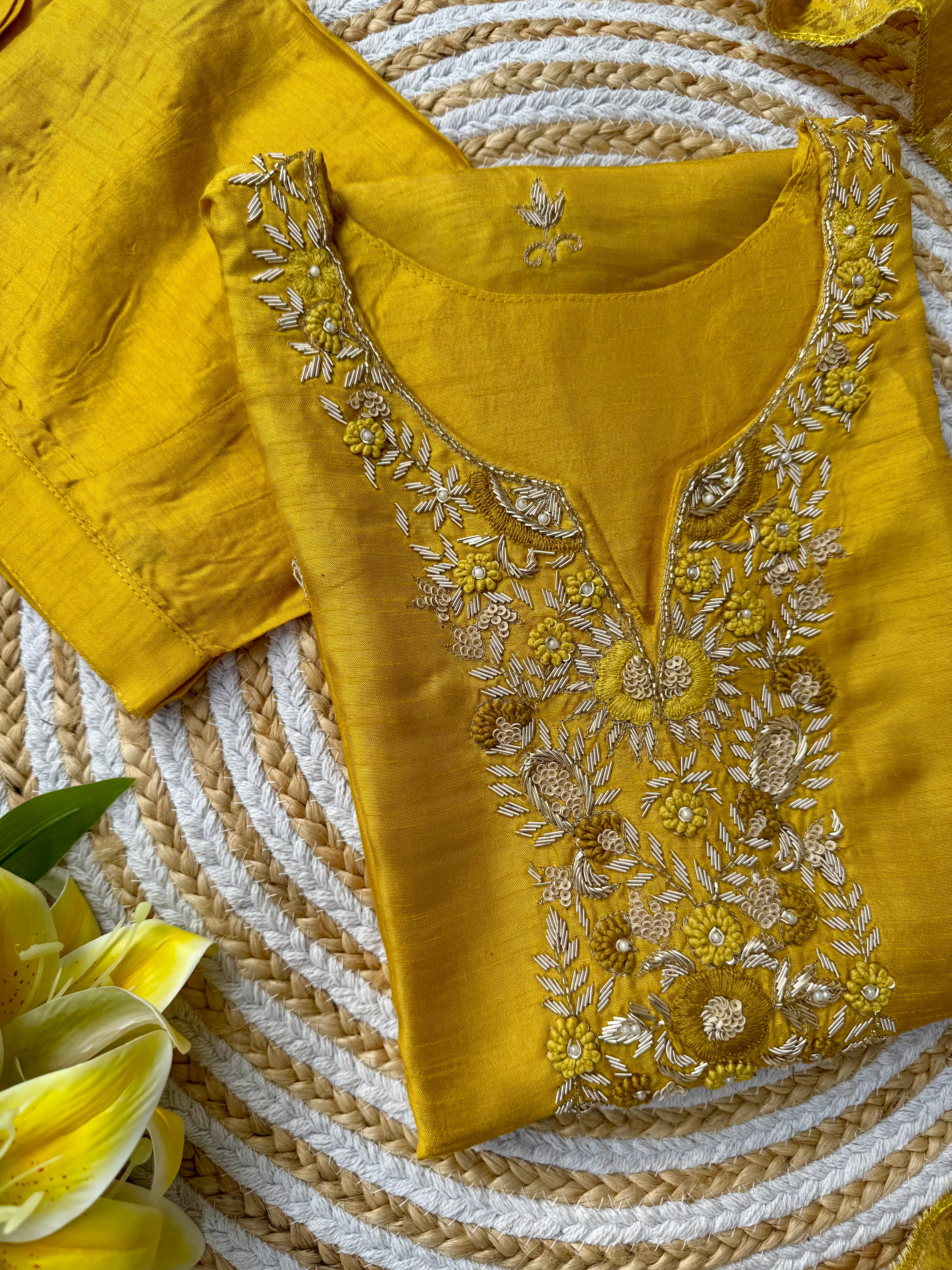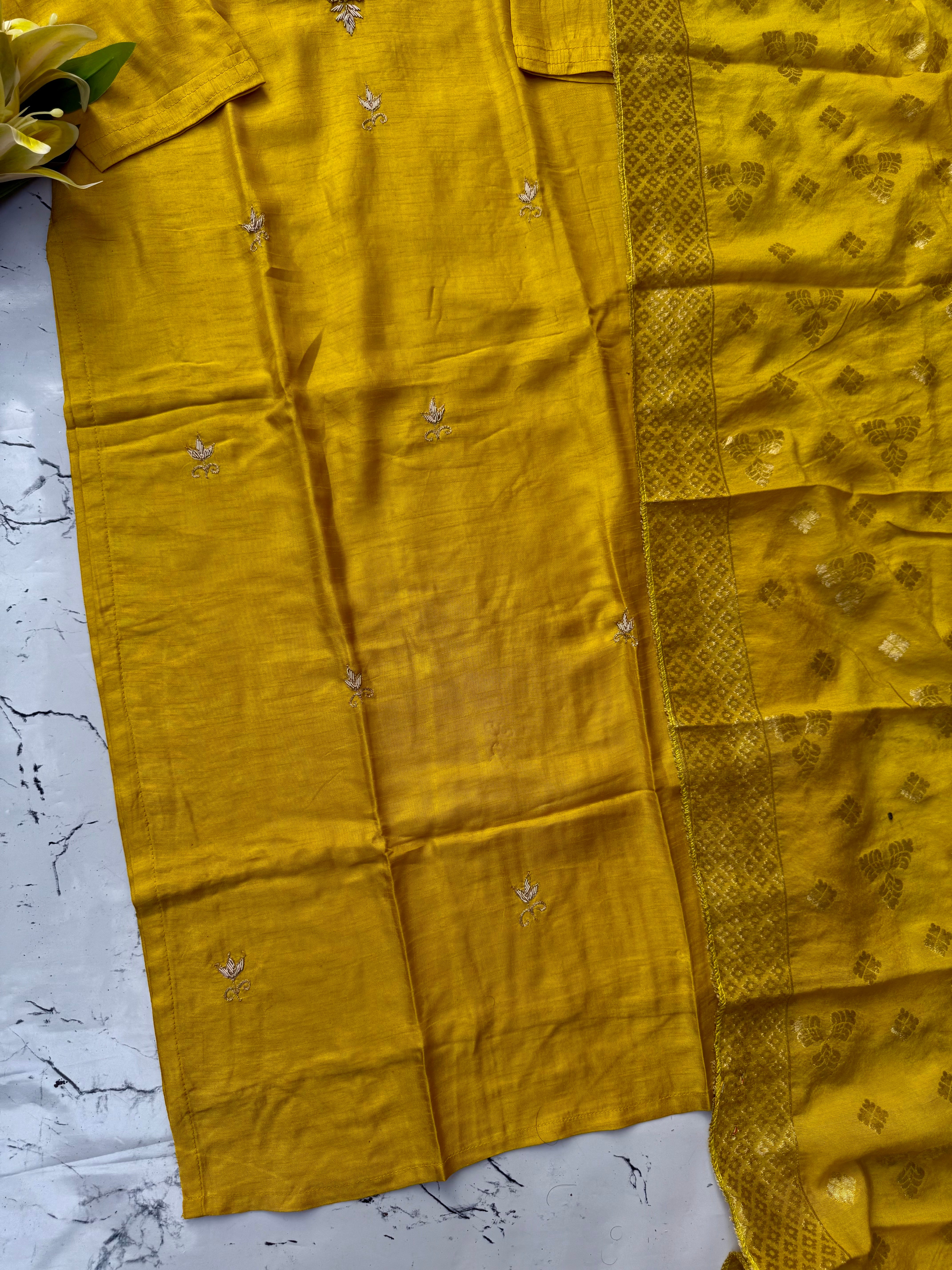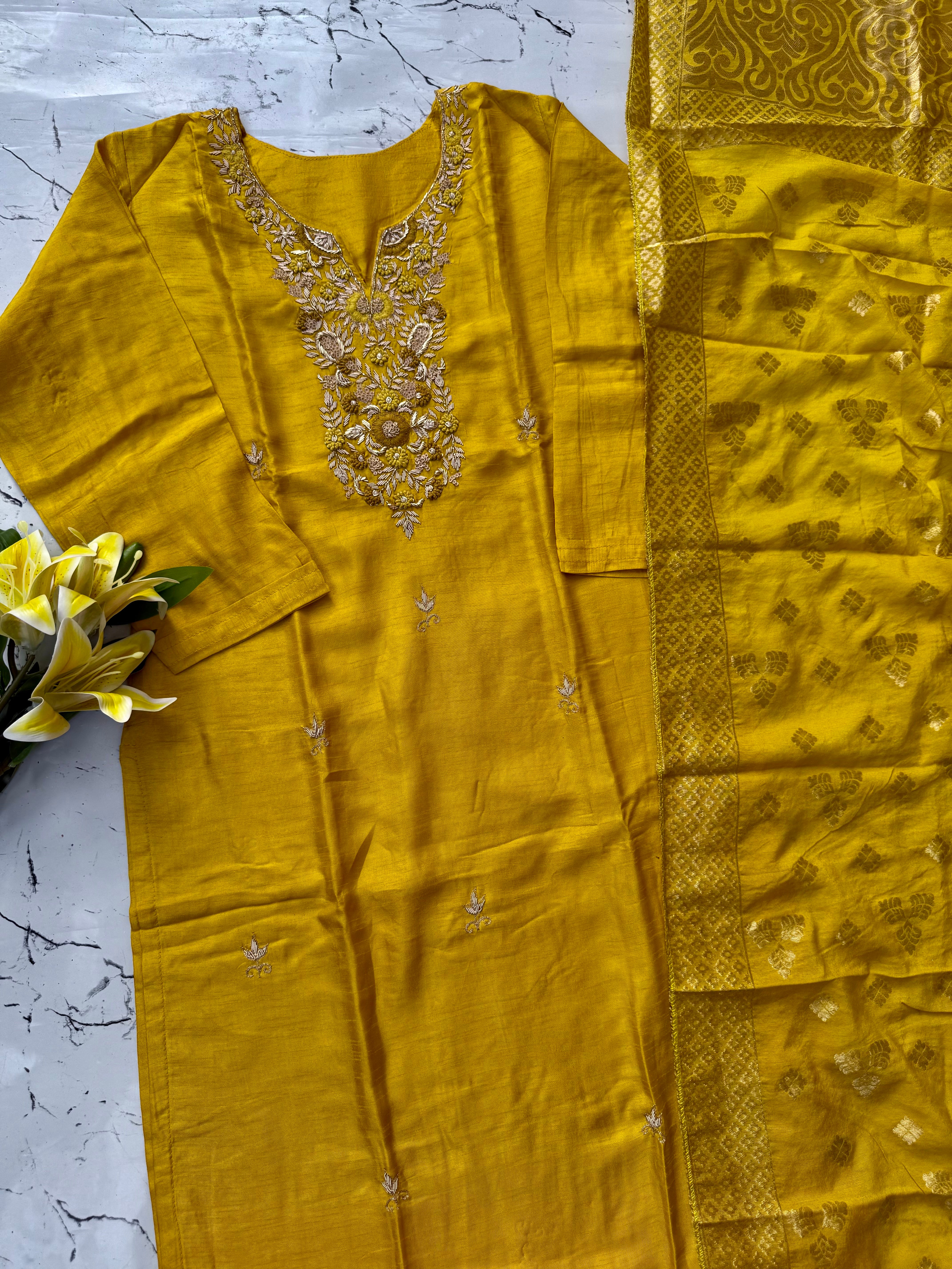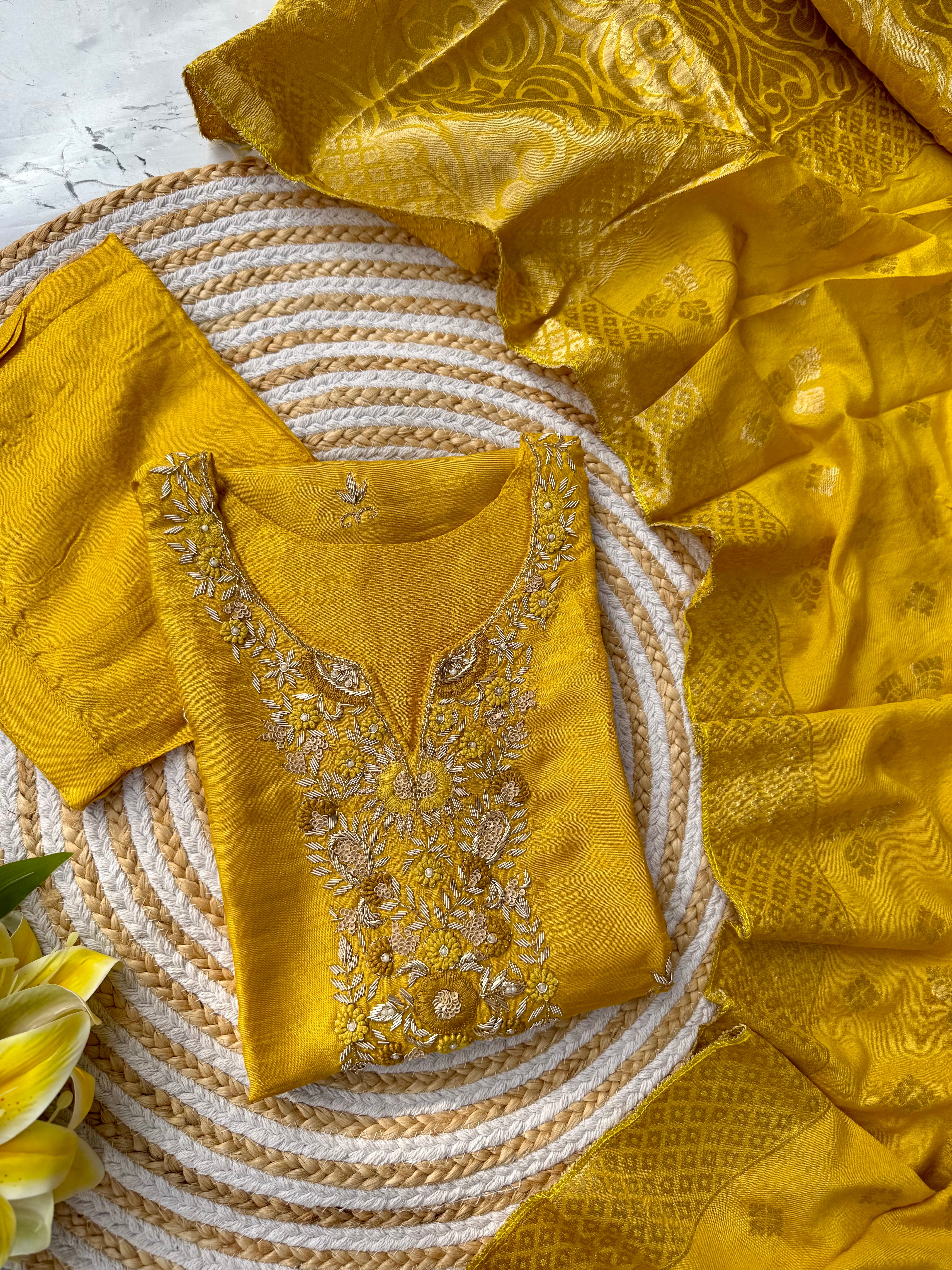 A very beautiful piece with heavy handwork on the yoke of the kurta with a beautiful banarsi dupatta and a dola silk bottom