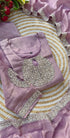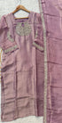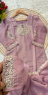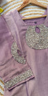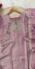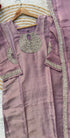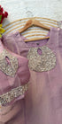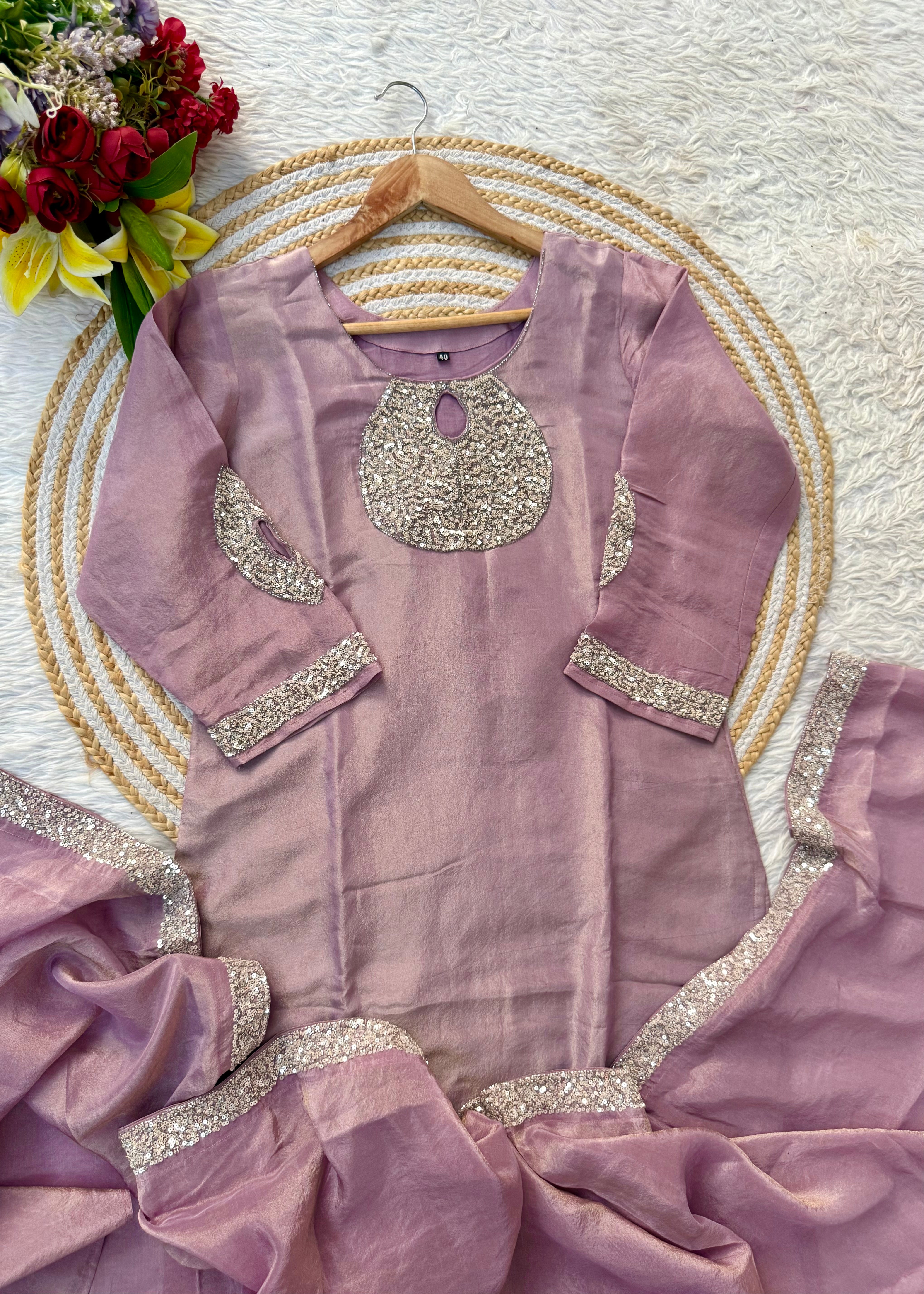 Beautiful brown with gold tone shimmer tissue kurta set with intricate handwork on the yoke and sleeve with a heavy handwork scallop viscose organza dupatta paired with a plane silk bottom