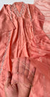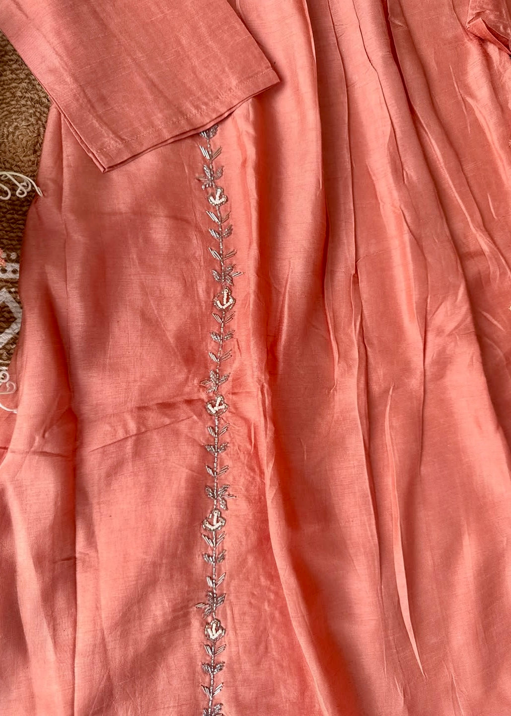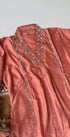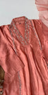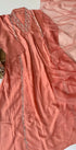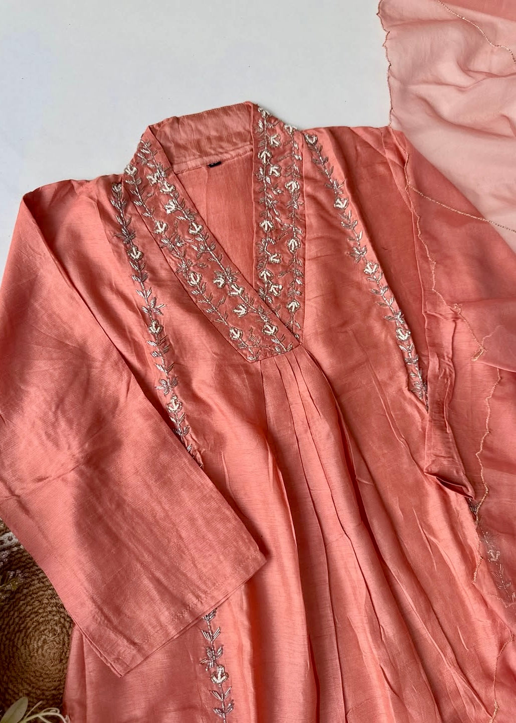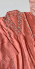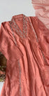 Handcrafted Dola silk kurti with heavy handwork all over the top with a handwork detailed long voice dupatta with a Dola silk bottom .