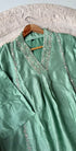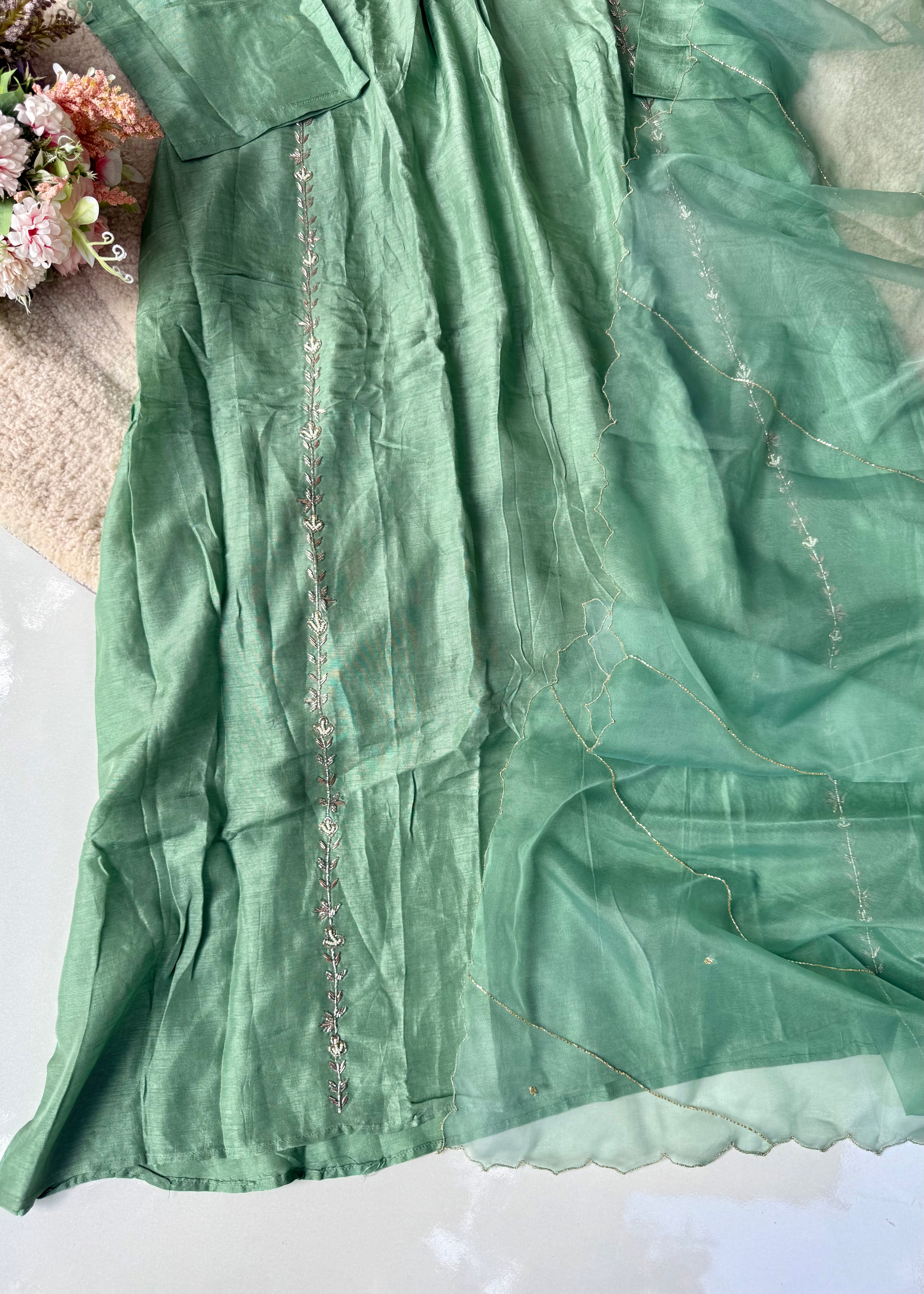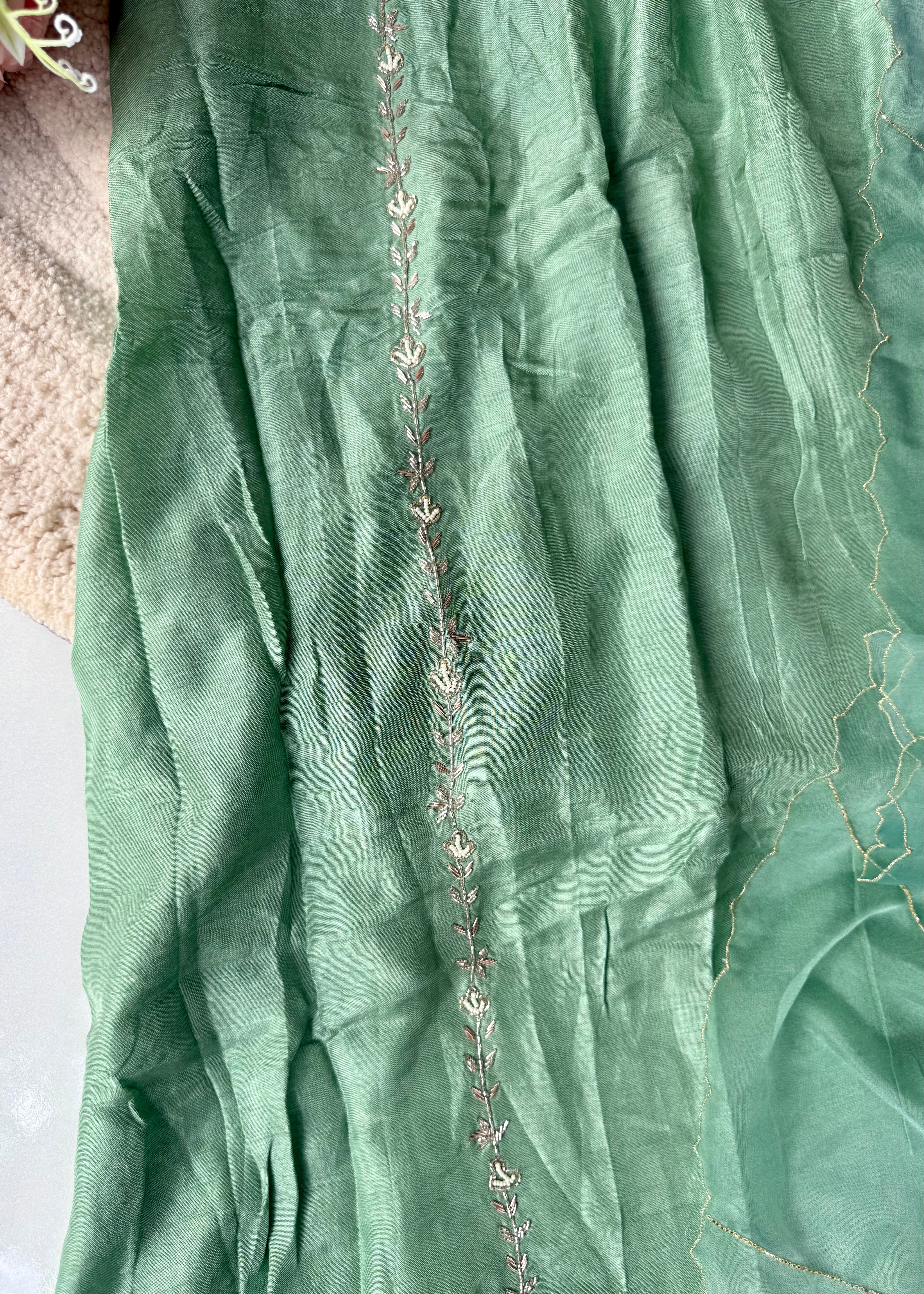Handcrafted Dola silk kurti with heavy handwork all over the top with a handwork detailed long voice dupatta with a Dola silk bottom .