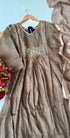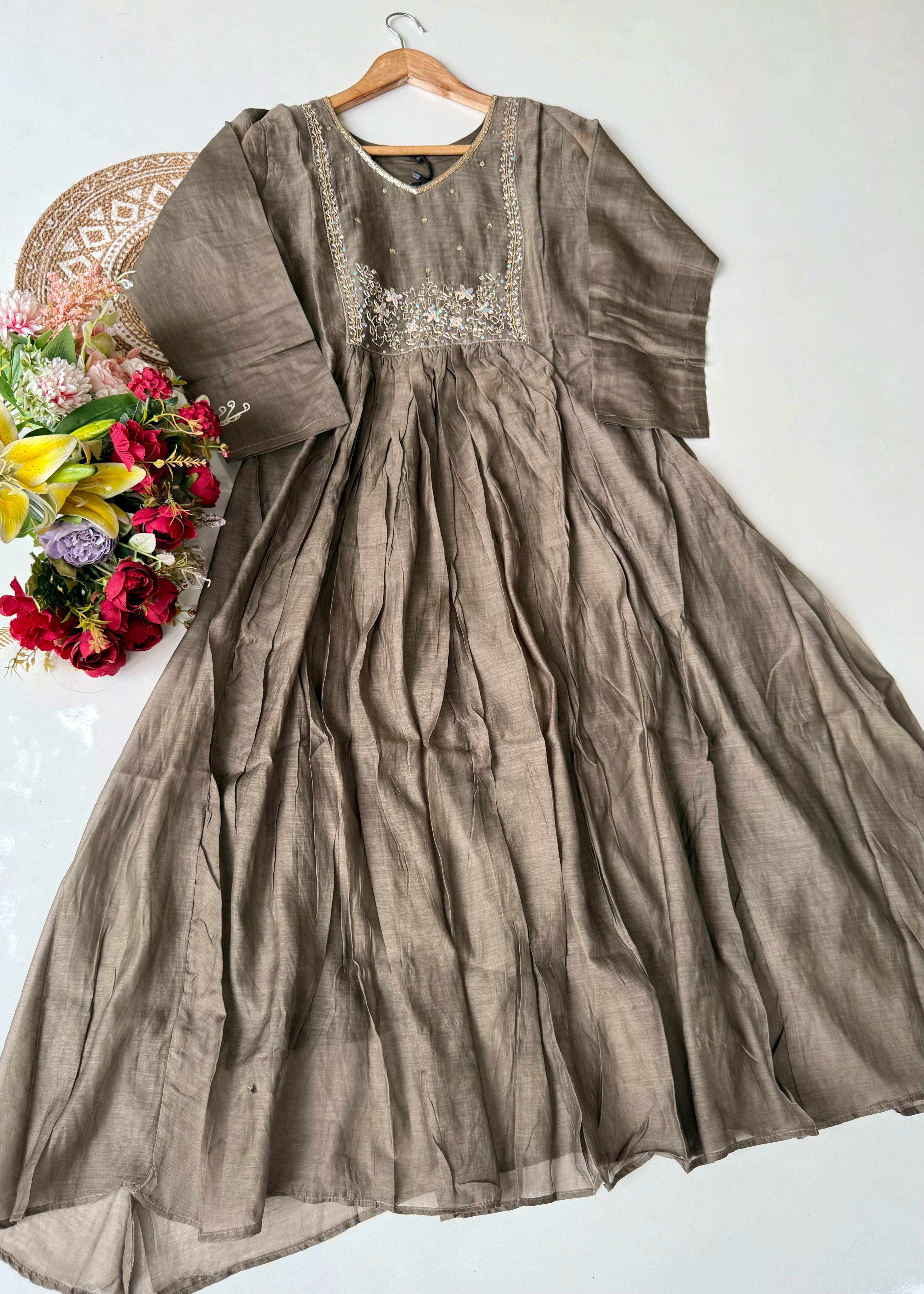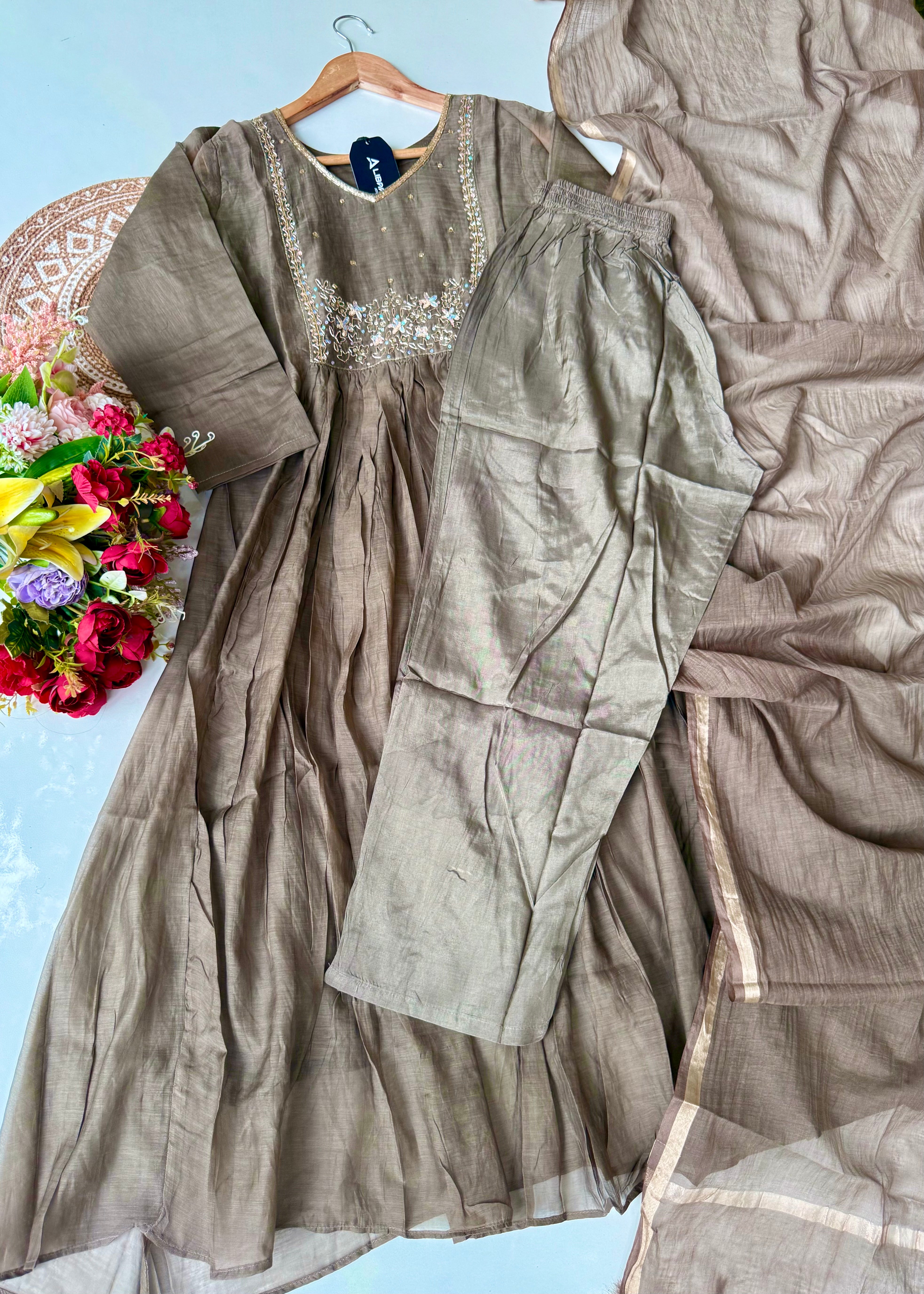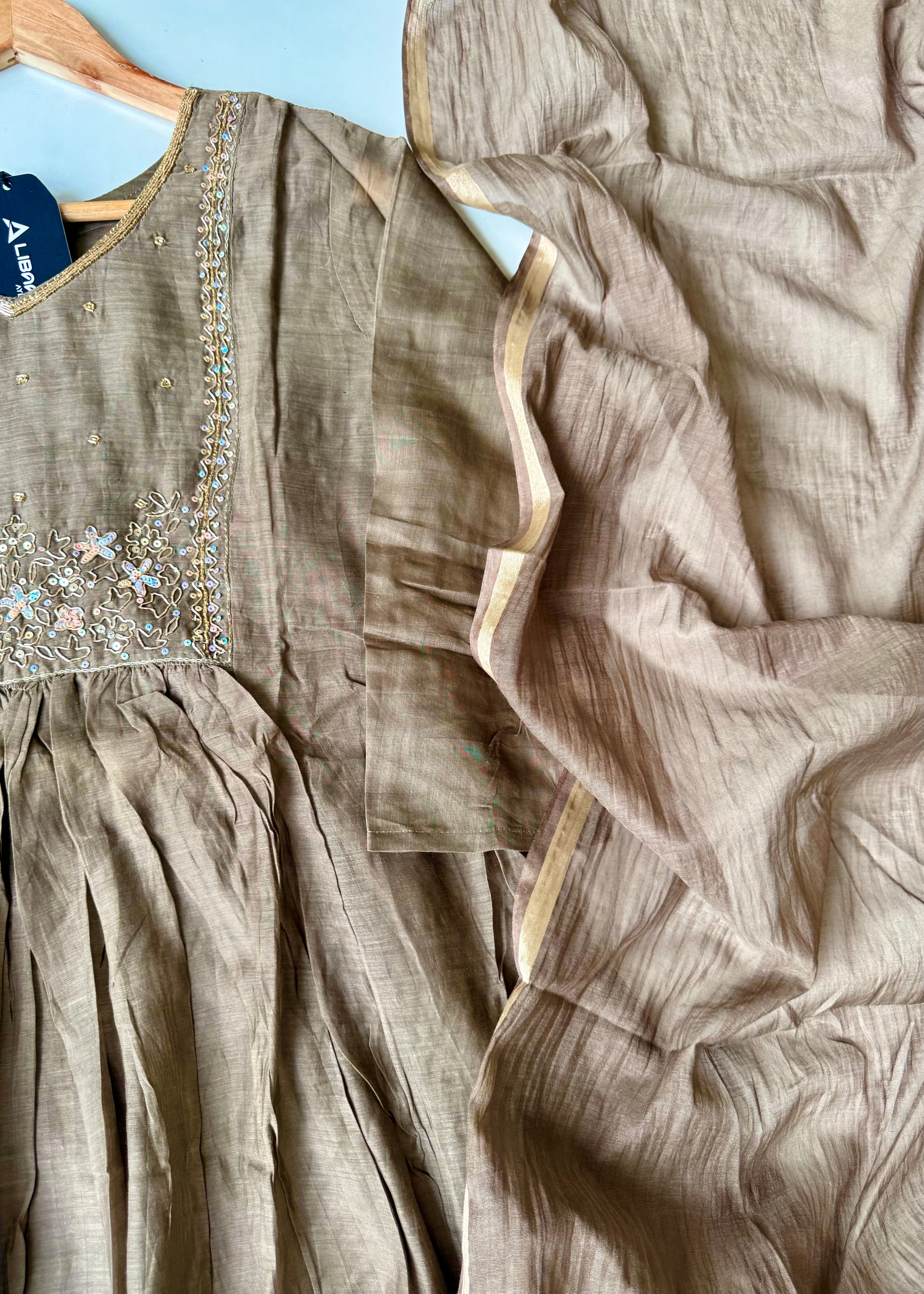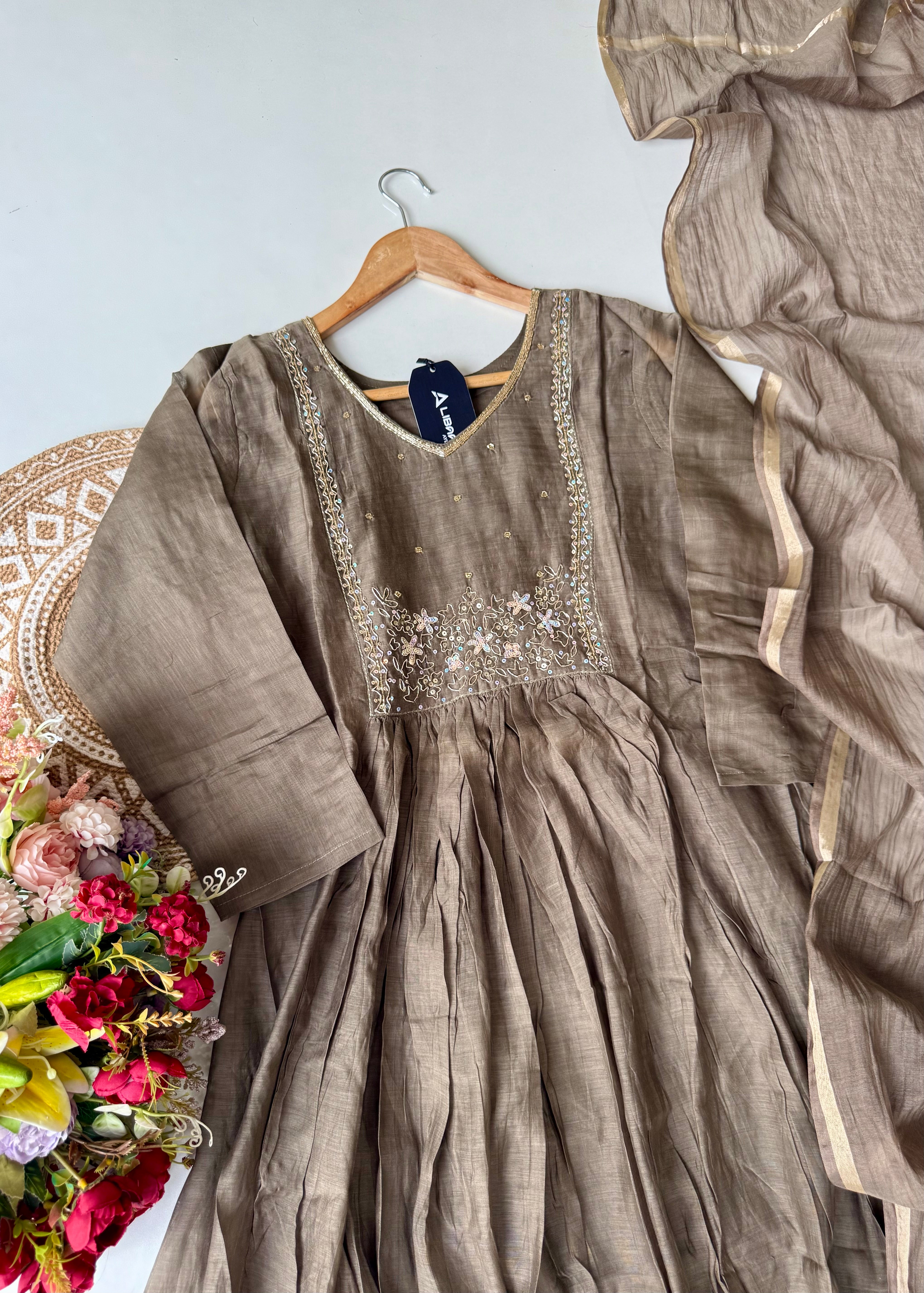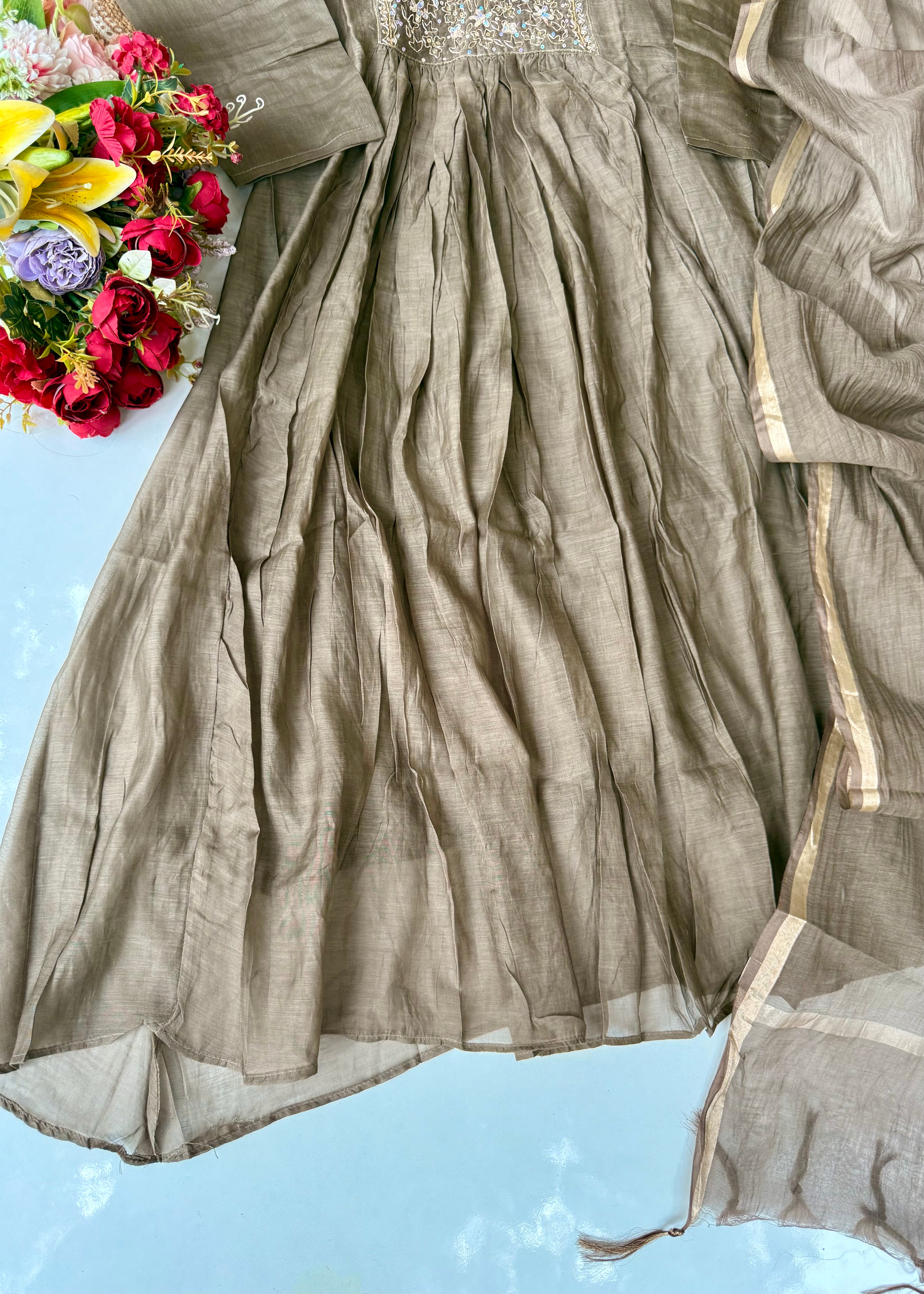 “Eiryan” Olive Brown Mul Chanderi Handwork Anarkali suit set