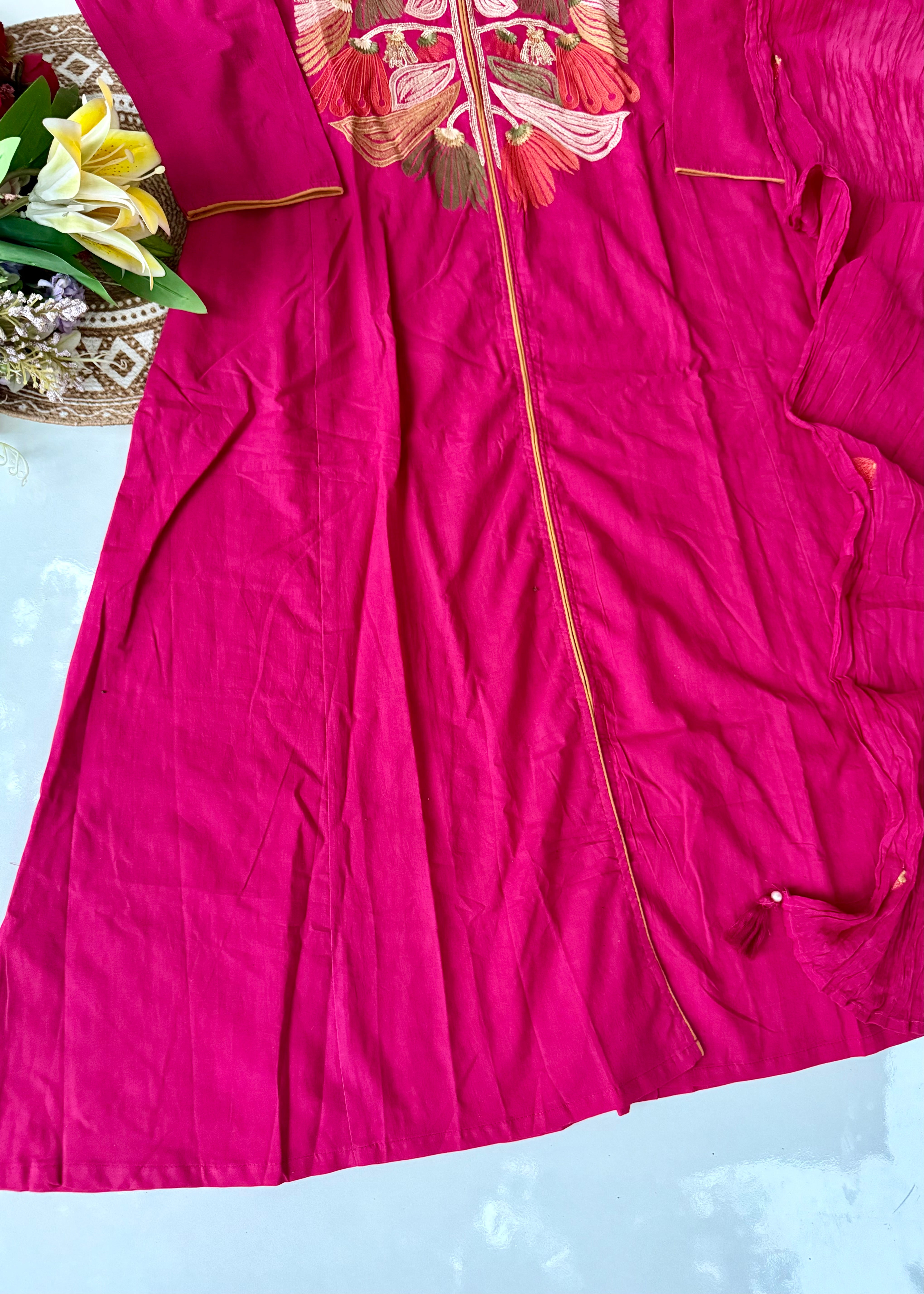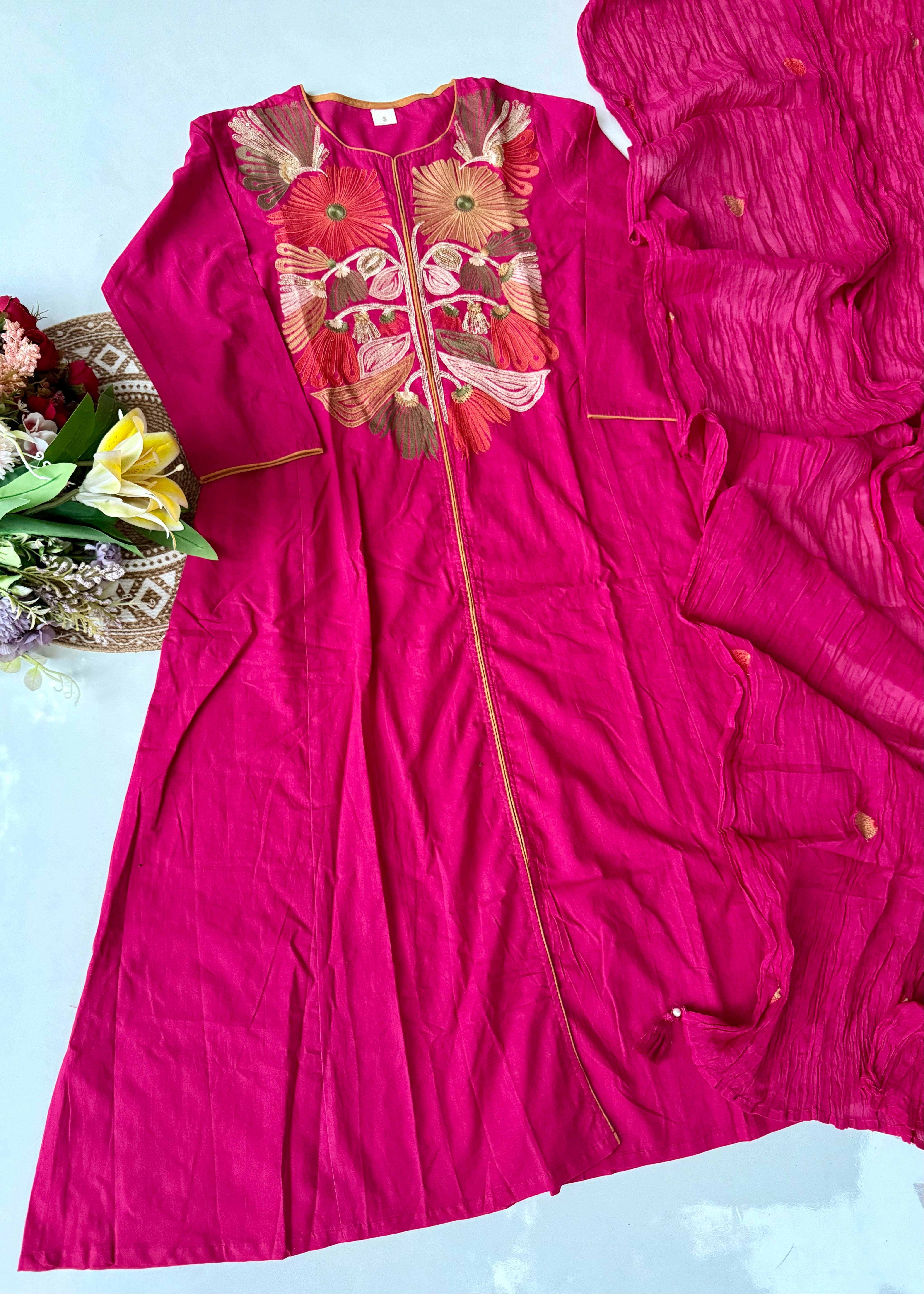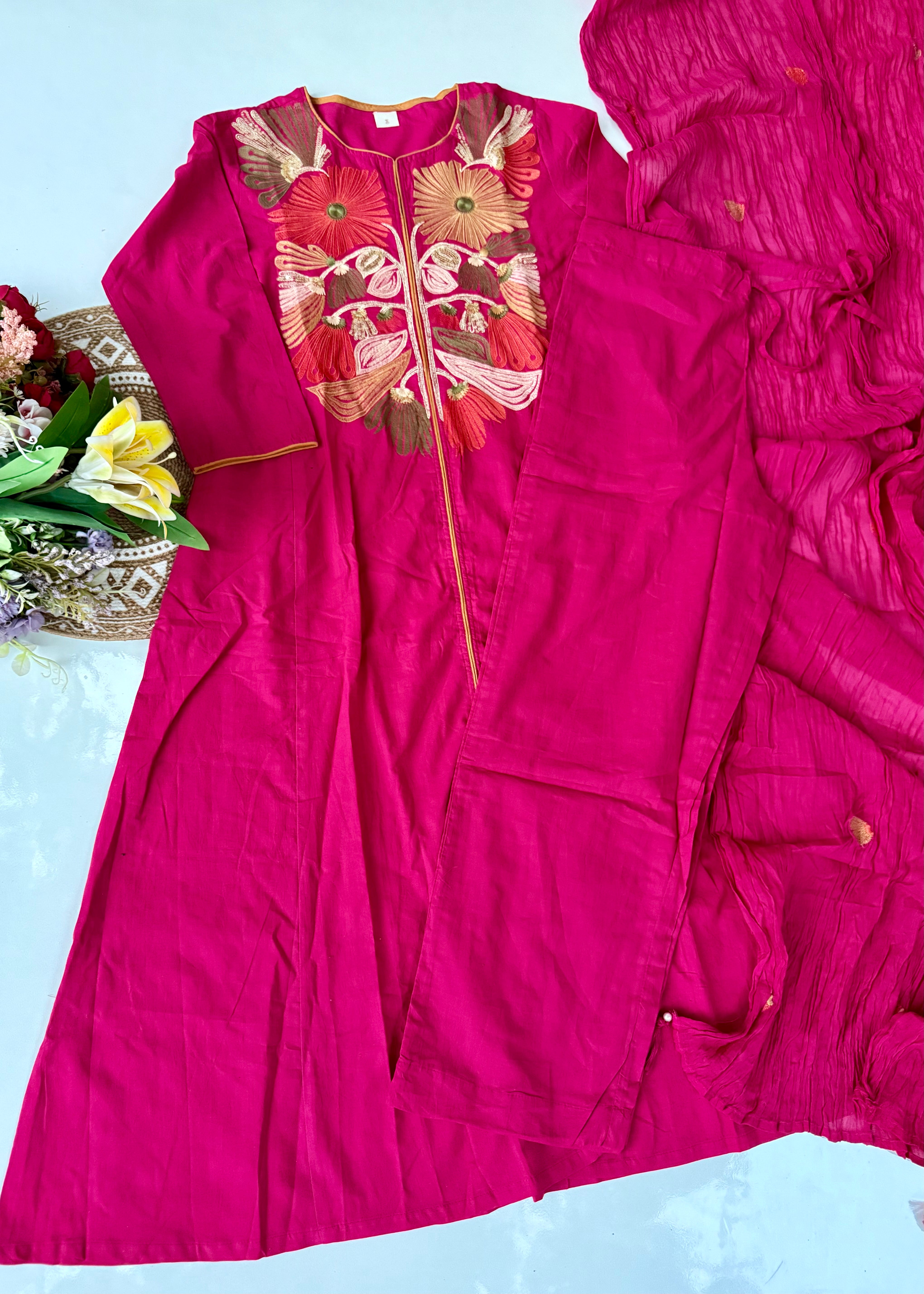 Featuring heavy embroidery work on the yoke of the top, paired with a soft embroidered cotton dupatta and a breathable cotton bottom, this set blends tradition with contemporary design.