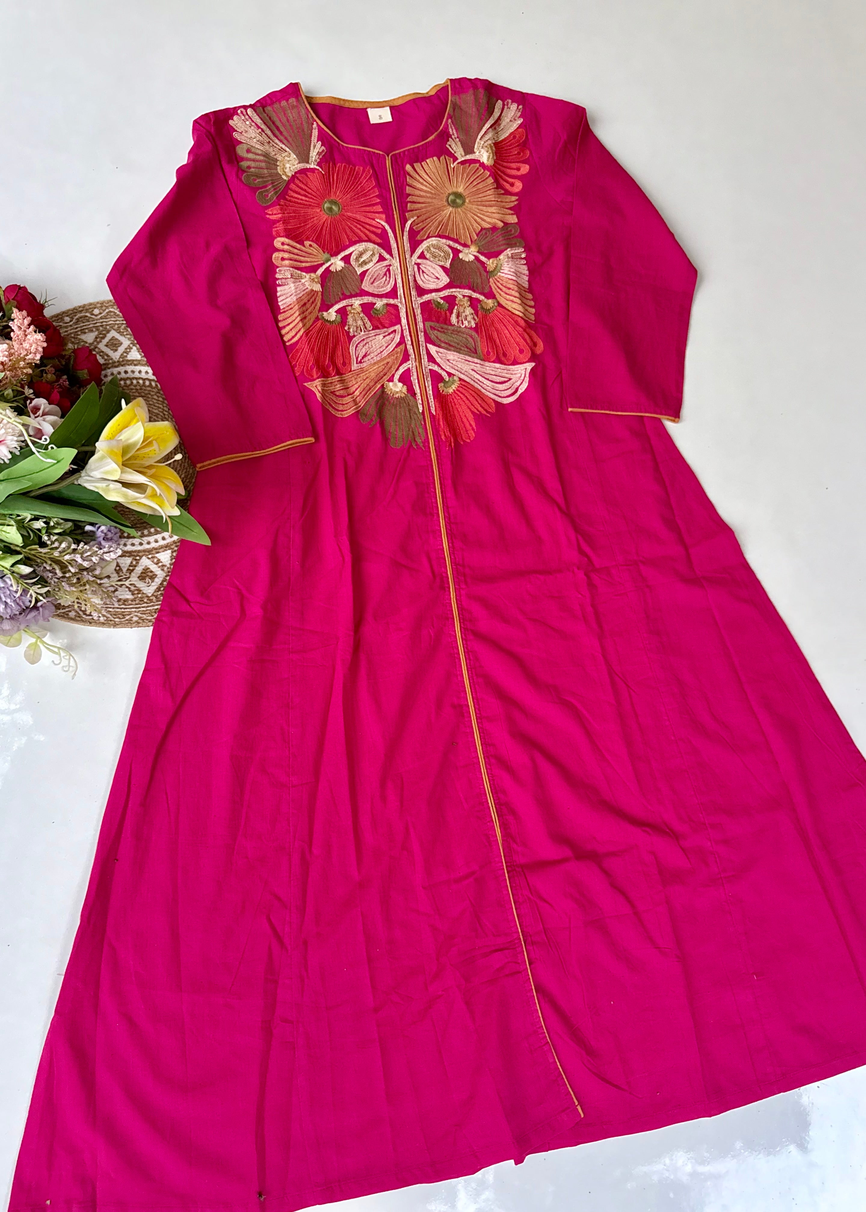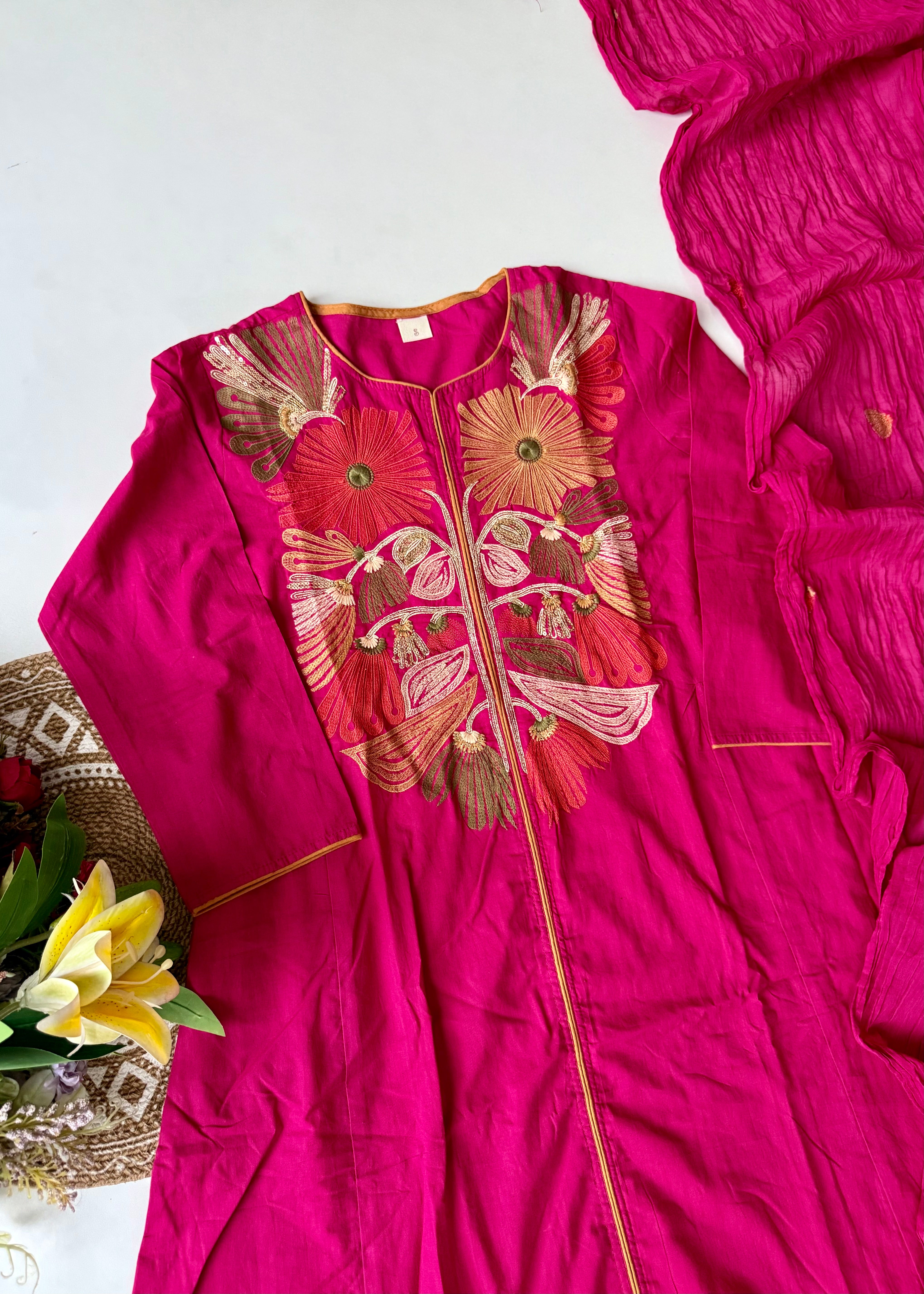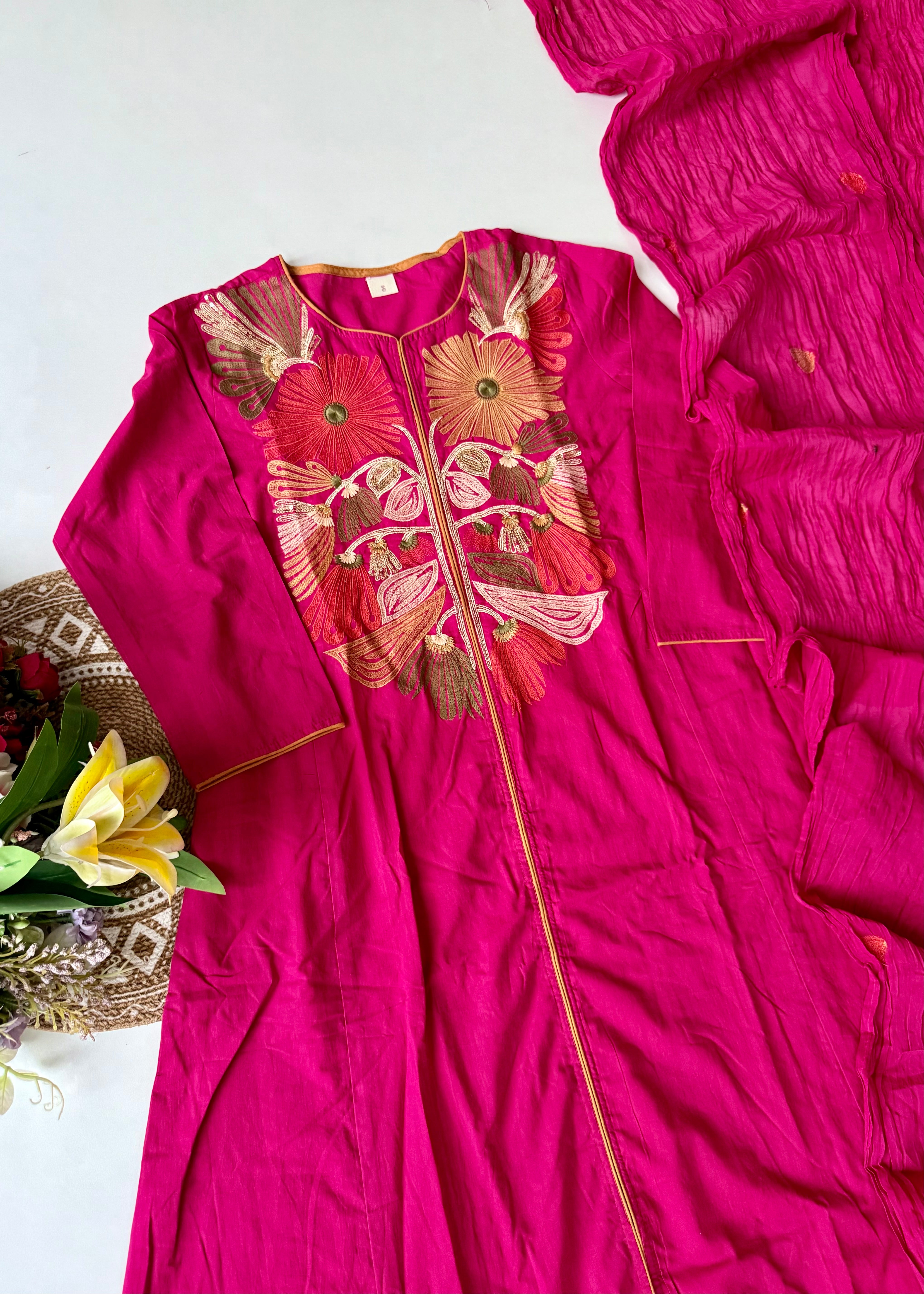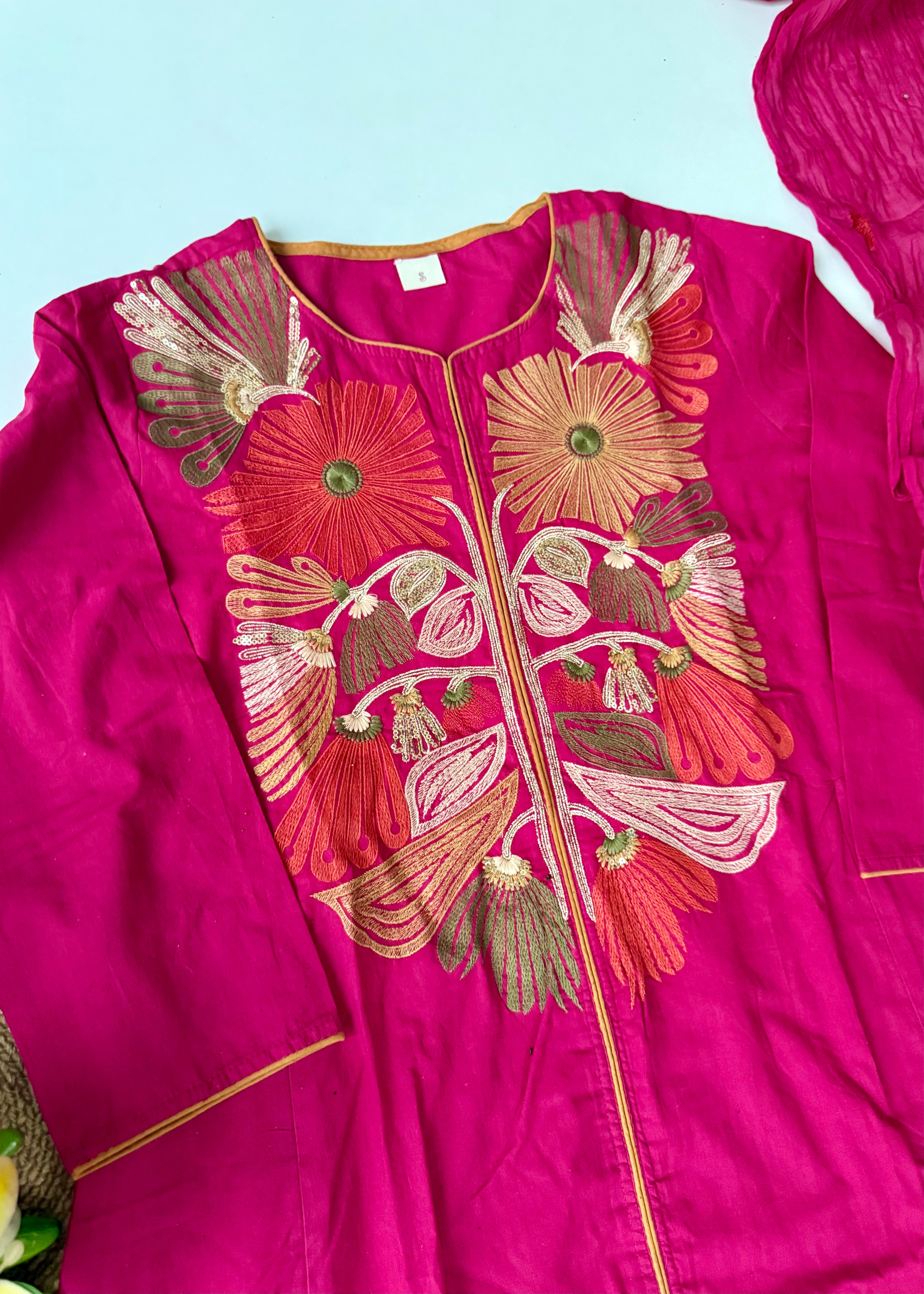 Featuring heavy embroidery work on the yoke of the top, paired with a soft embroidered cotton dupatta and a breathable cotton bottom, this set blends tradition with contemporary design.