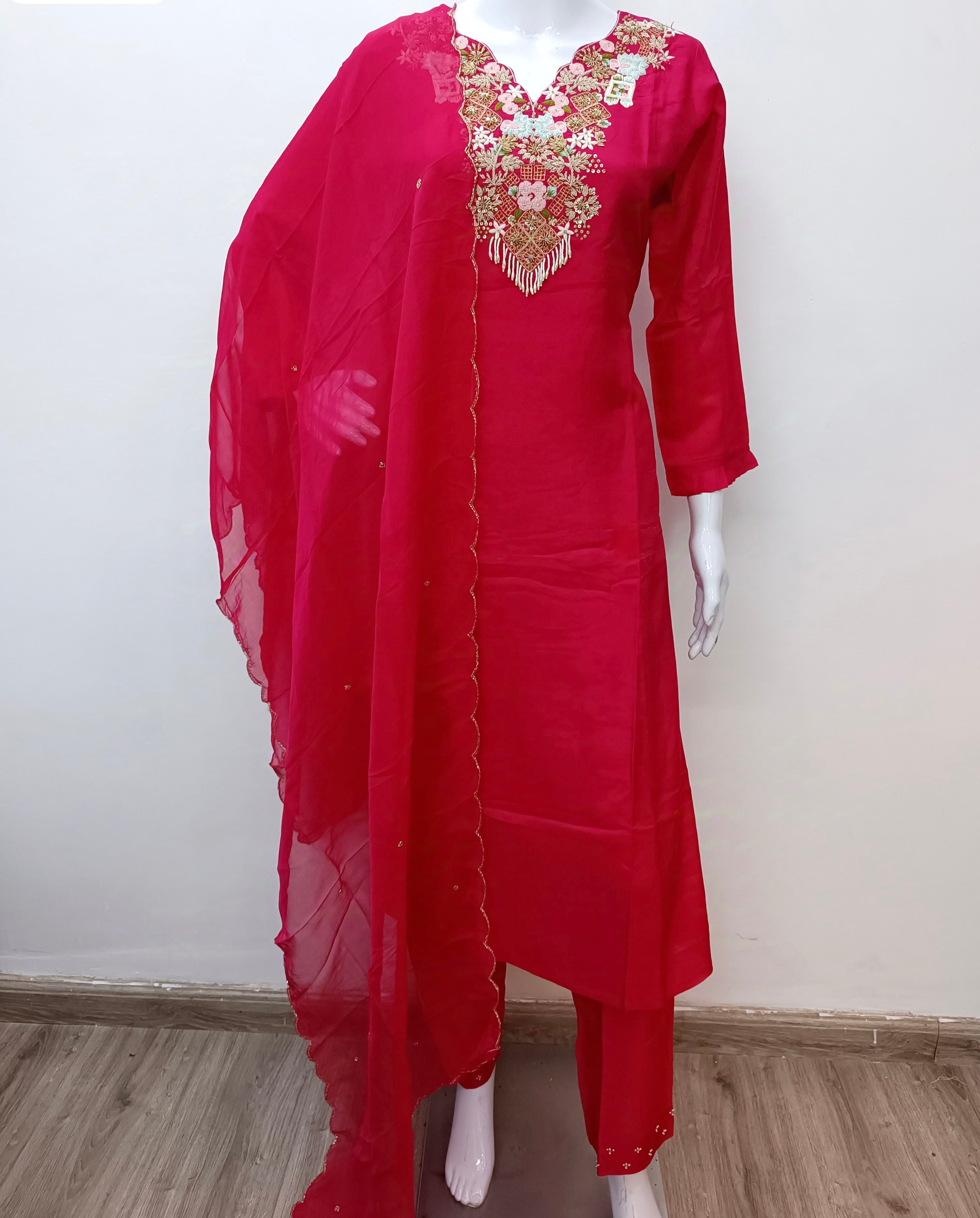 Premium range dola silk set with heavy Handwork on the yoke of the kurta with a scallop viscose organza dupatta and a plane dola silk bottom