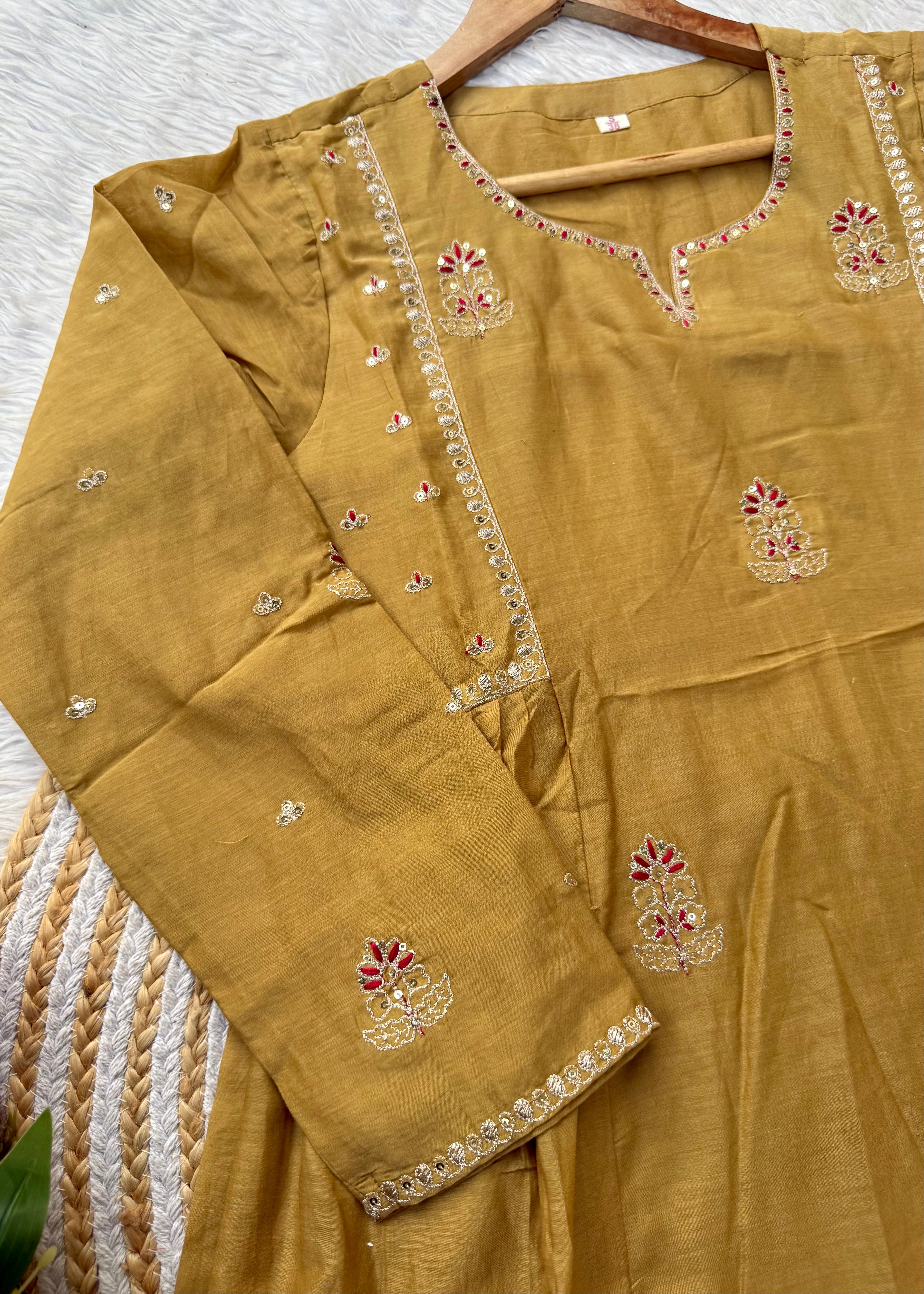 Premium mul Chanderi anarkali kurti with heavy handwork all over the kurta with a long mul chanderi dupatta with handwork detailed paired with a plane silk bottom
