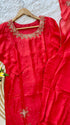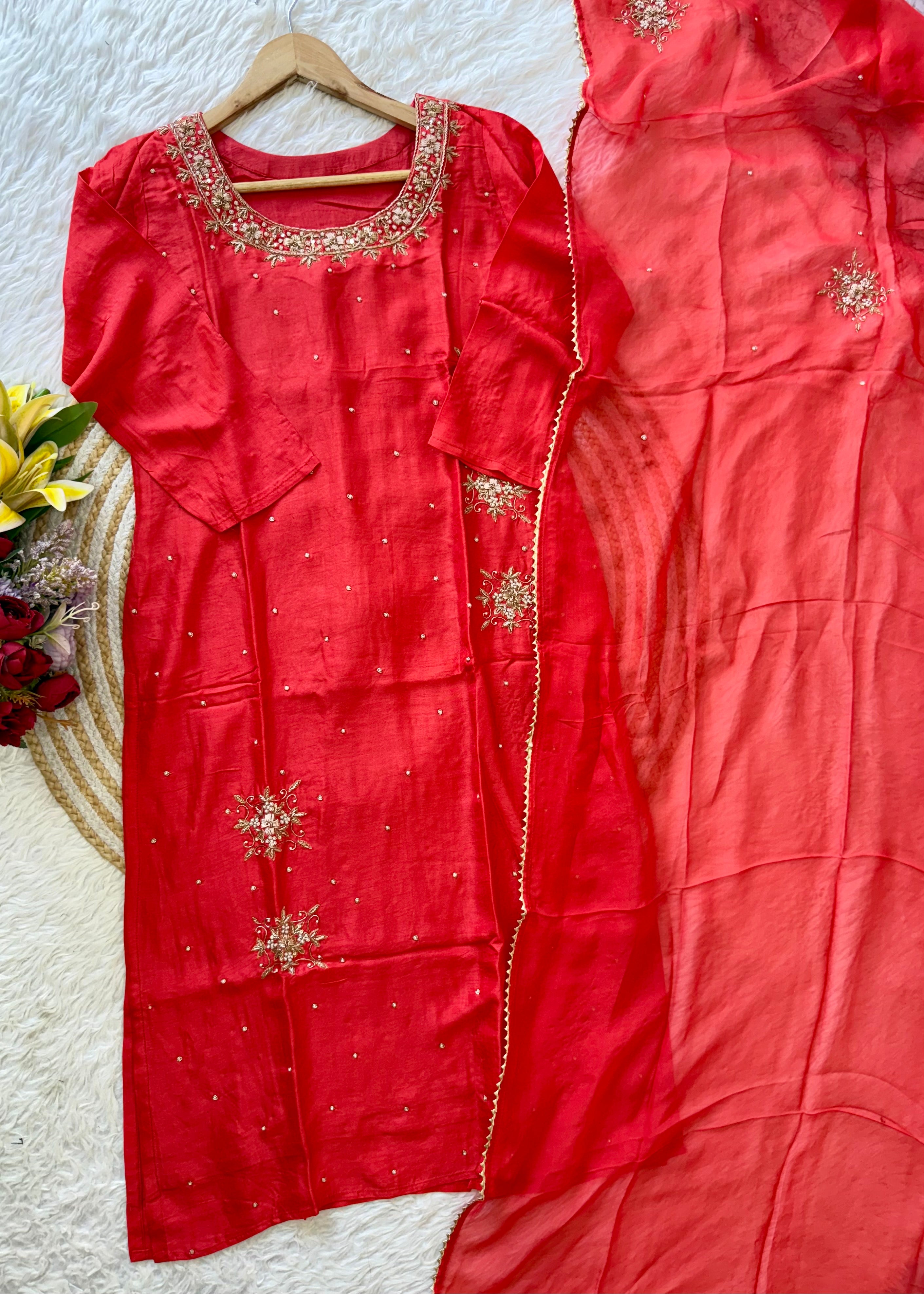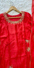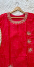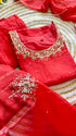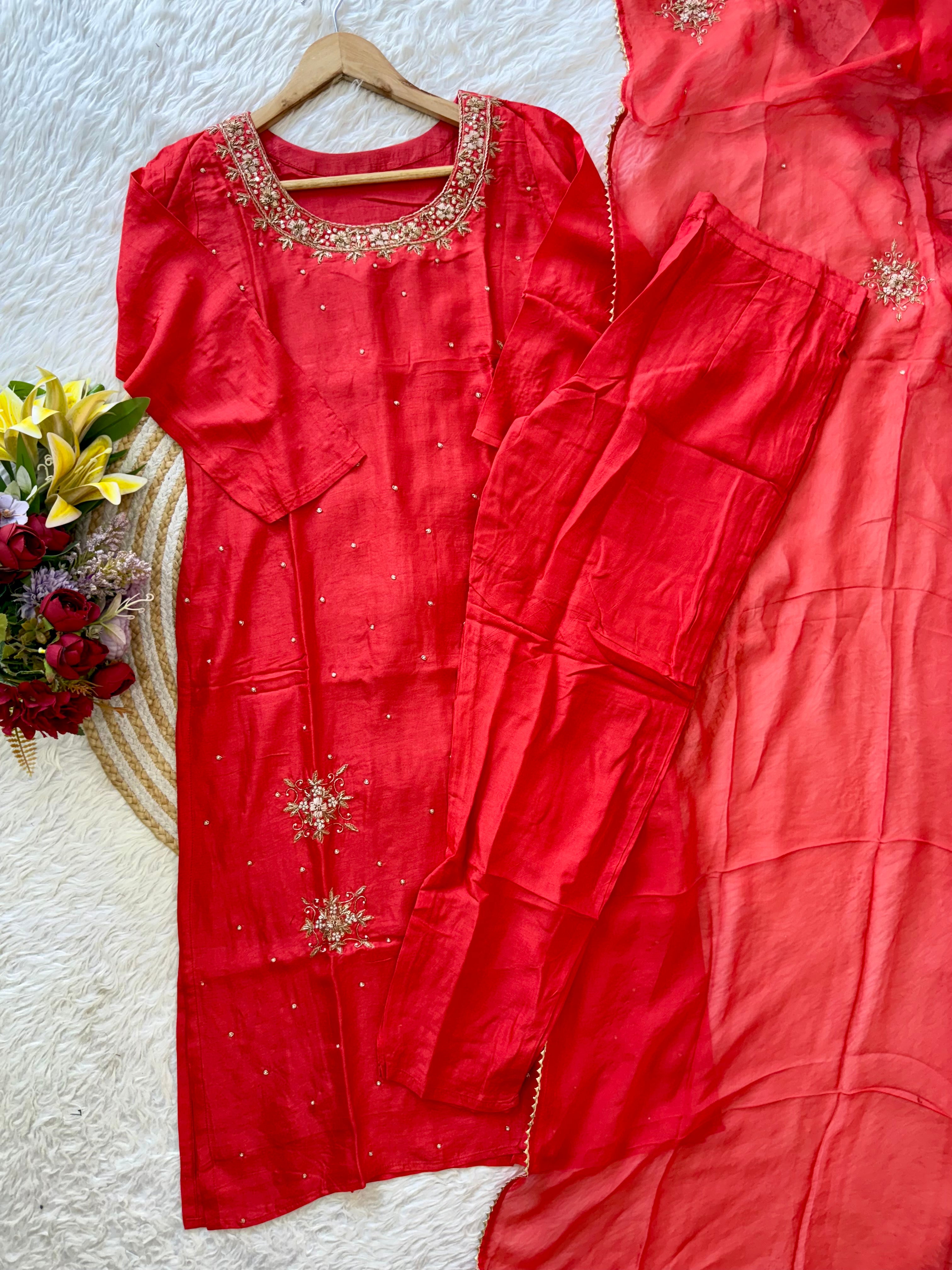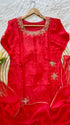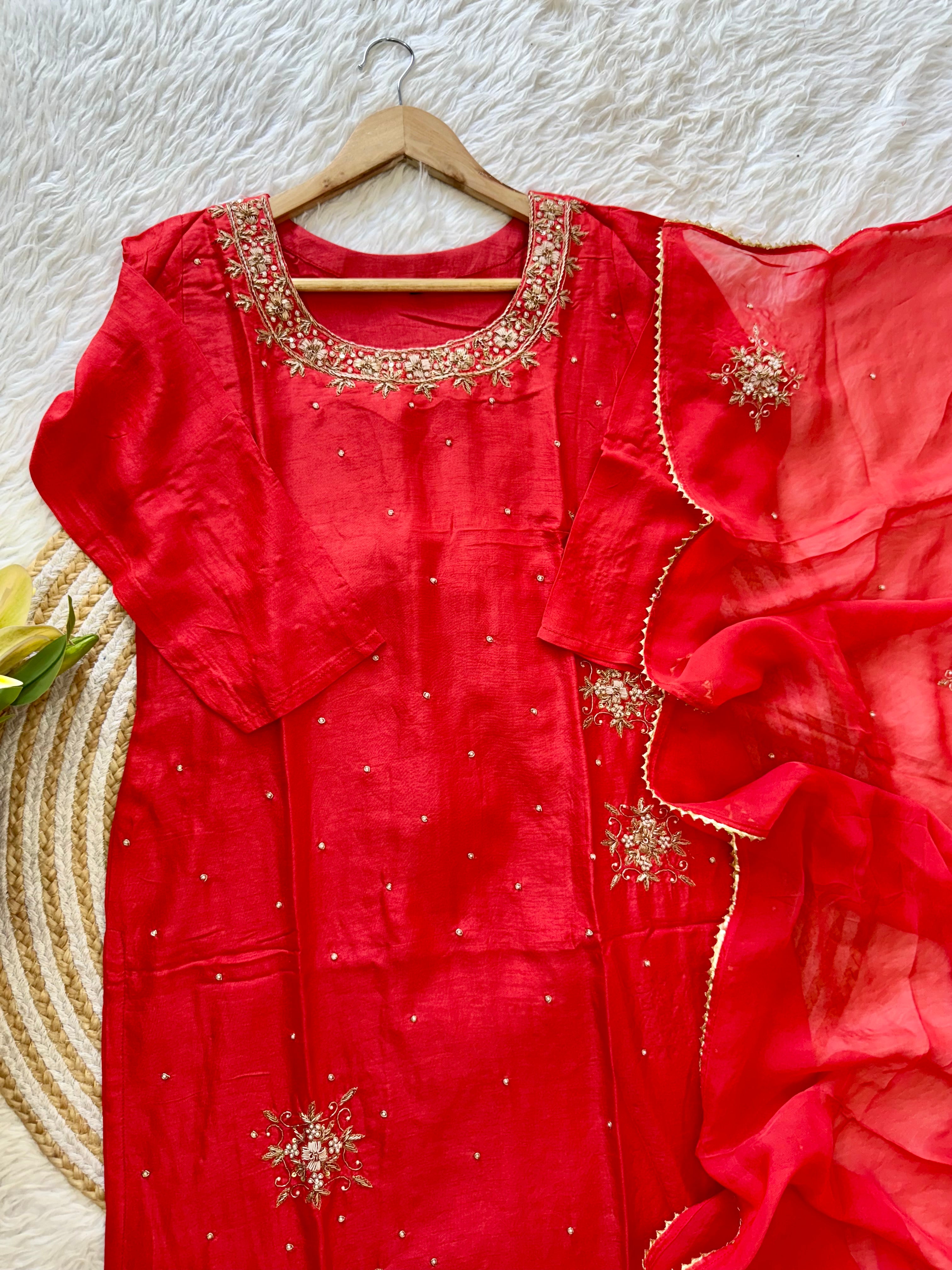 A very beautiful piece with heavy handwork on all over the kurta with a beautiful handwork detailing organza dupatta and a dola silk bottom