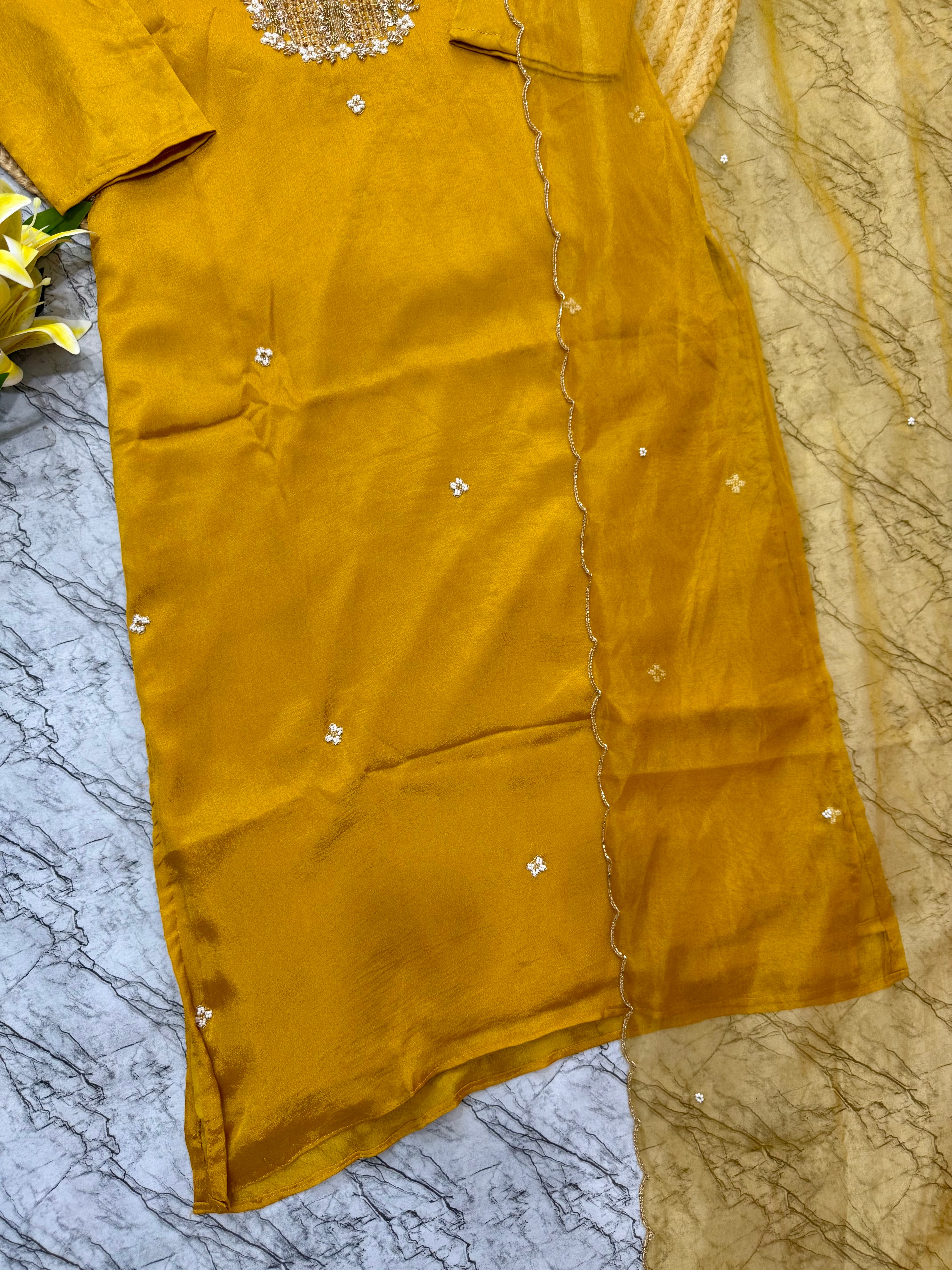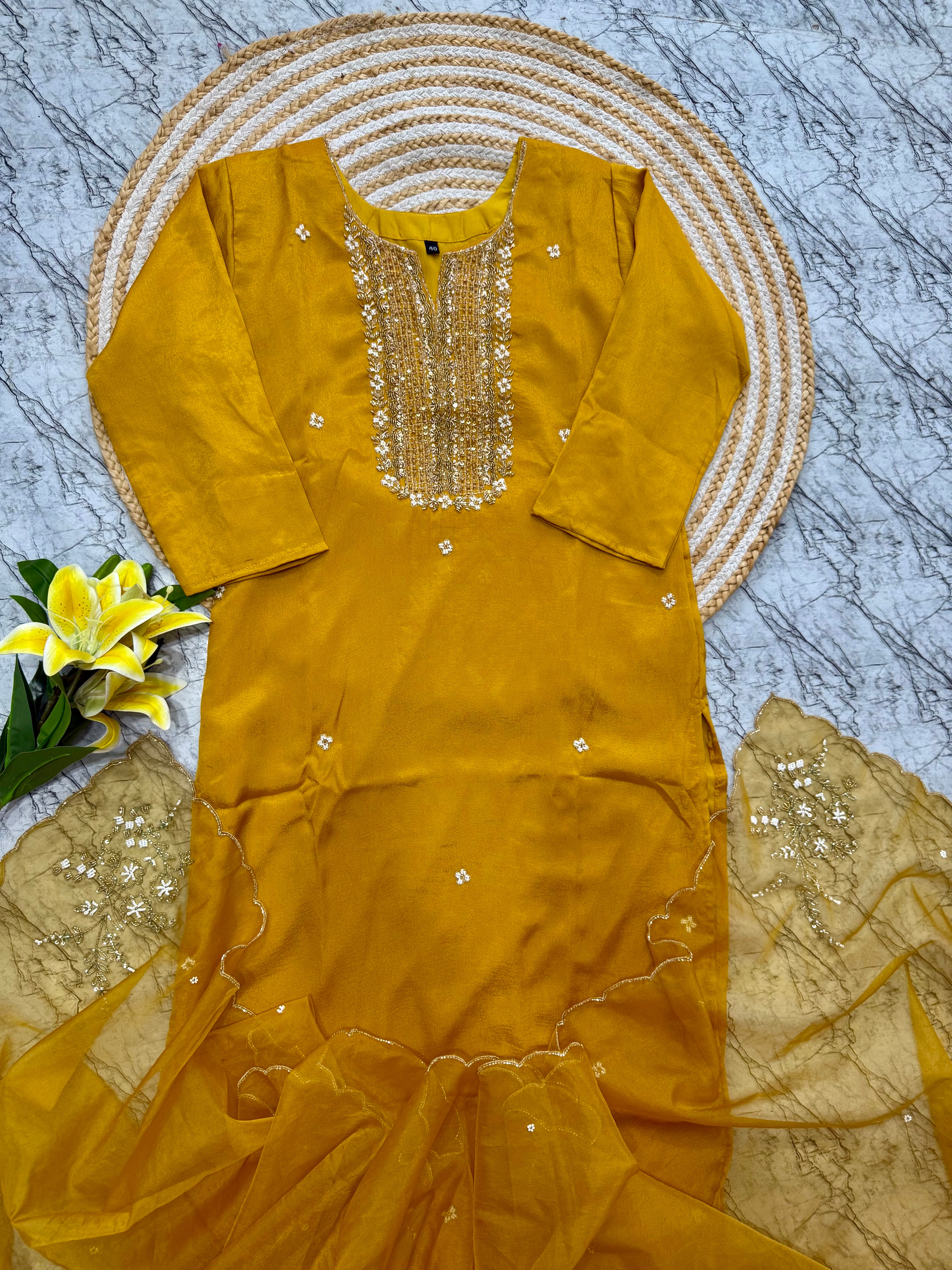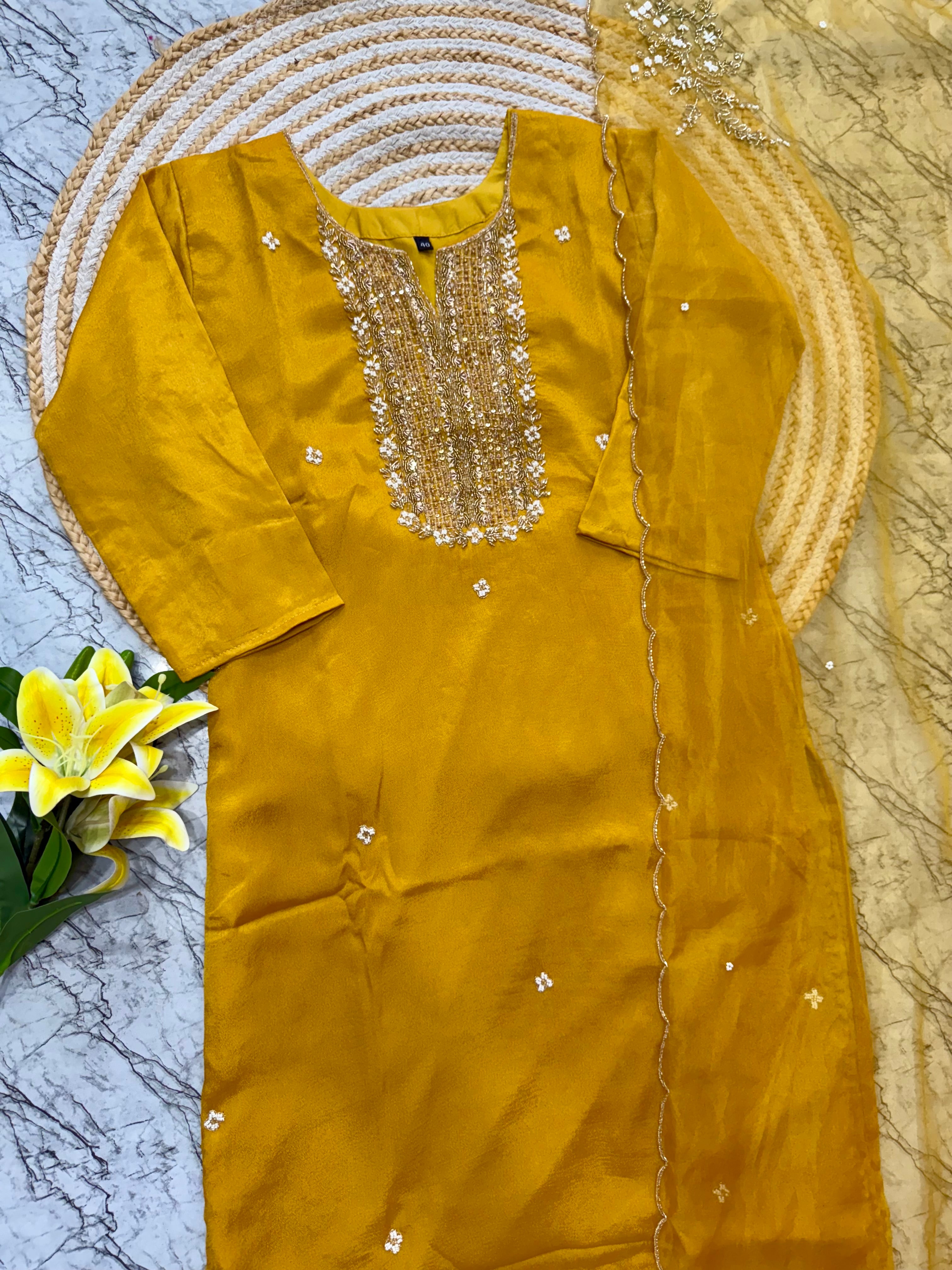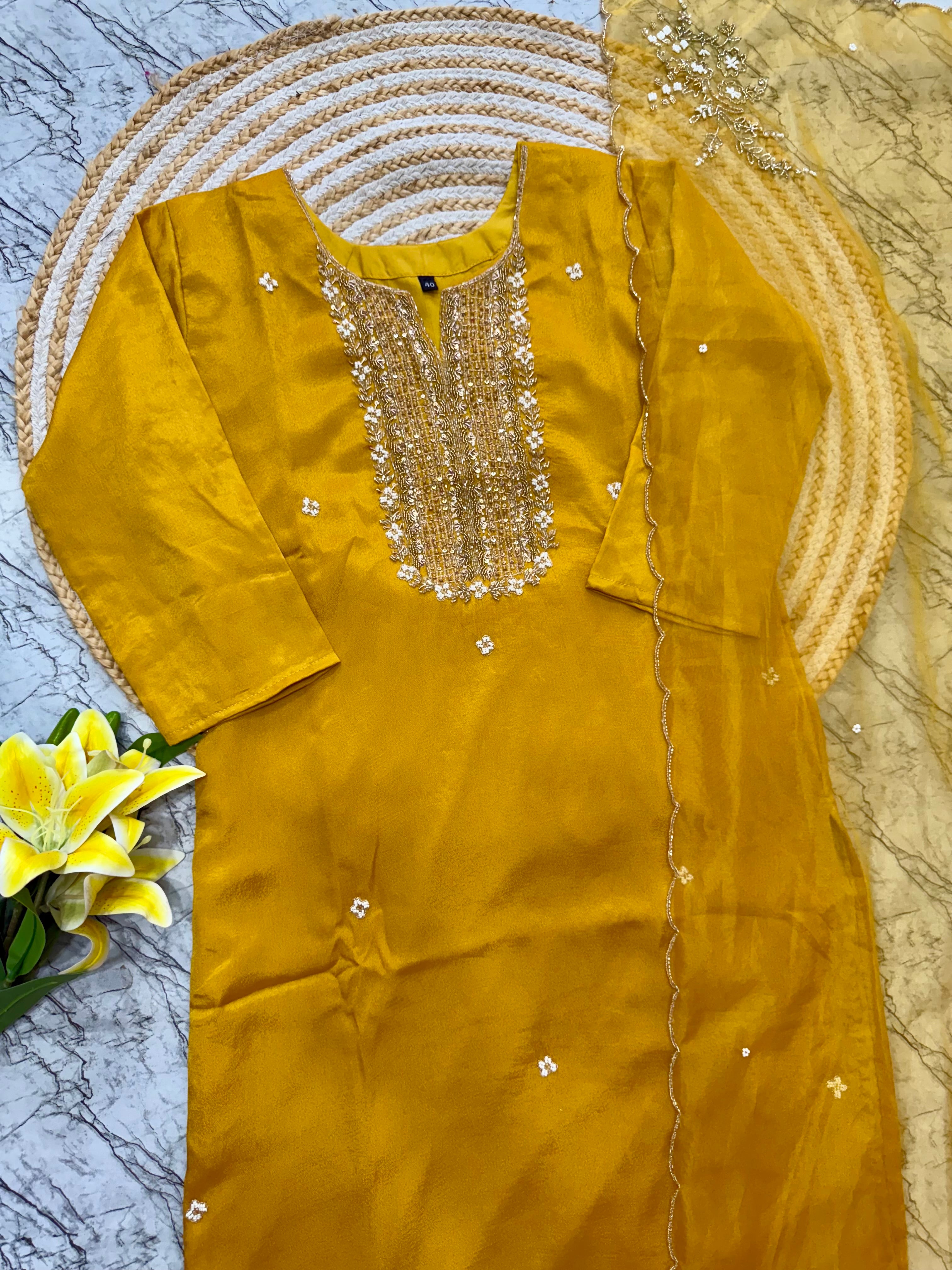 Handcrafted Chinnon silk kurti with handwork on the yoke of the kurta with a long handwork detailed organza dupatta with a silk bottom .