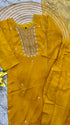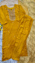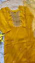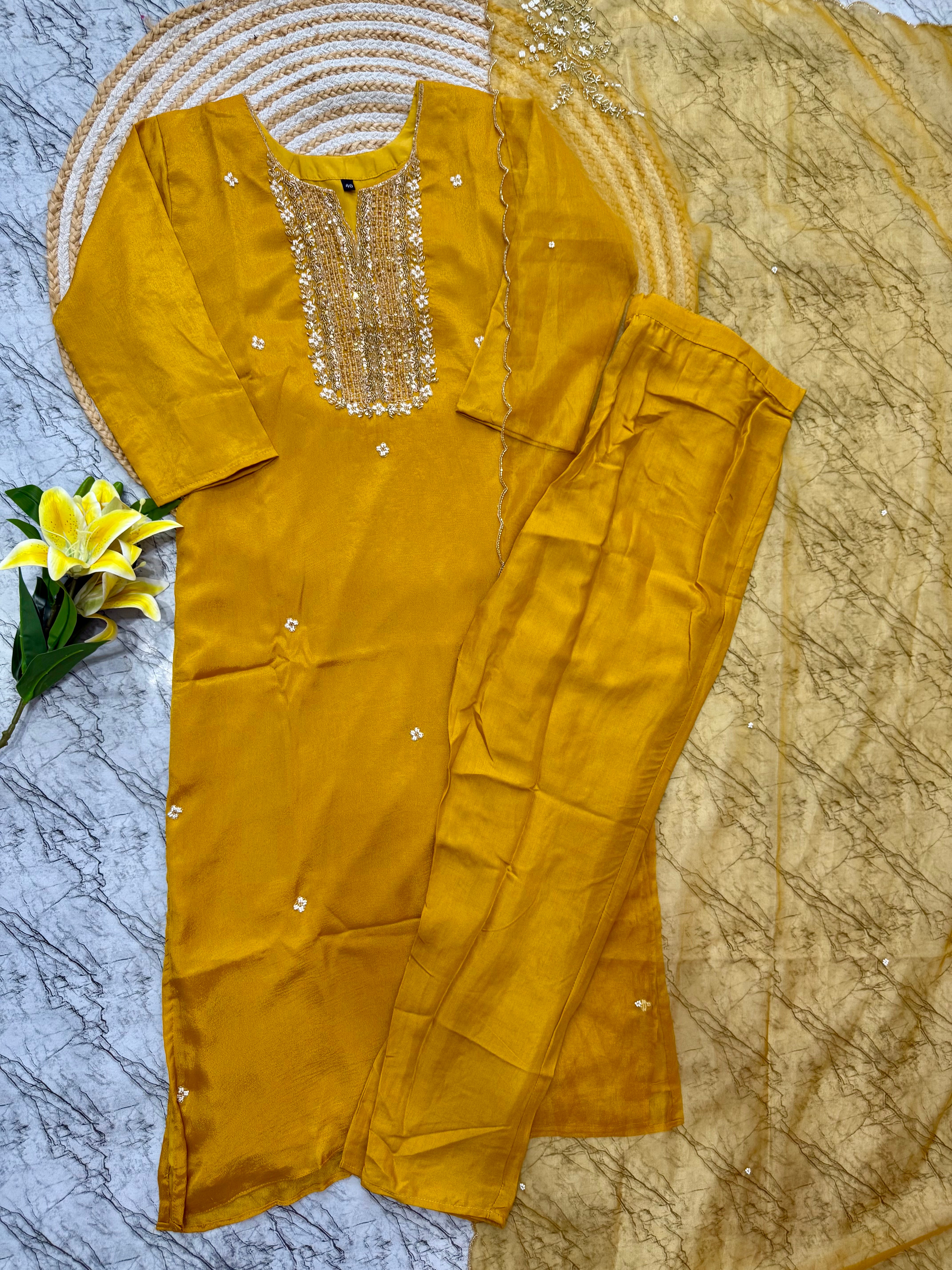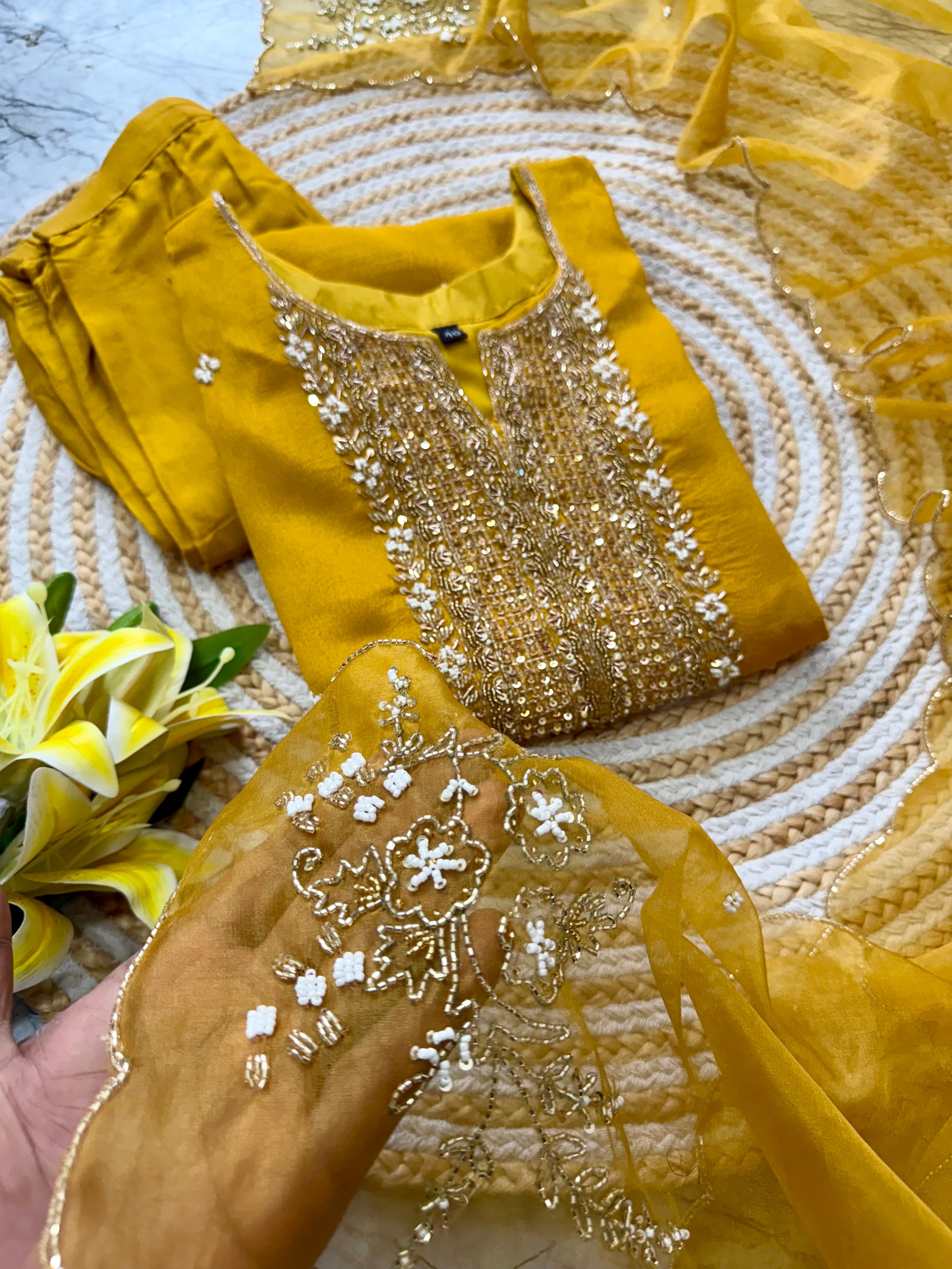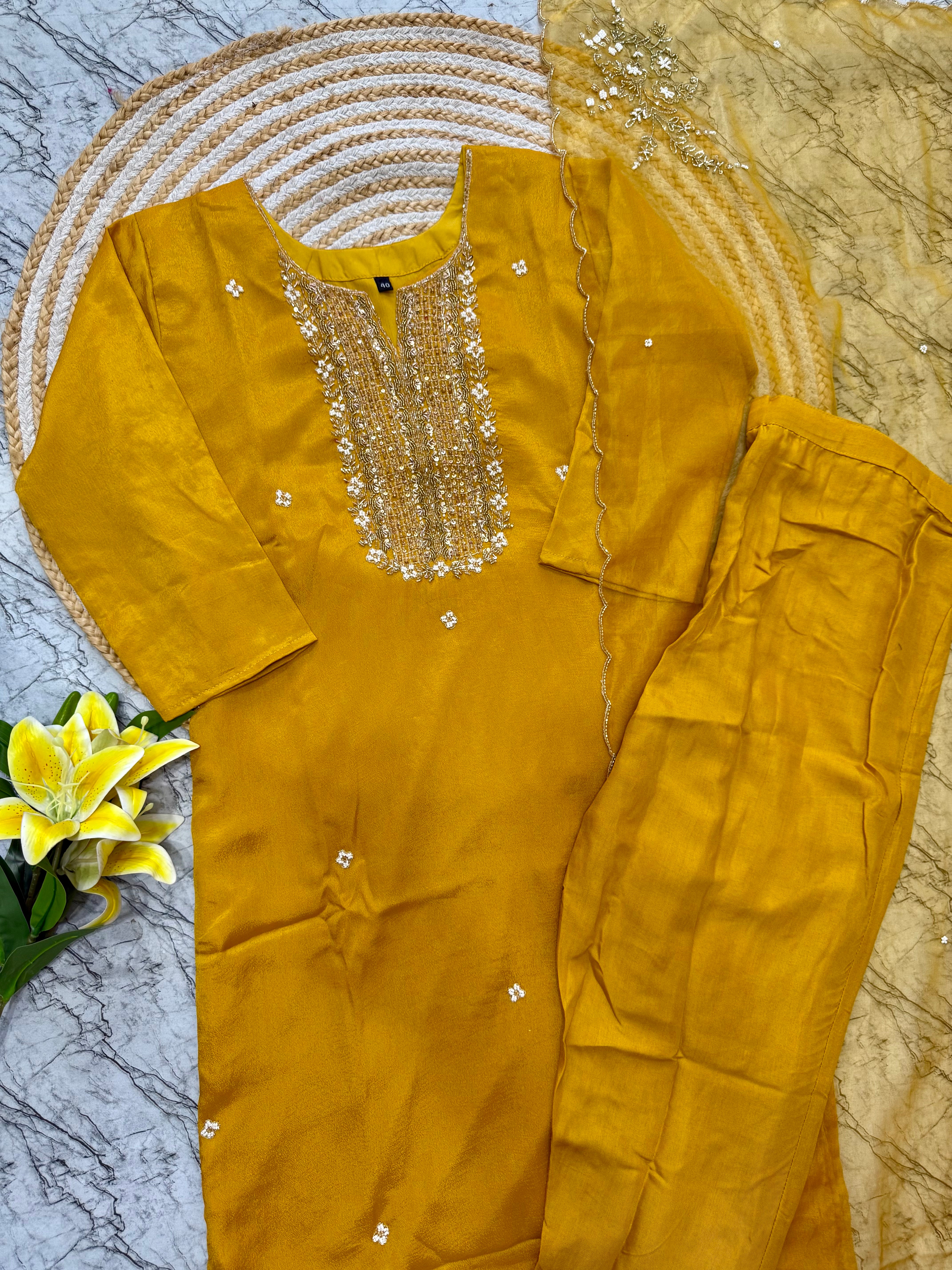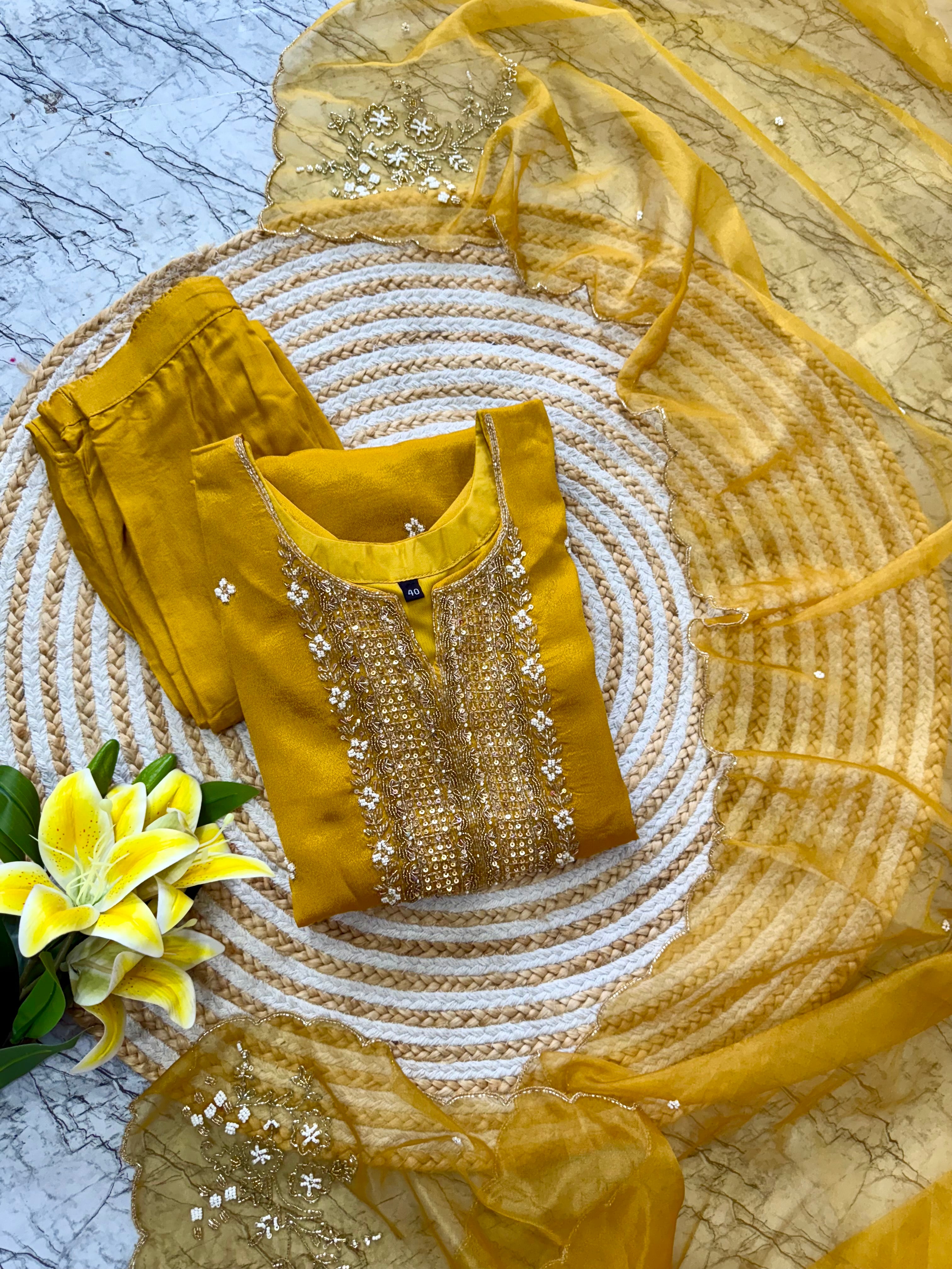 Handcrafted Chinnon silk kurti with handwork on the yoke of the kurta with a long handwork detailed organza dupatta with a silk bottom .