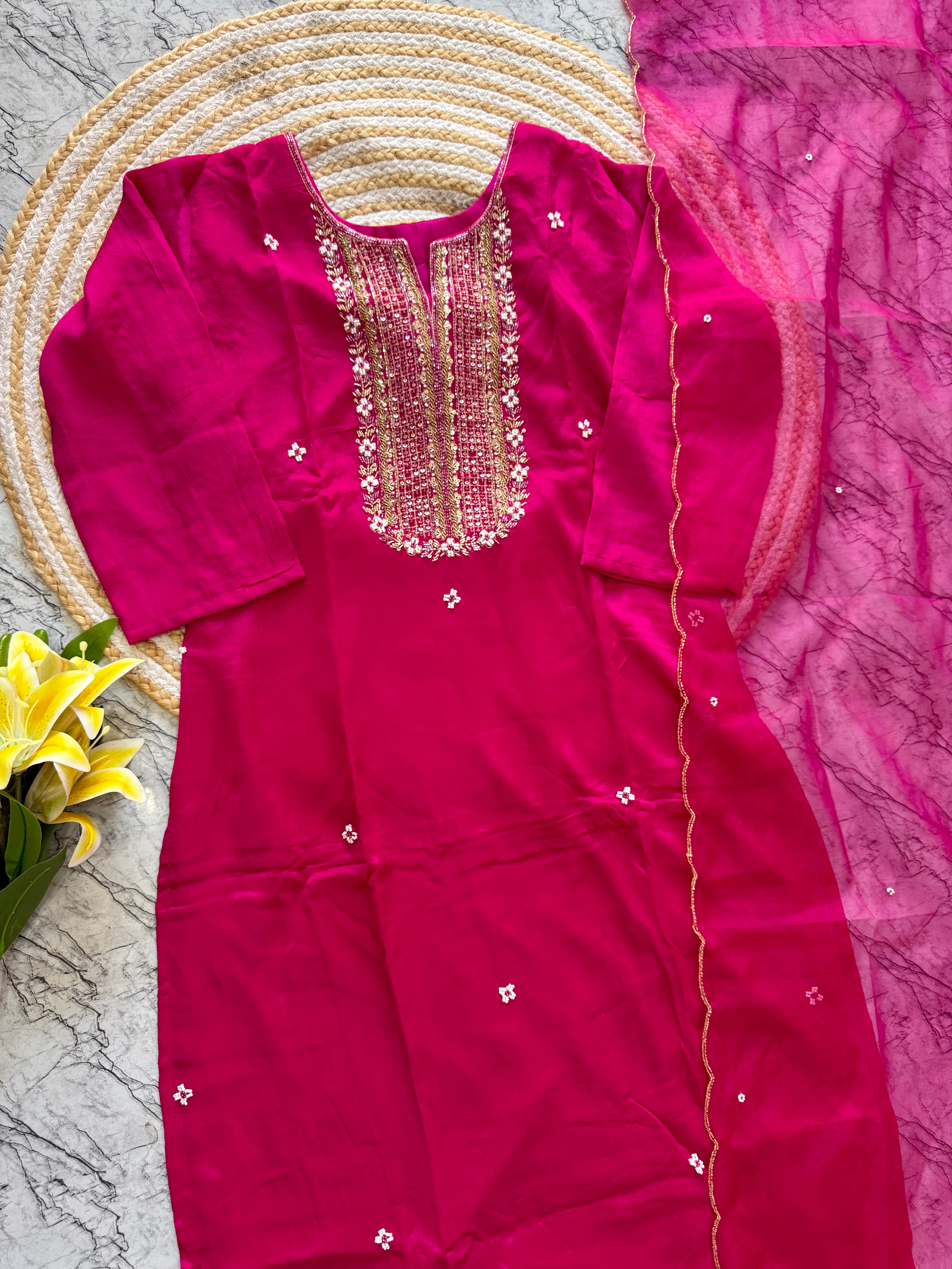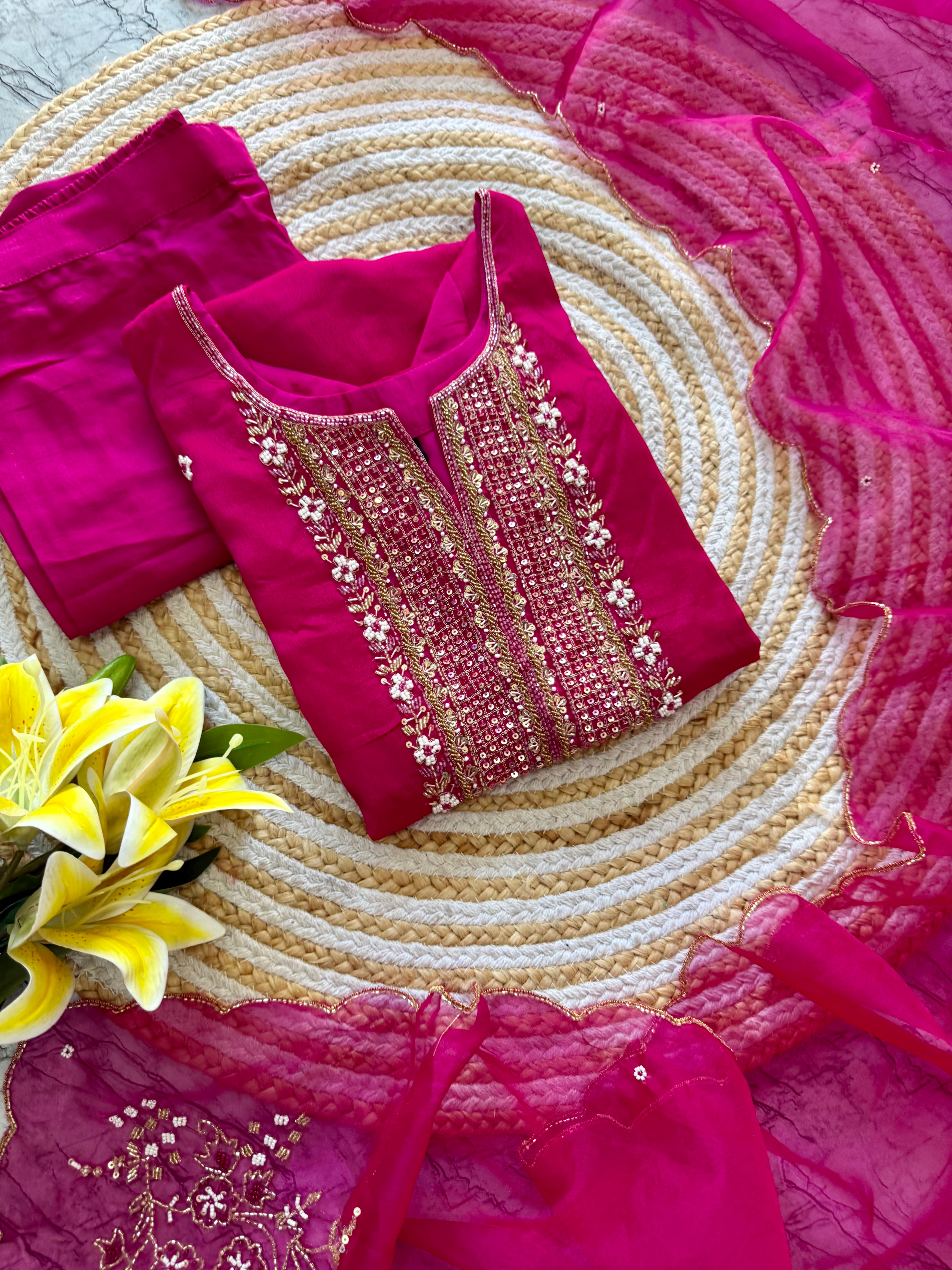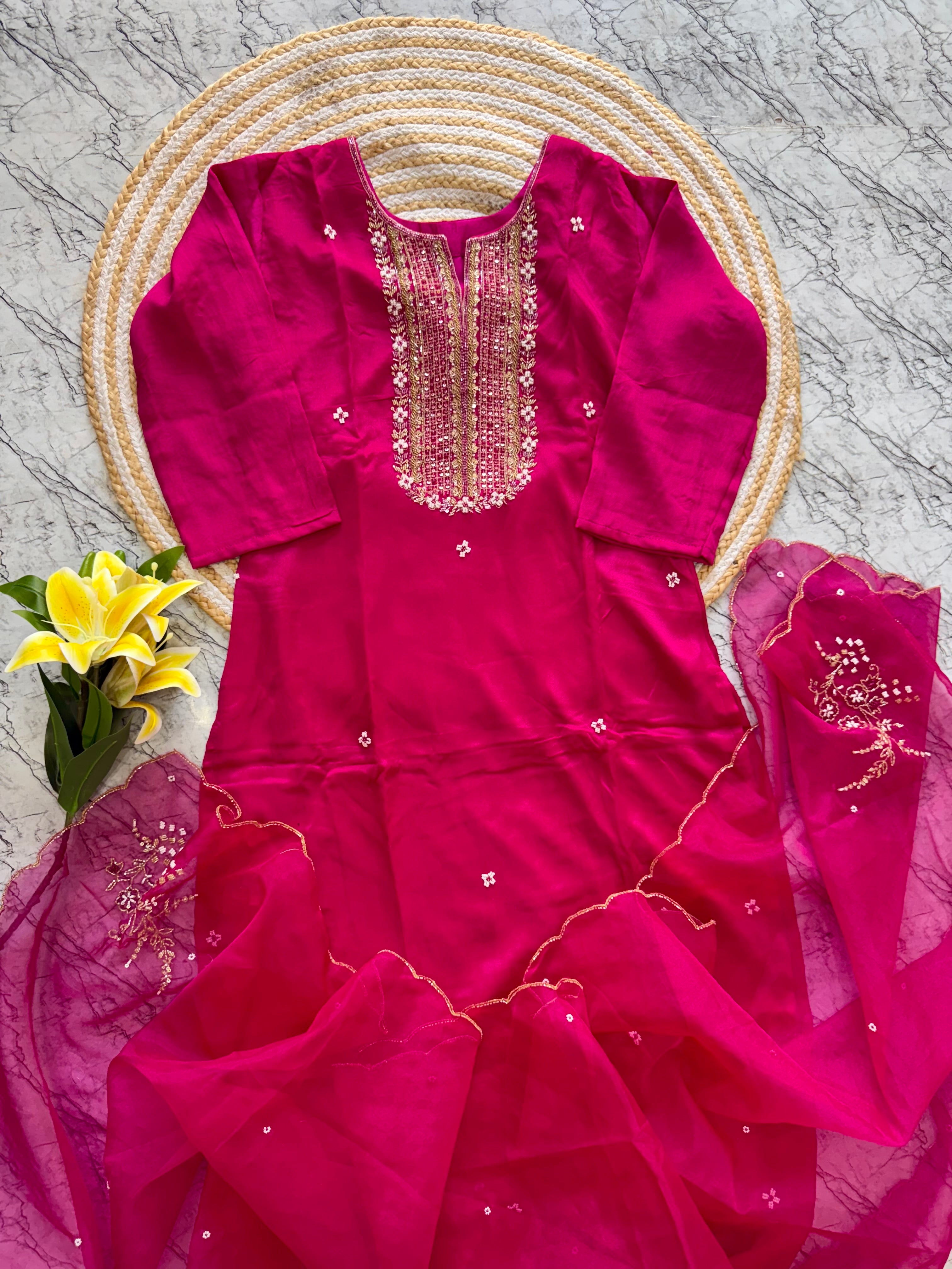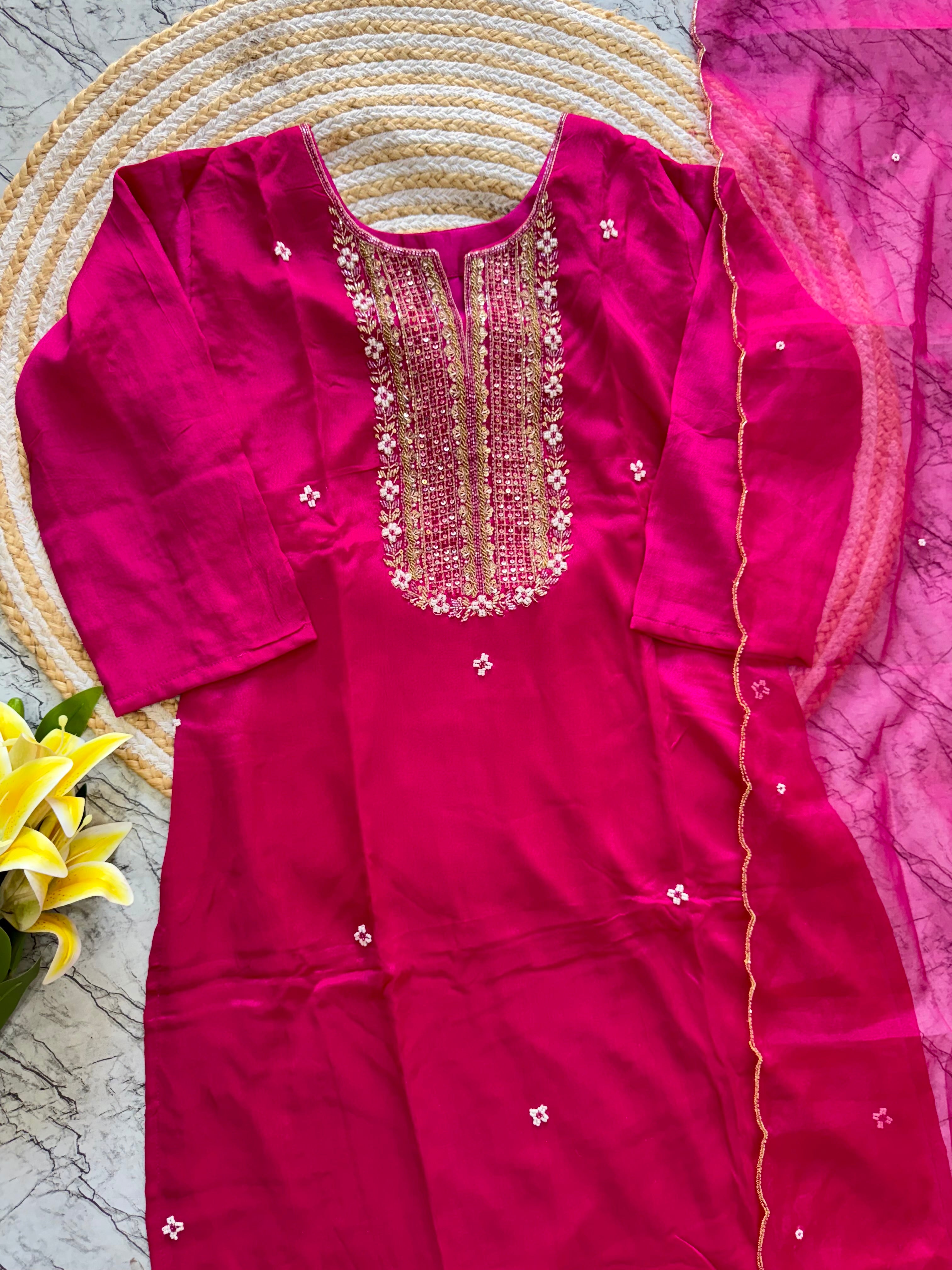 Handcrafted Russian silk kurti with handwork on the yoke of the kurta with a long handwork detailed organza dupatta with a silk bottom .