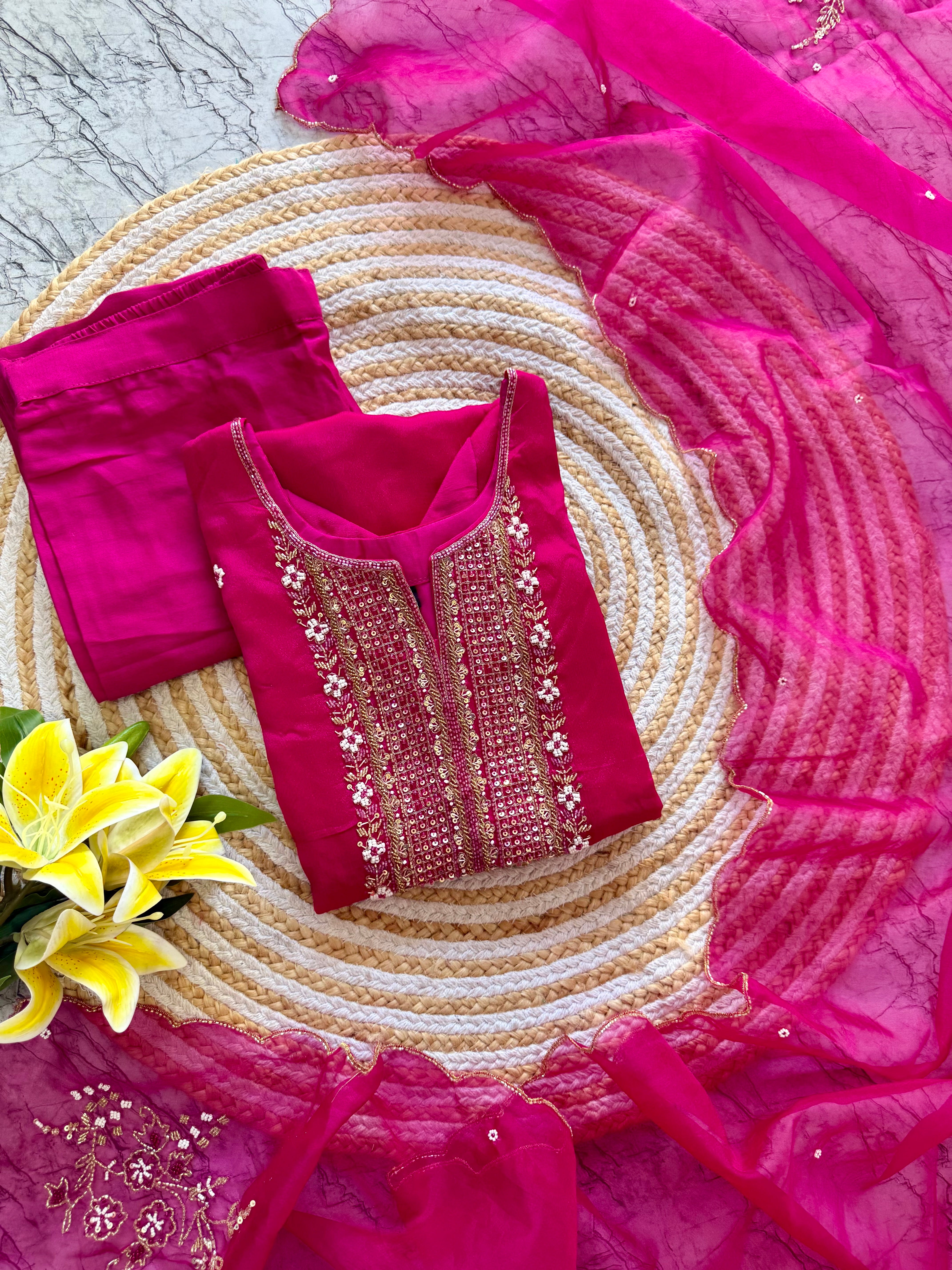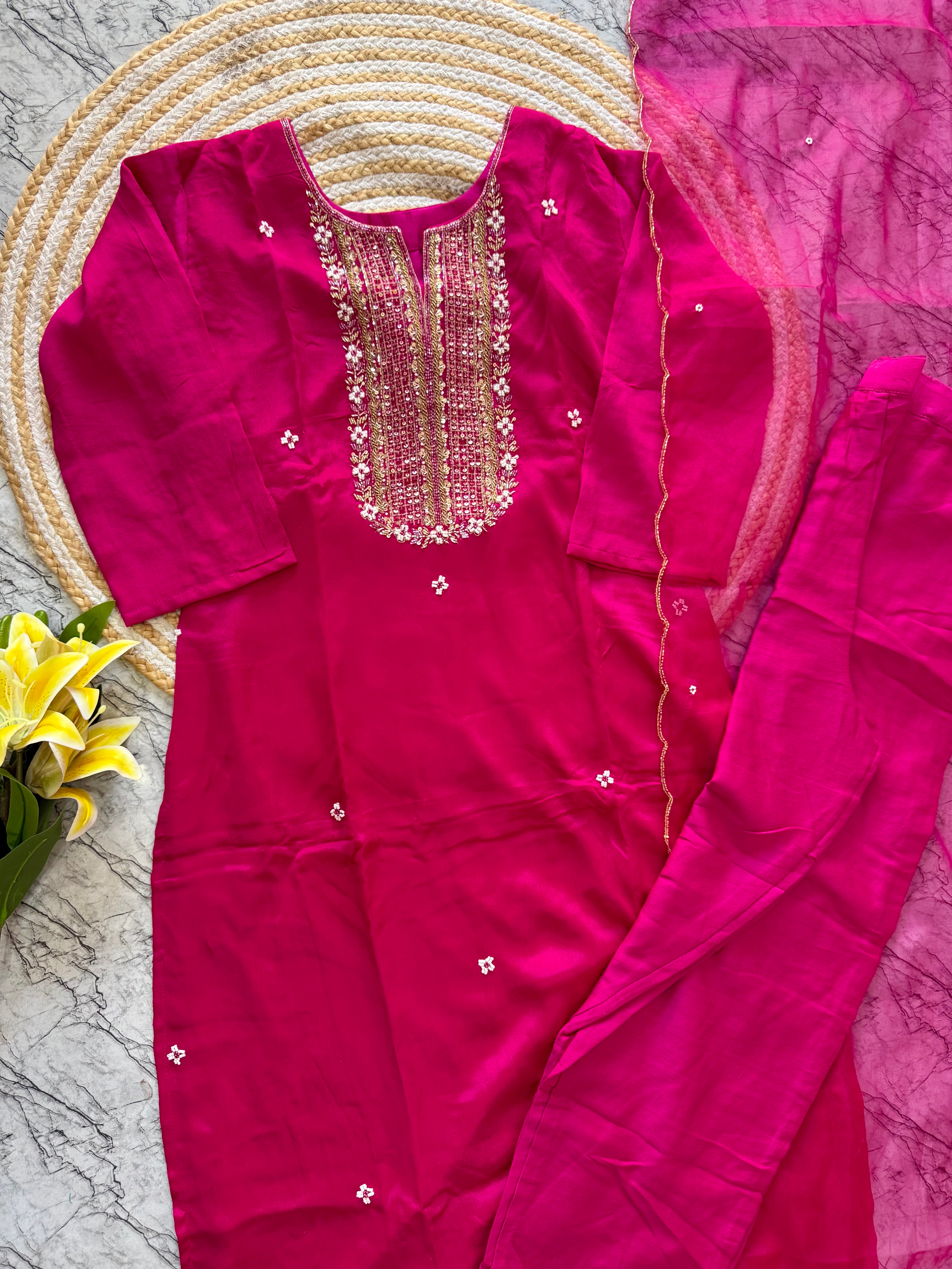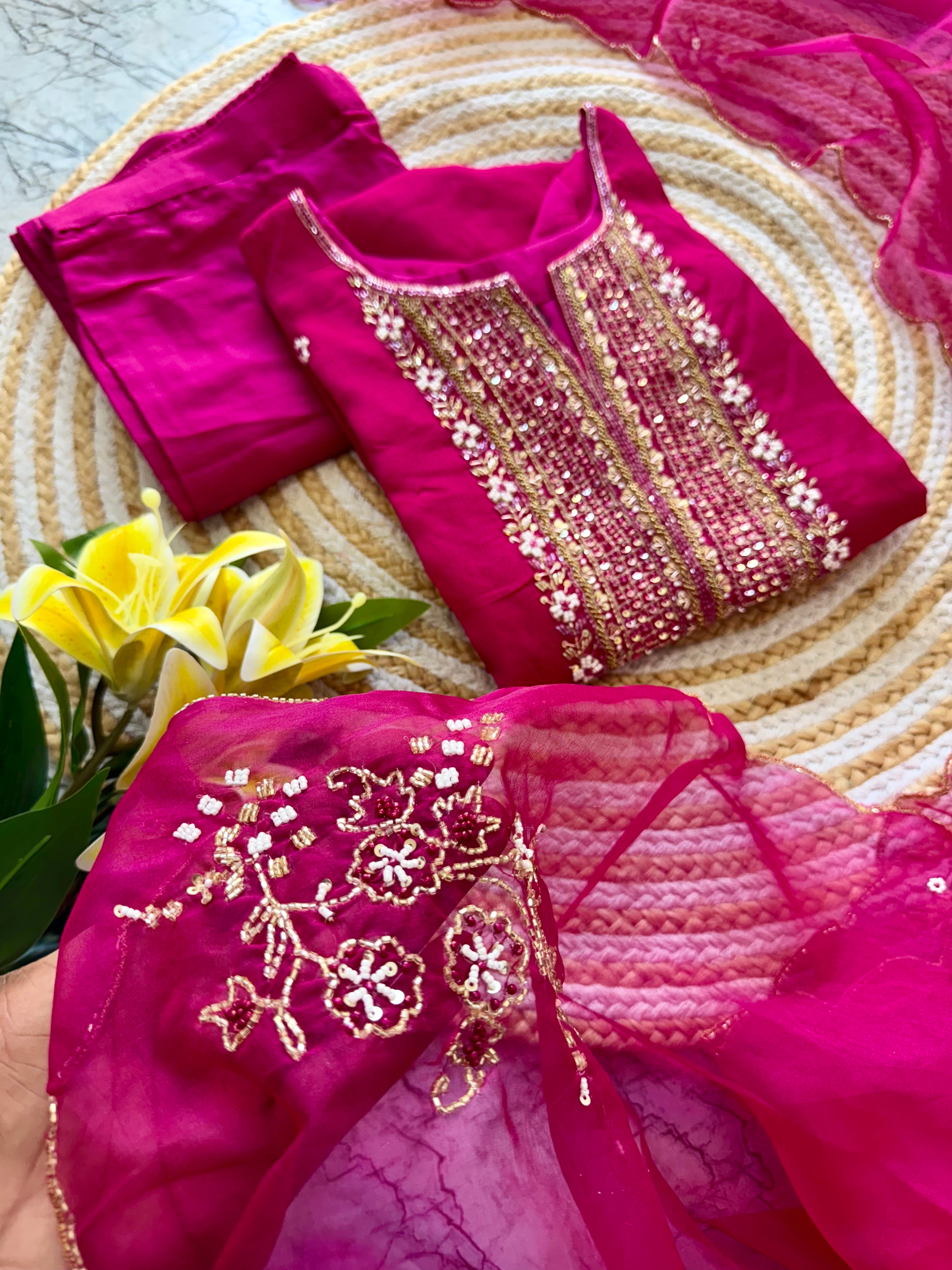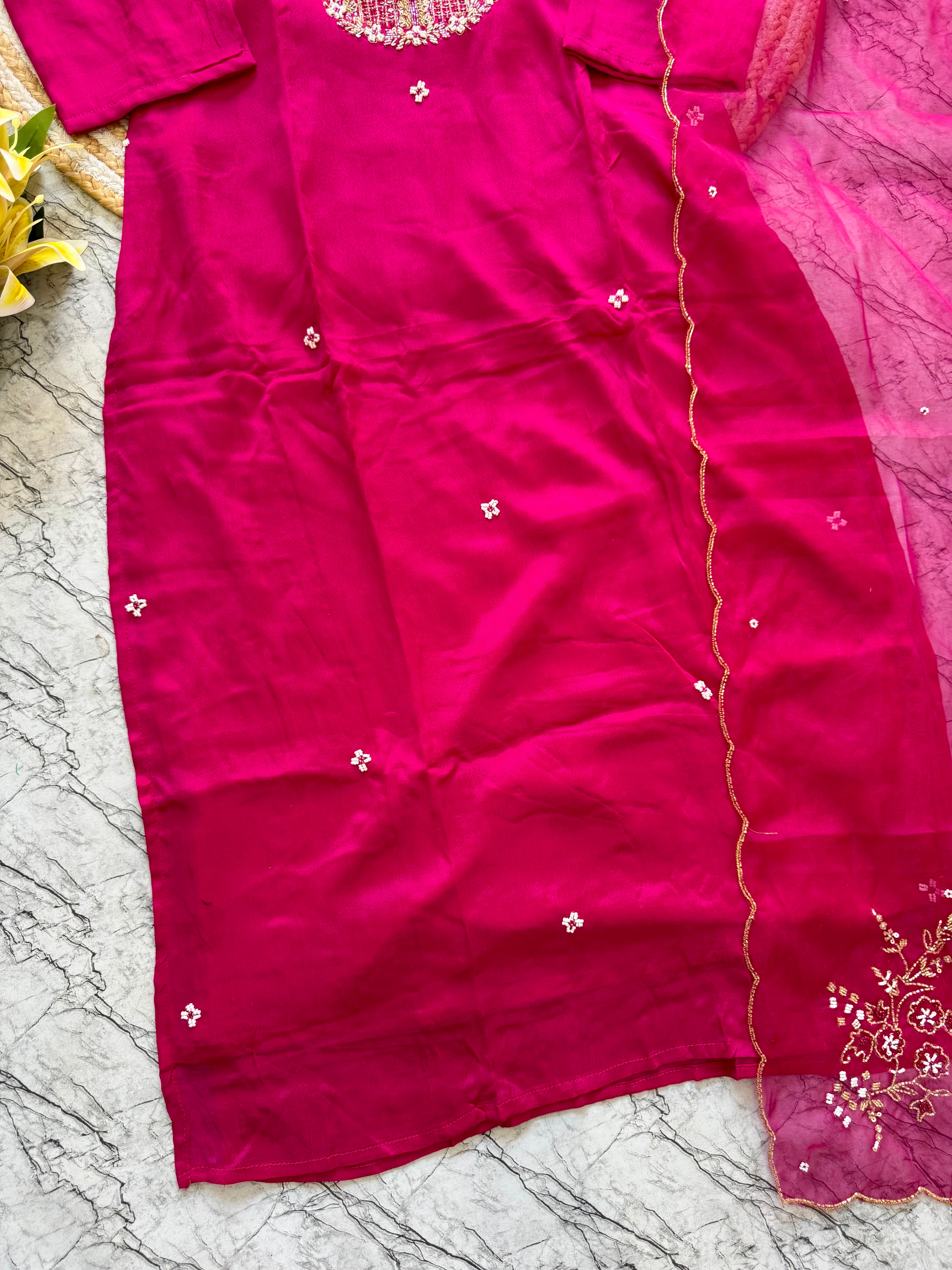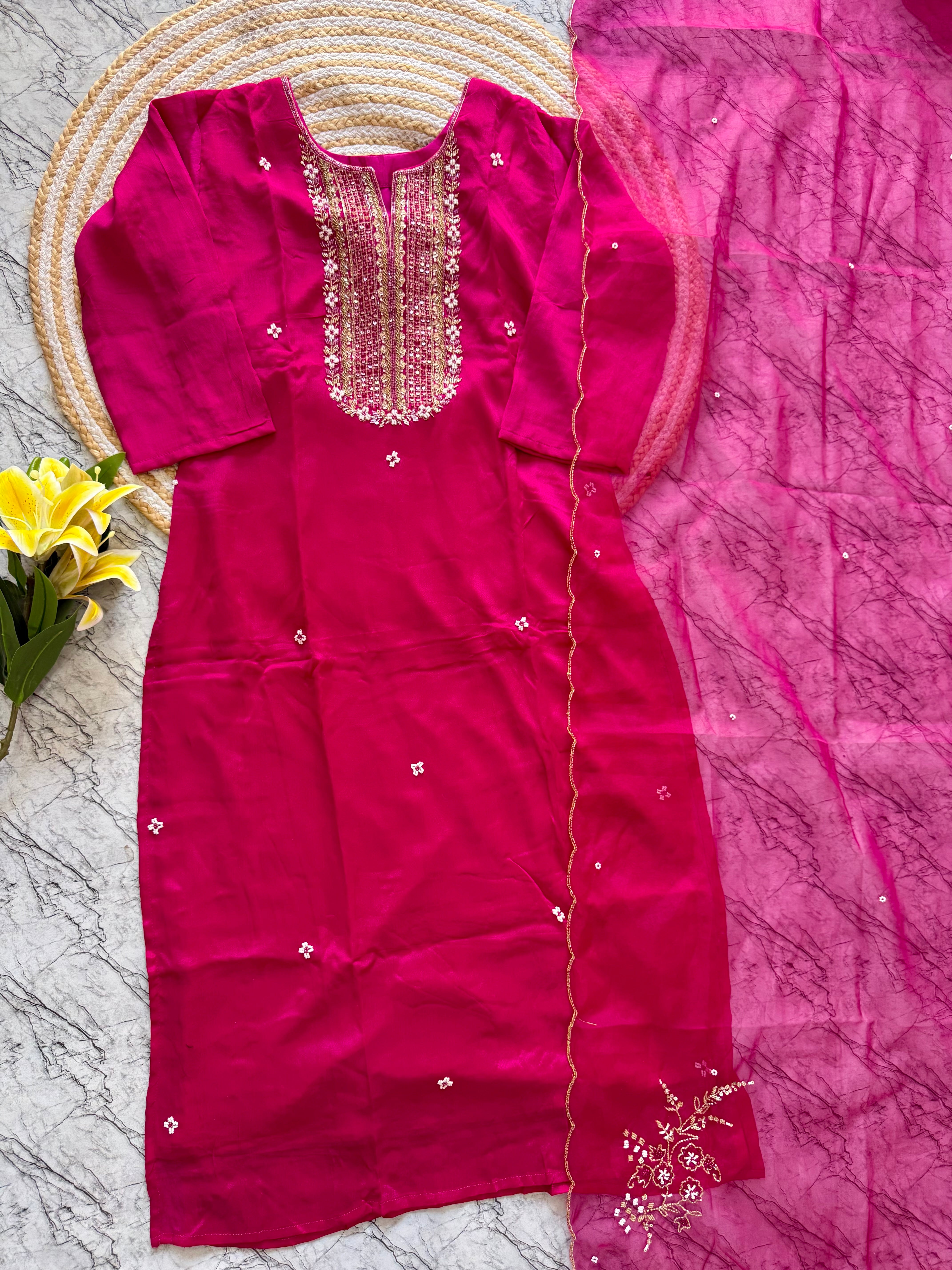 Handcrafted Russian silk kurti with handwork on the yoke of the kurta with a long handwork detailed organza dupatta with a silk bottom .