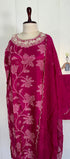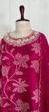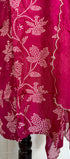 Printed Russian silk set with handwork work on the yoke of the kurta nd sleeves with a long organs scalping dupatta with a silk bottom