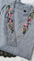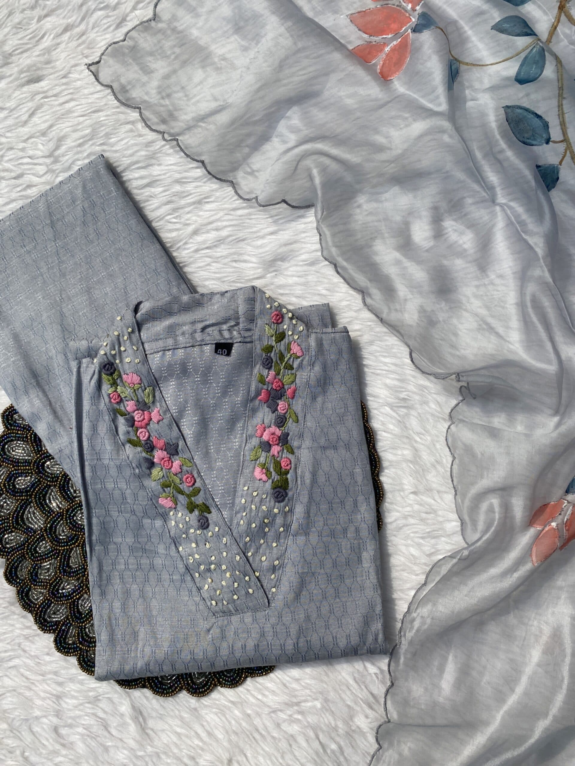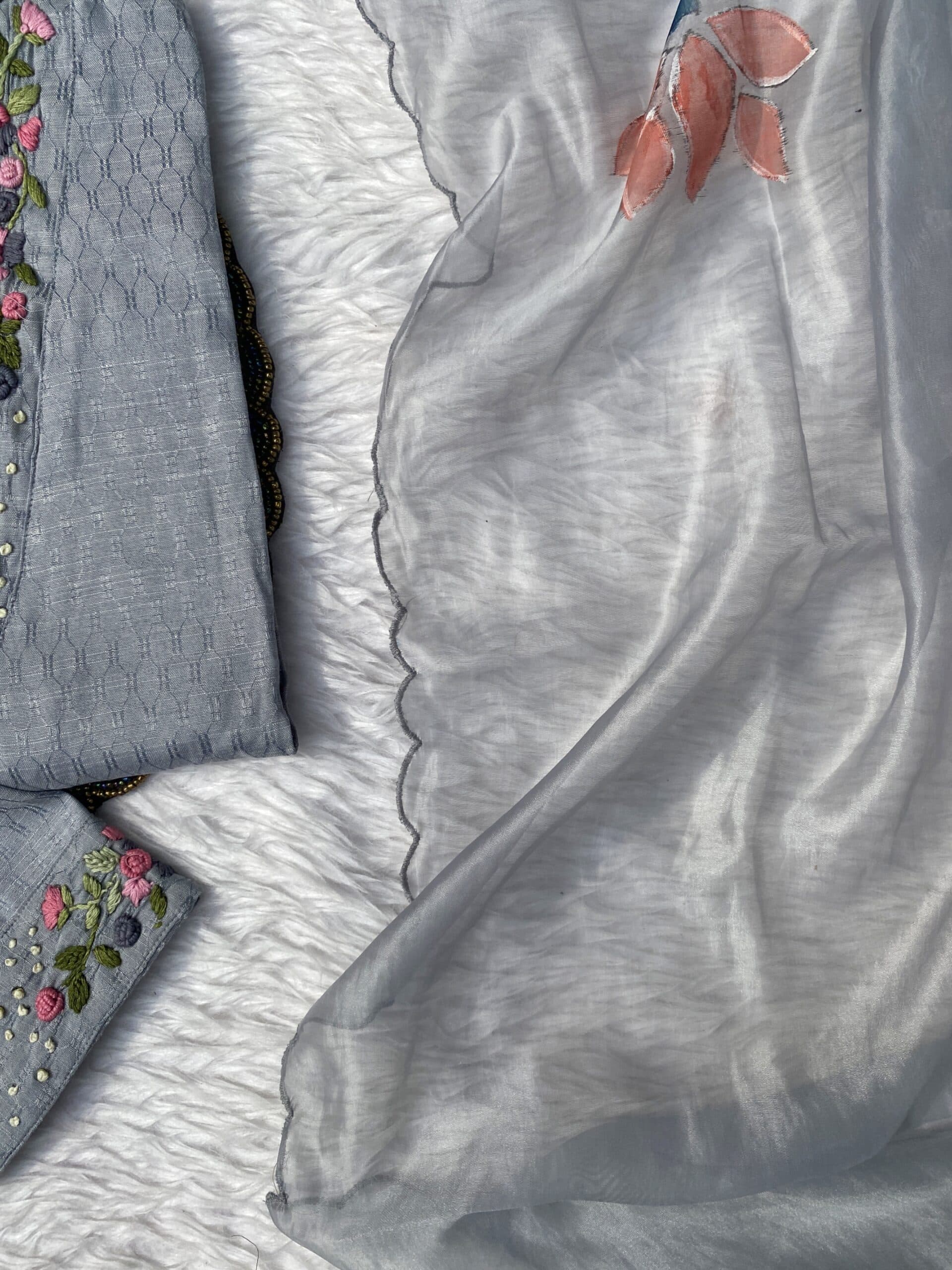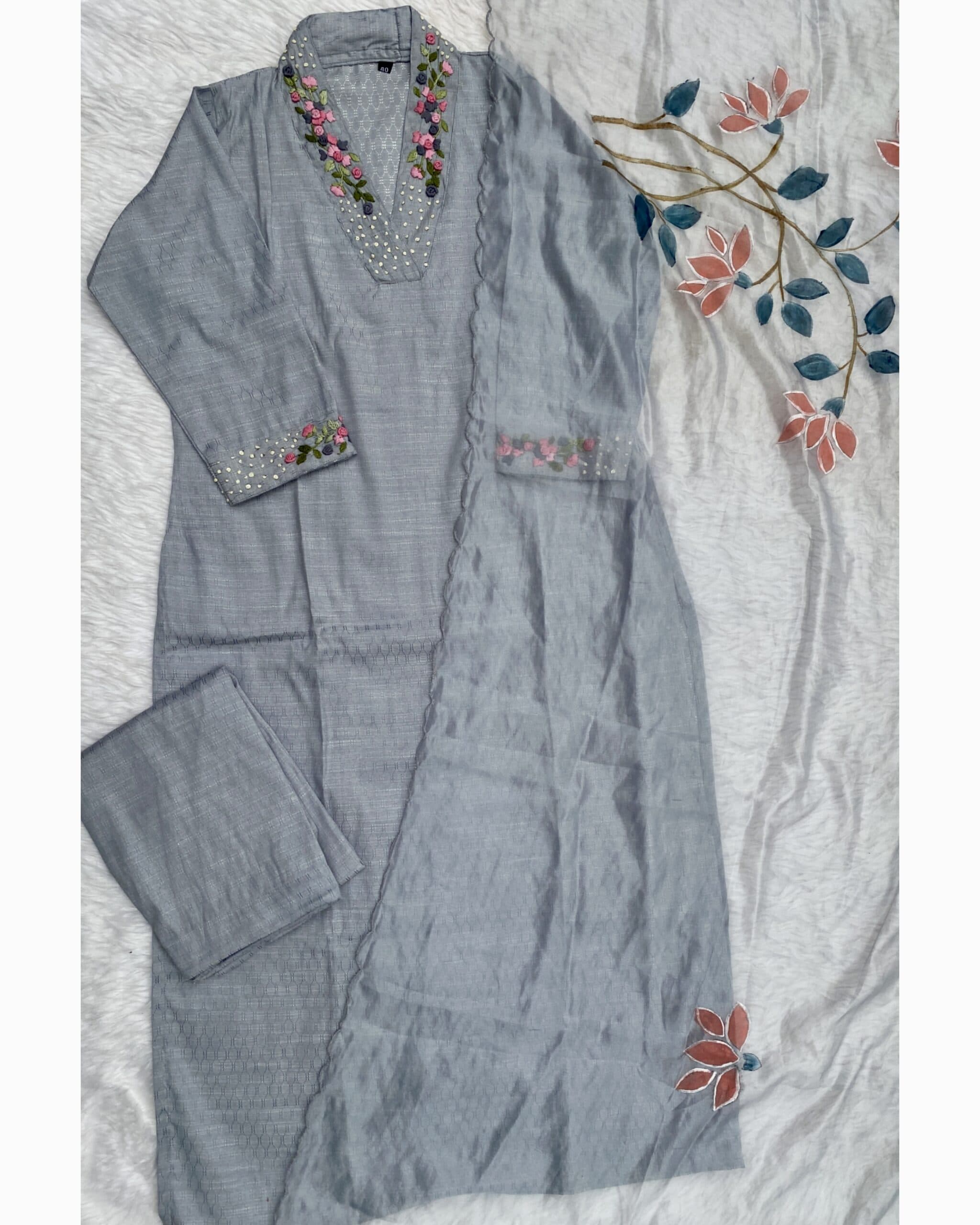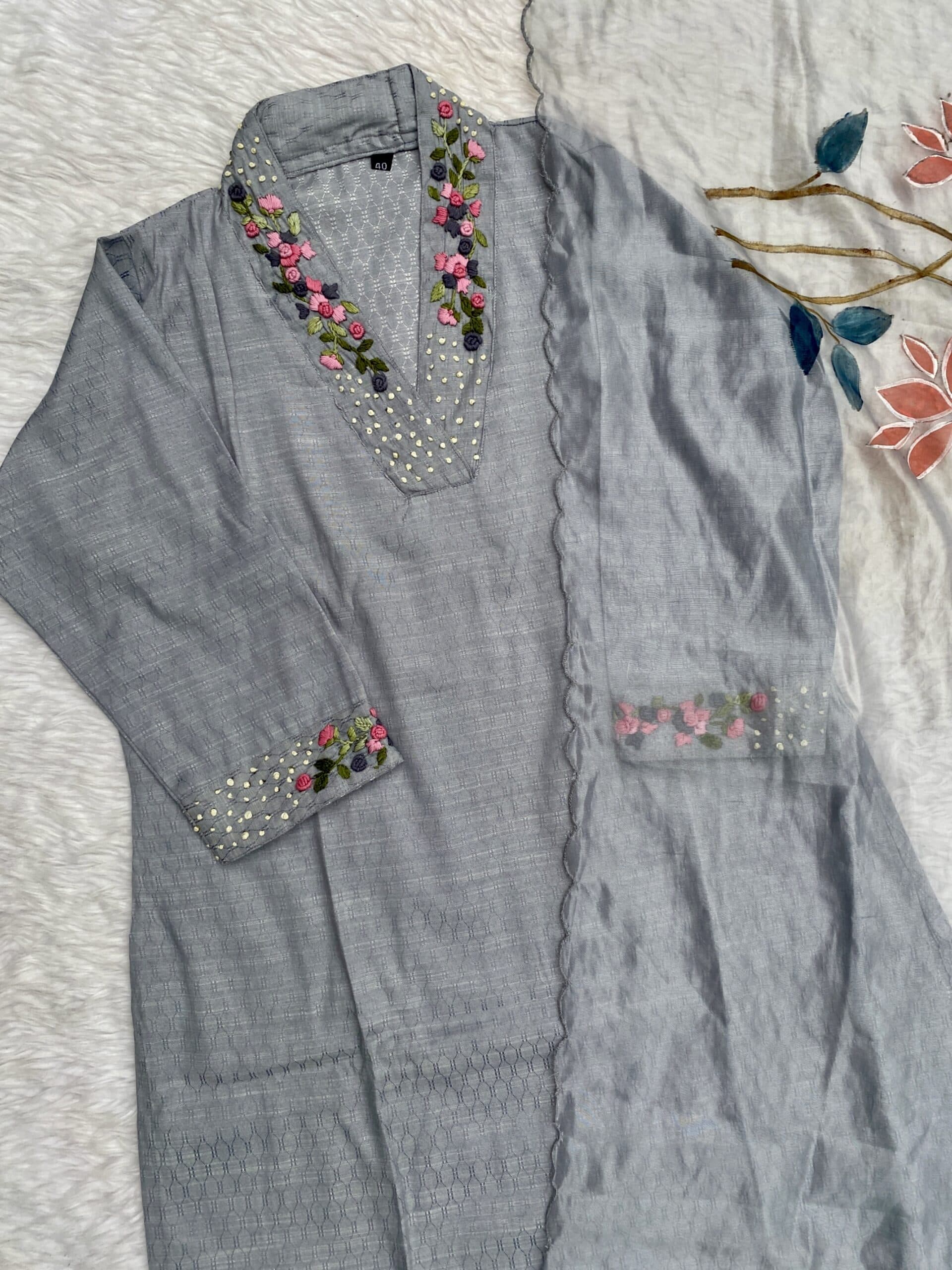 ‘’GULSHAN” Gray cotton handwork kurti dupatta bottom set