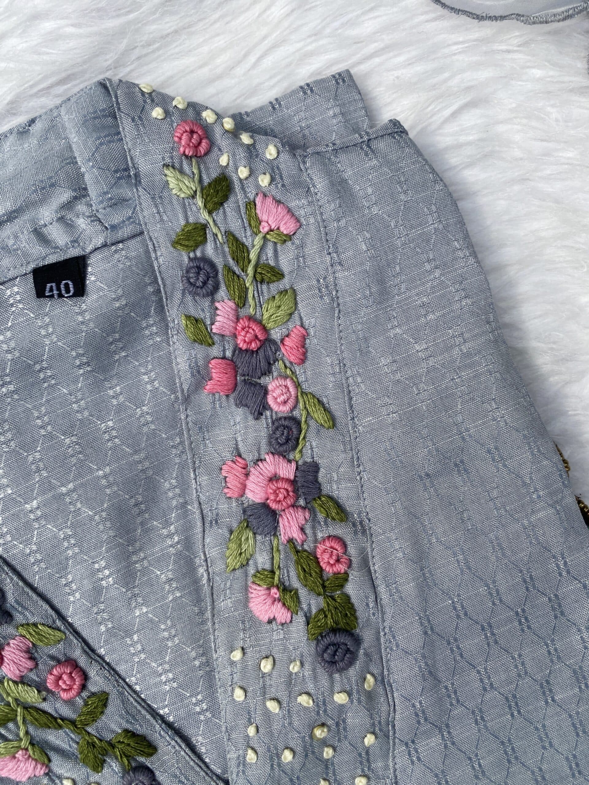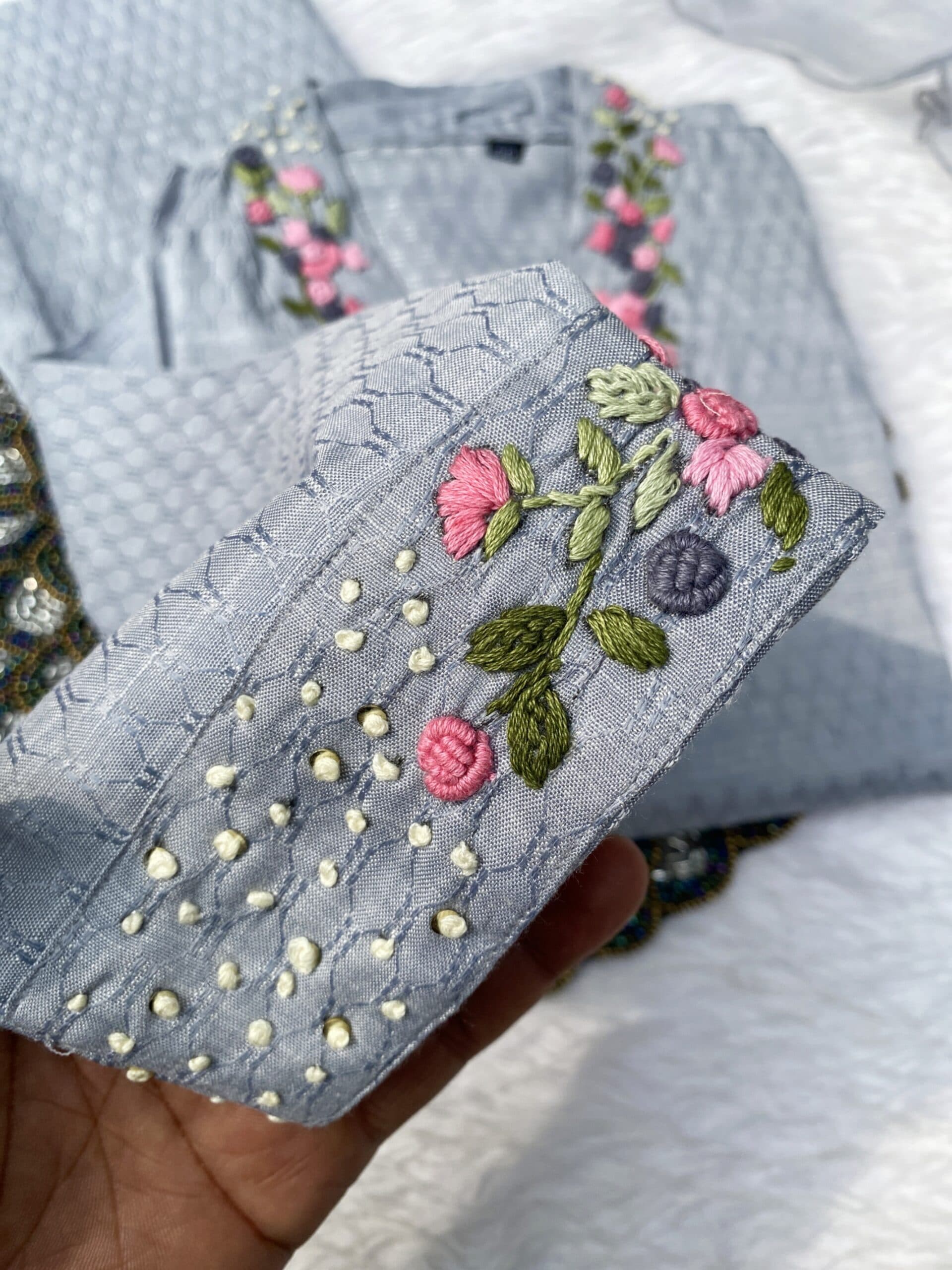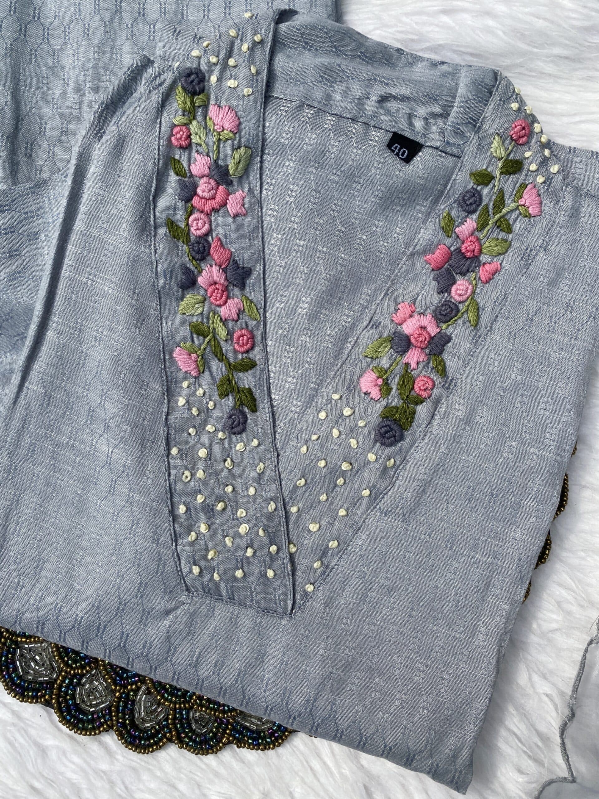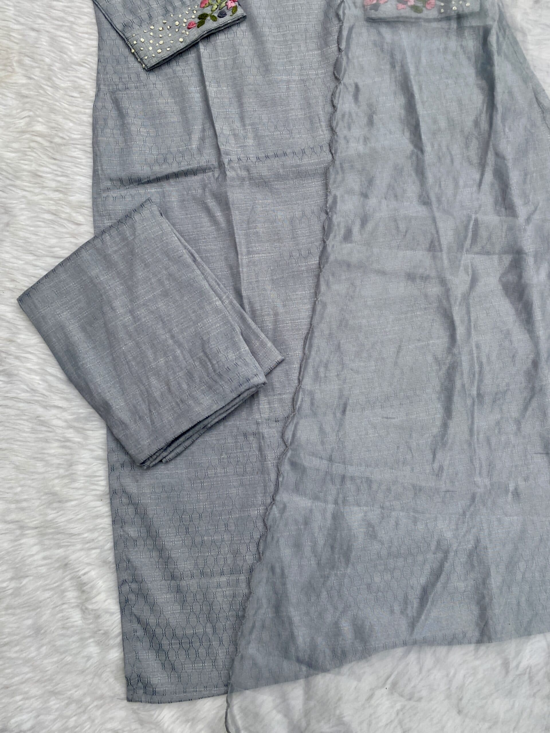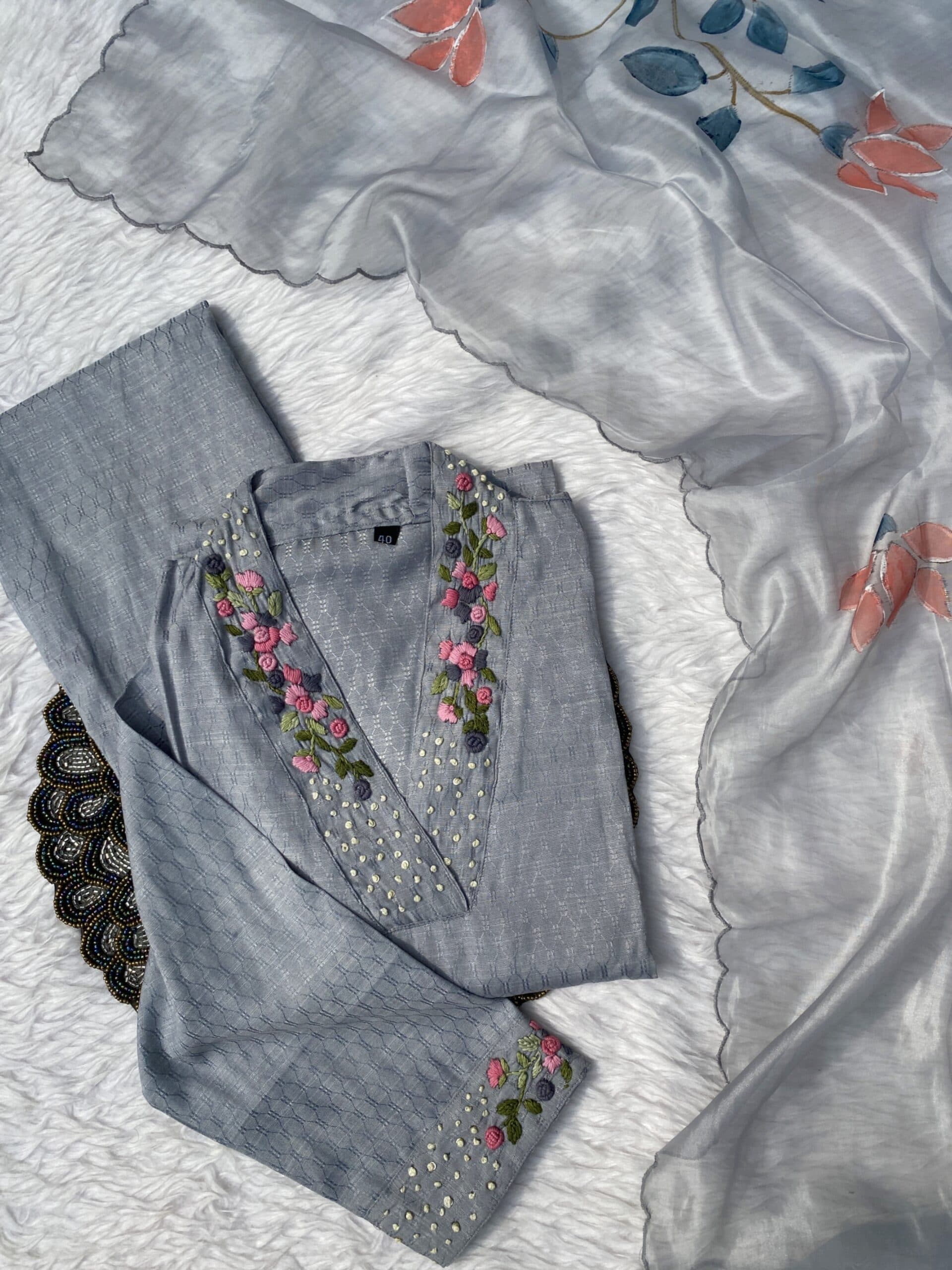 ‘’GULSHAN” Gray cotton handwork kurti dupatta bottom set