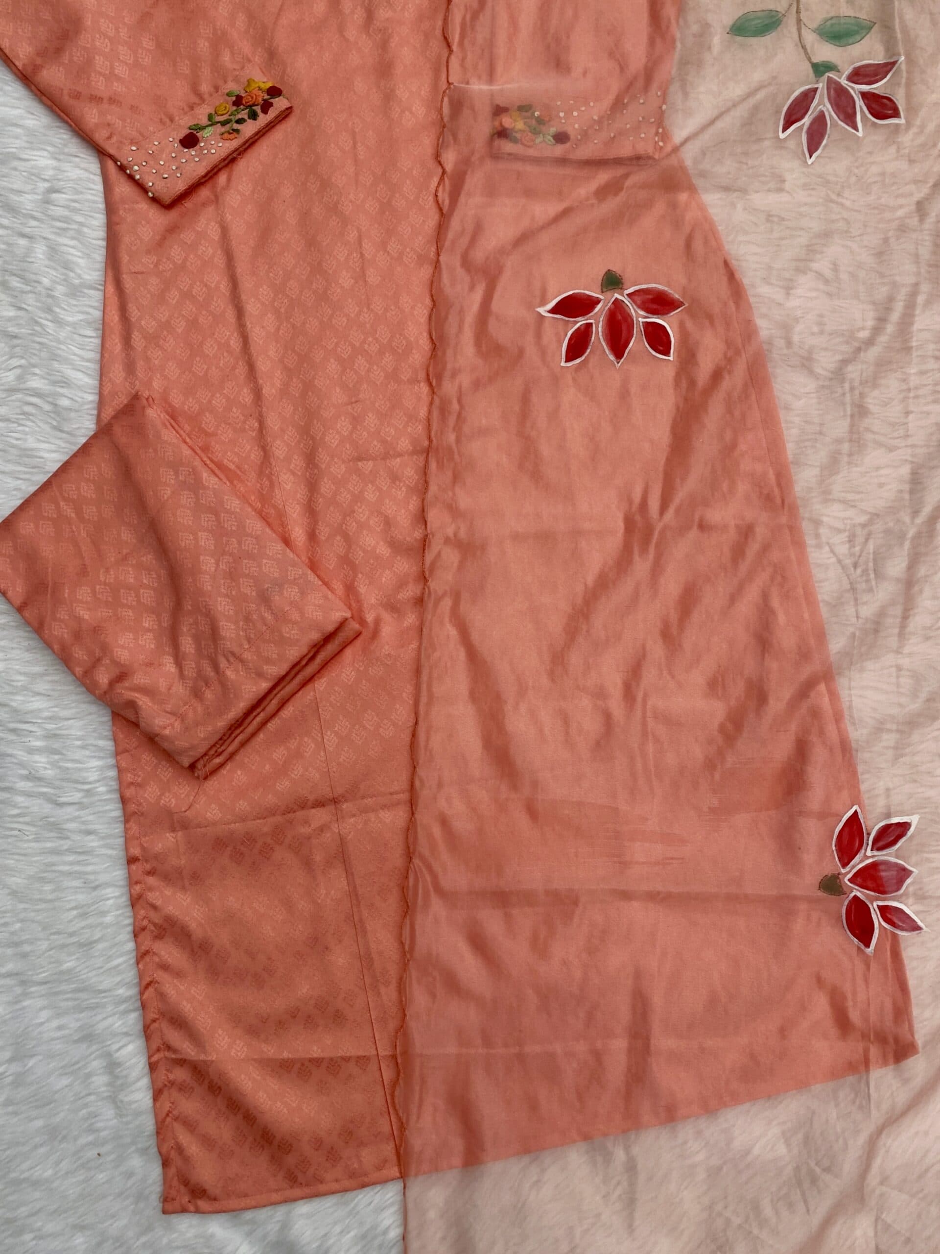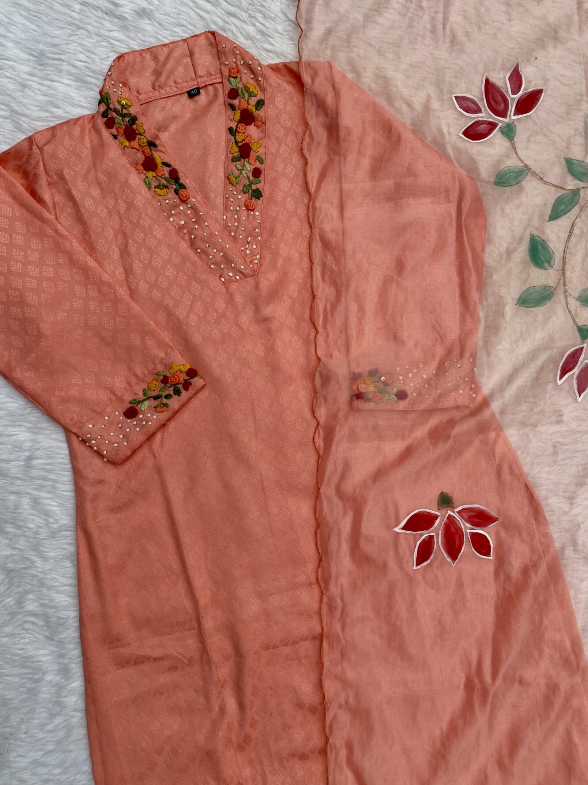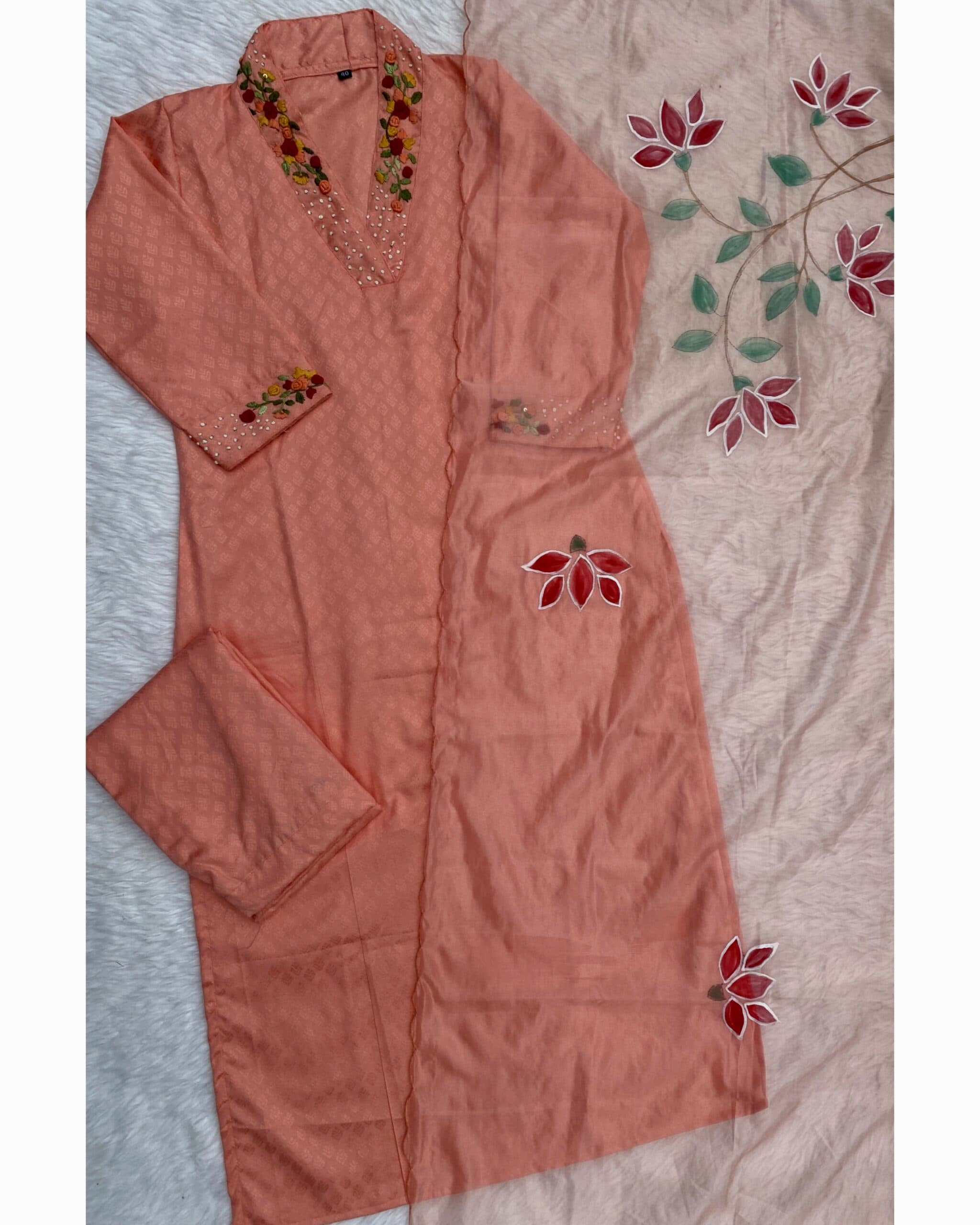 ‘’GULSHAN” Orange cotton handwork kurti dupatta bottom set