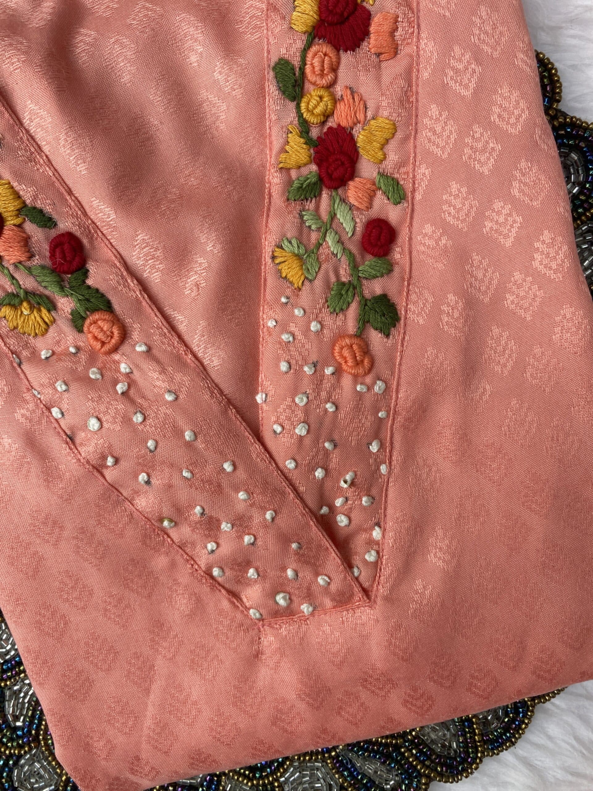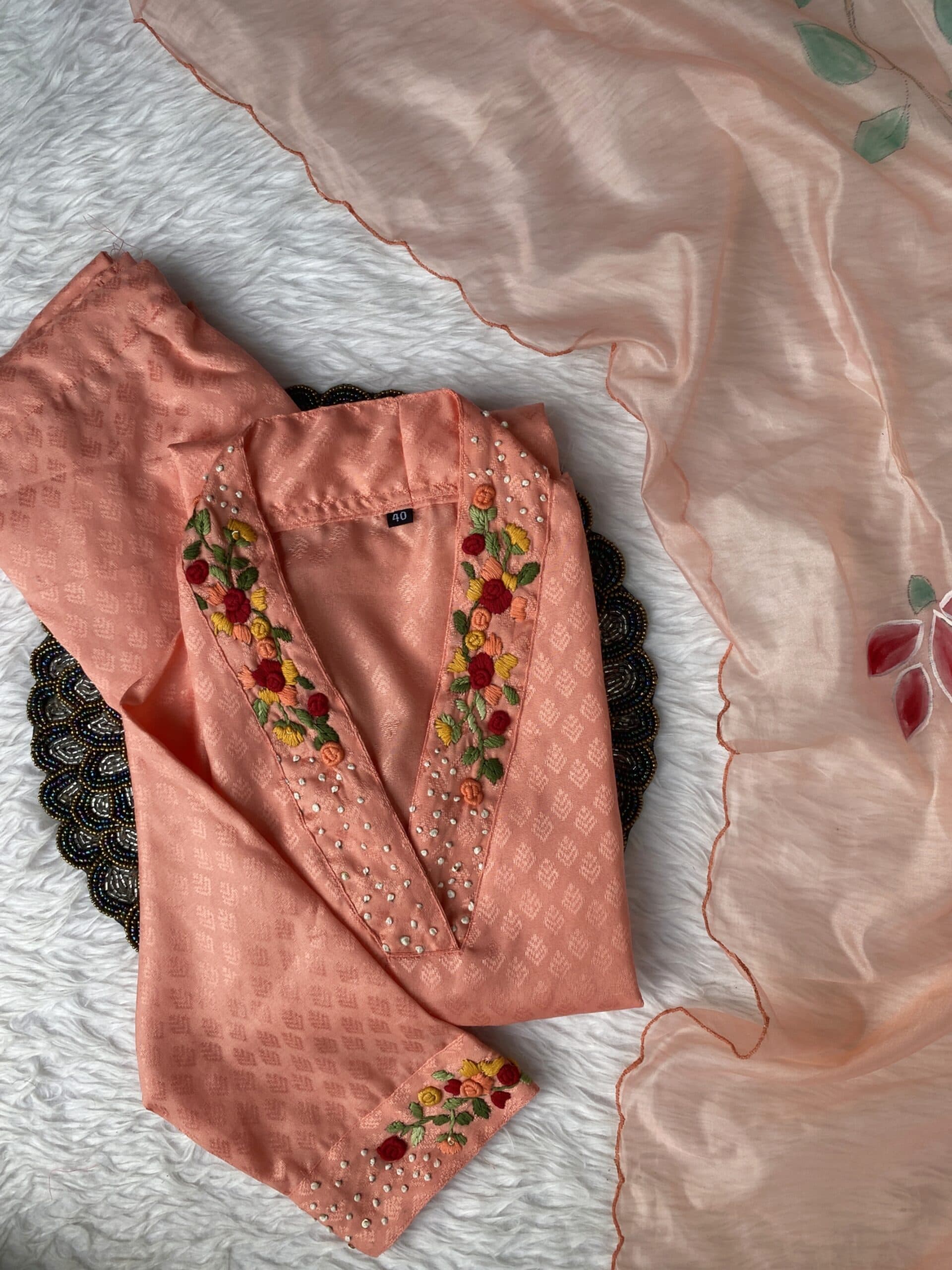 Cotton handwork kurti dupatta bottom set with Thred work with a printed dupatta and a Cotton bottom
