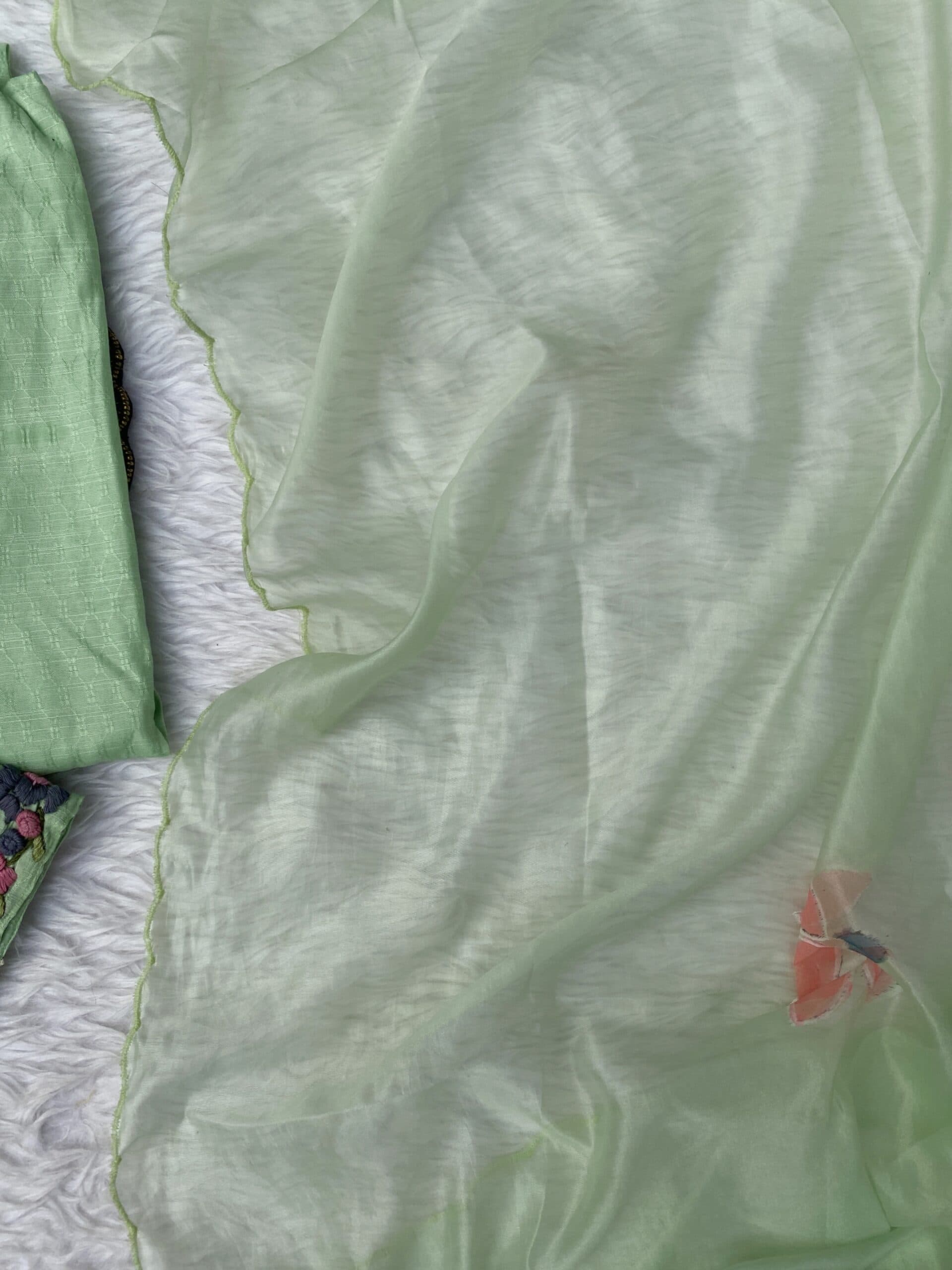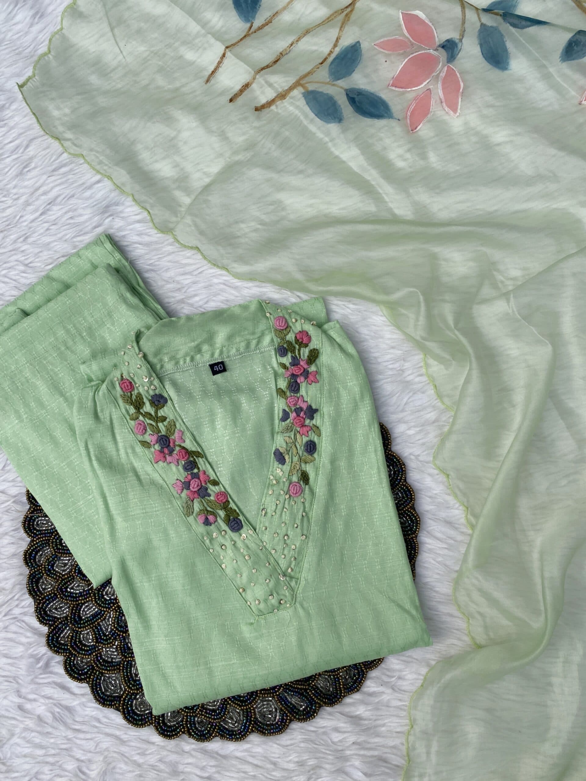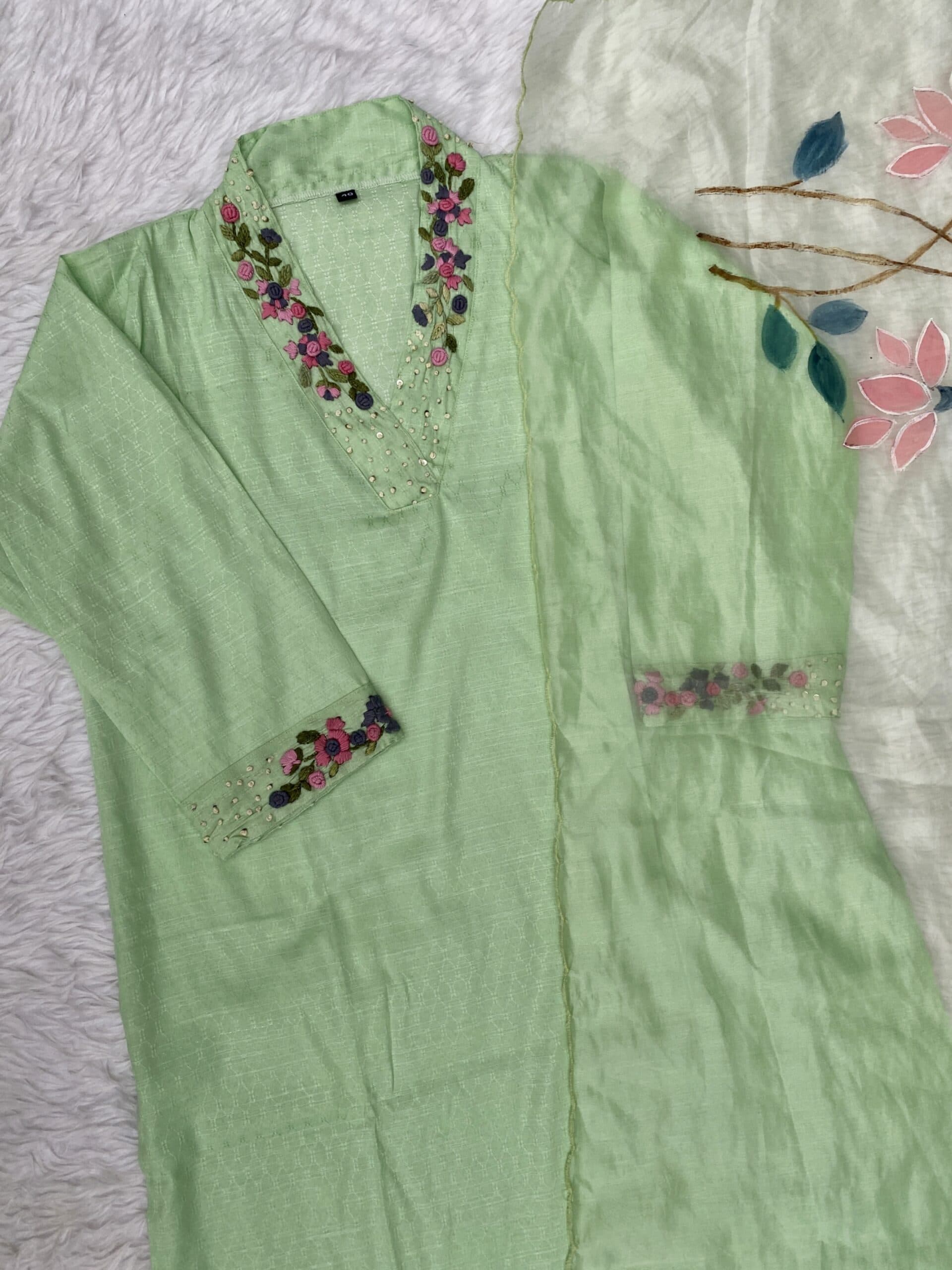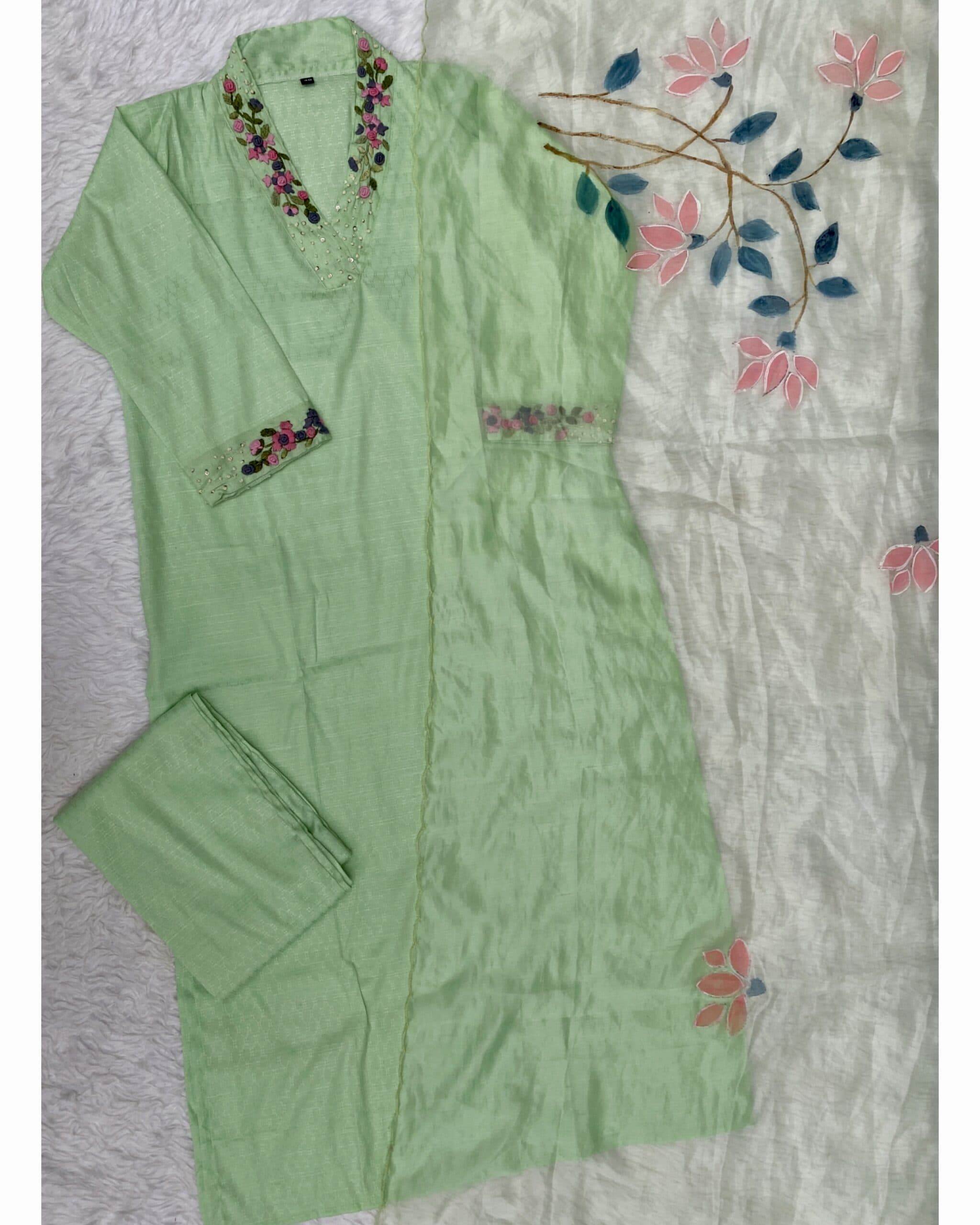 ‘’GULSHAN” Green cotton handwork kurti dupatta bottom set