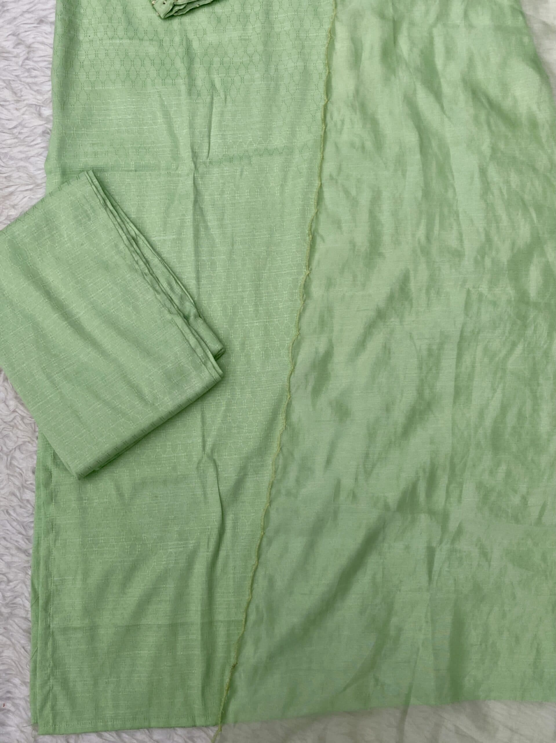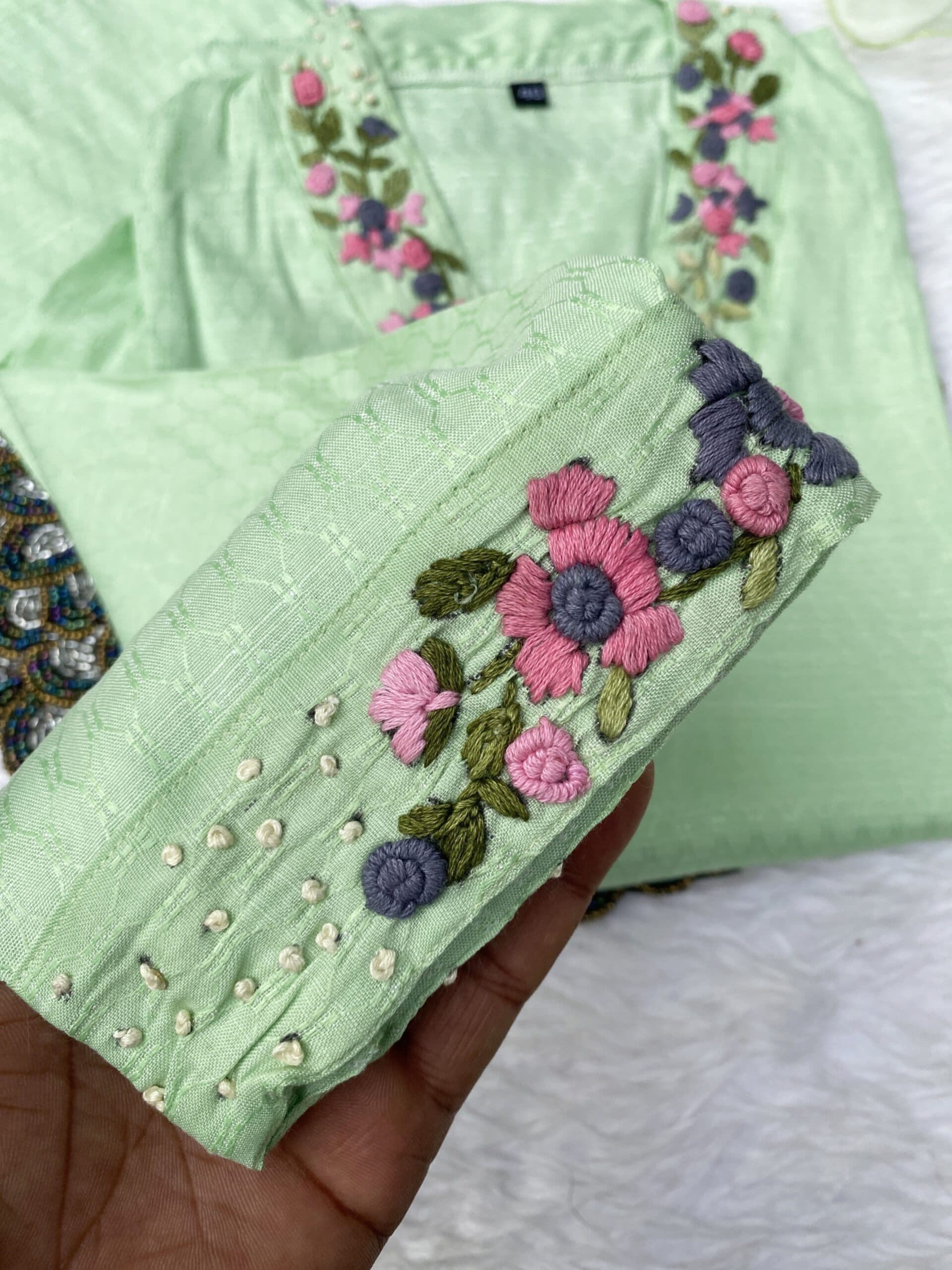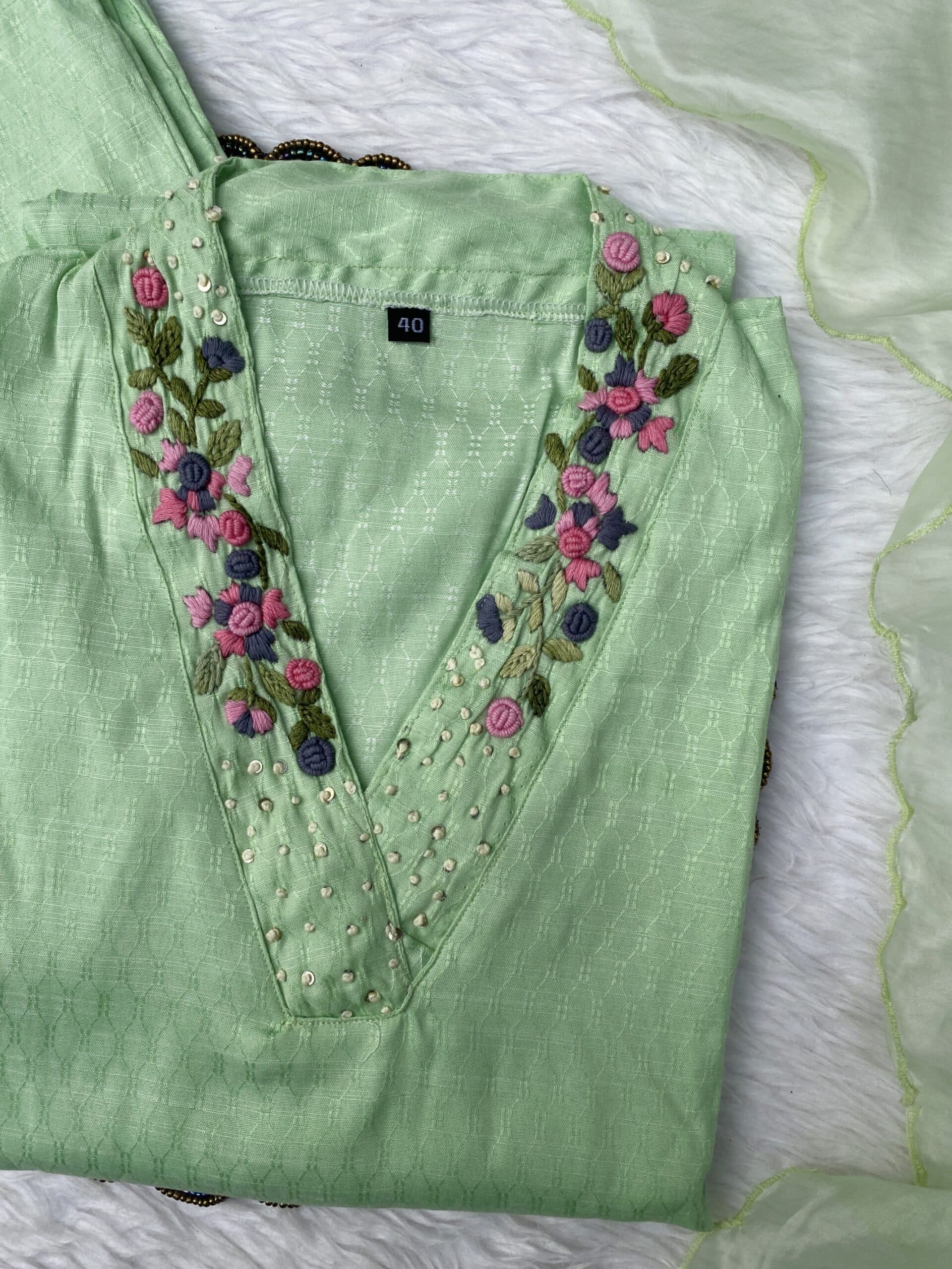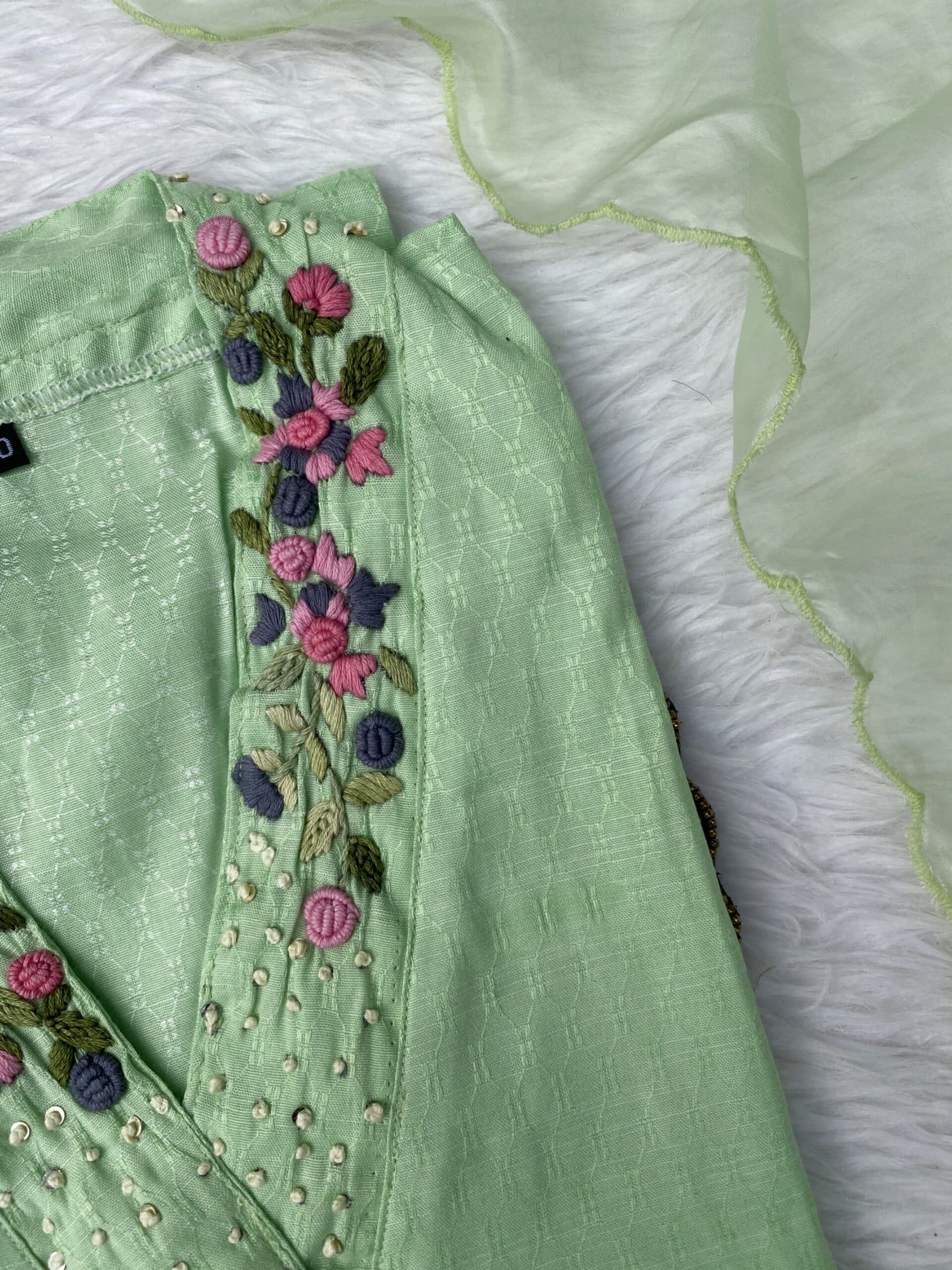 ‘’GULSHAN” Green cotton handwork kurti dupatta bottom set
