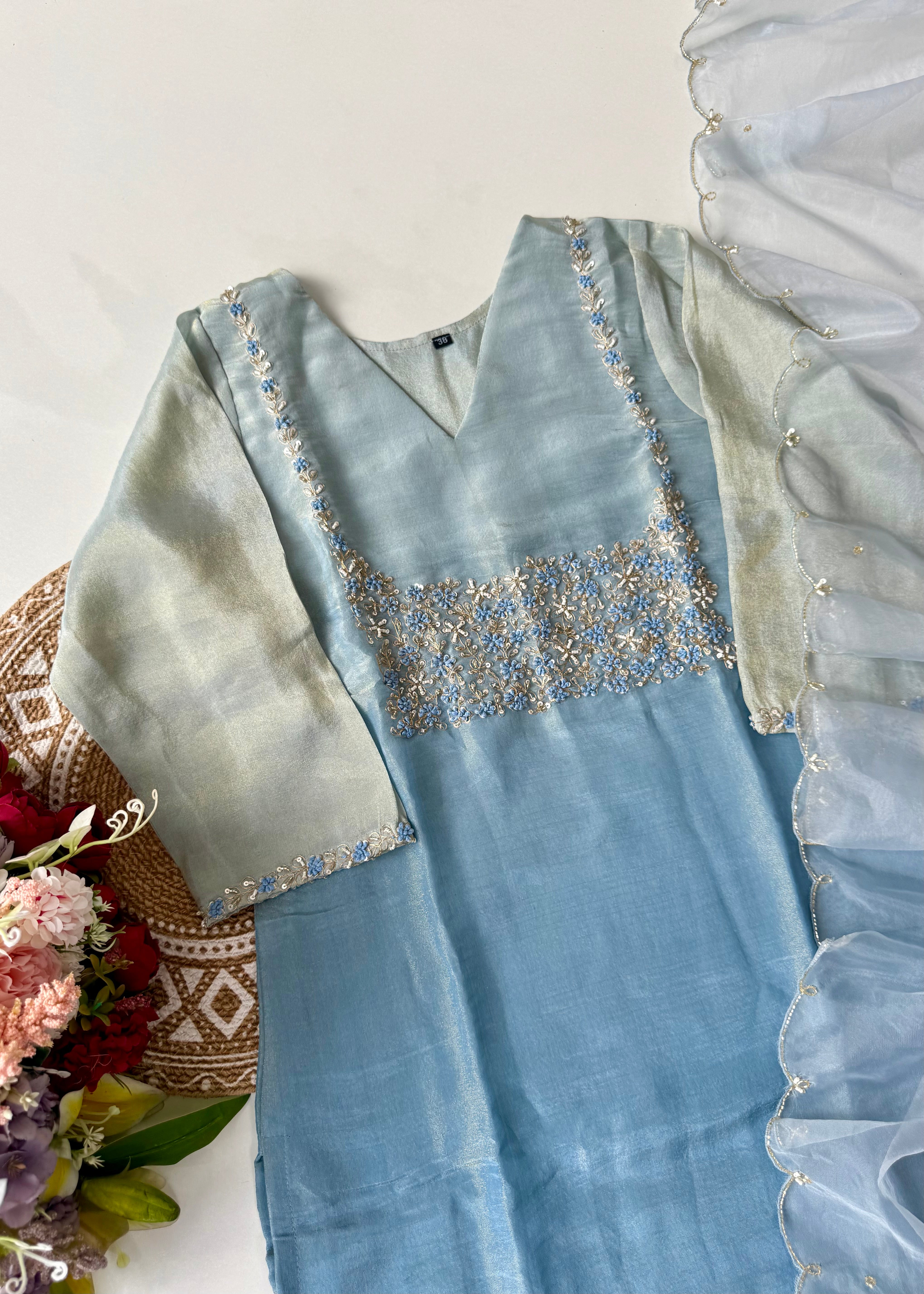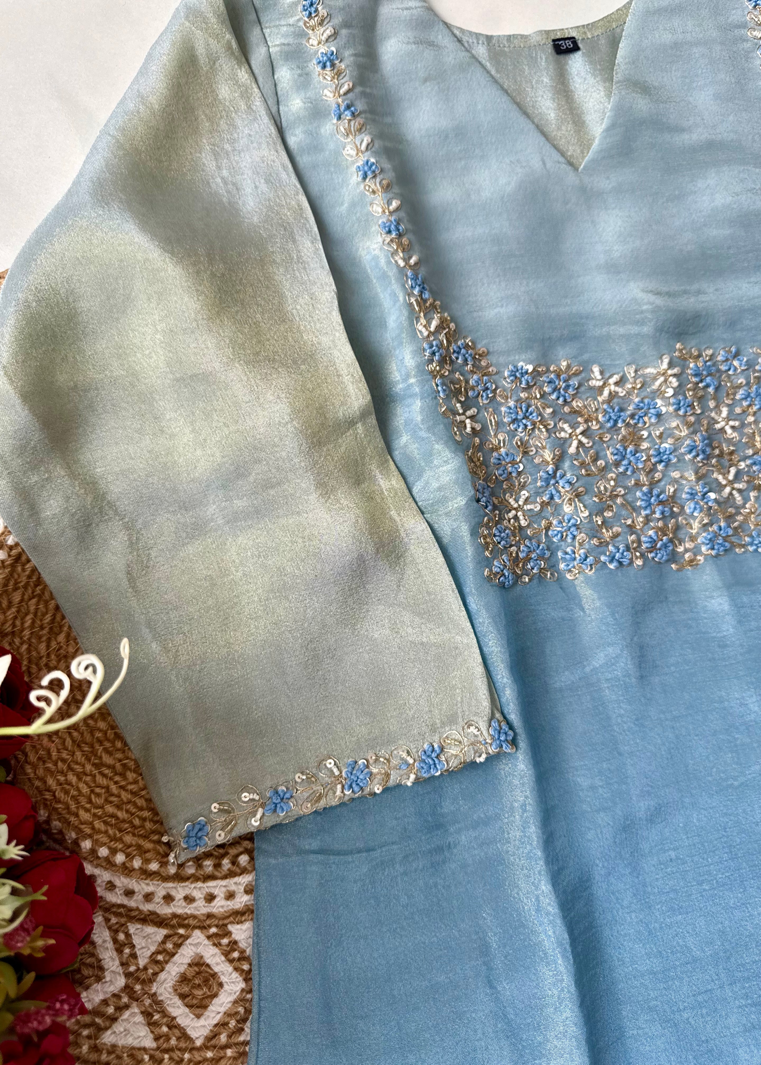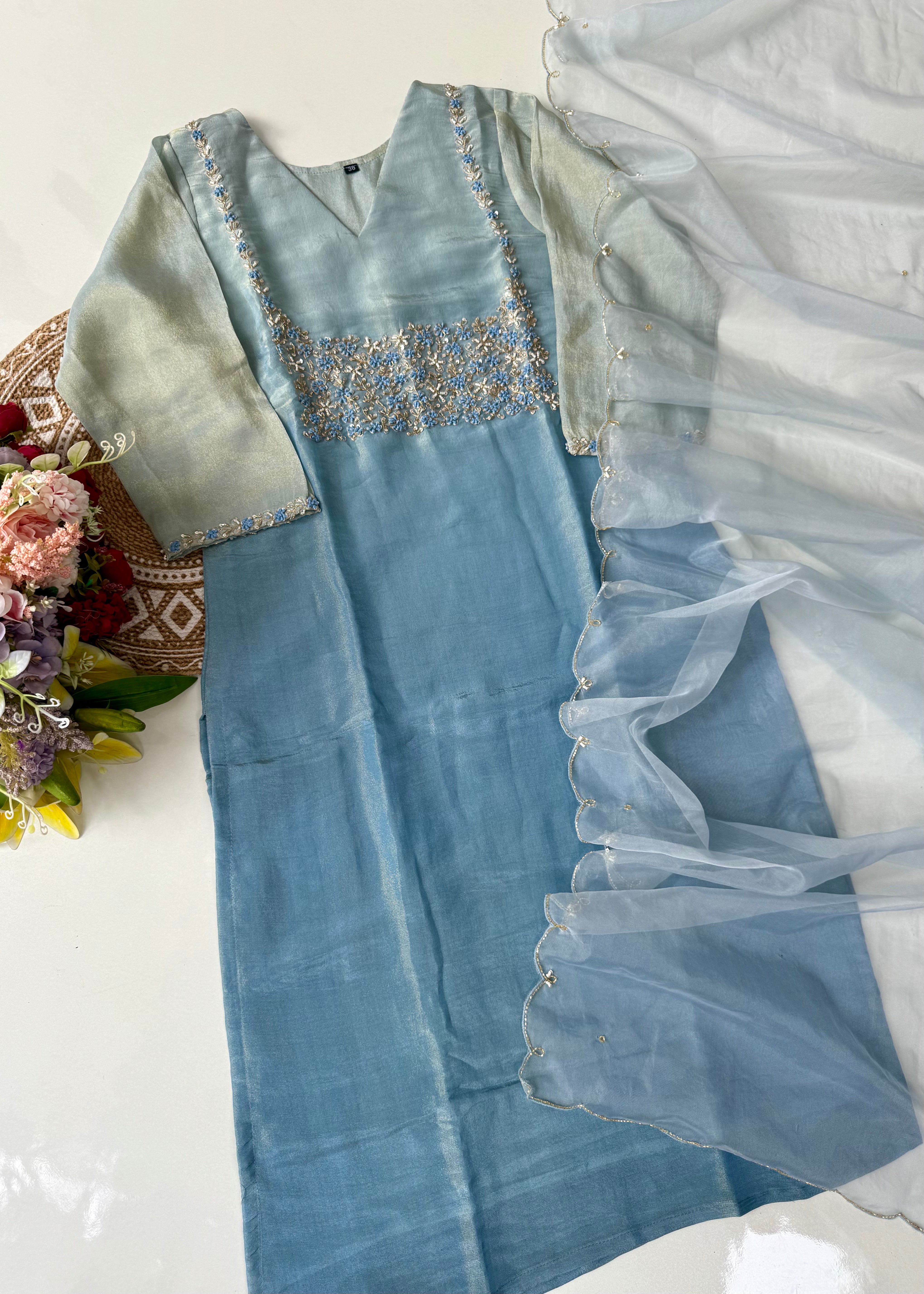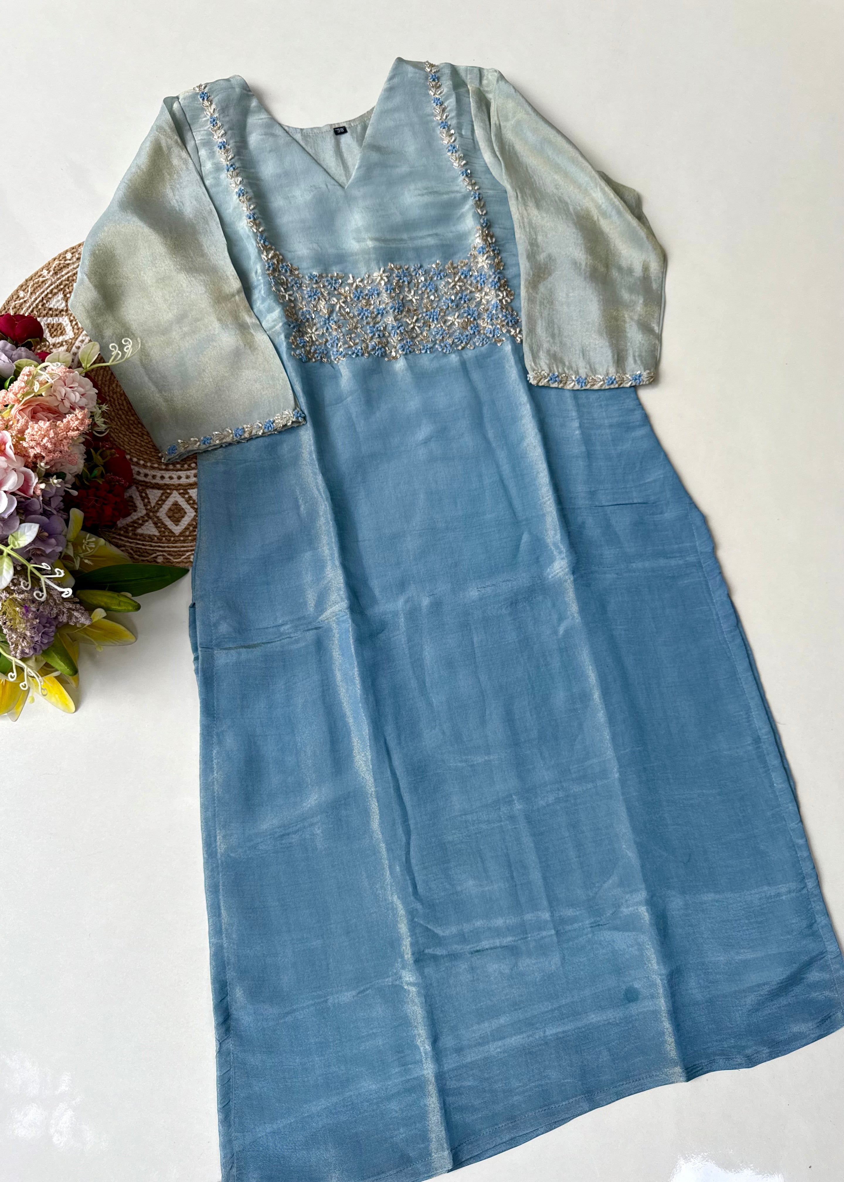 Handcrafted Tissue silk kurti with handwork on the yoke and sleeve of the kurta with a long scalping viscose dupatta with a tissue silk bottom .