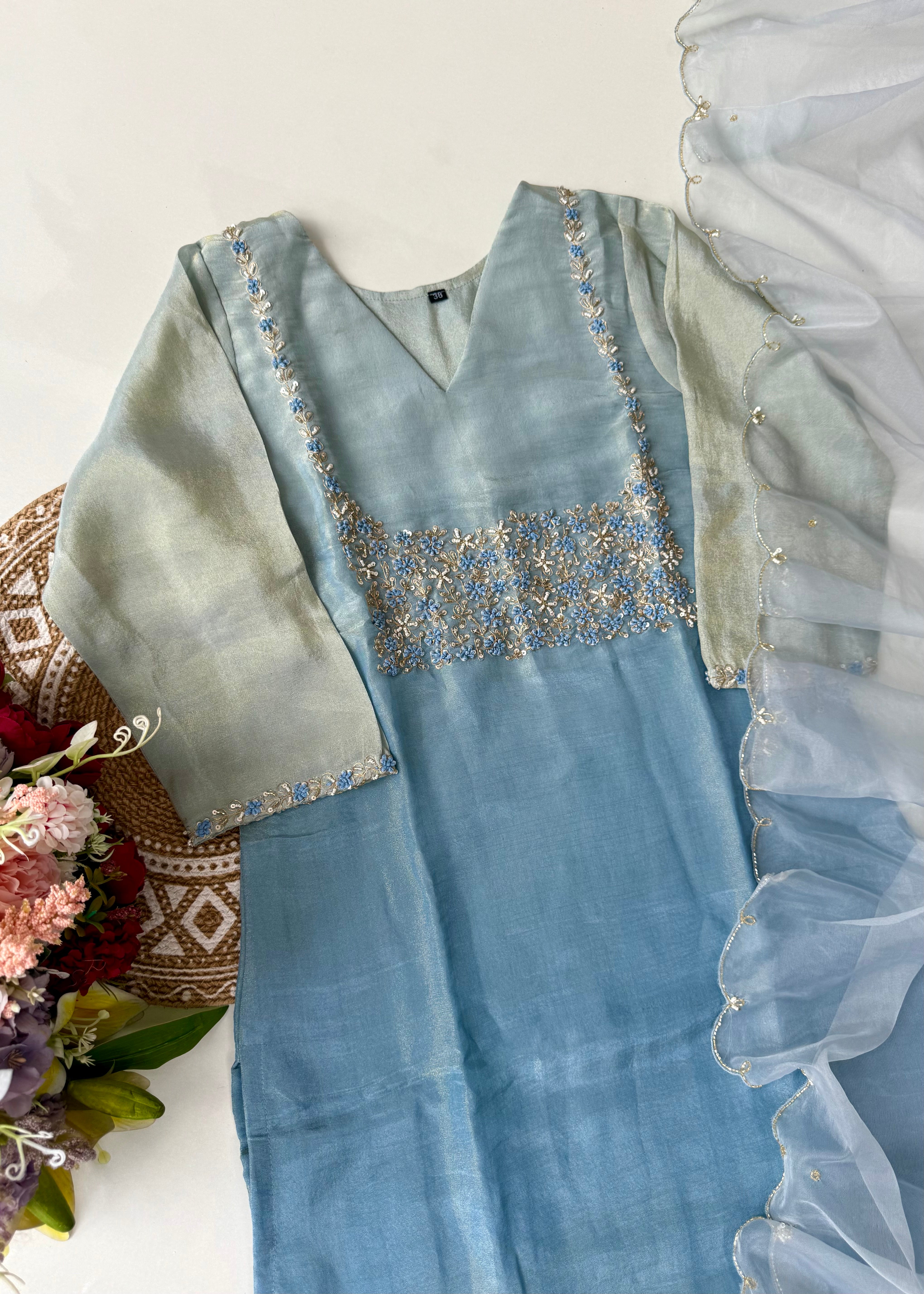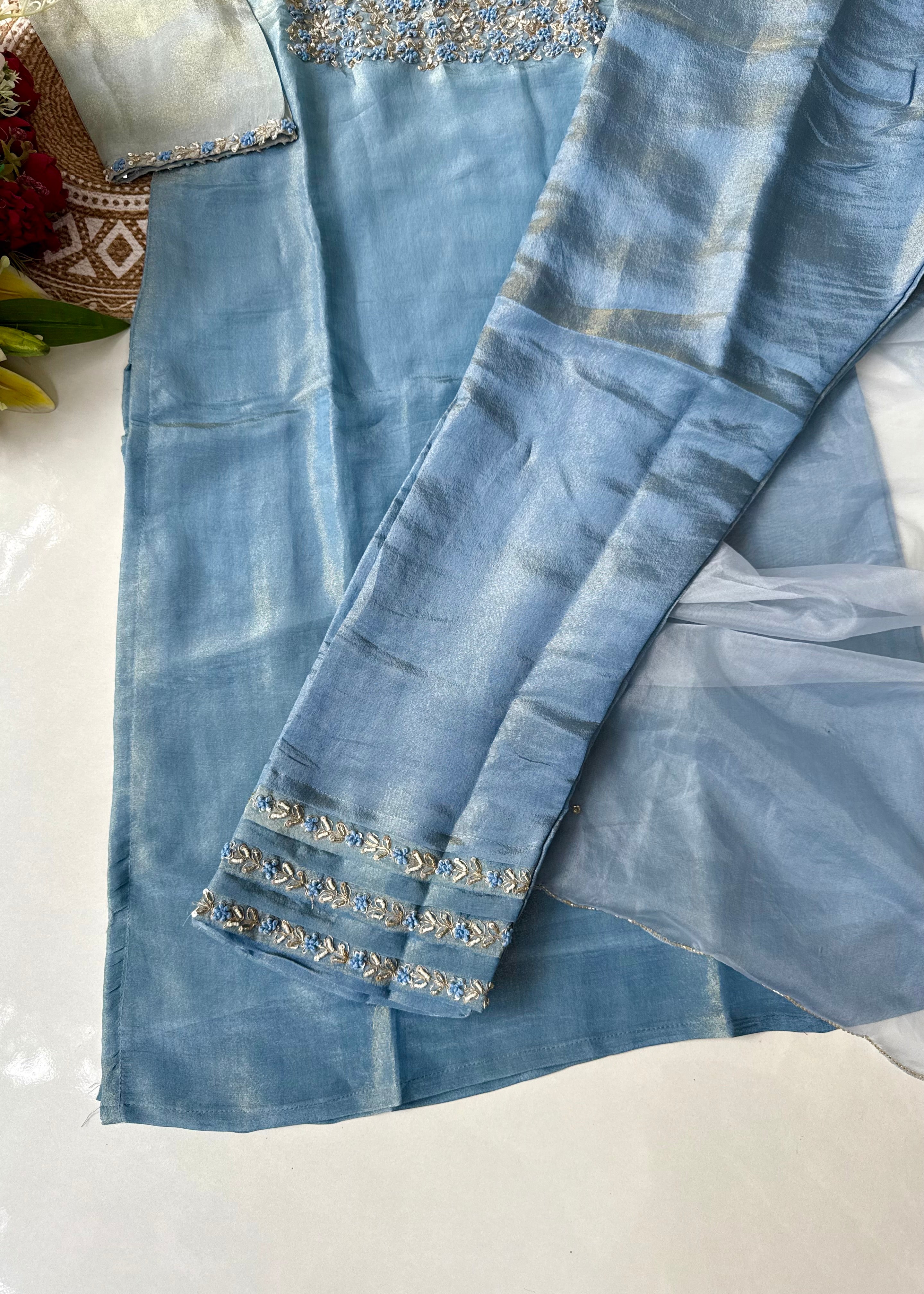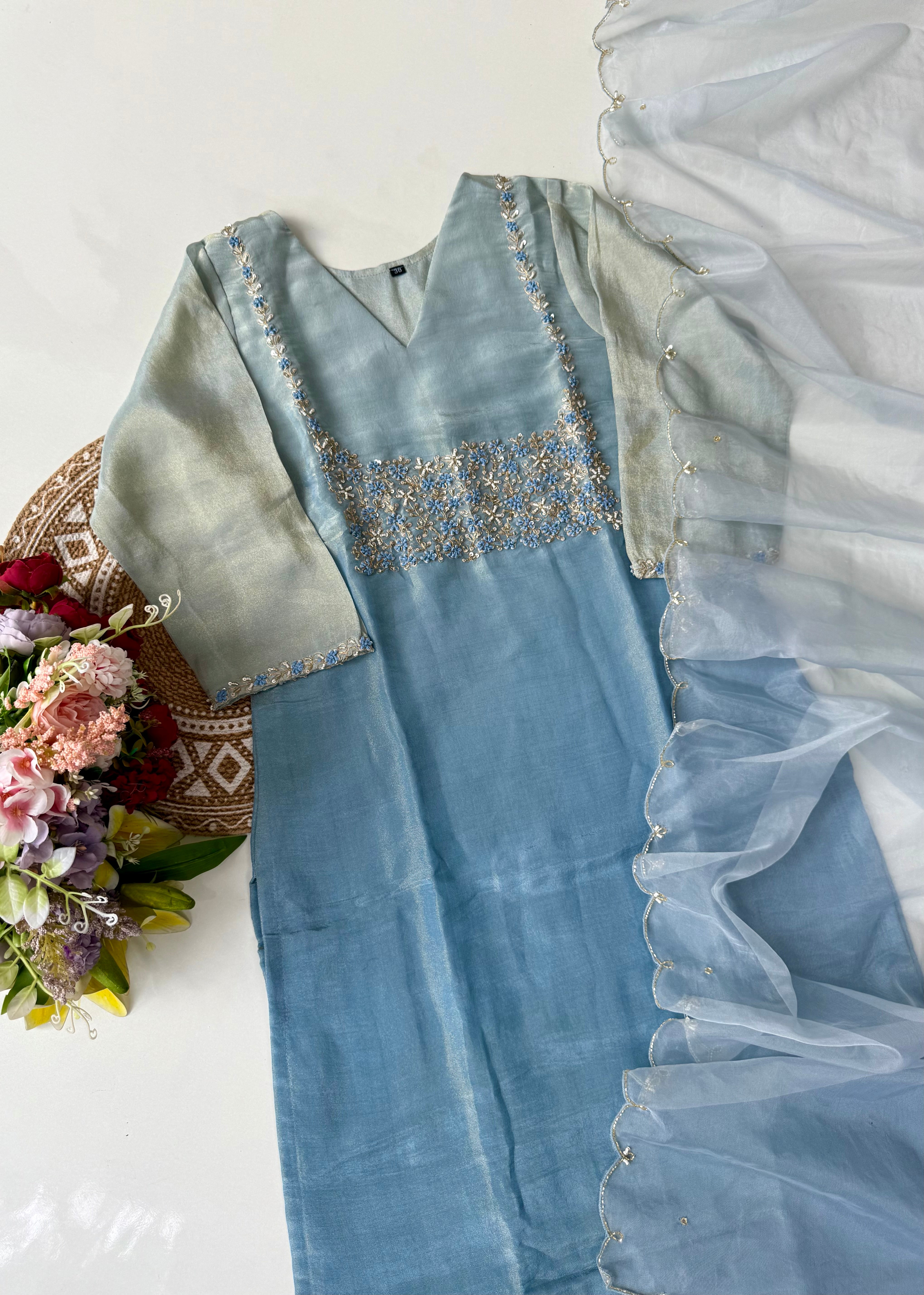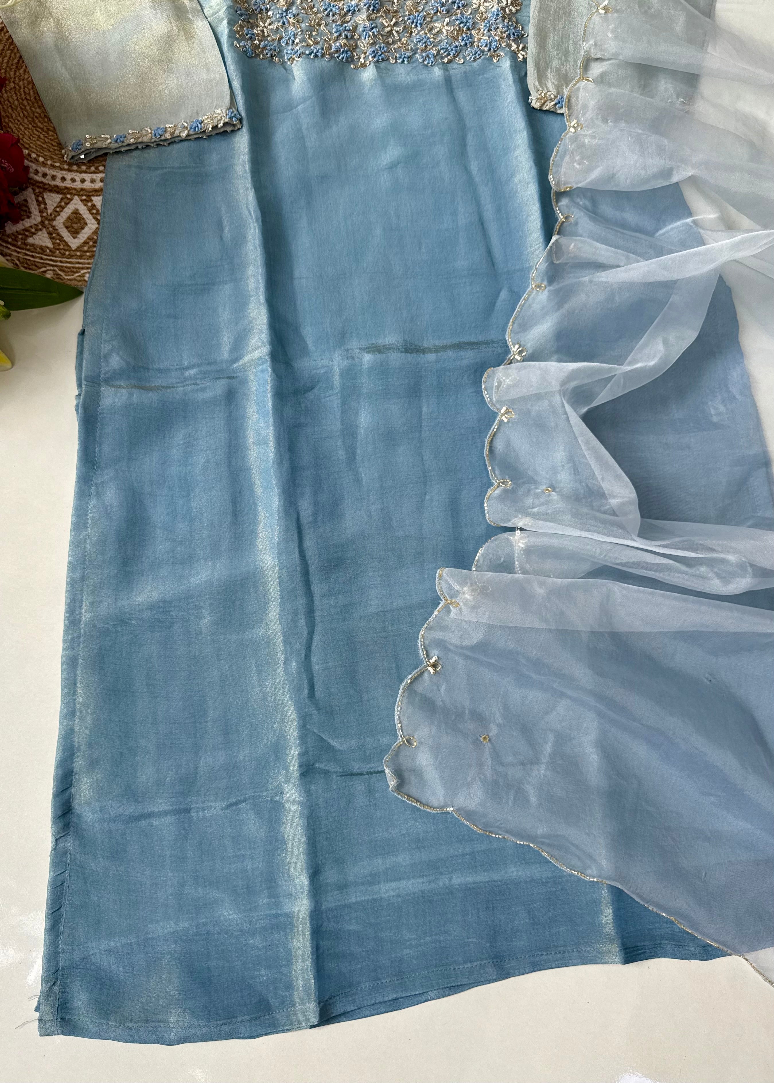 Handcrafted Tissue silk kurti with handwork on the yoke and sleeve of the kurta with a long scalping viscose dupatta with a tissue silk bottom .