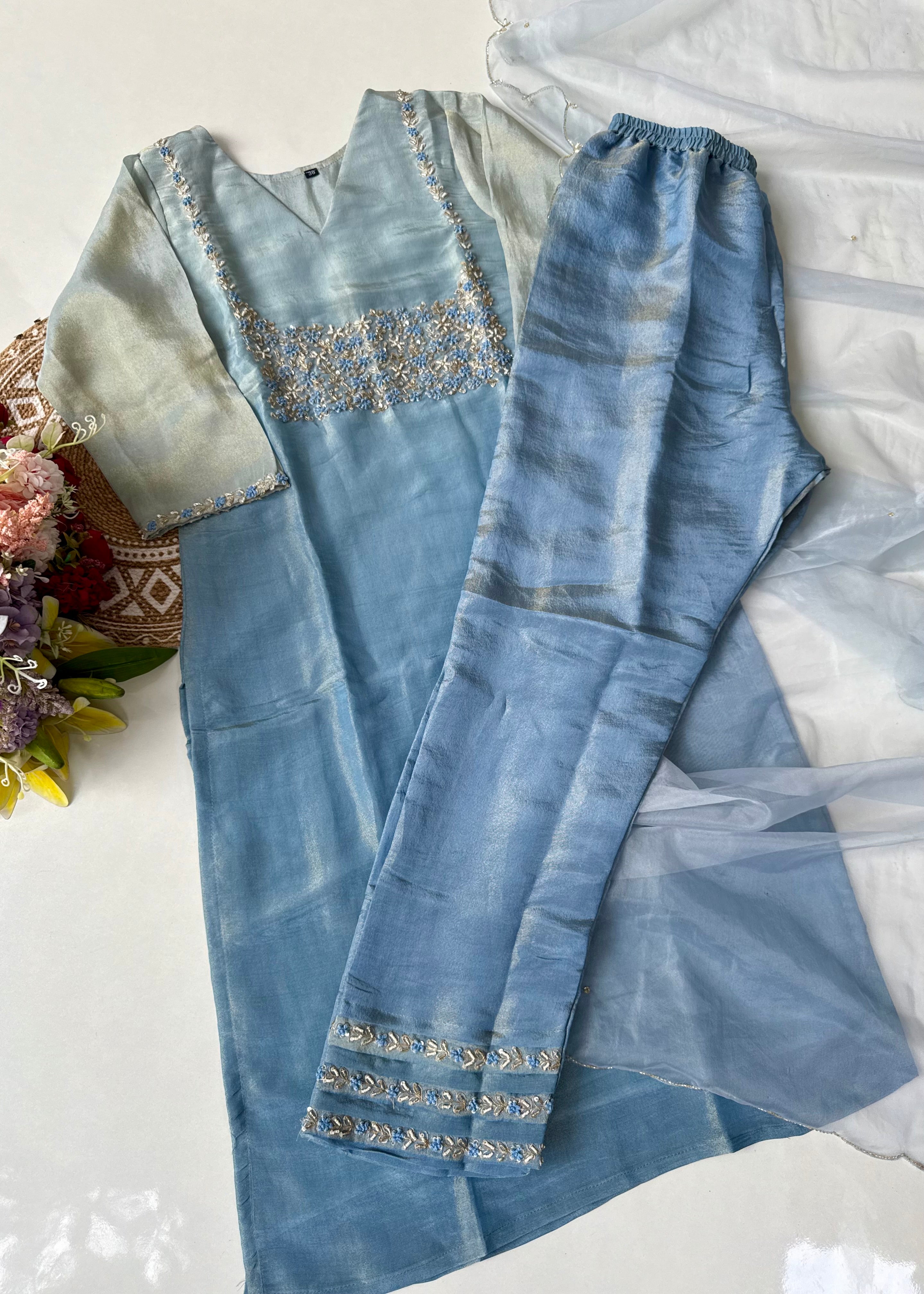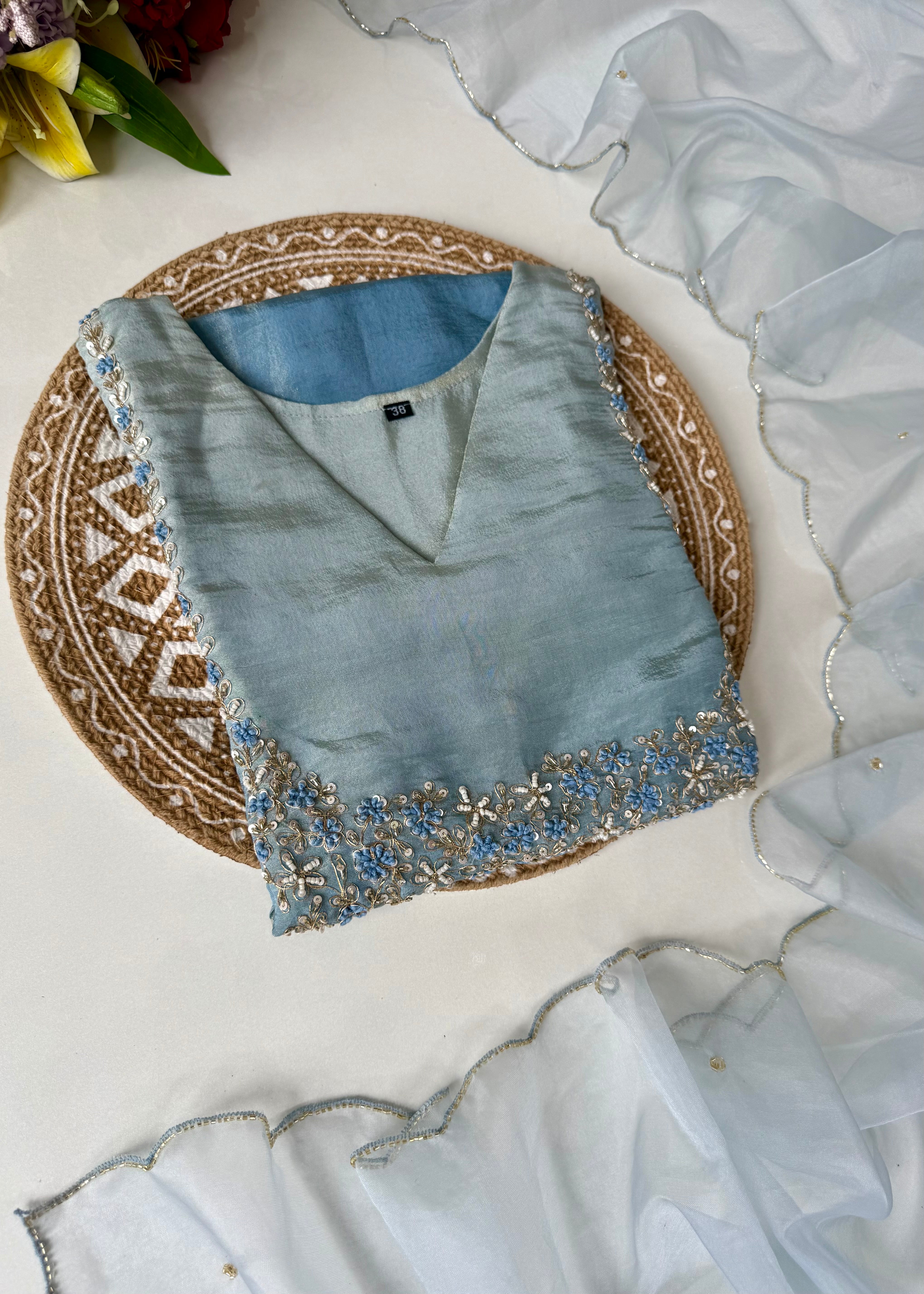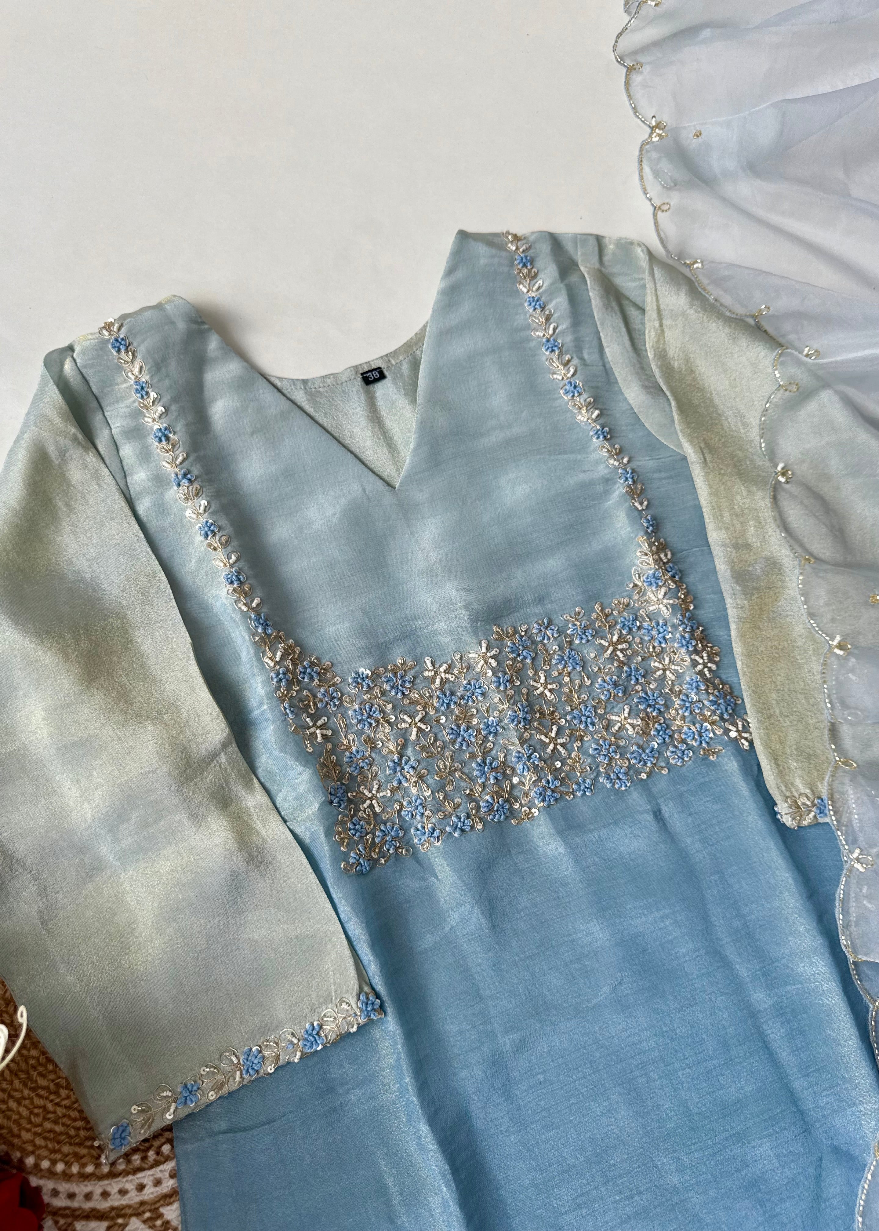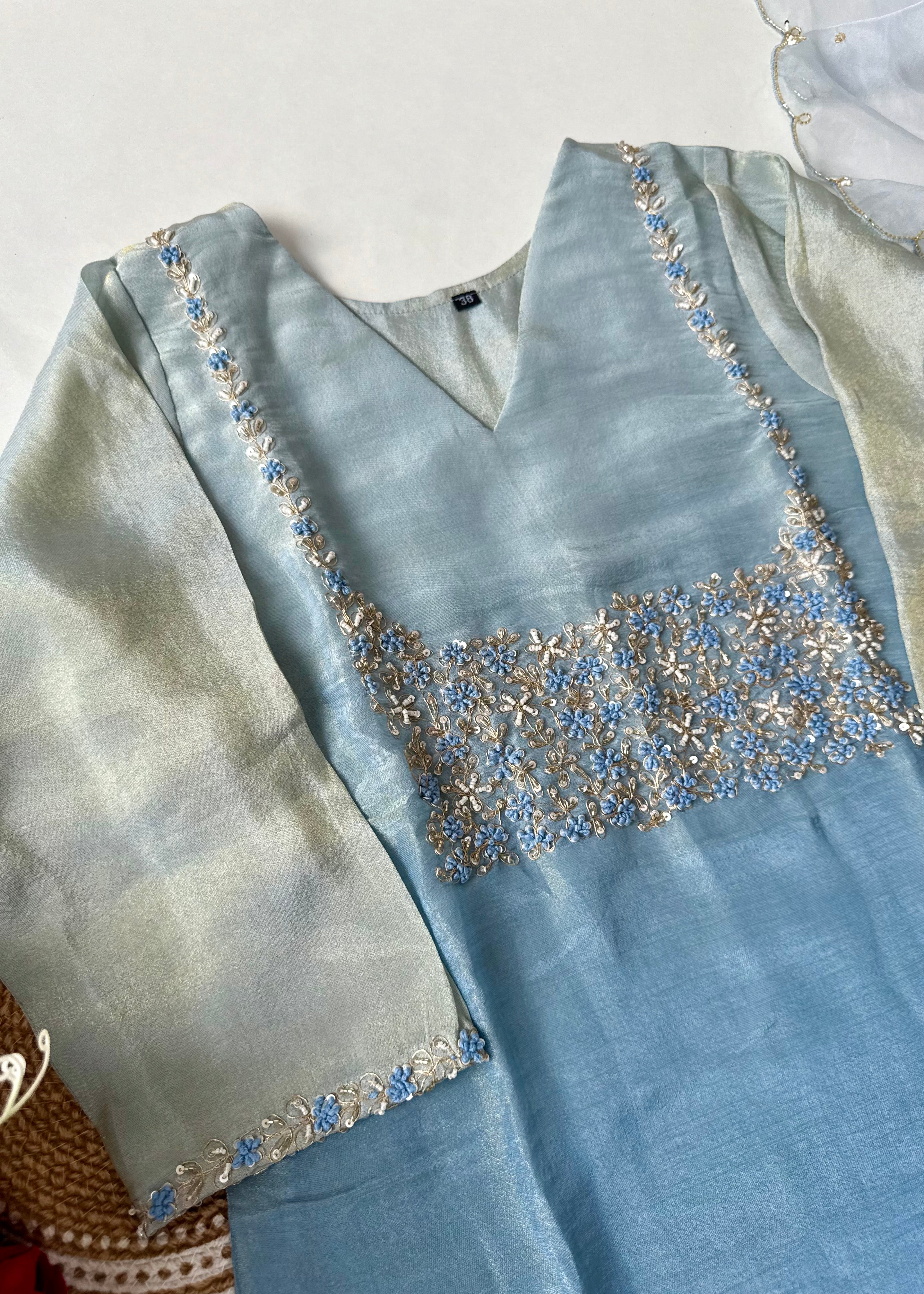 Handcrafted Tissue silk kurti with handwork on the yoke and sleeve of the kurta with a long scalping viscose dupatta with a tissue silk bottom .