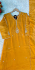 Elegant Mul Chanderi A-Line kurta set paired with handwork on the yoke and sleeves with matching bottom and lightweight dupatta. Perfect blend of comfort and festive elegance for everyday to special occasions.