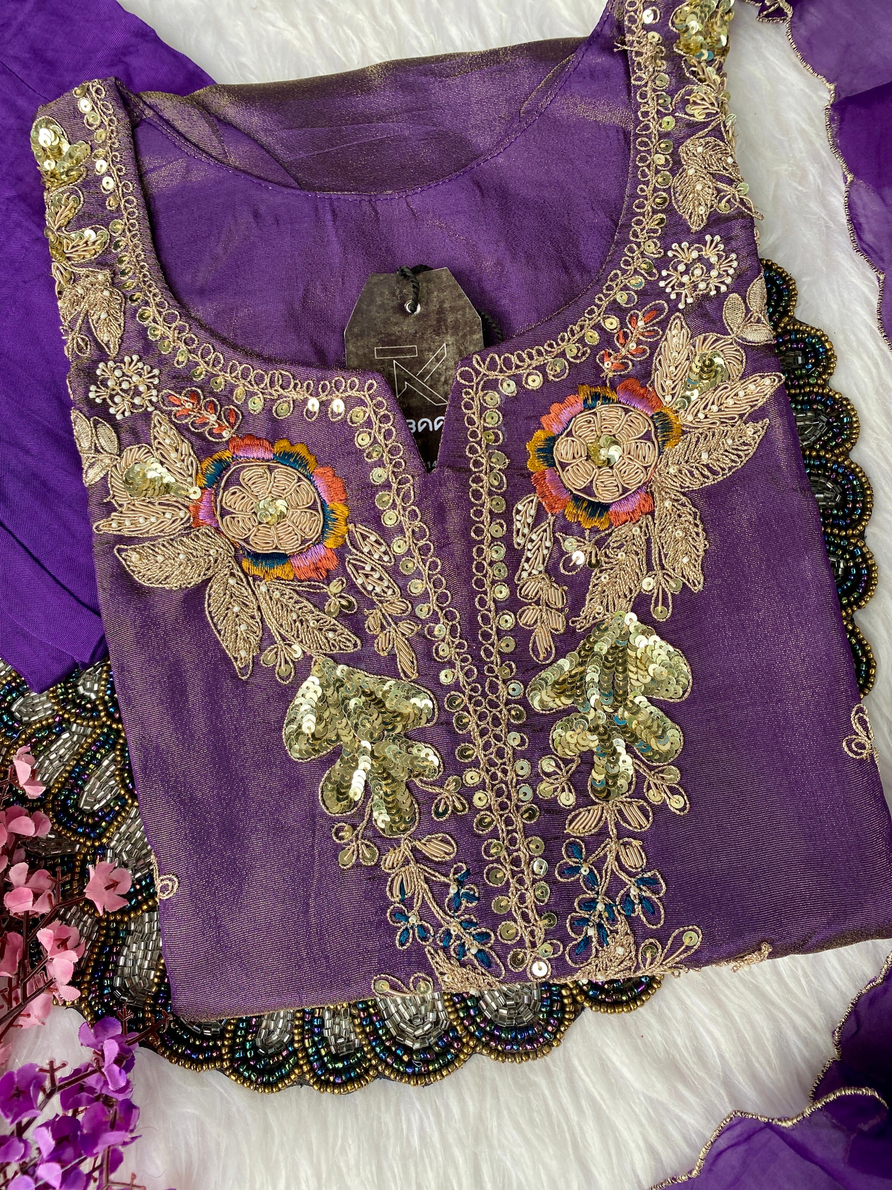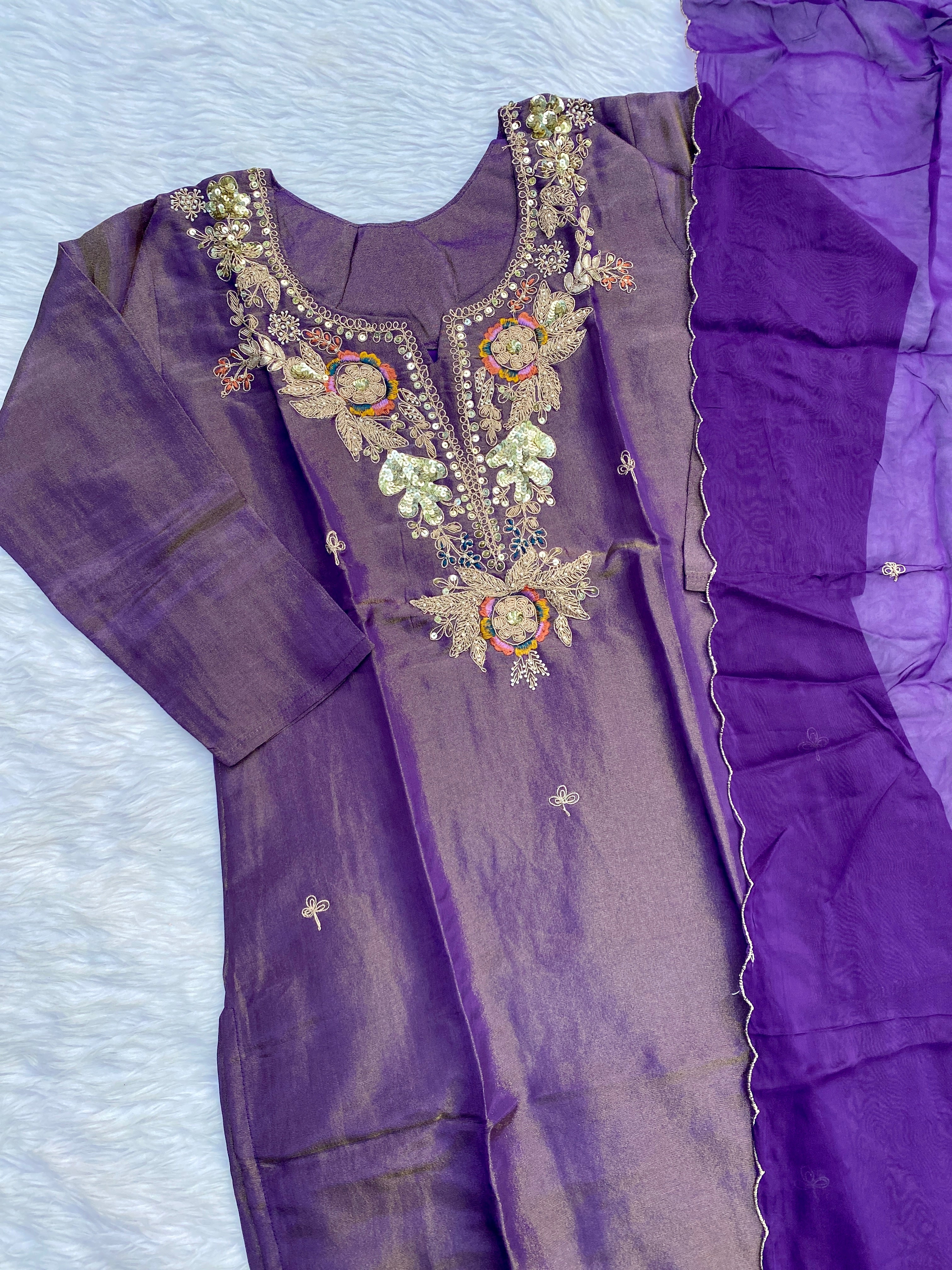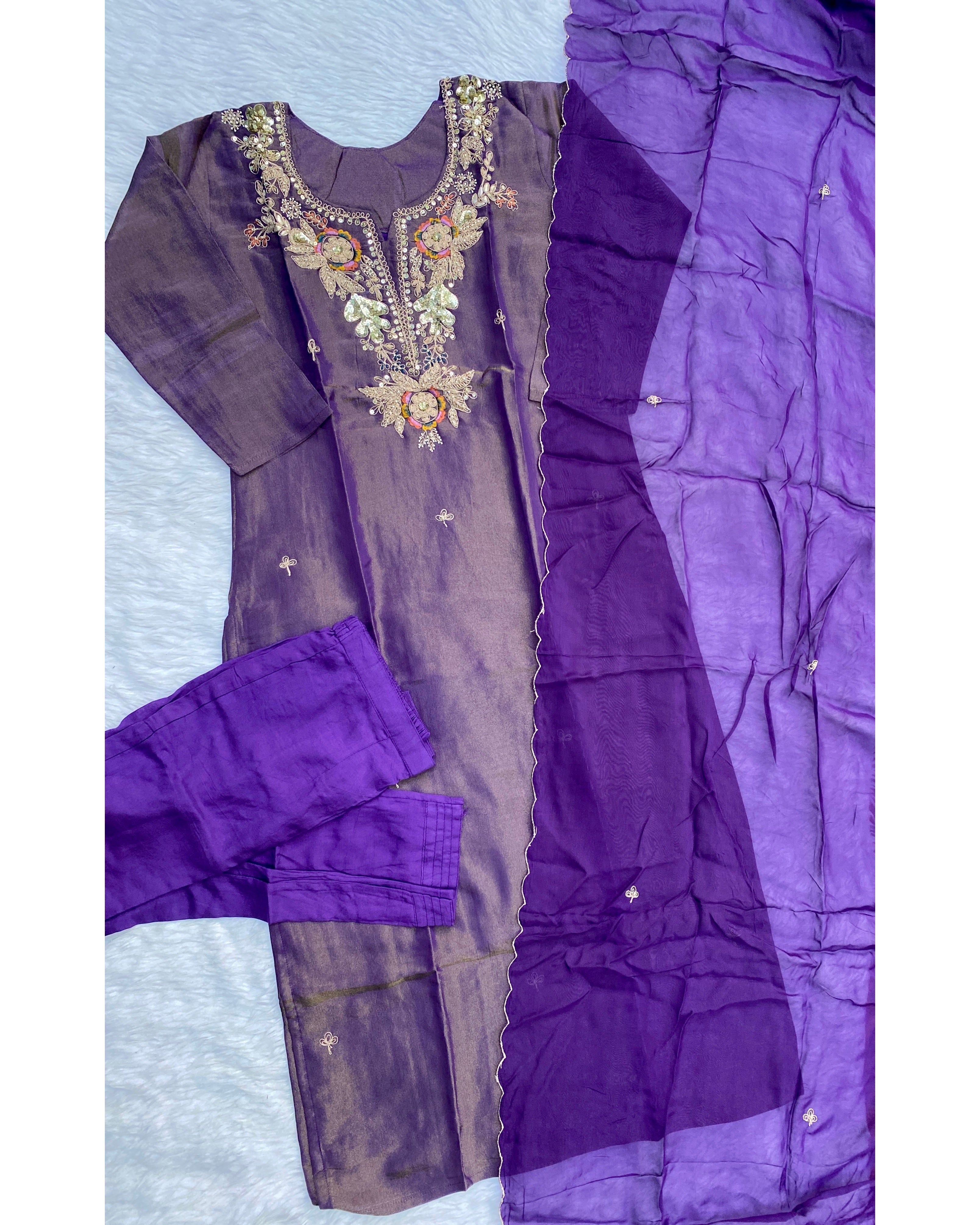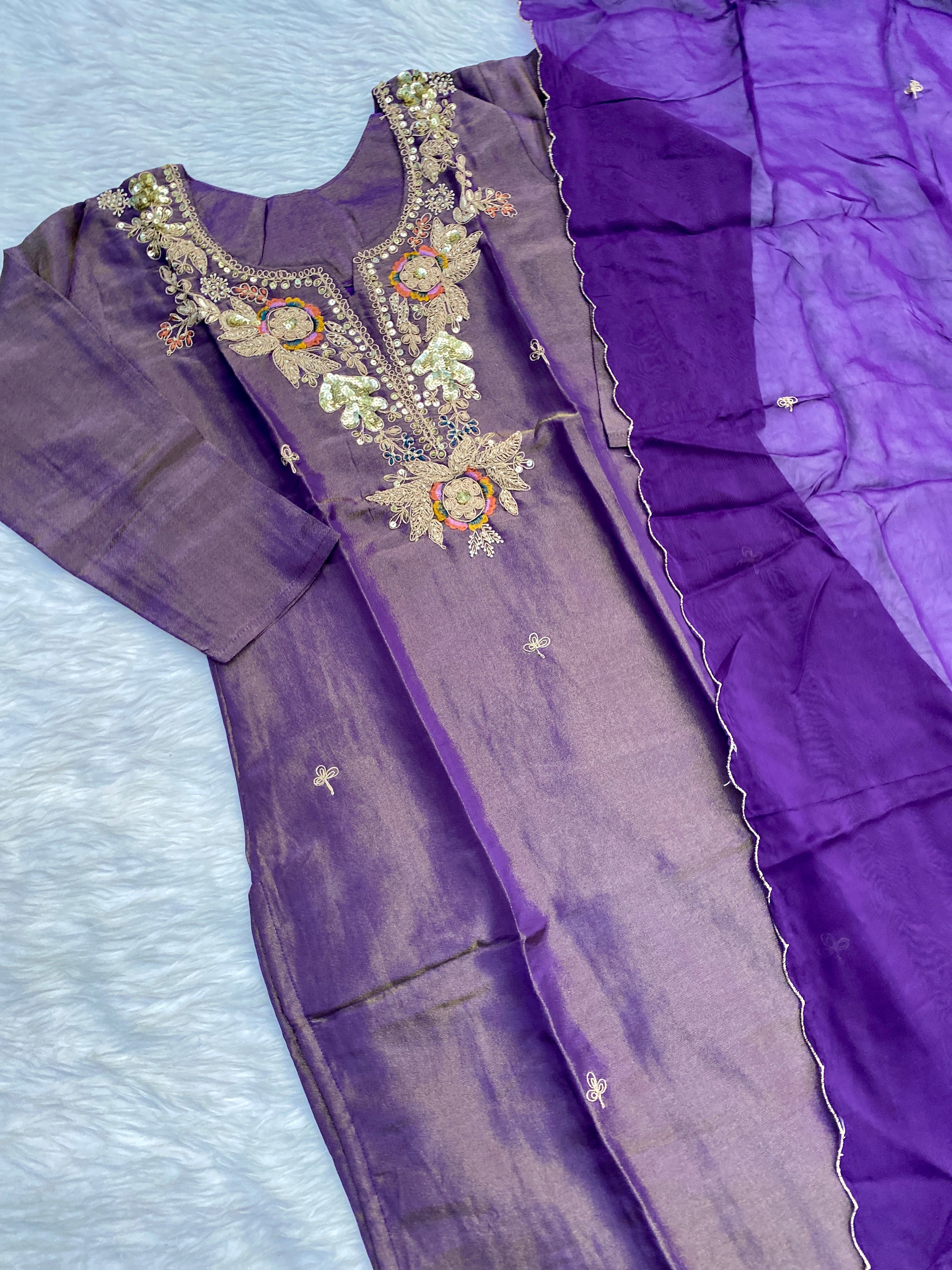 Party wear Tissue silk set with handwork of the yoke of the kurta with chinnon  dupatta with a plane silk bottom