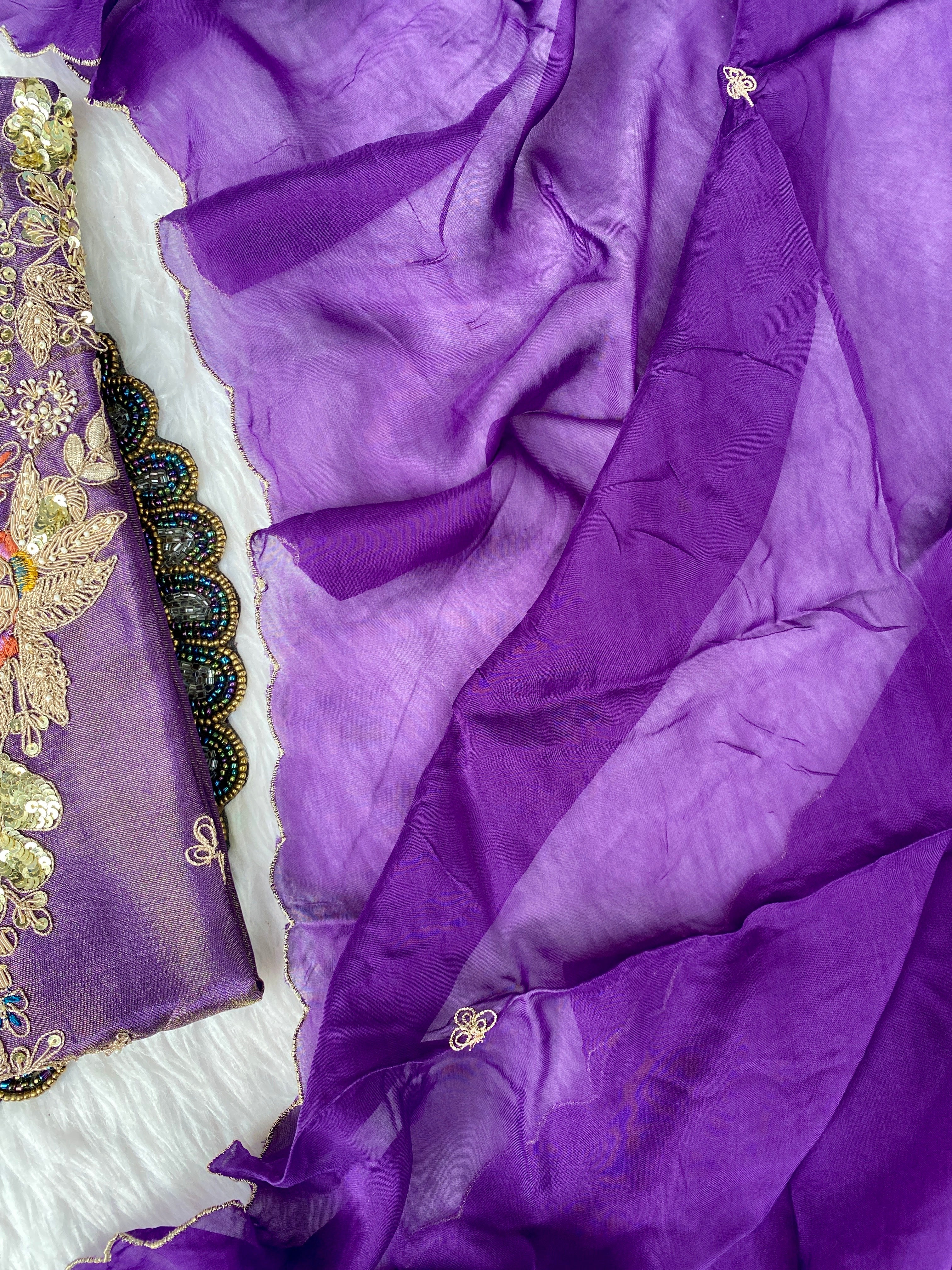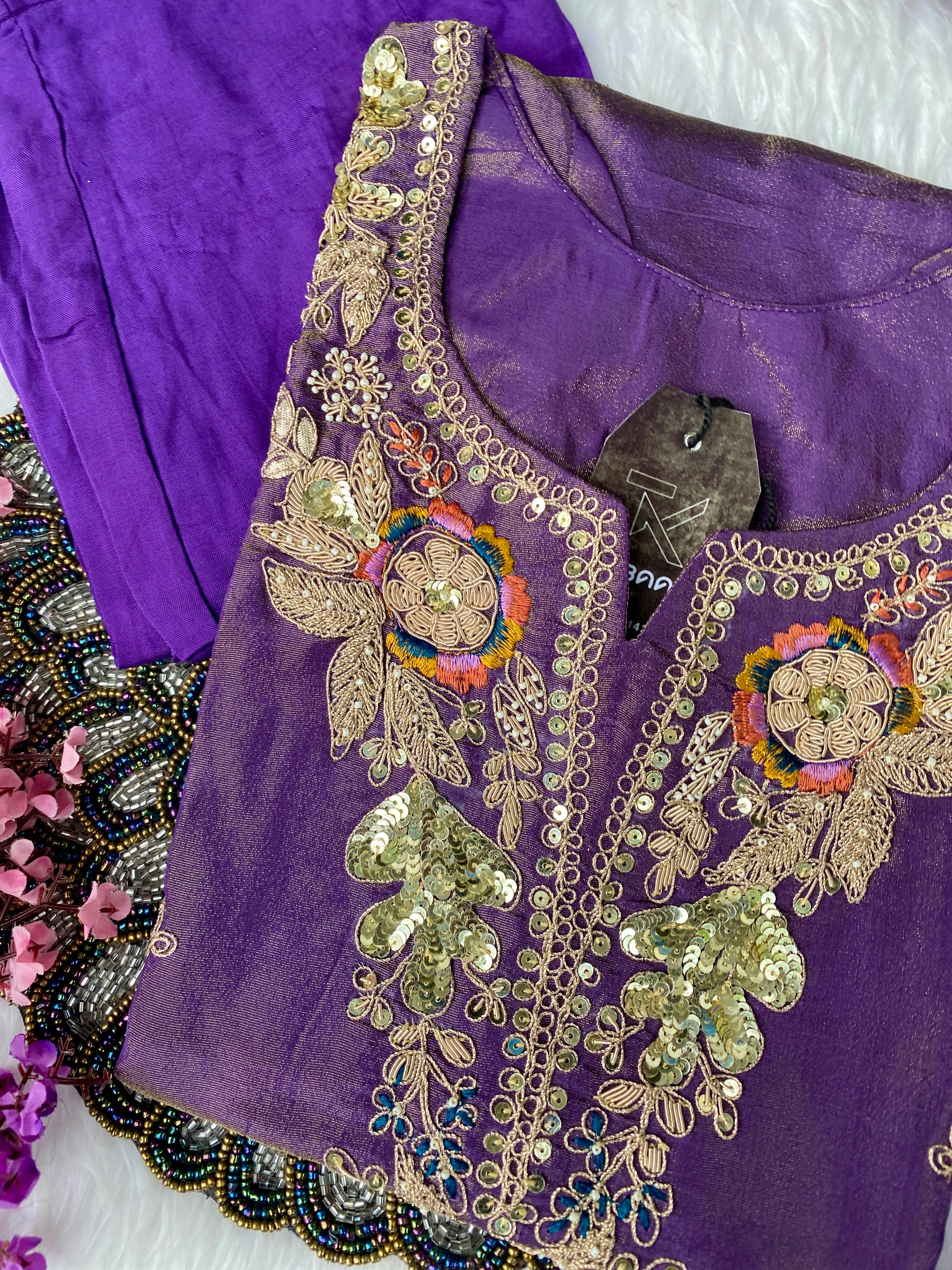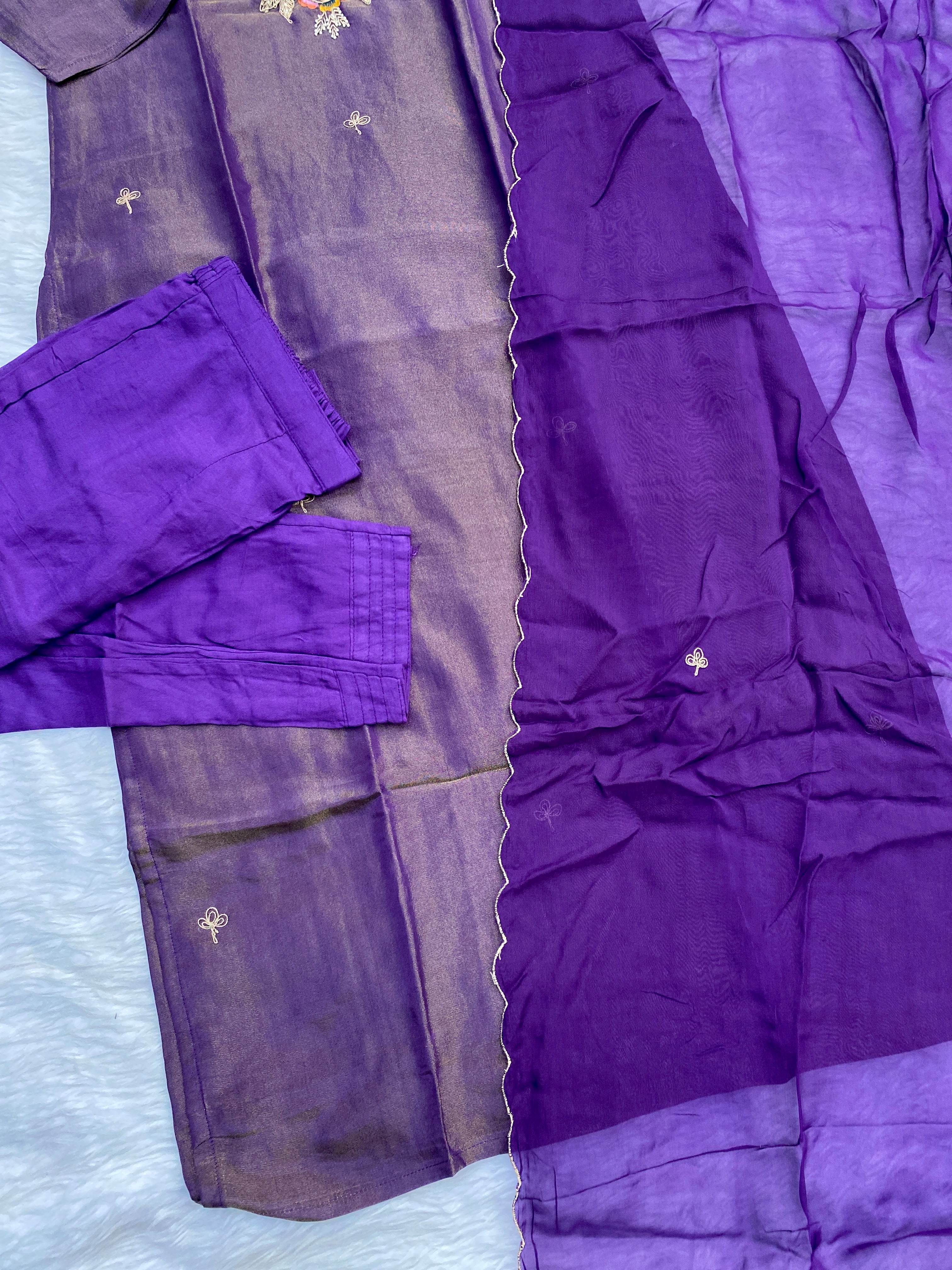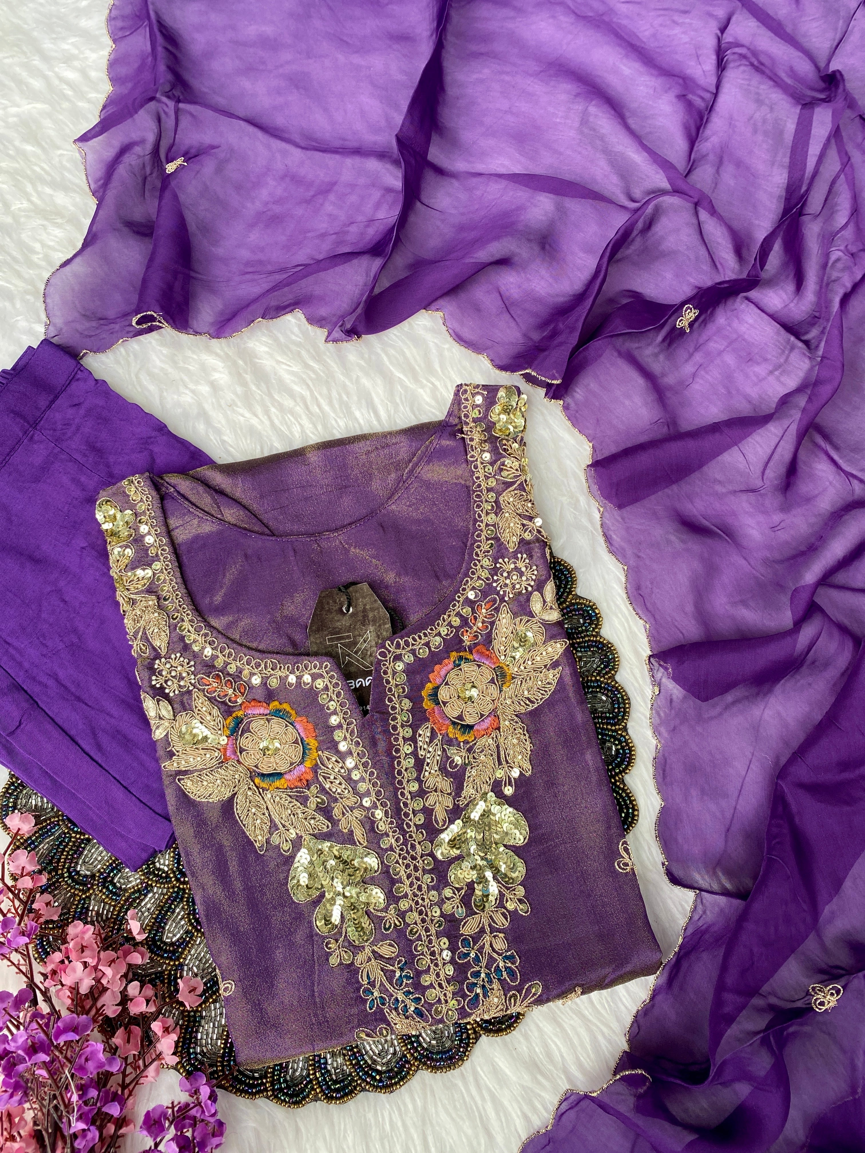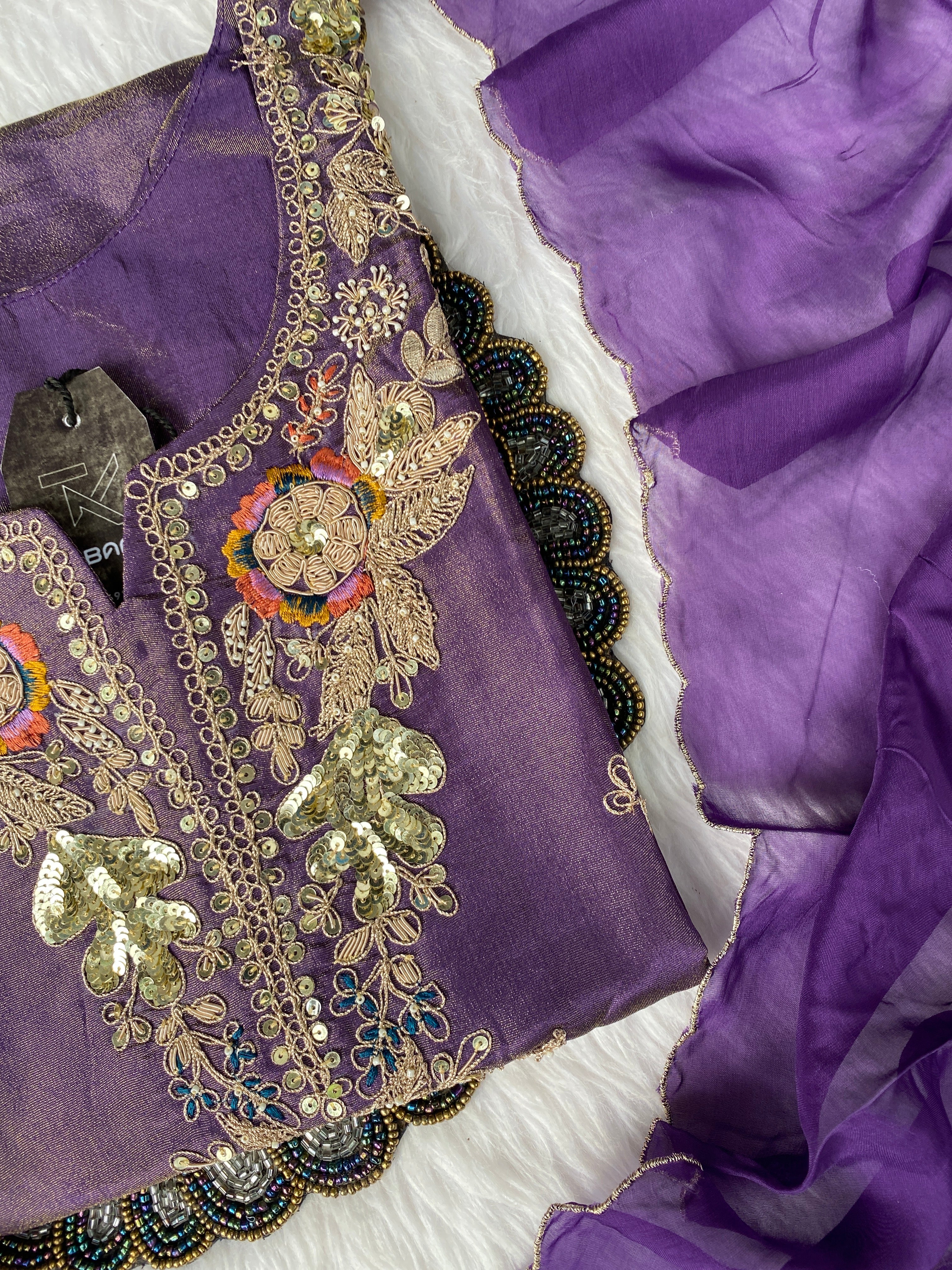 Party wear Tissue silk set with handwork of the yoke of the kurta with chinnon  dupatta with a plane silk bottom