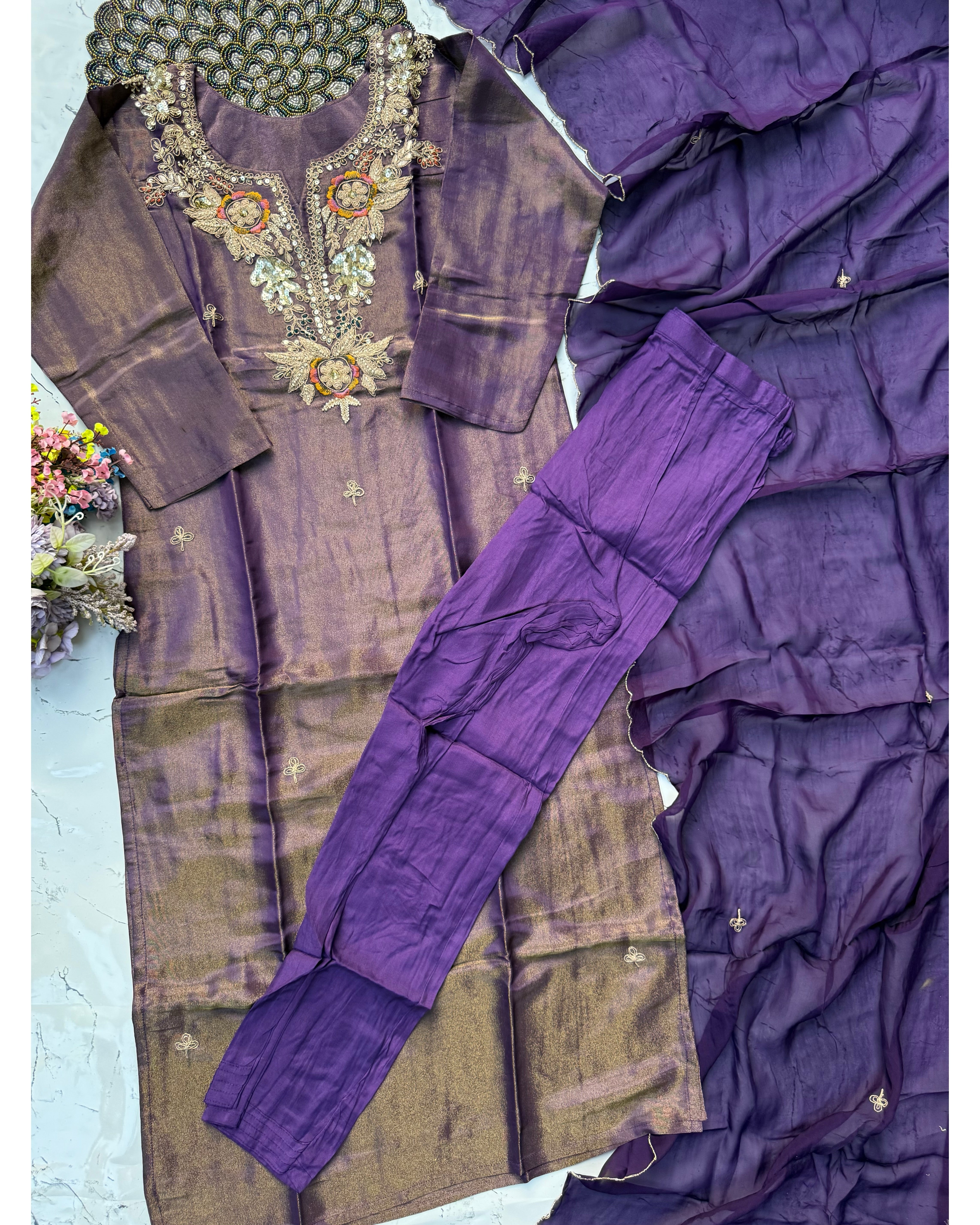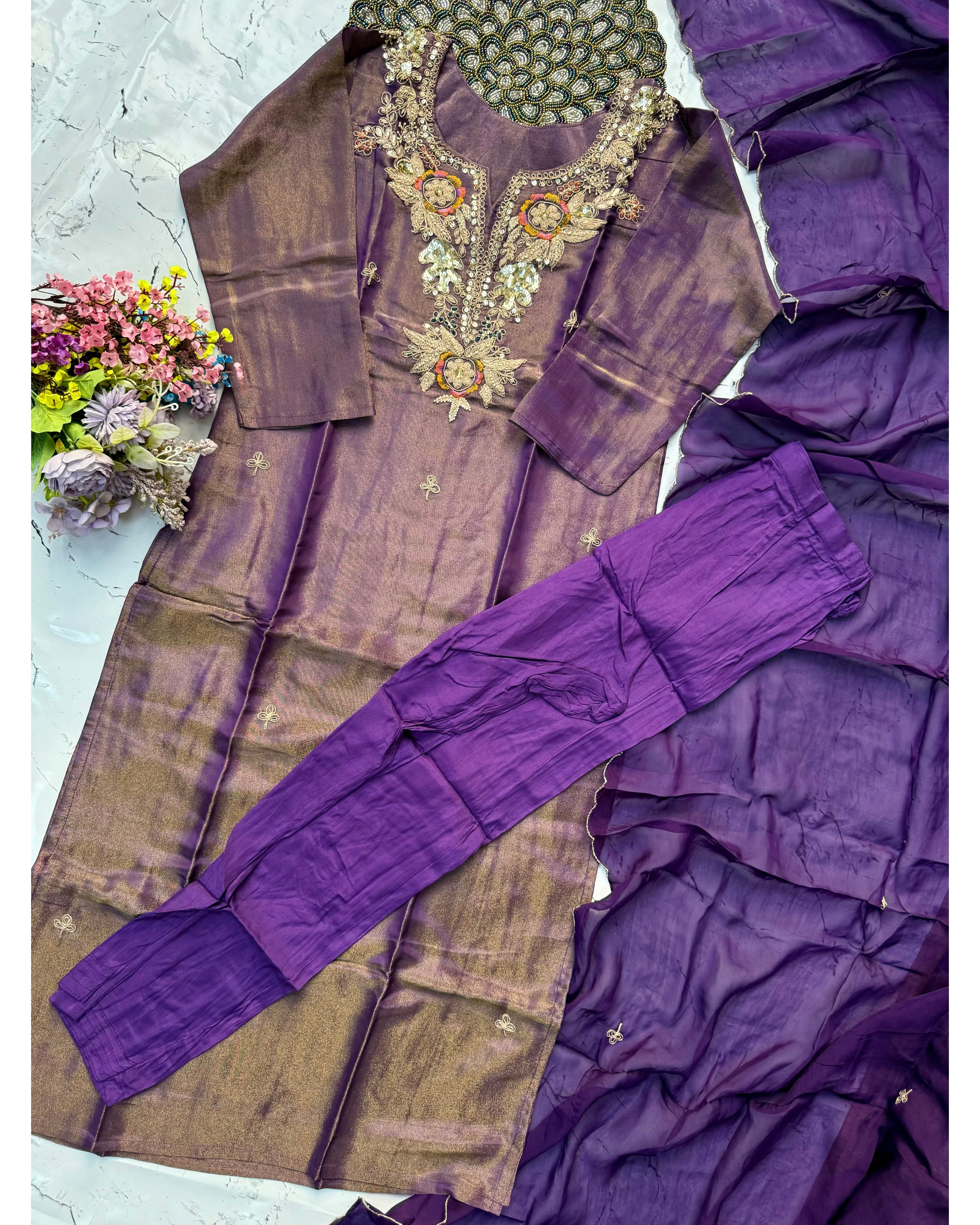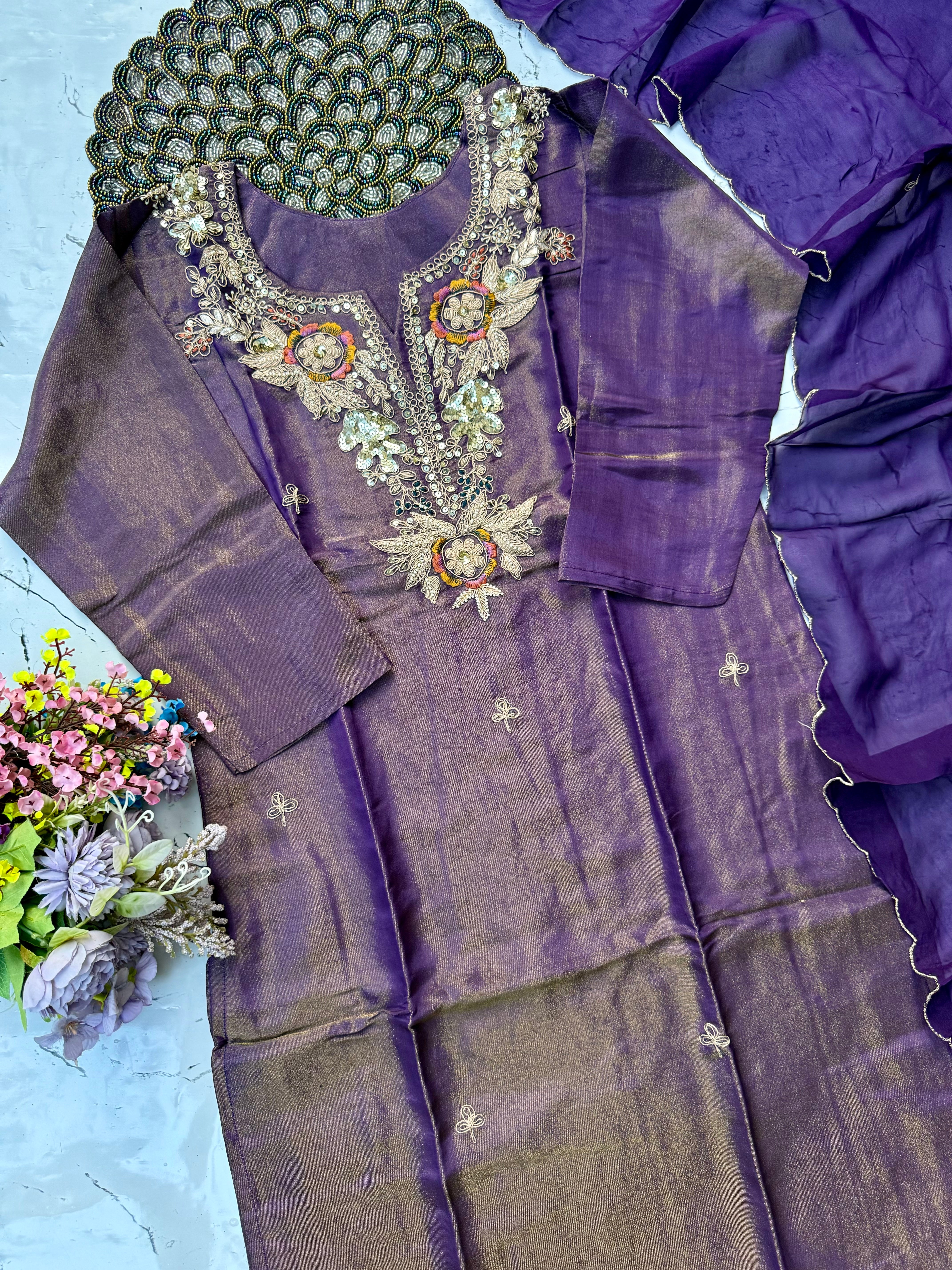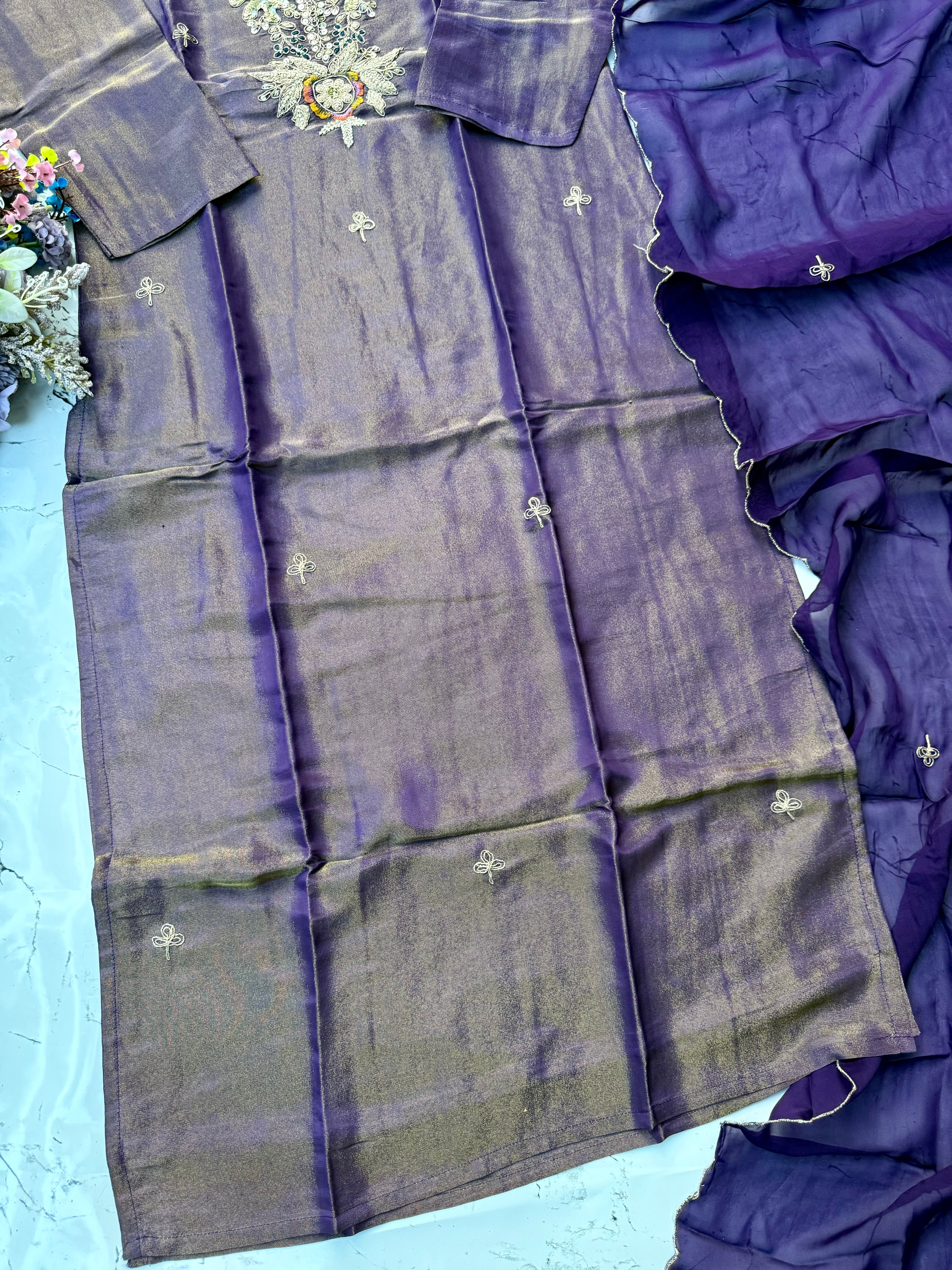 Party wear Tissue silk set with handwork of the yoke of the kurta with chinnon  dupatta with a plane silk bottom