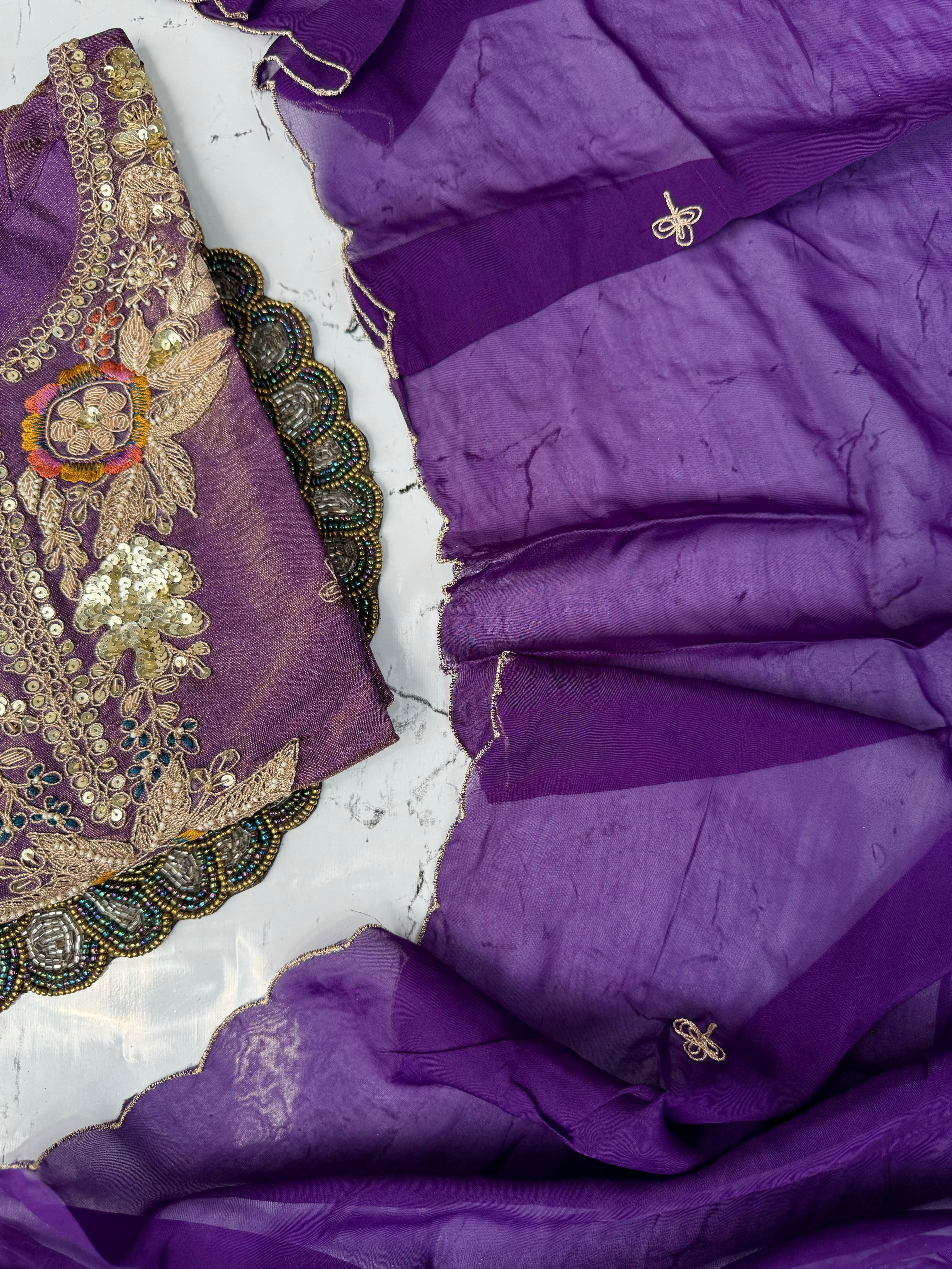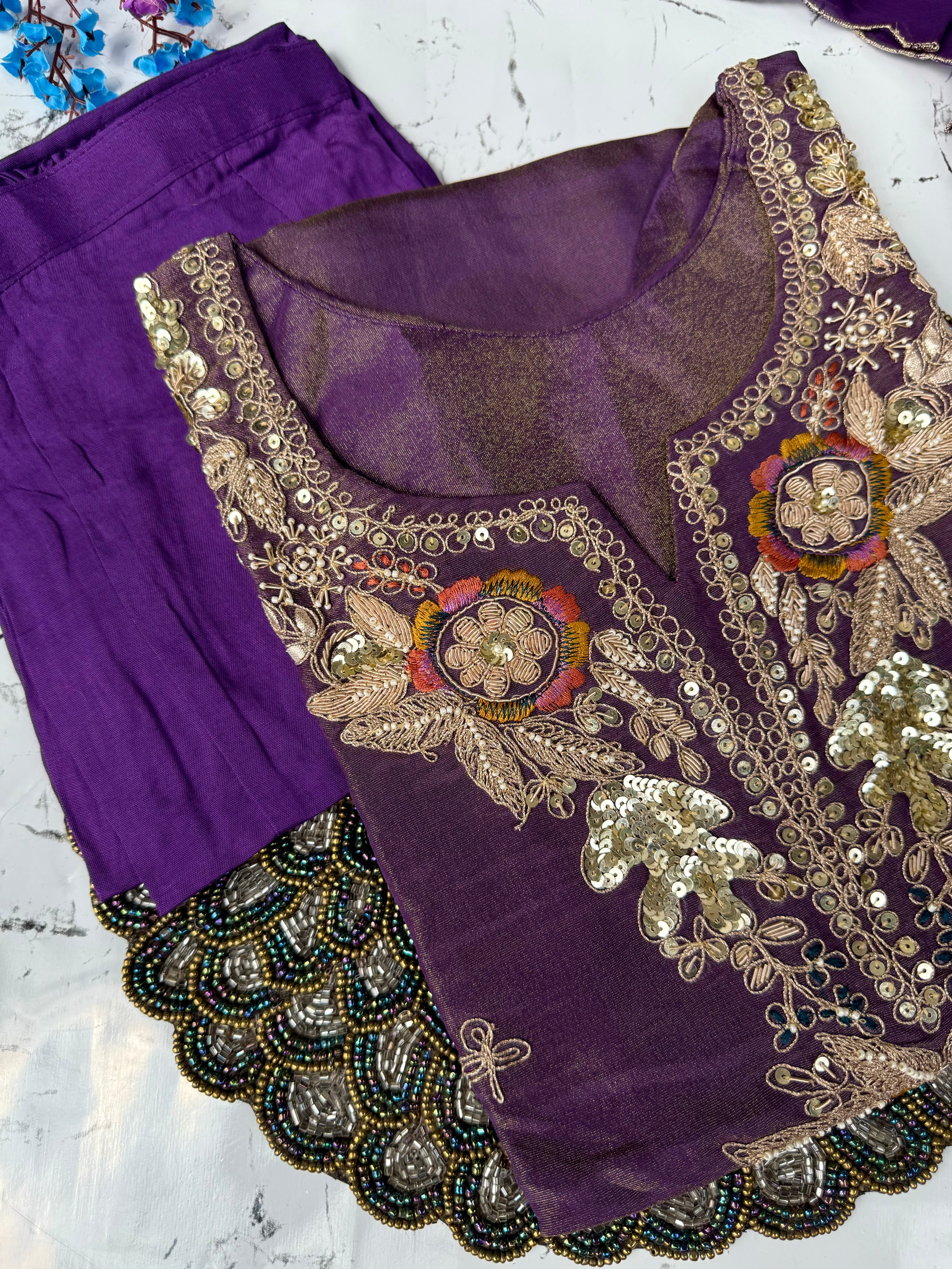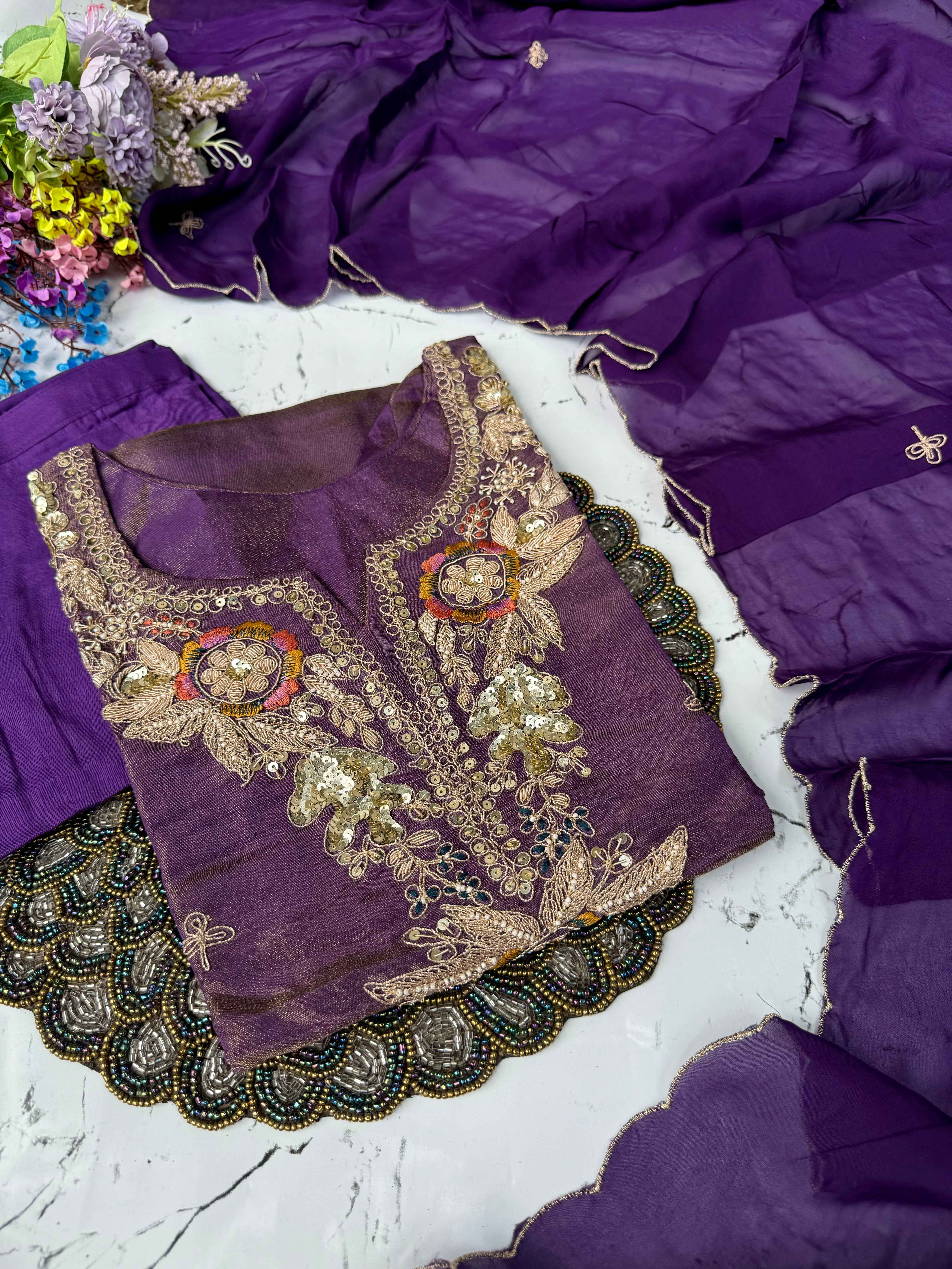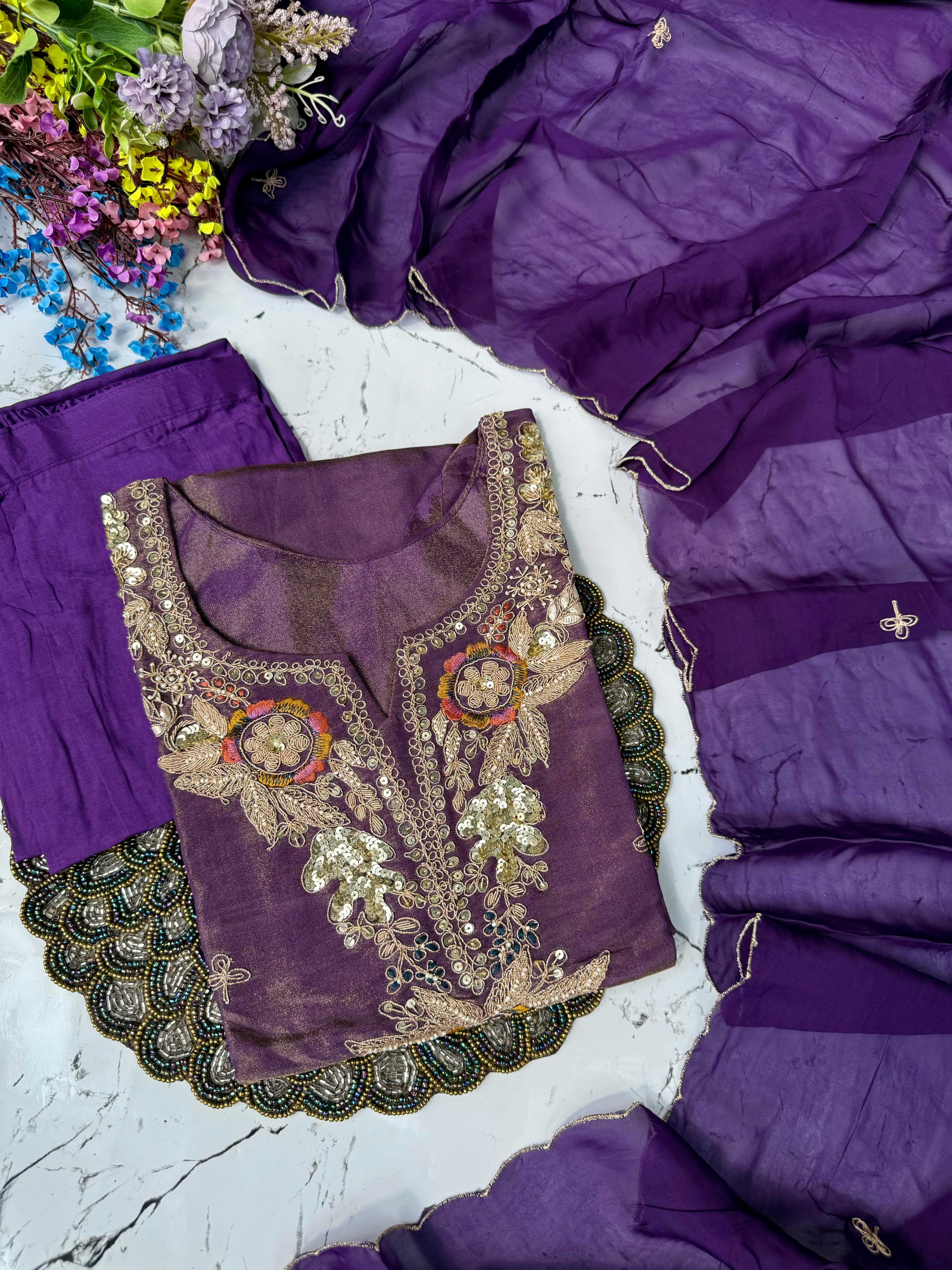 Party wear Tissue silk set with handwork of the yoke of the kurta with chinnon  dupatta with a plane silk bottom