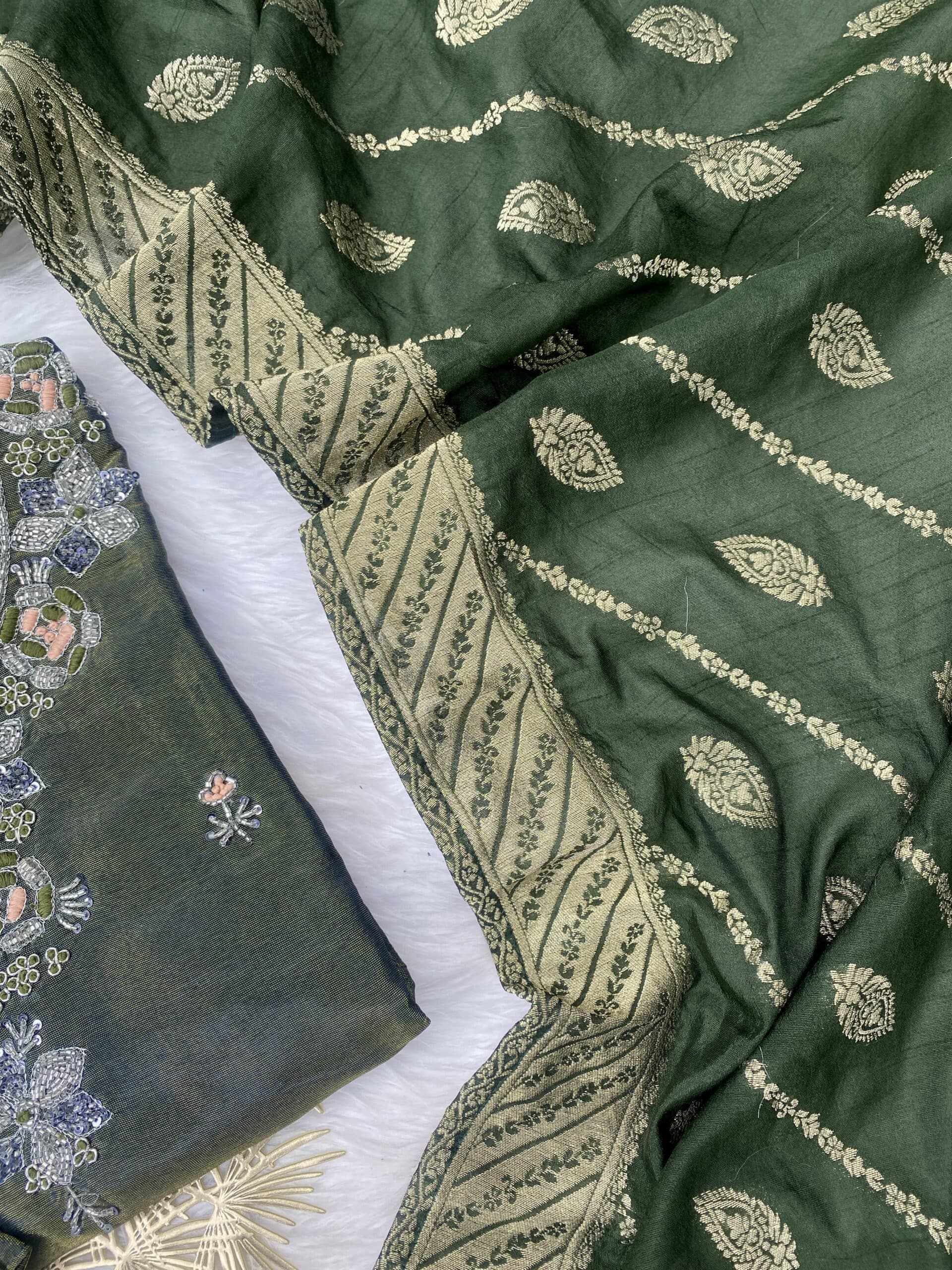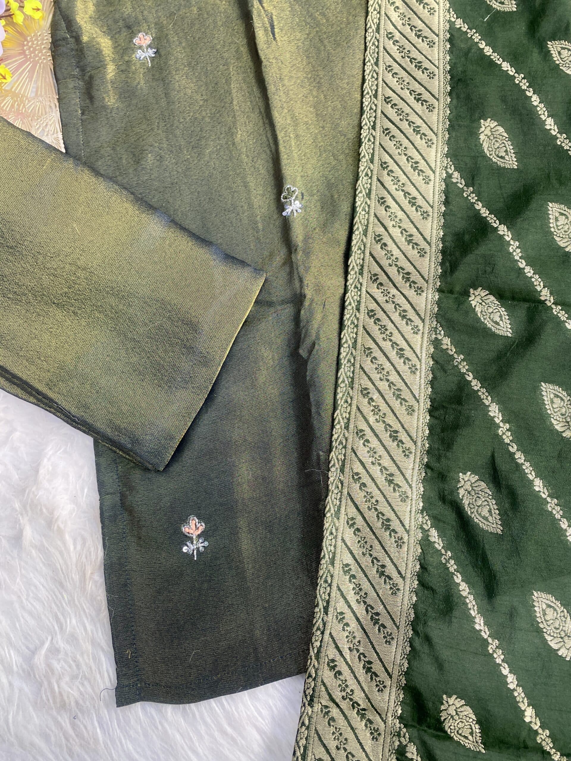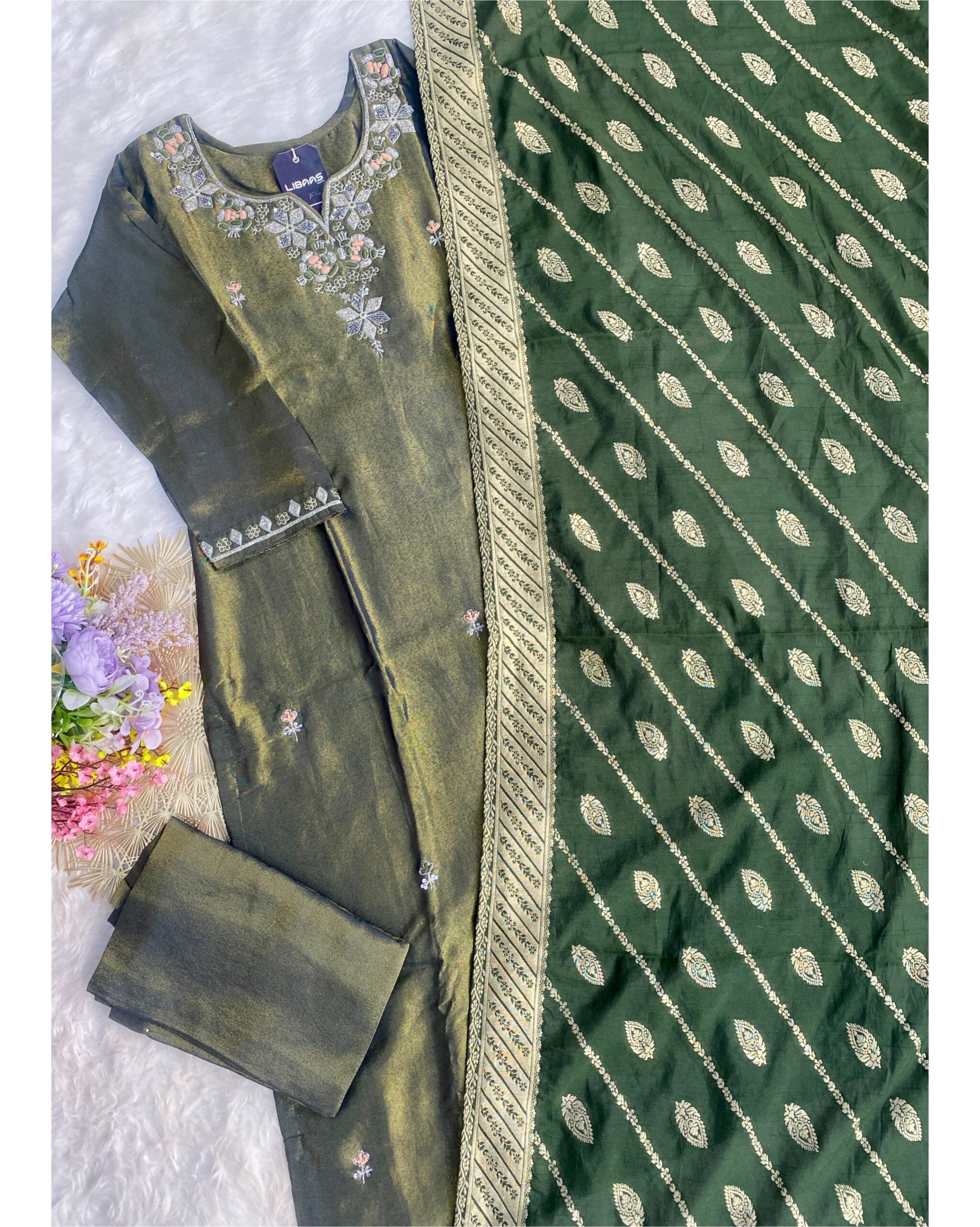Tissue silk set with handwork on the yoke with a contract combination banarsi dupatta & a tissue silk bottom