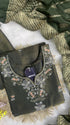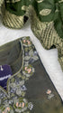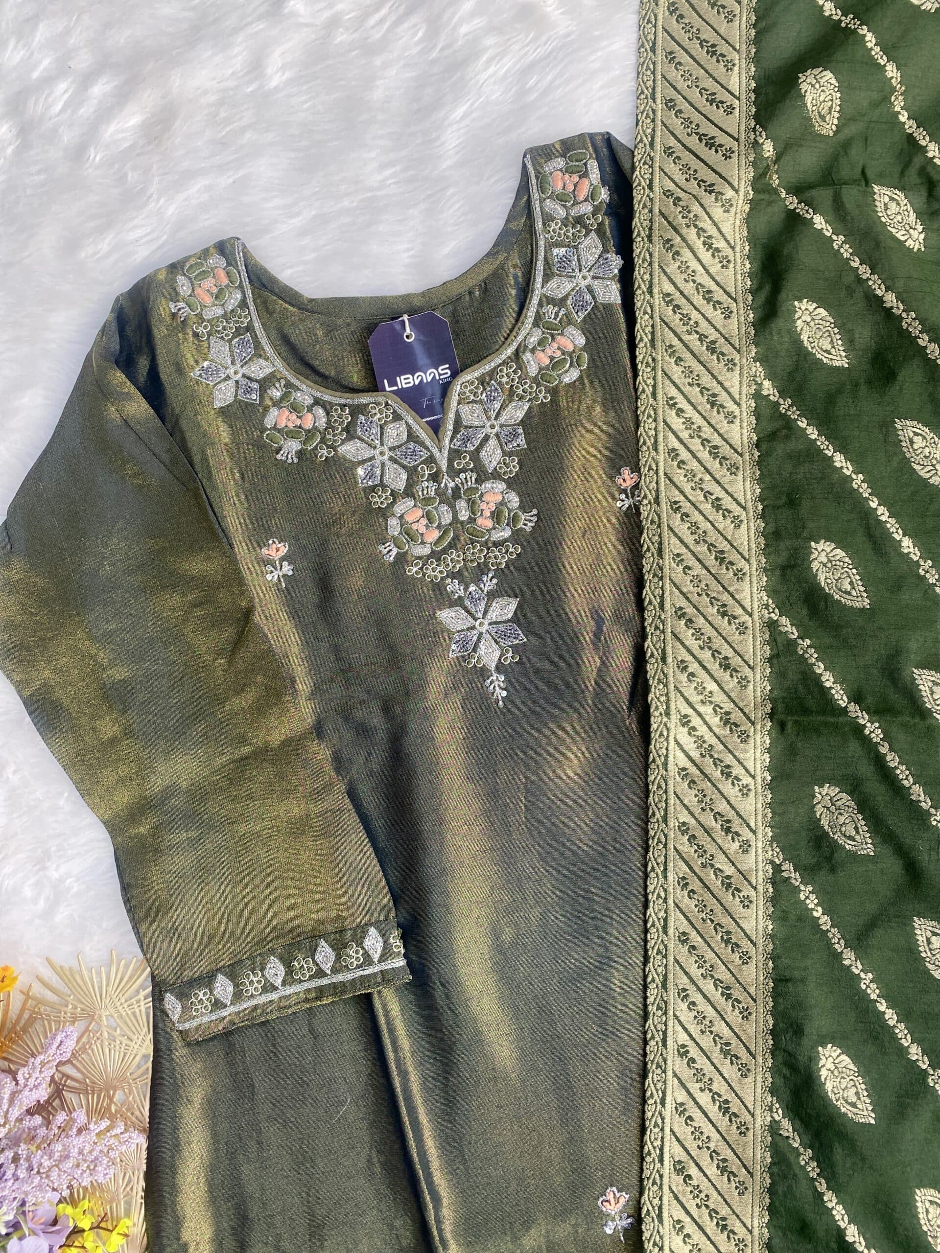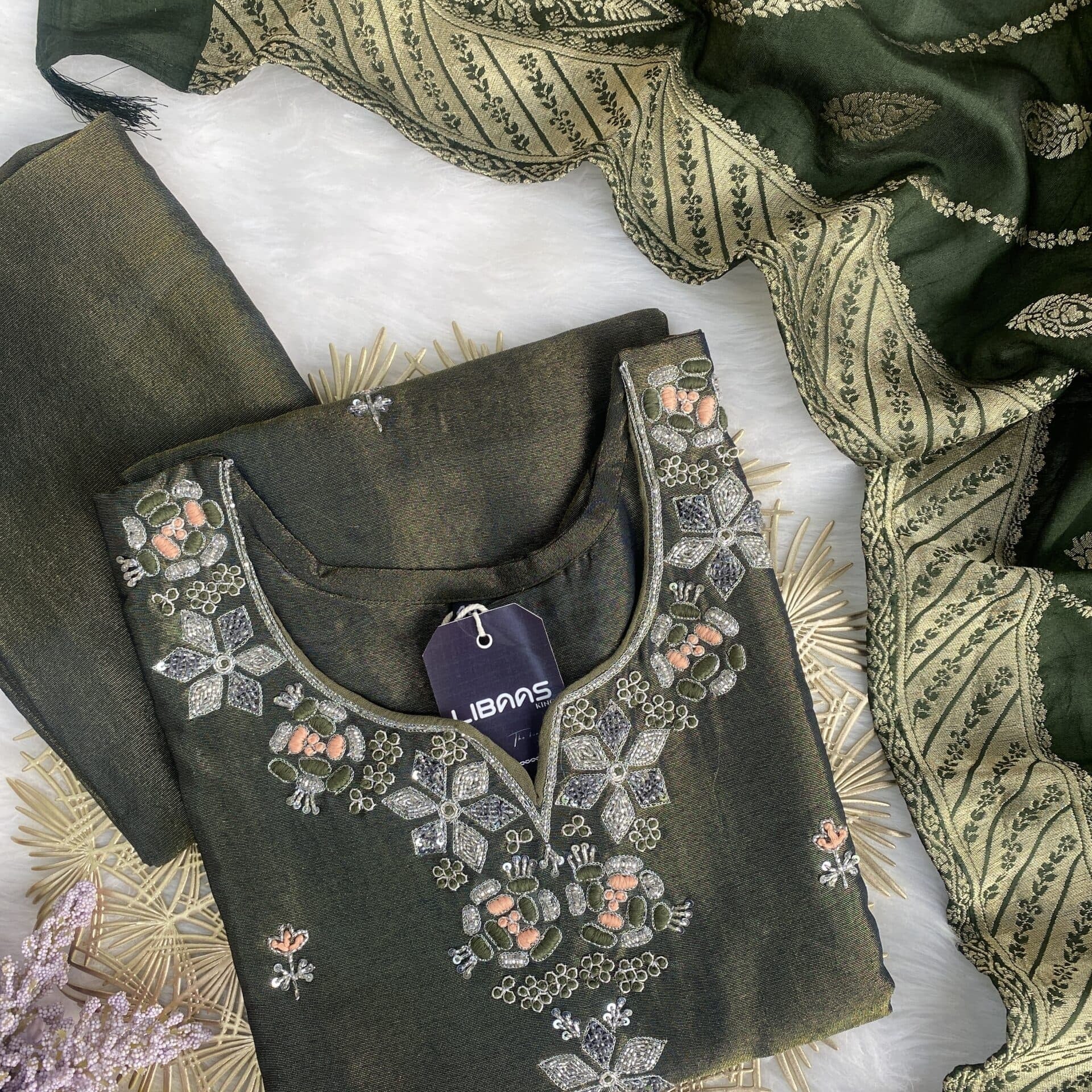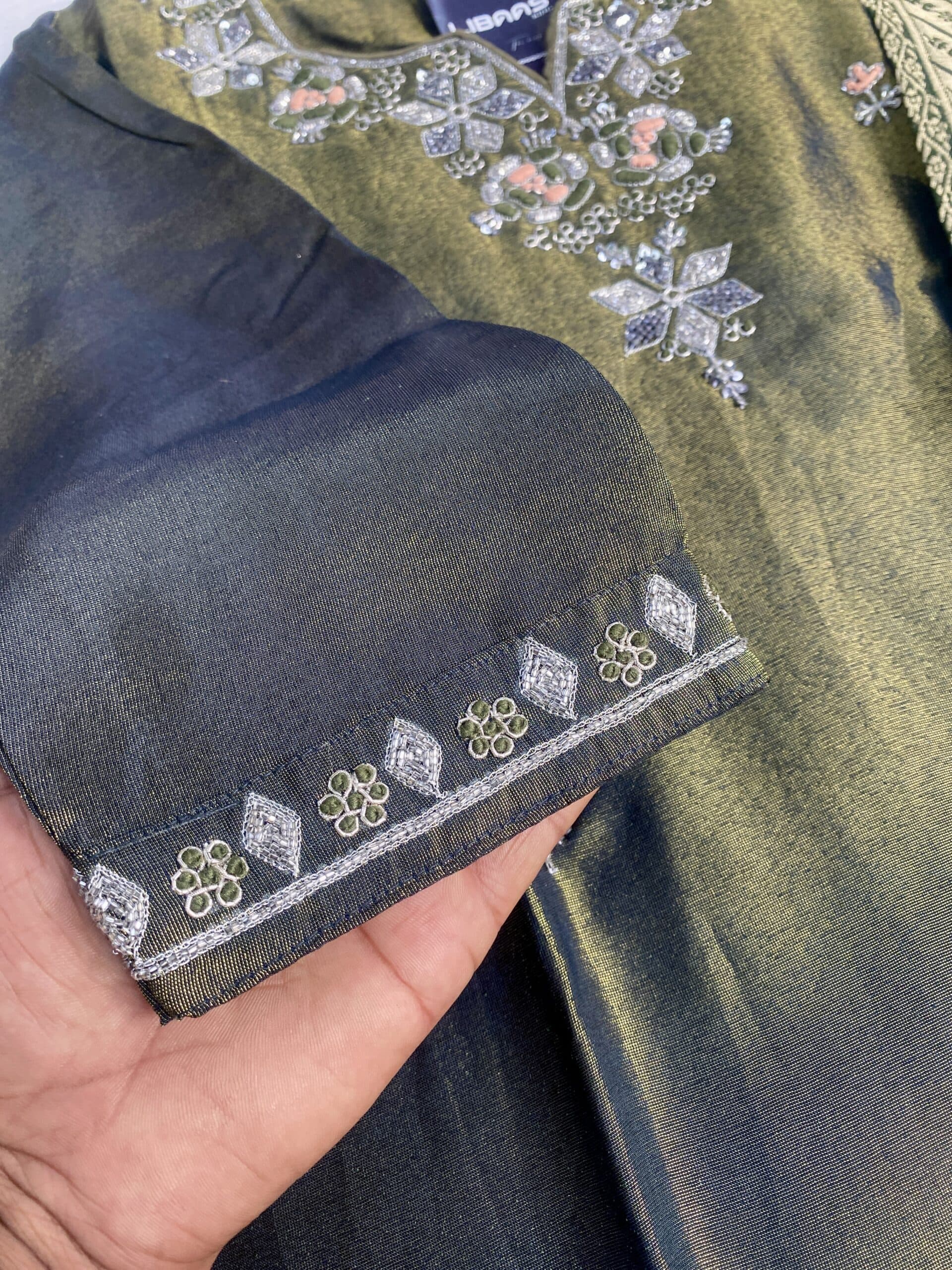 Tissue silk set with handwork on the yoke with a contract combination banarsi dupatta & a tissue silk bottom