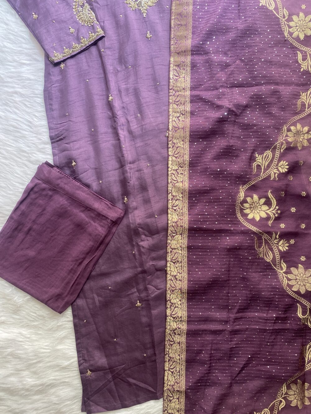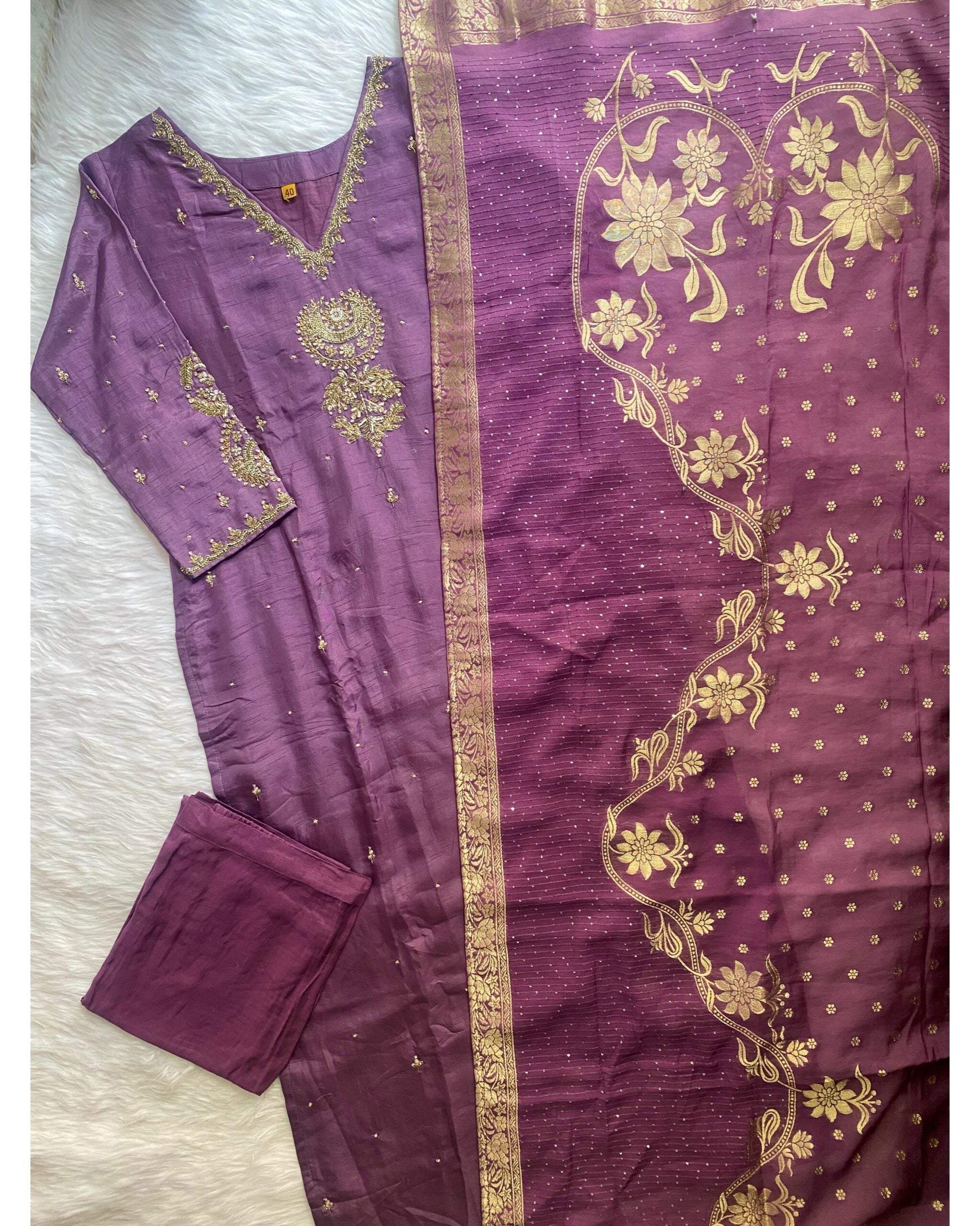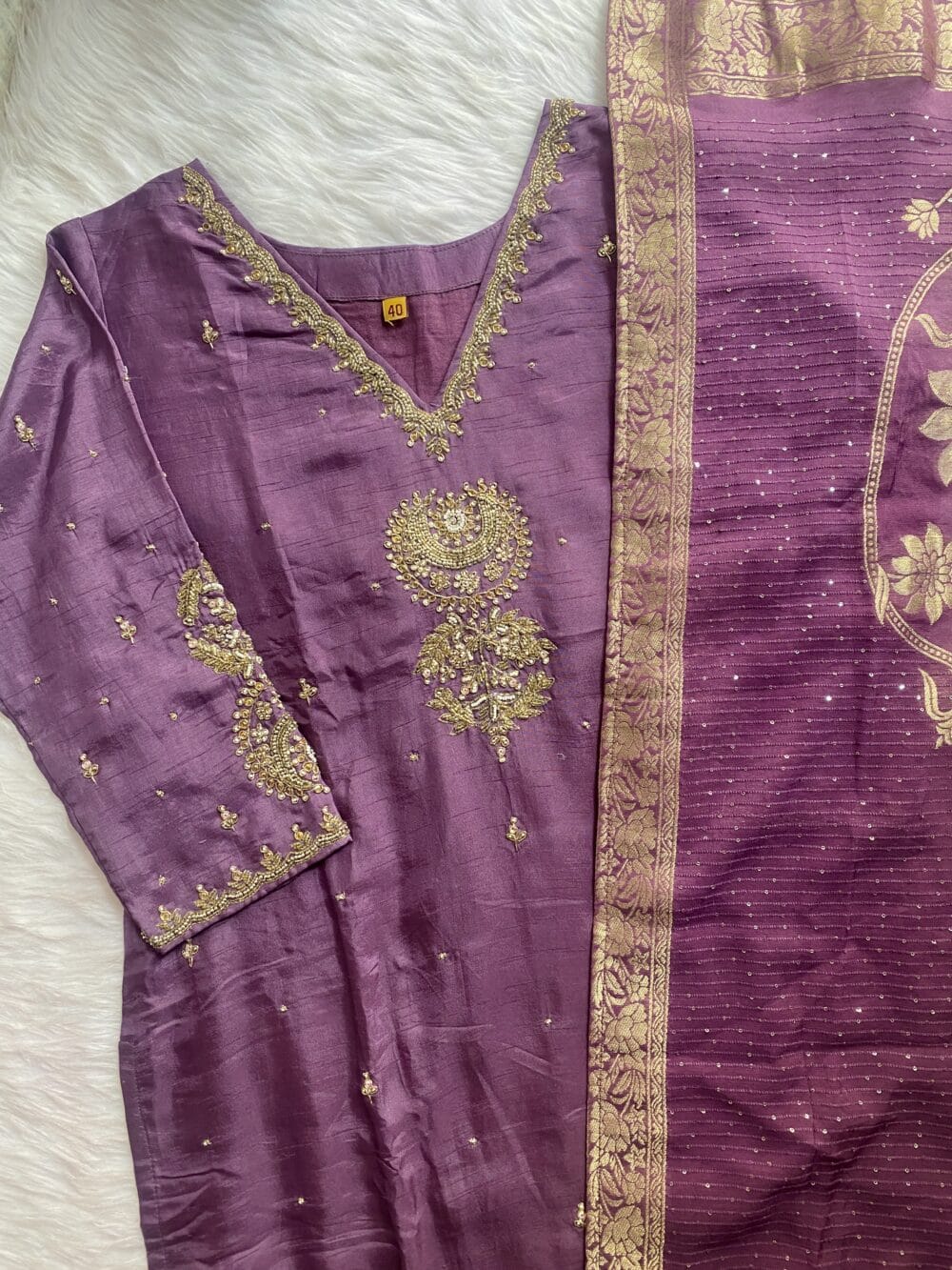 Premium range dola silk set with Handwork on the yoke & sleeve with a beautiful woven banarsi dupatta and a plane dola silk bottom