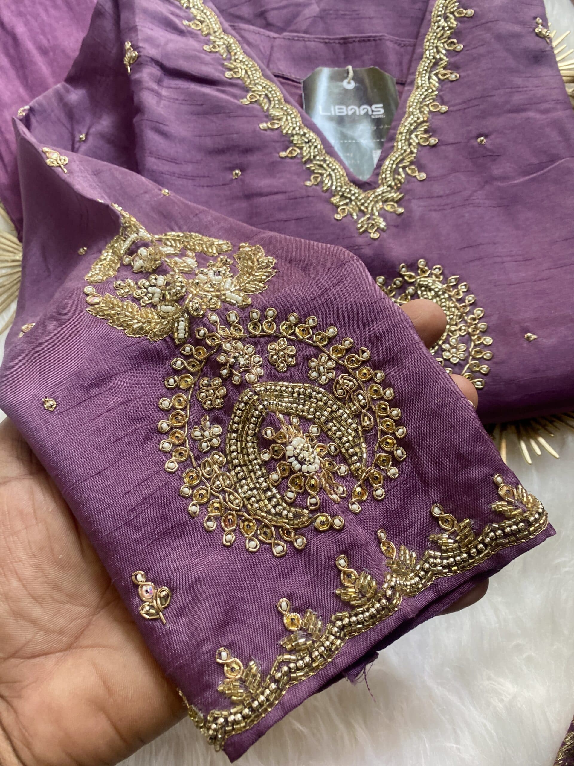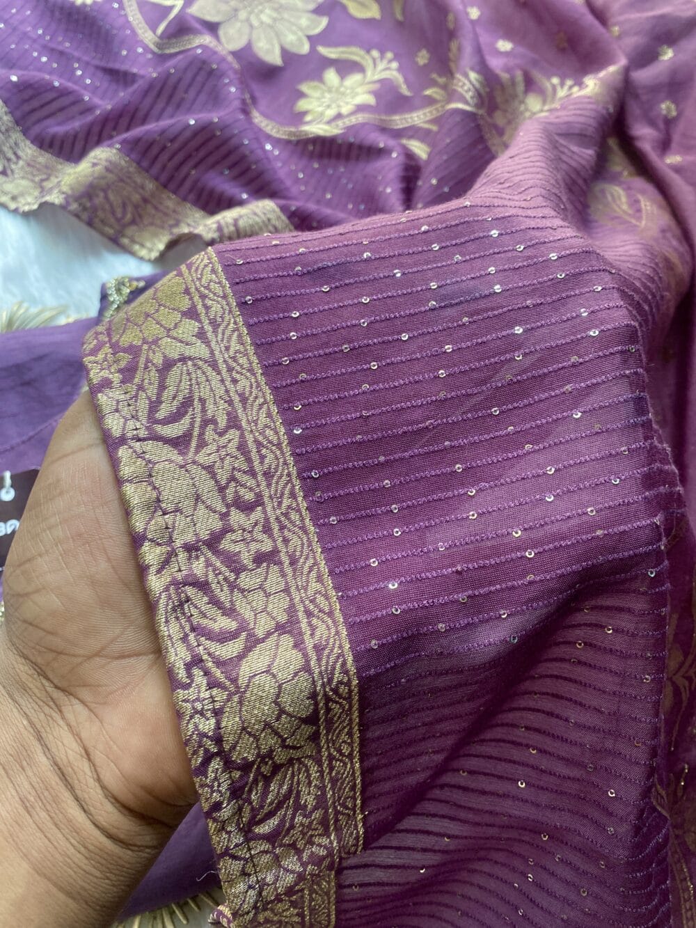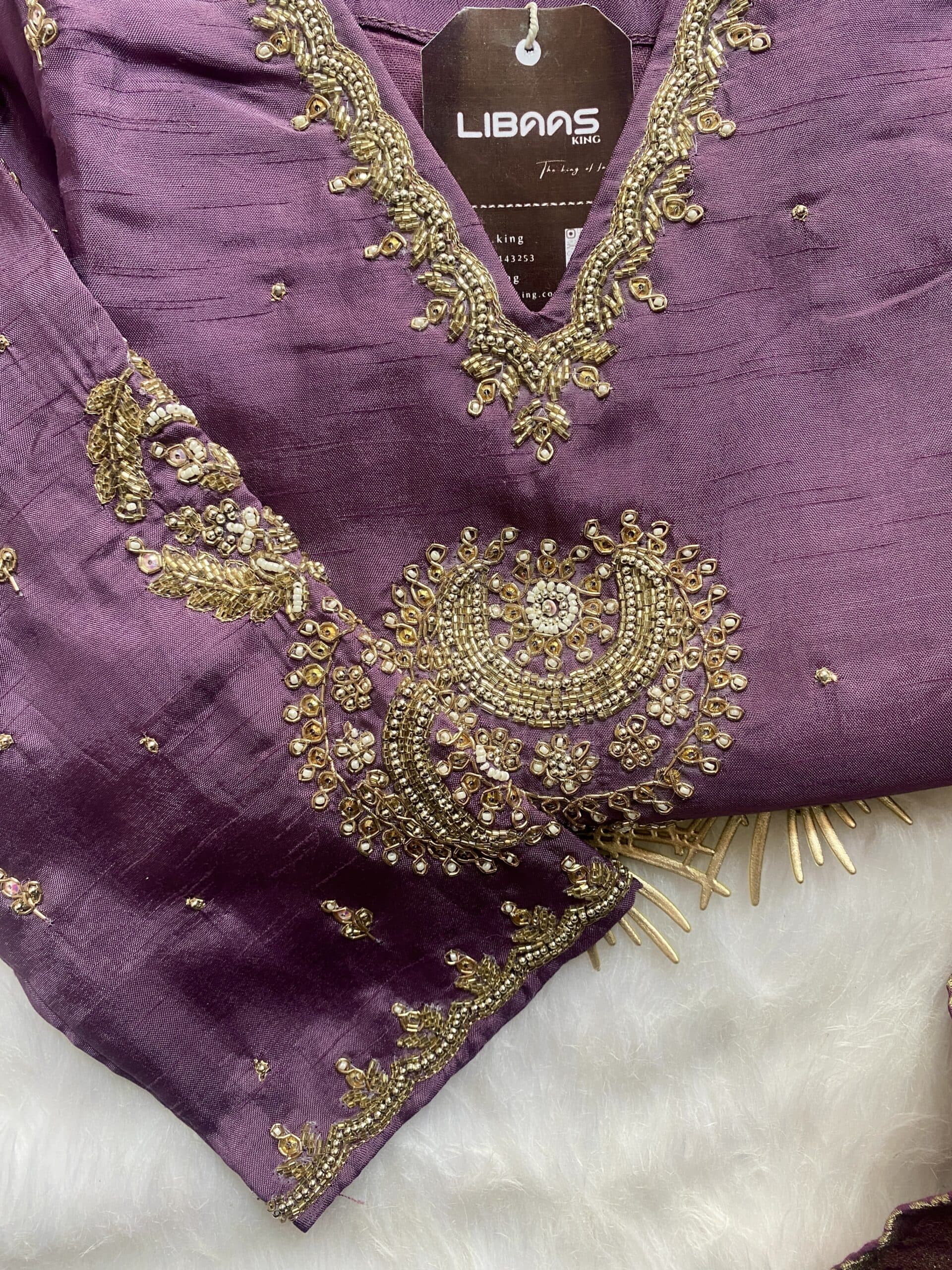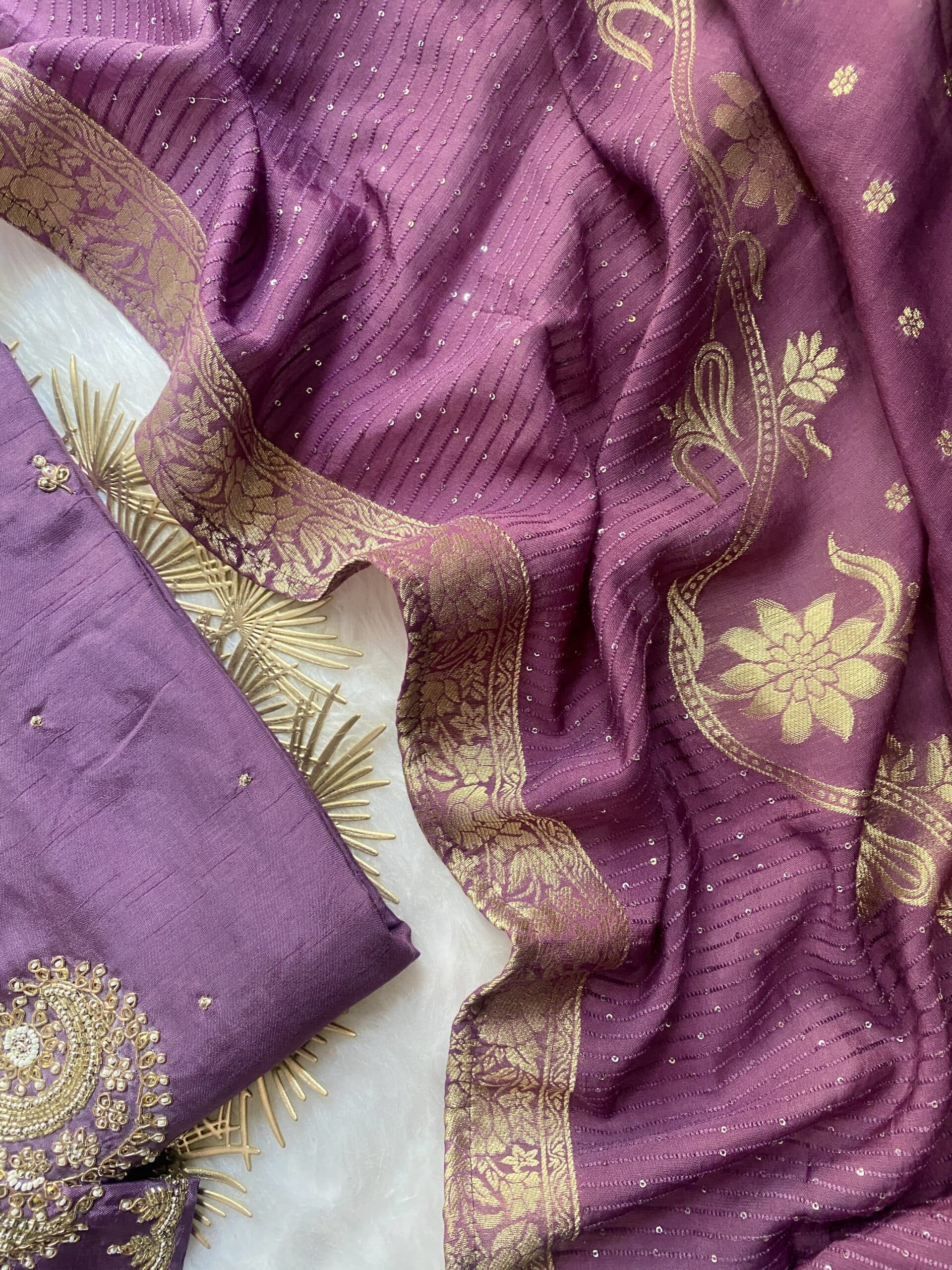 Premium range dola silk set with Handwork on the yoke & sleeve with a beautiful woven banarsi dupatta and a plane dola silk bottom