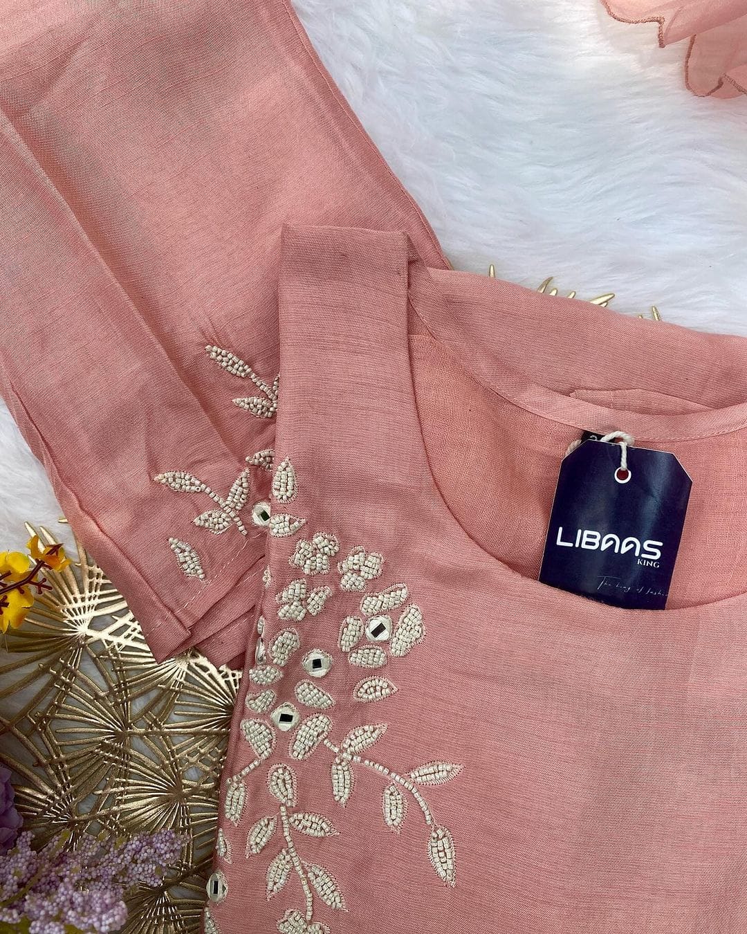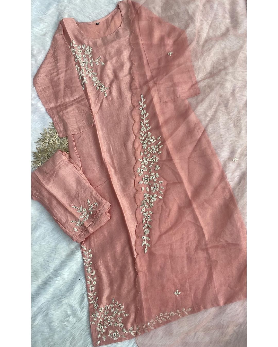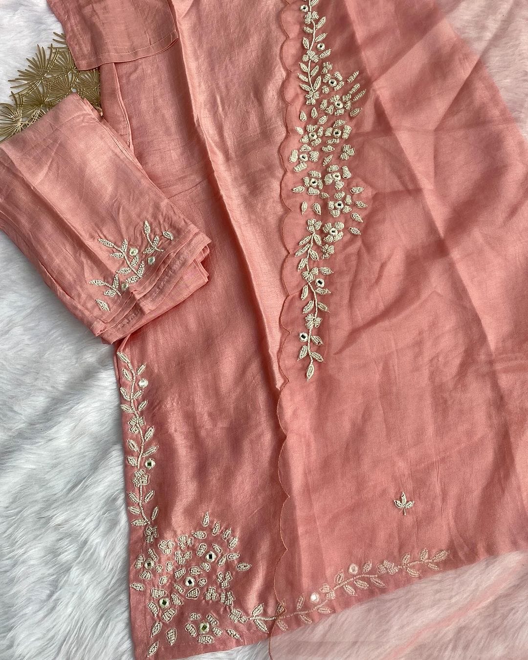 Beautiful dola silk kurta with with pearl work on the yoke & Daman of the kurta with a long organza dupatta with pearl work details & a dola silk bottom with work