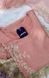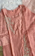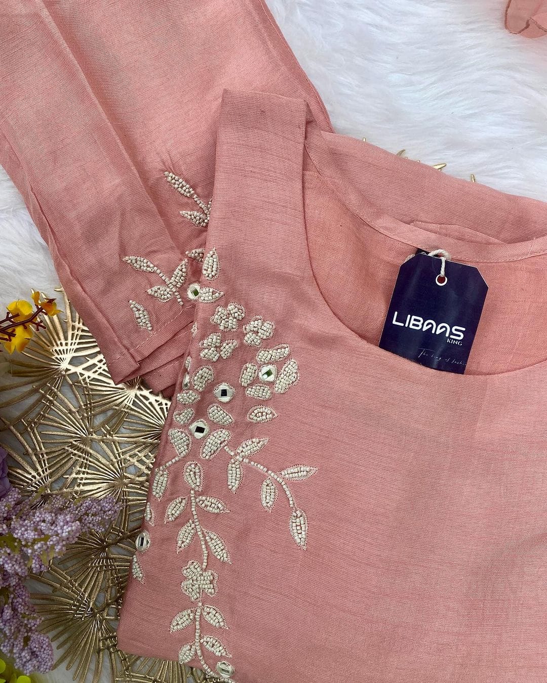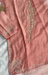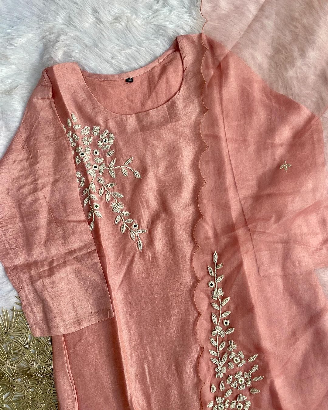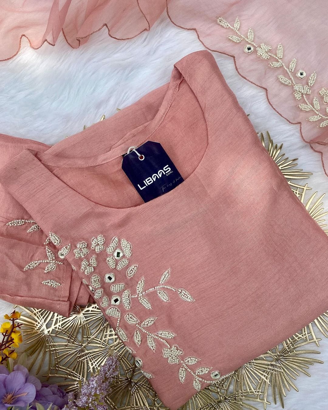Beautiful dola silk kurta with with pearl work on the yoke & Daman of the kurta with a long organza dupatta with pearl work details & a dola silk bottom with work