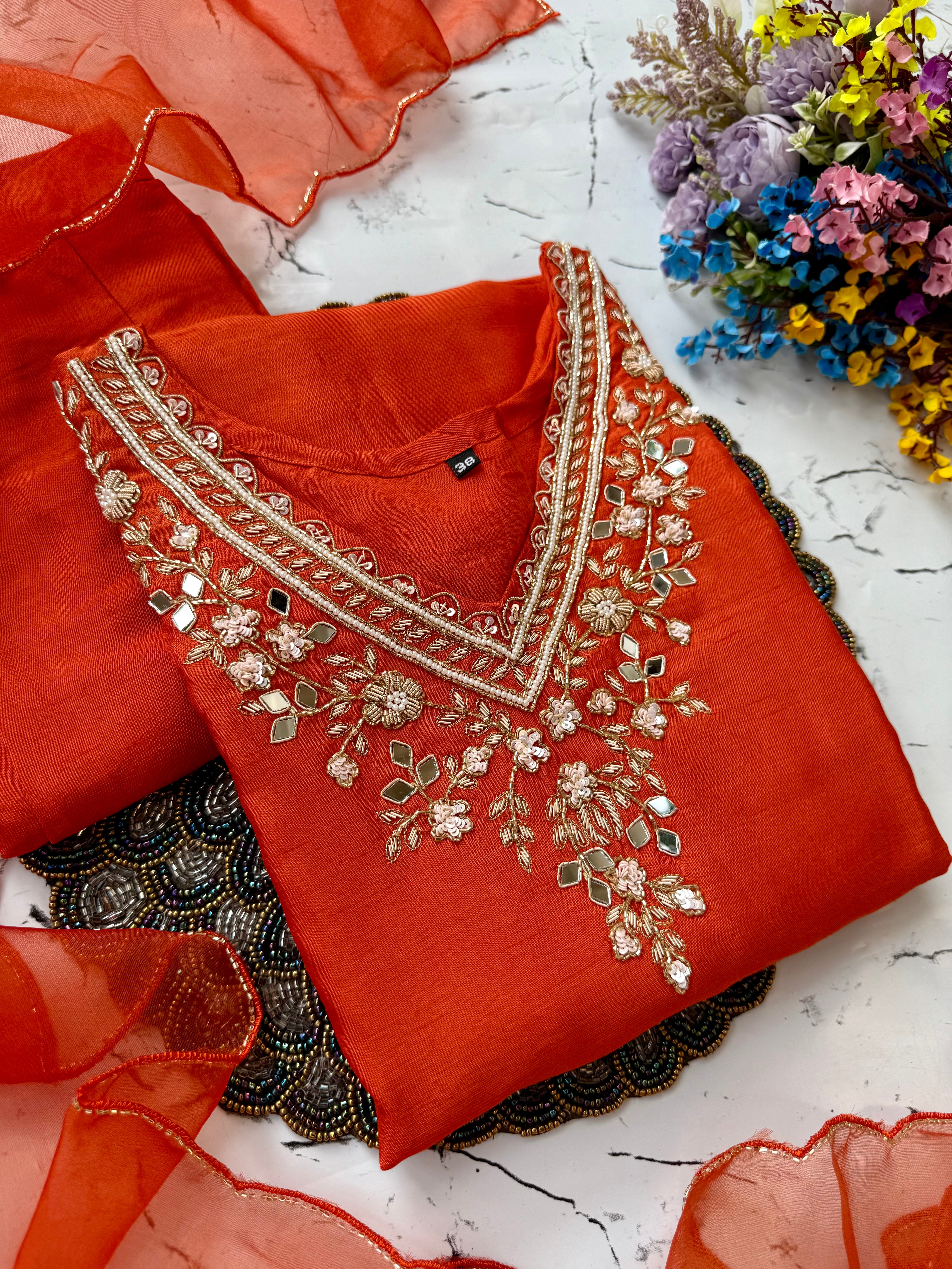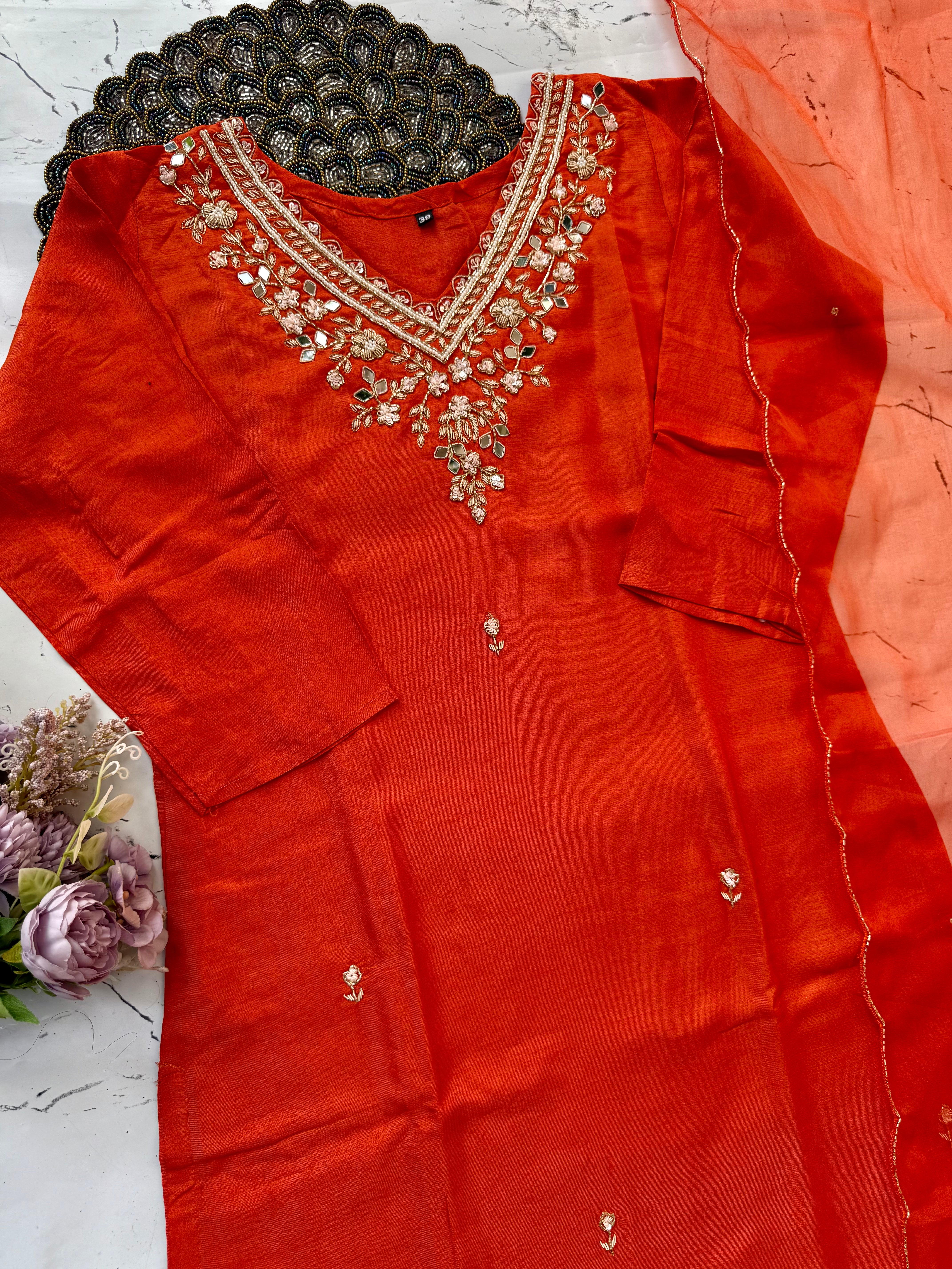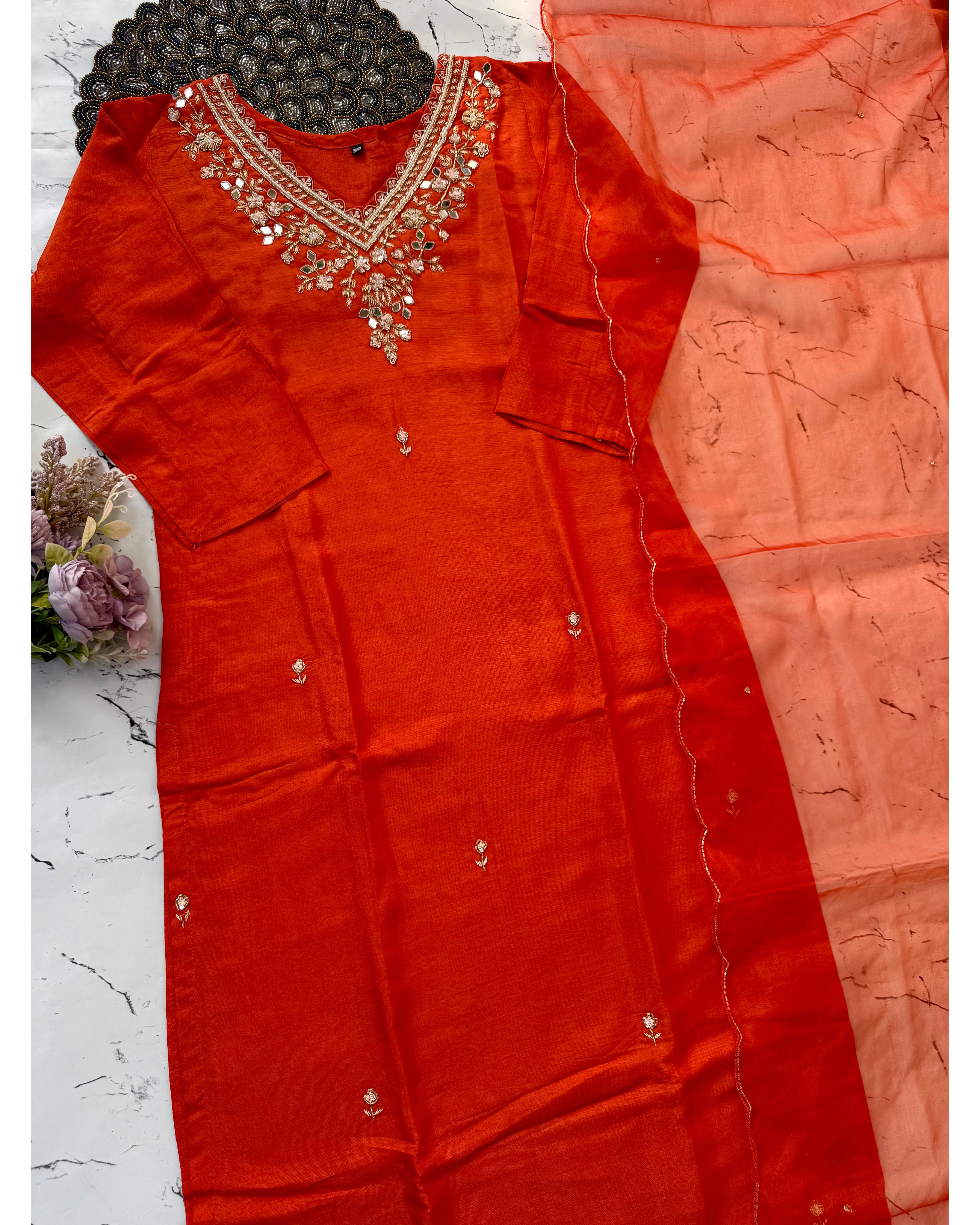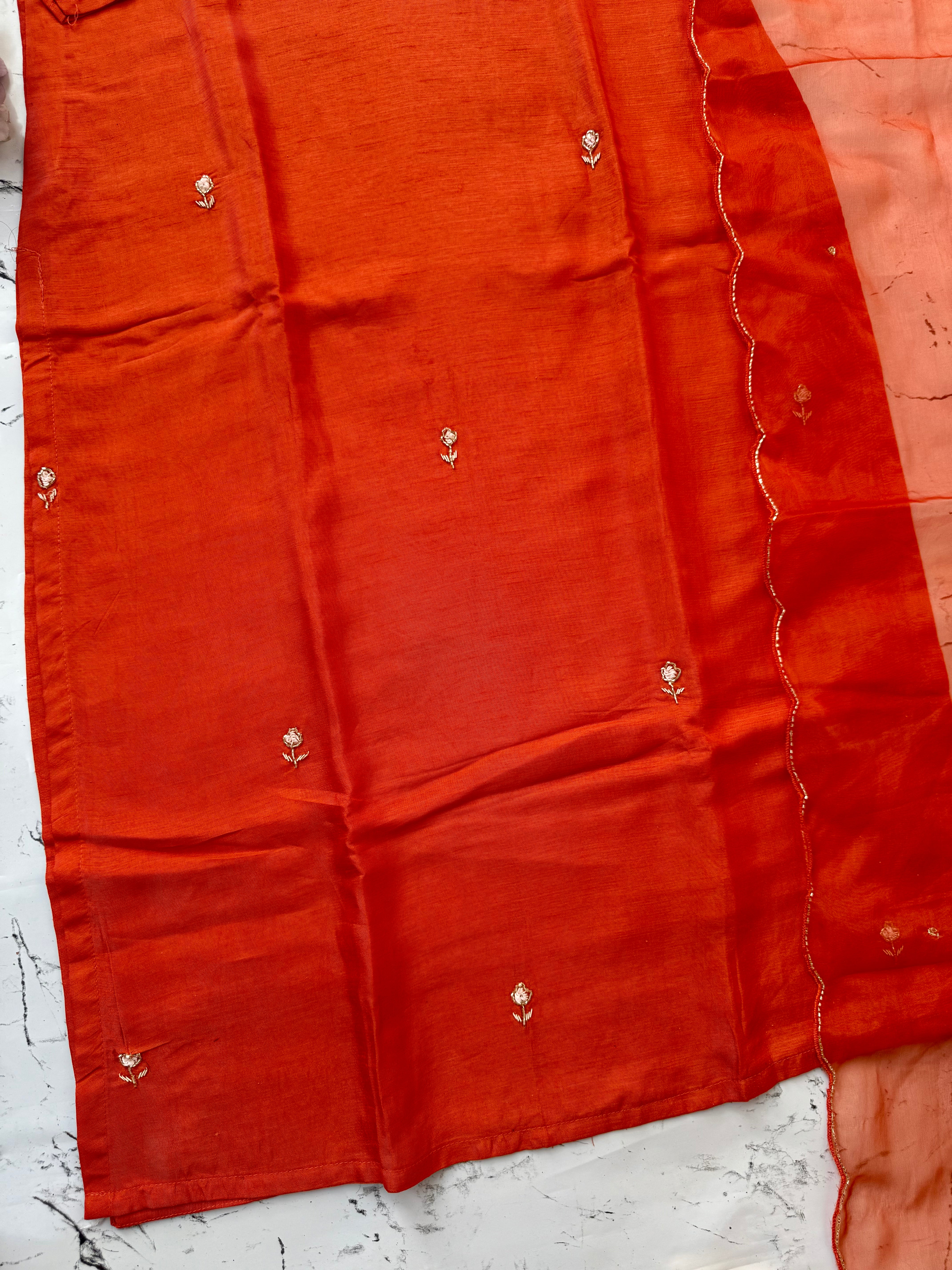 Dola silk kurti dupatta bottom set with handwork on the yoke and of the kurta with a scallop organza dupatta with a dola silk bottom