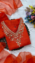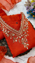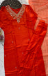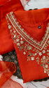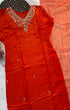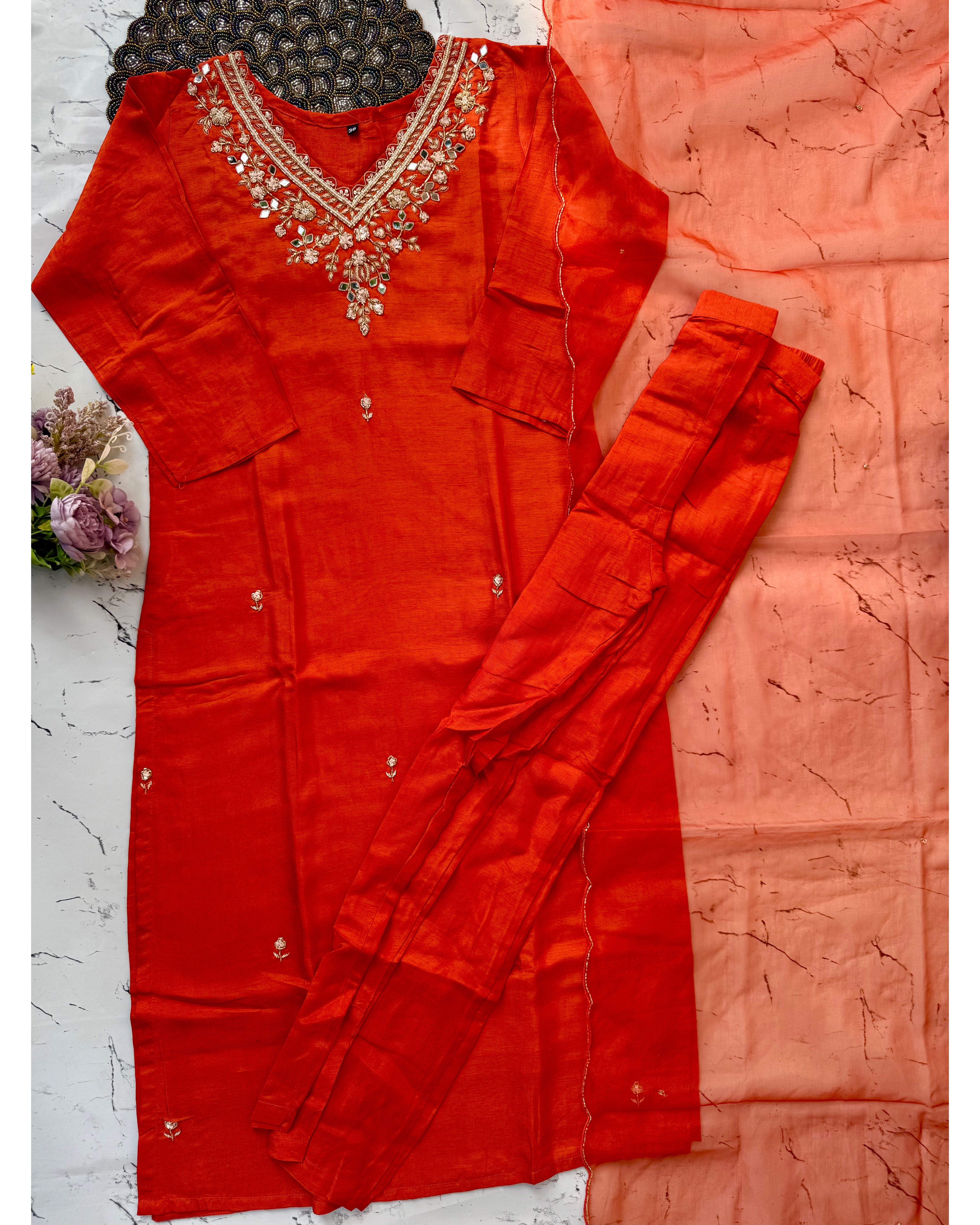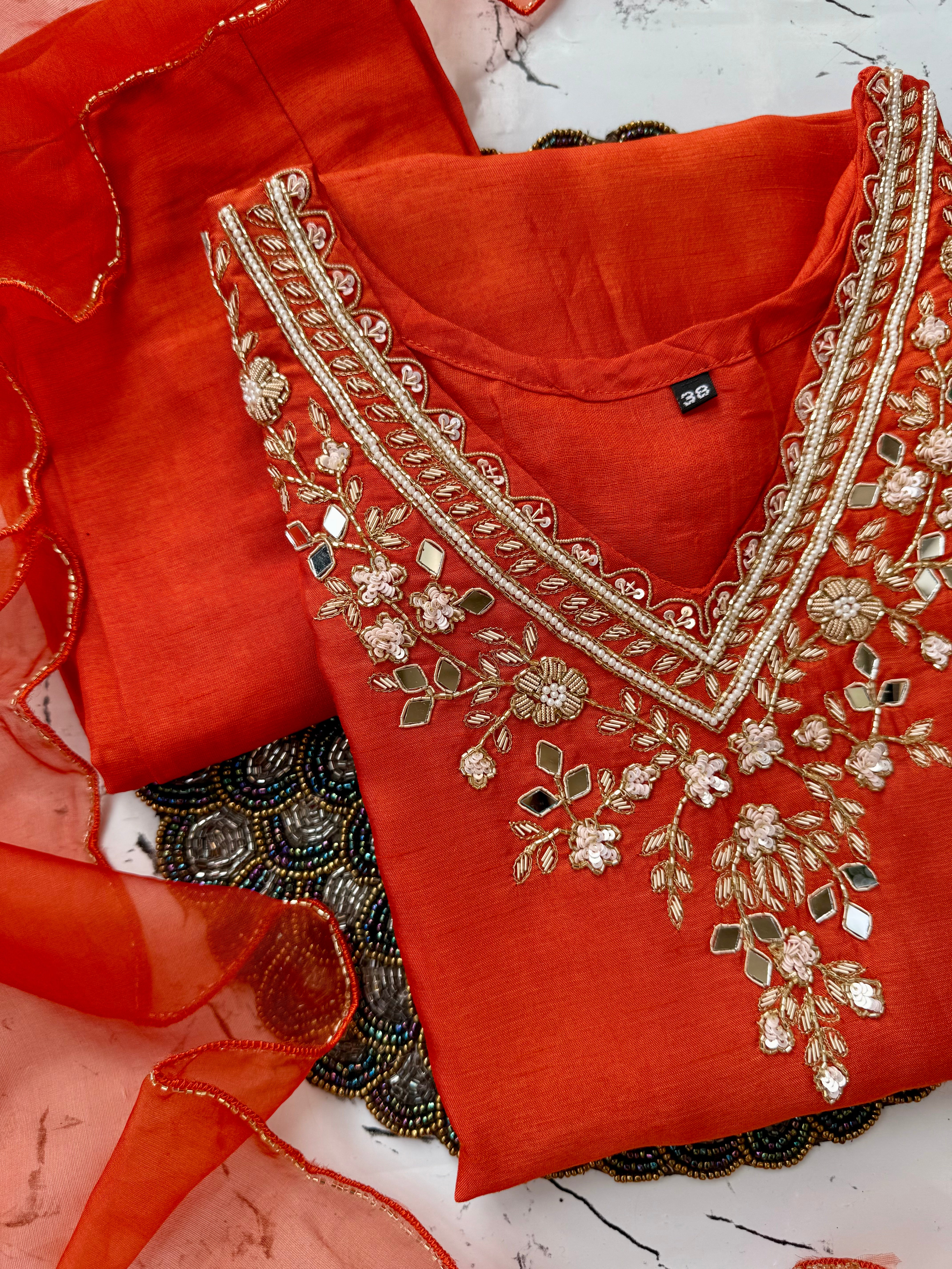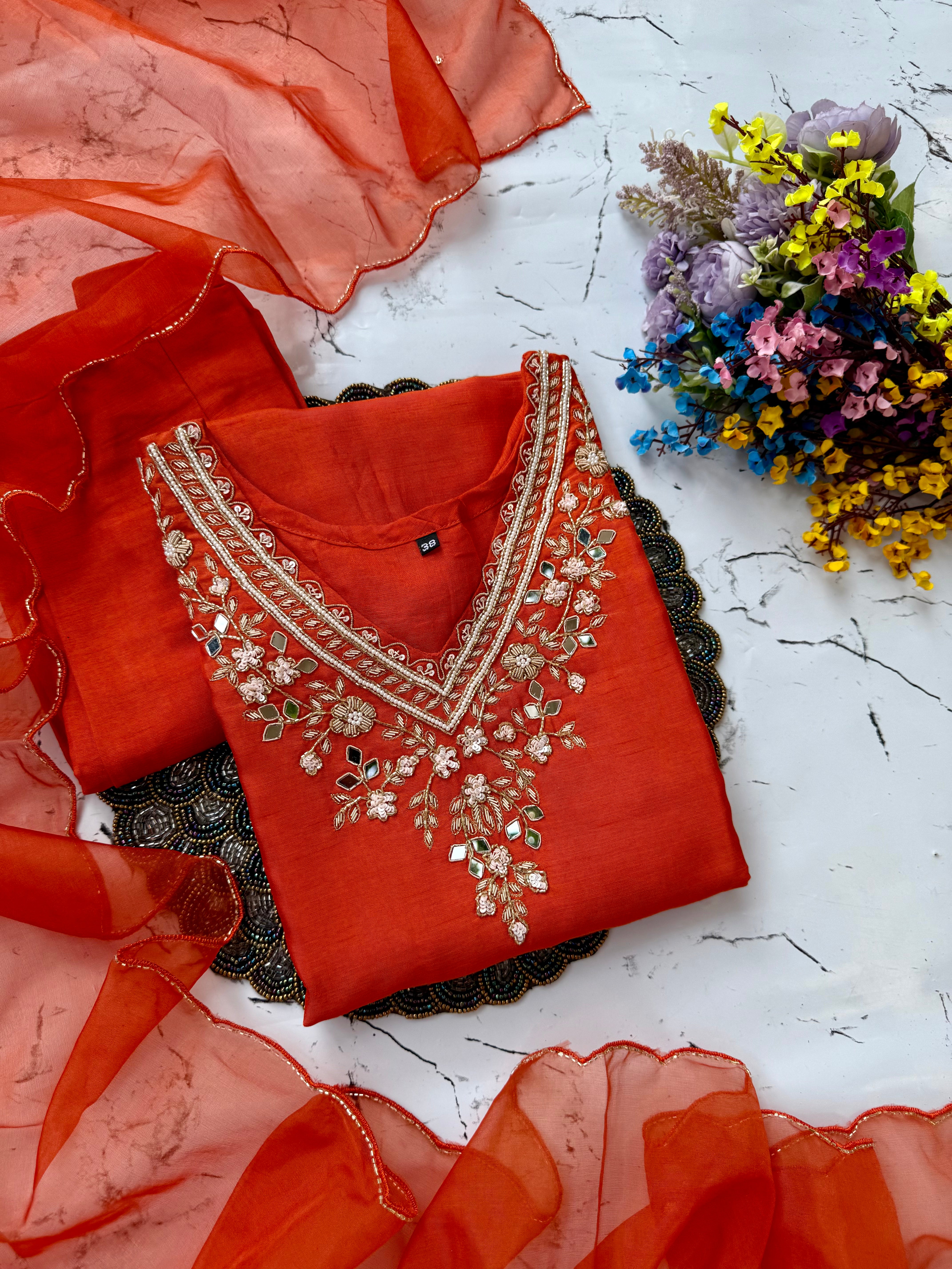 Dola silk kurti dupatta bottom set with handwork on the yoke and of the kurta with a scallop organza dupatta with a dola silk bottom