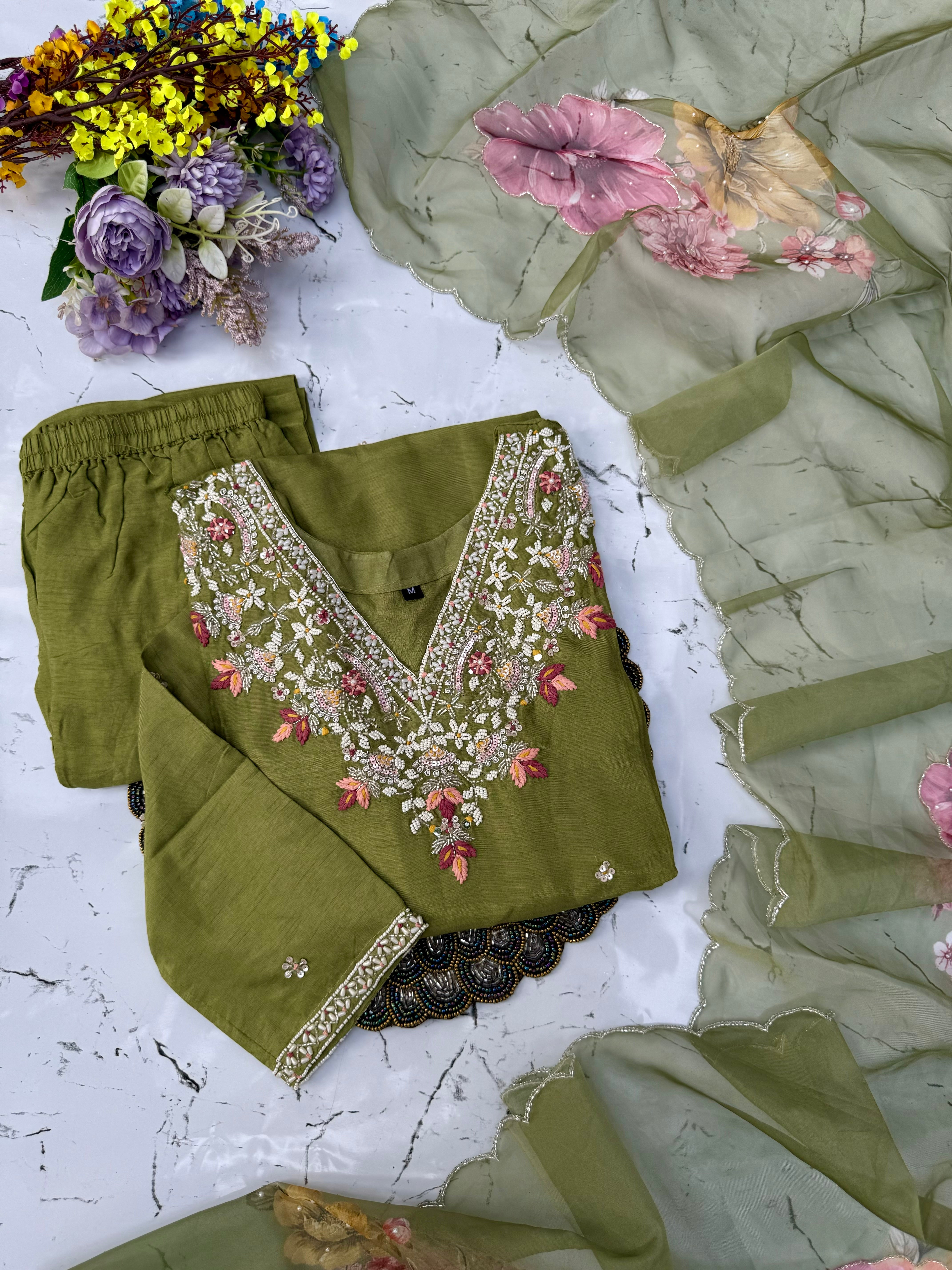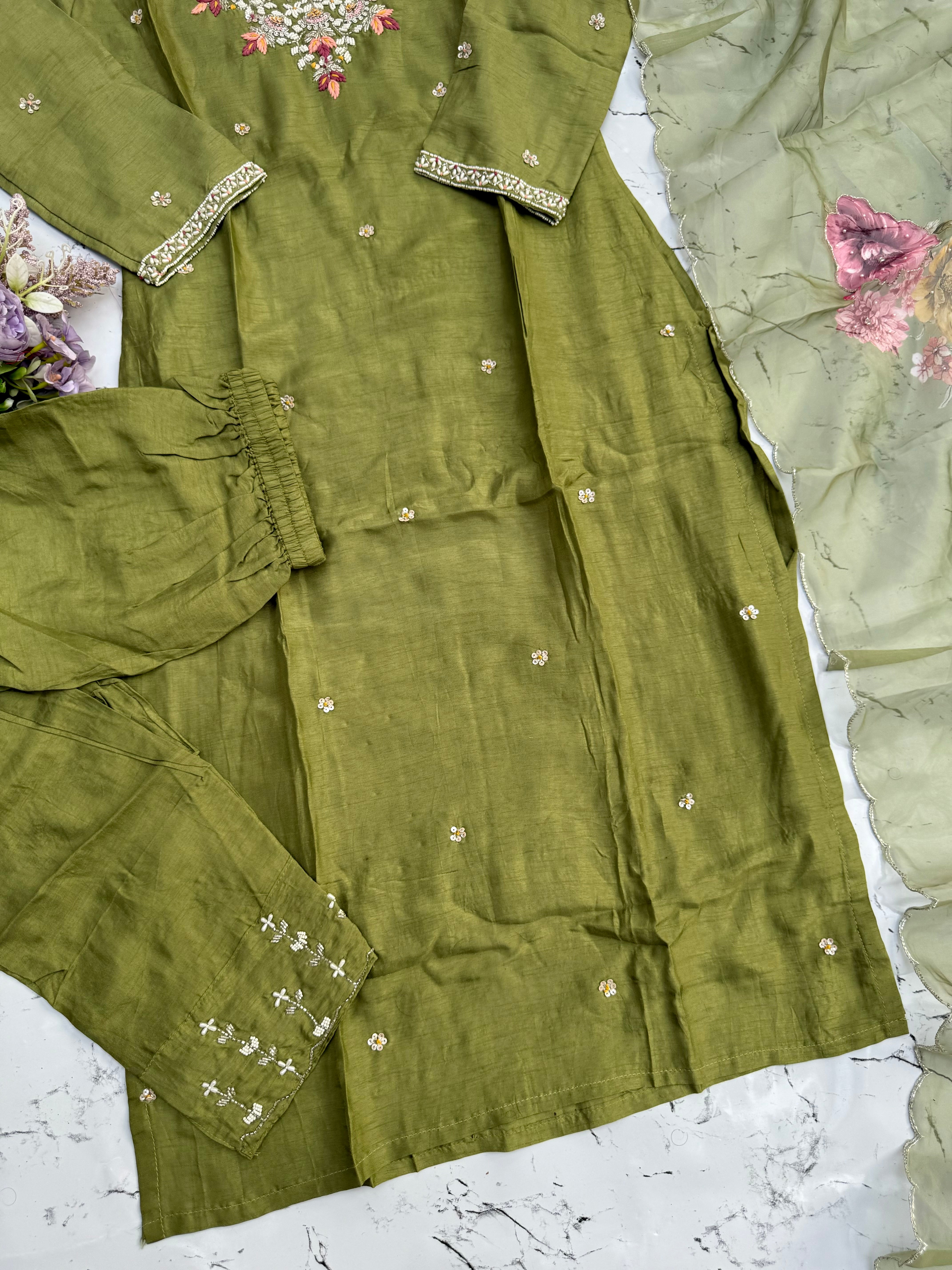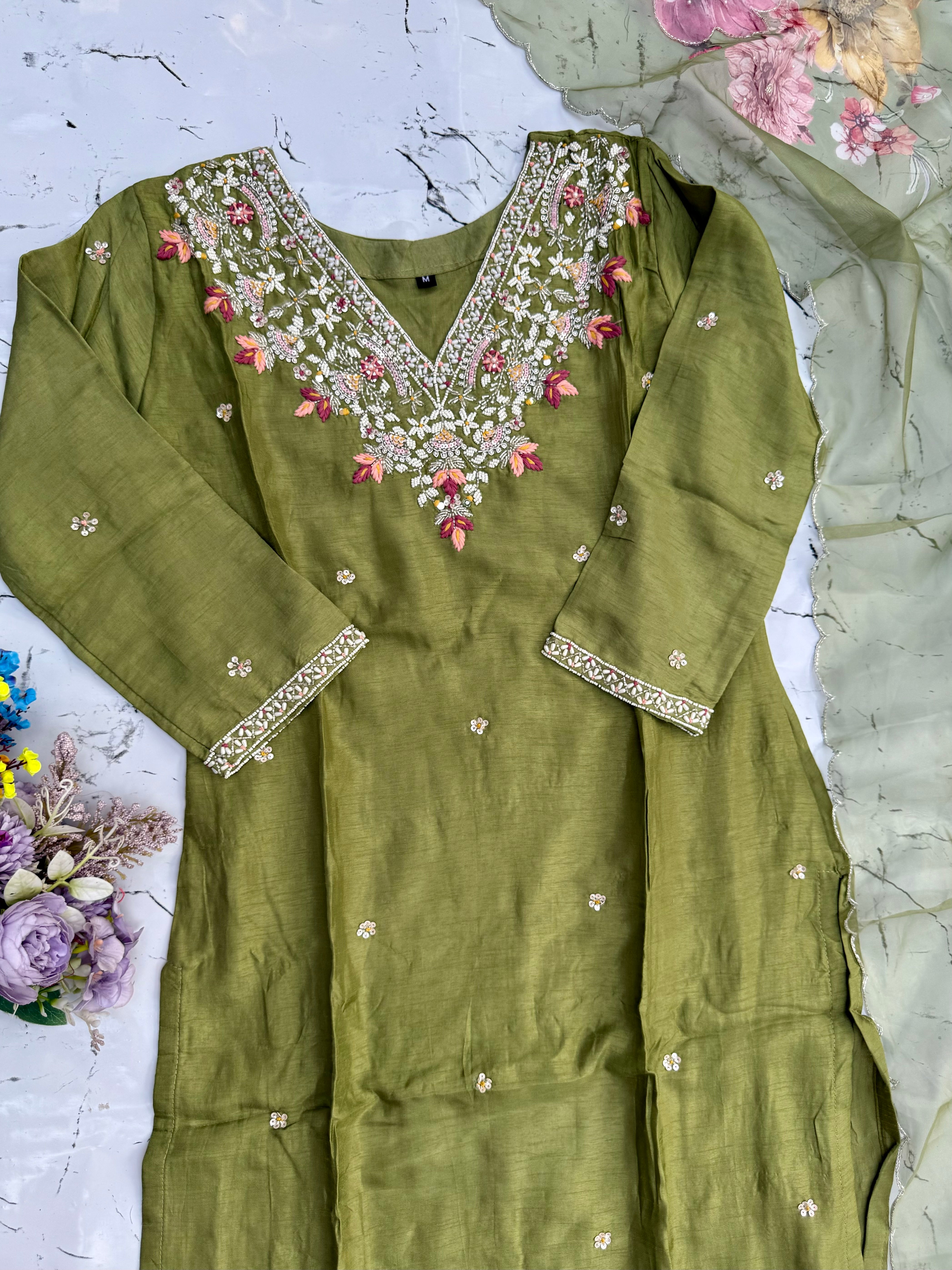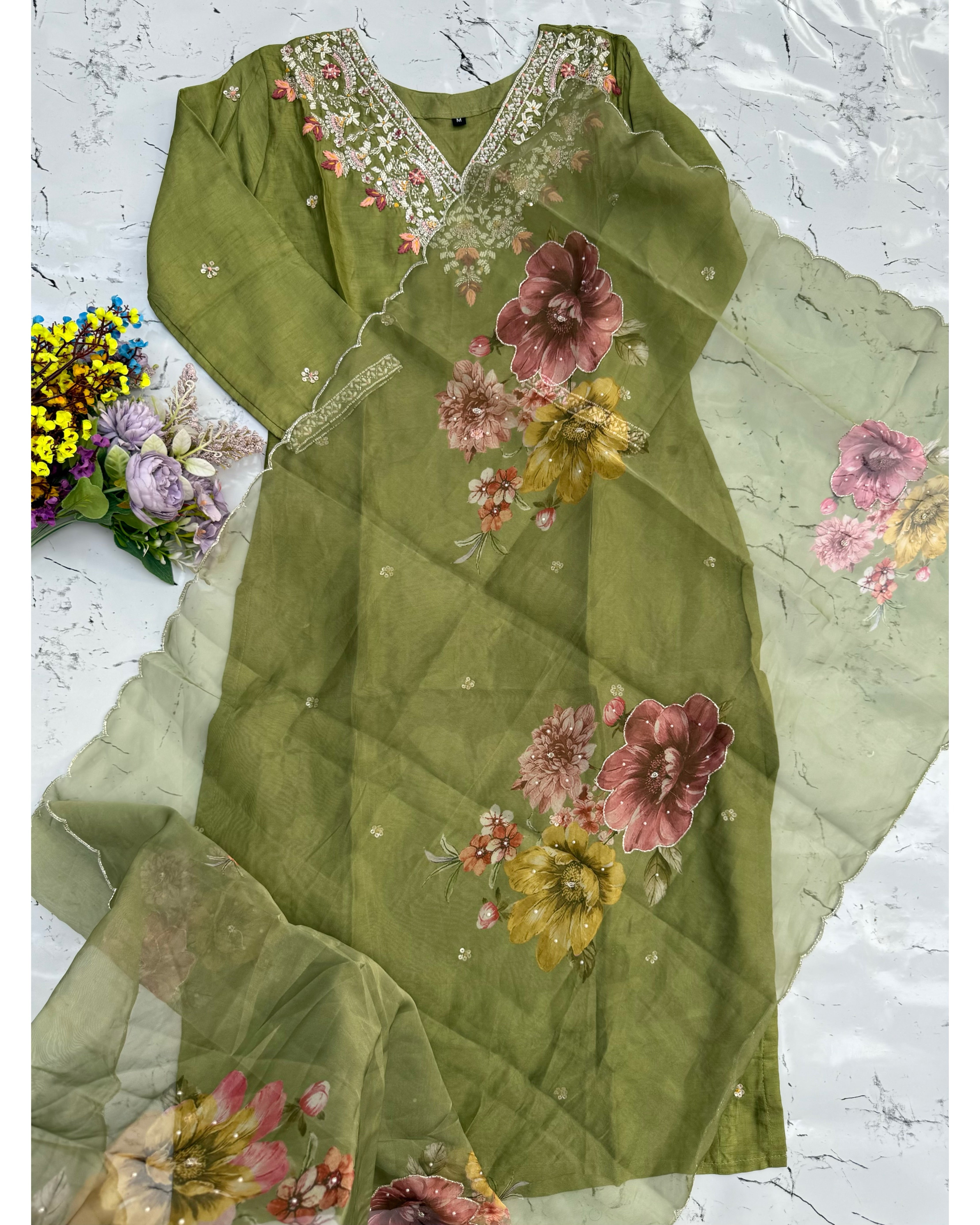Dola silk kurti dupatta bottom set with handwork on the yoke and sleeves of the kurta with a beautiful Printed & hand work all over the kurta a plane silk bottom with work