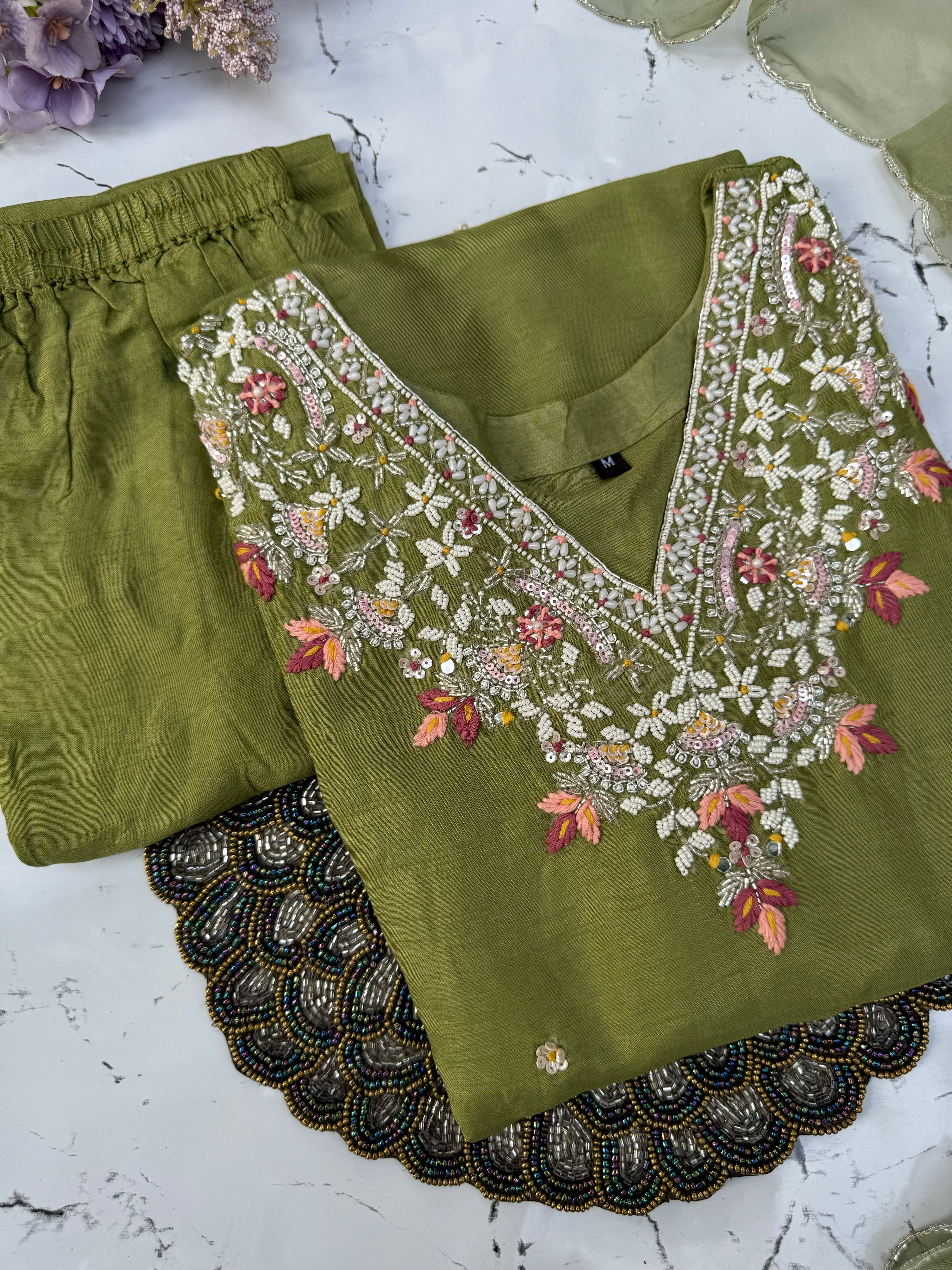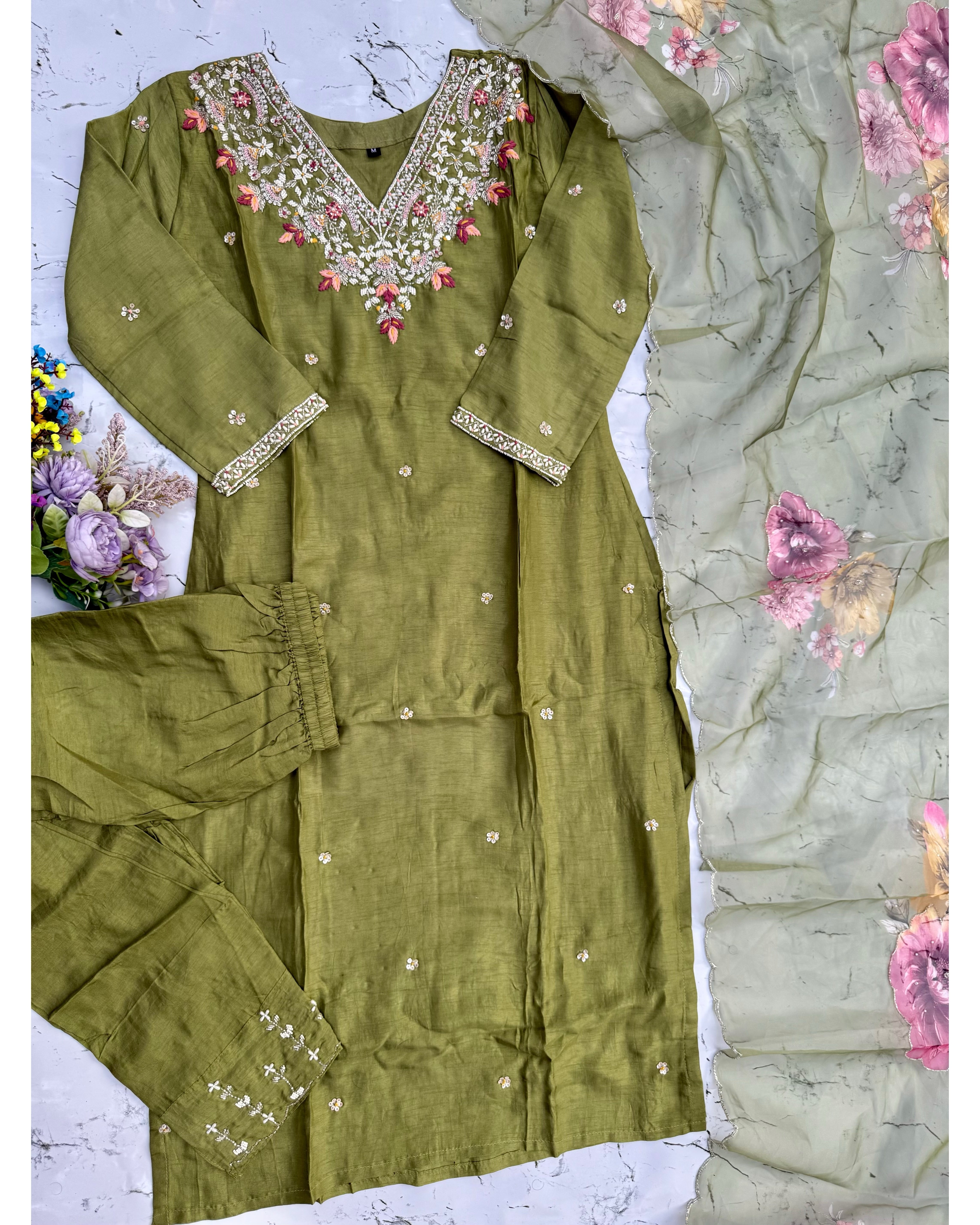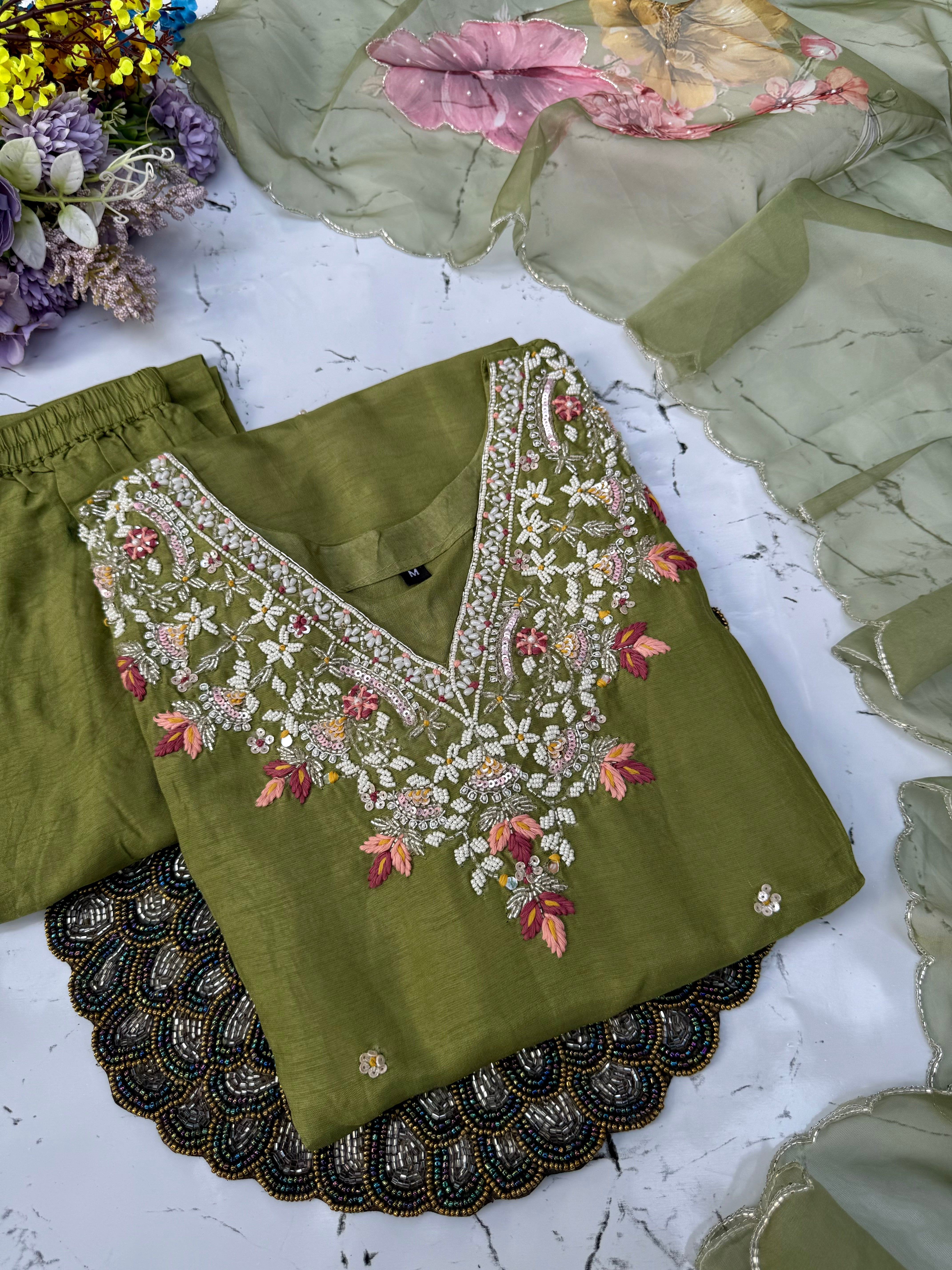 Dola silk kurti dupatta bottom set with handwork on the yoke and sleeves of the kurta with a beautiful Printed & hand work all over the kurta a plane silk bottom with work