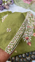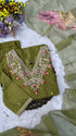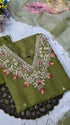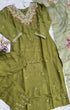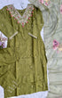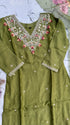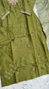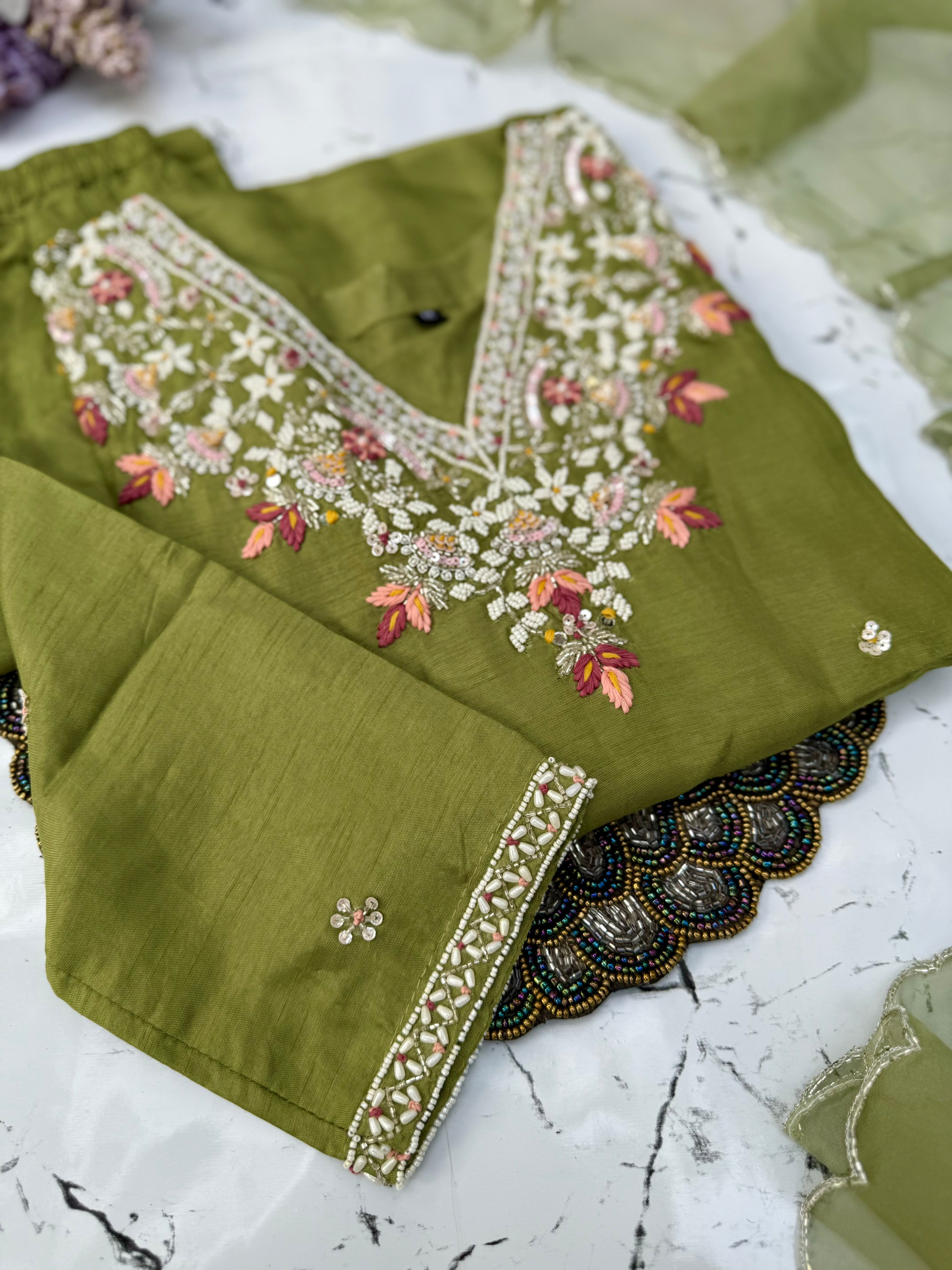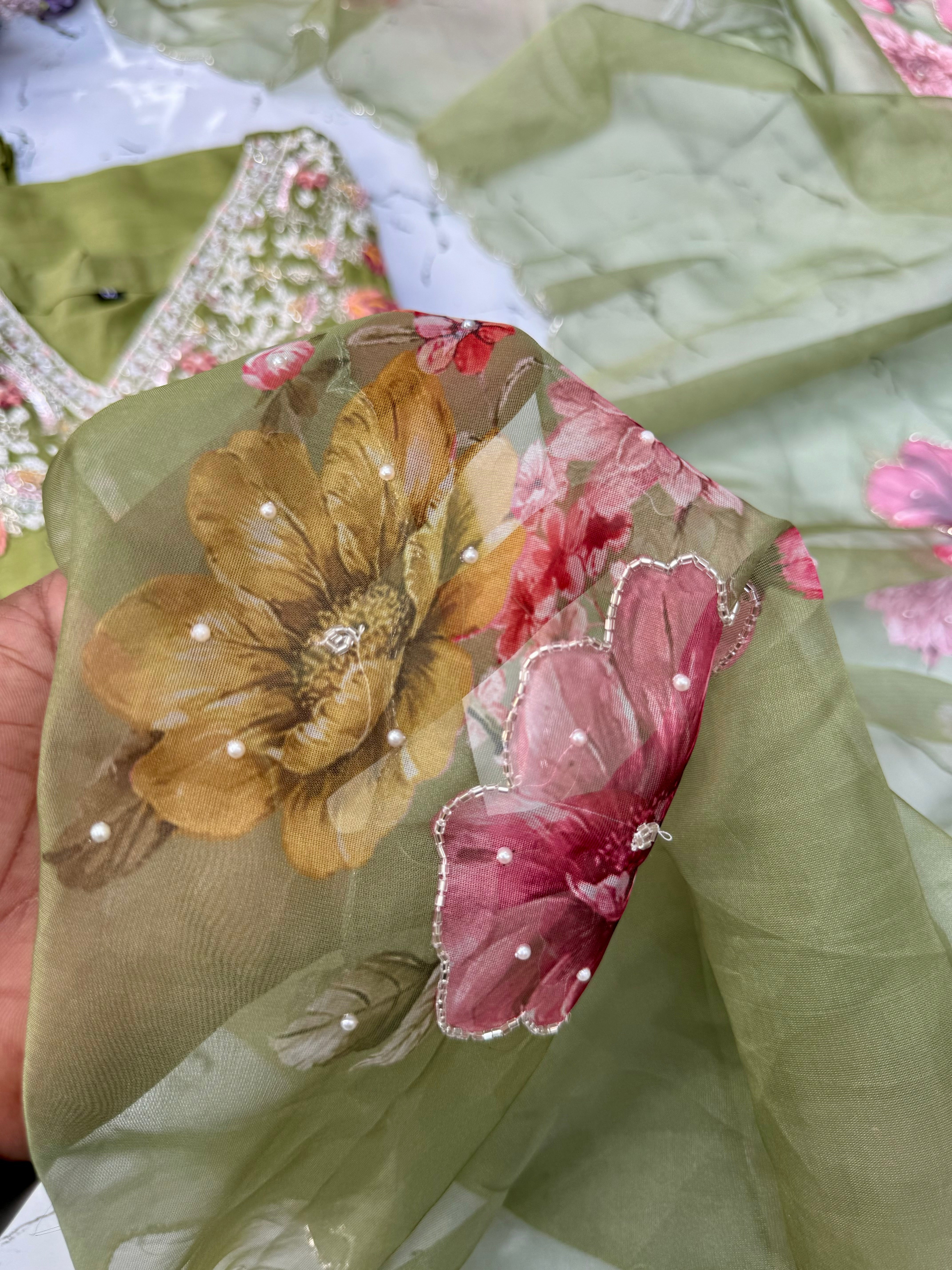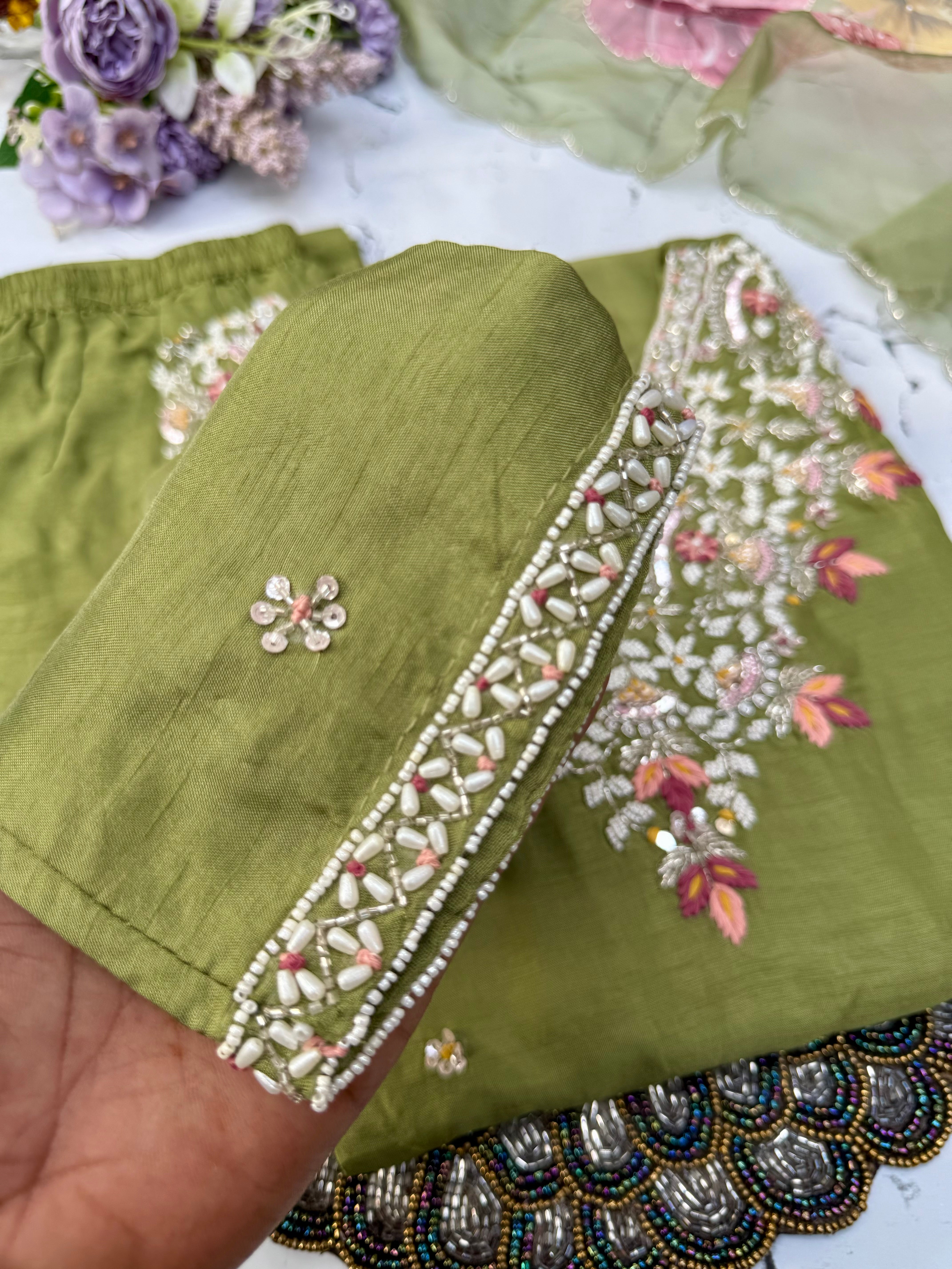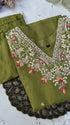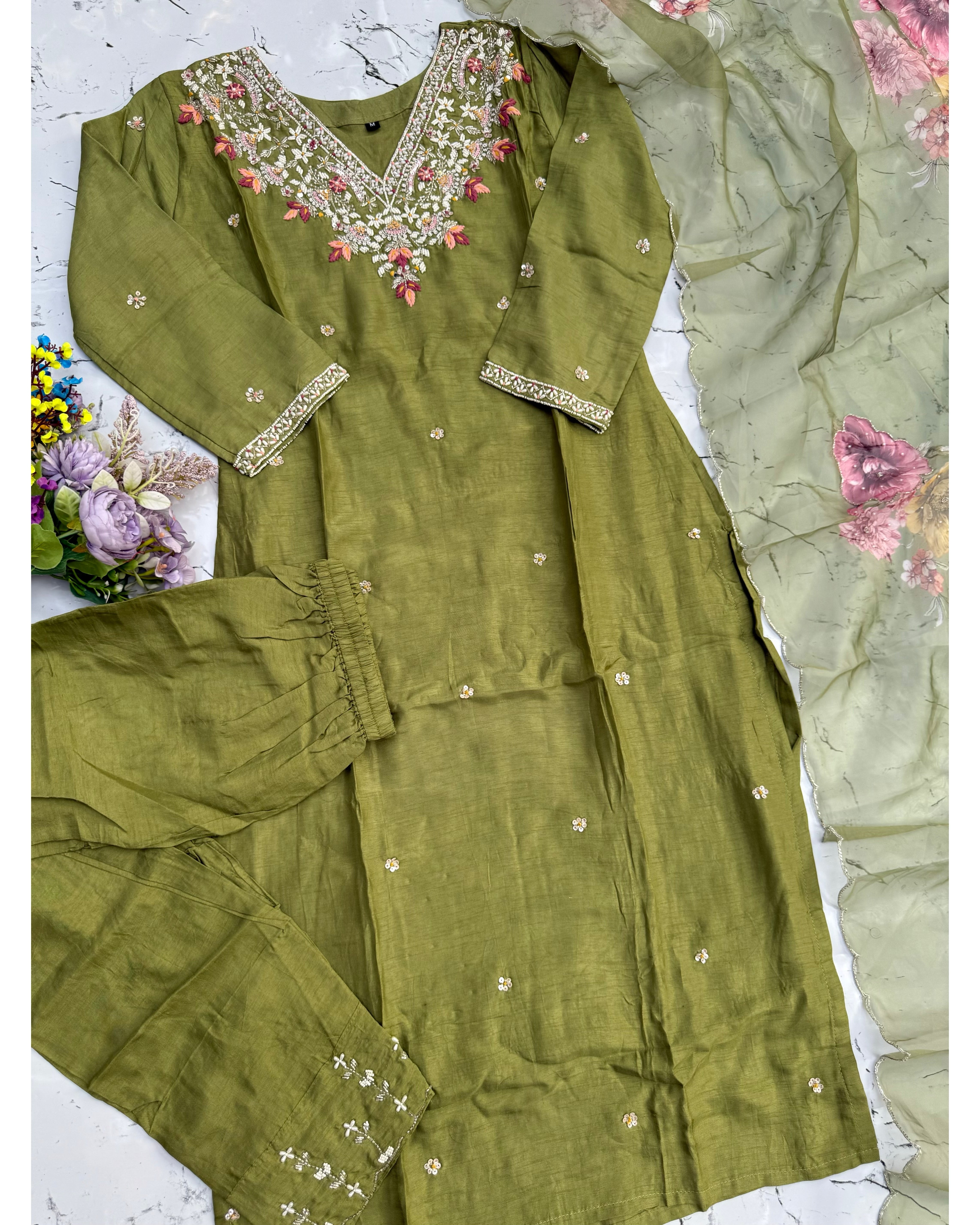 Dola silk kurti dupatta bottom set with handwork on the yoke and sleeves of the kurta with a beautiful Printed & hand work all over the kurta a plane silk bottom with work