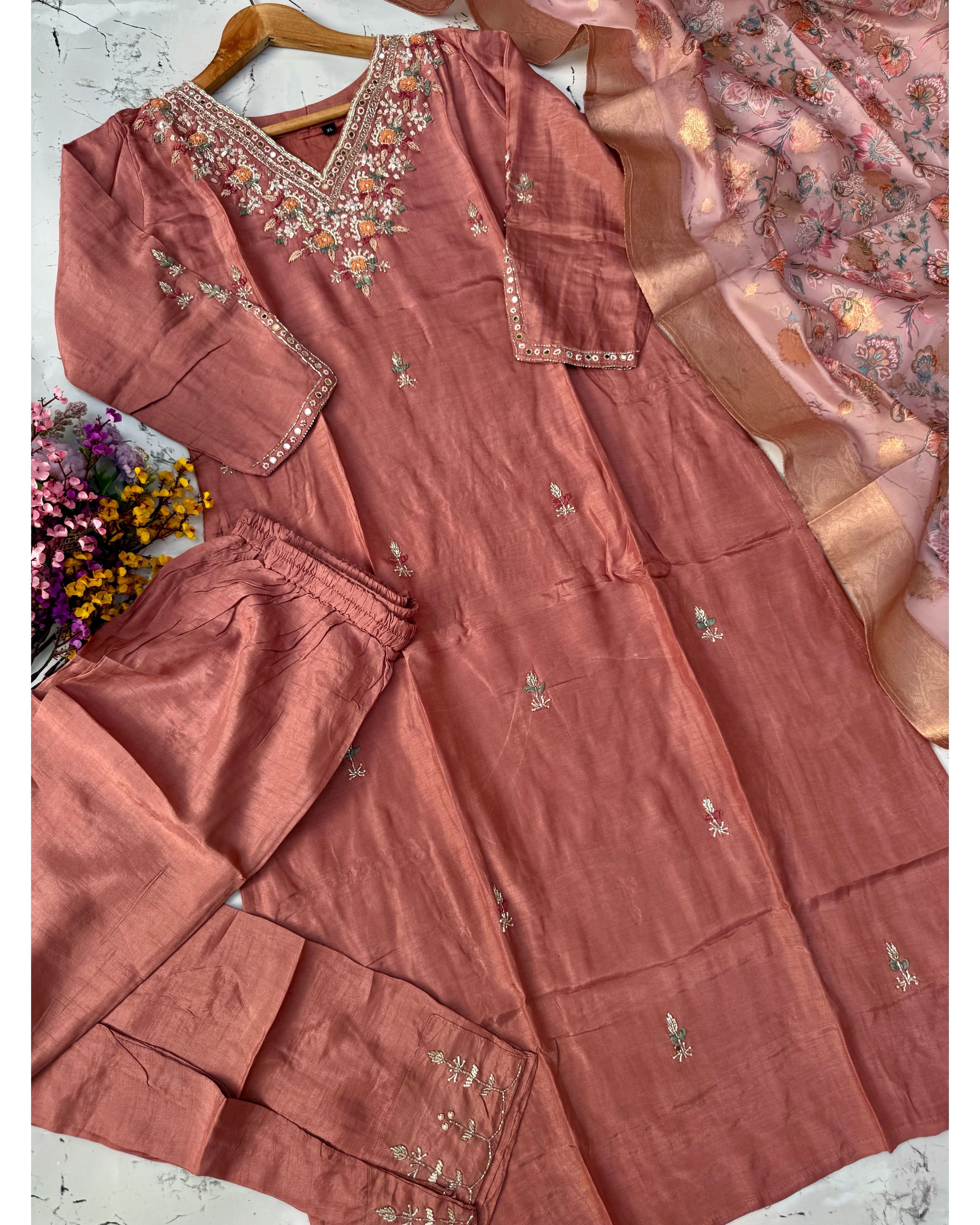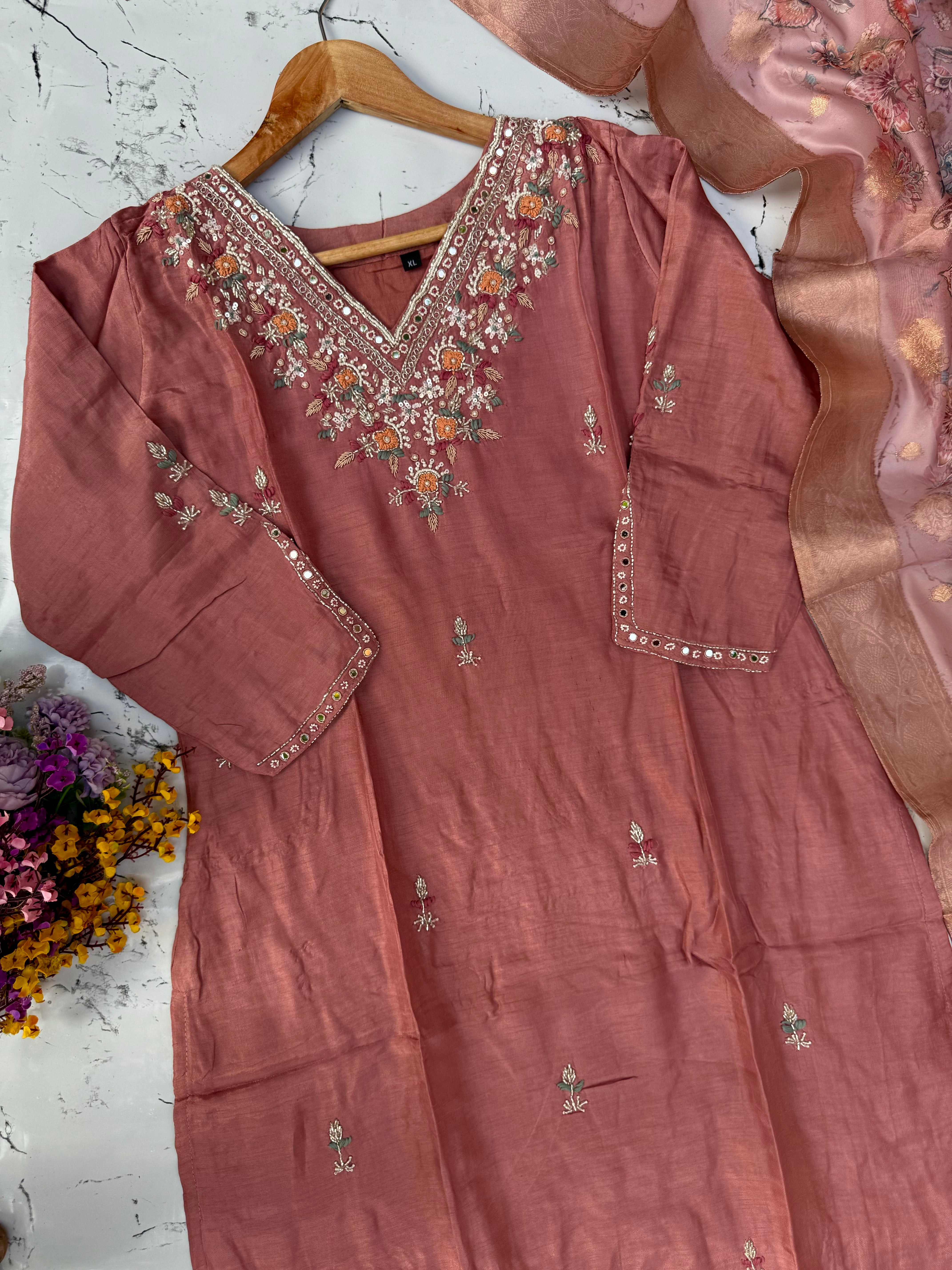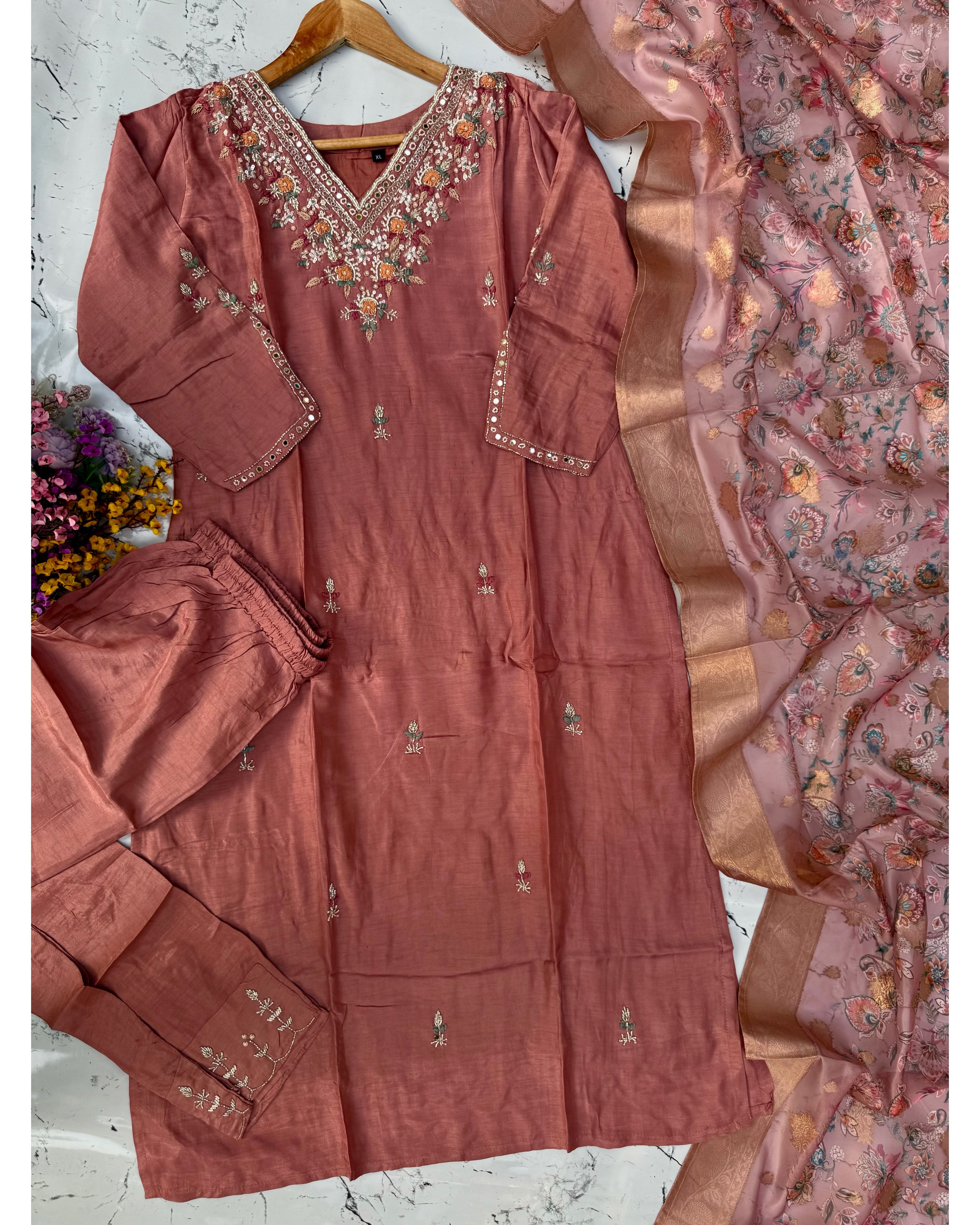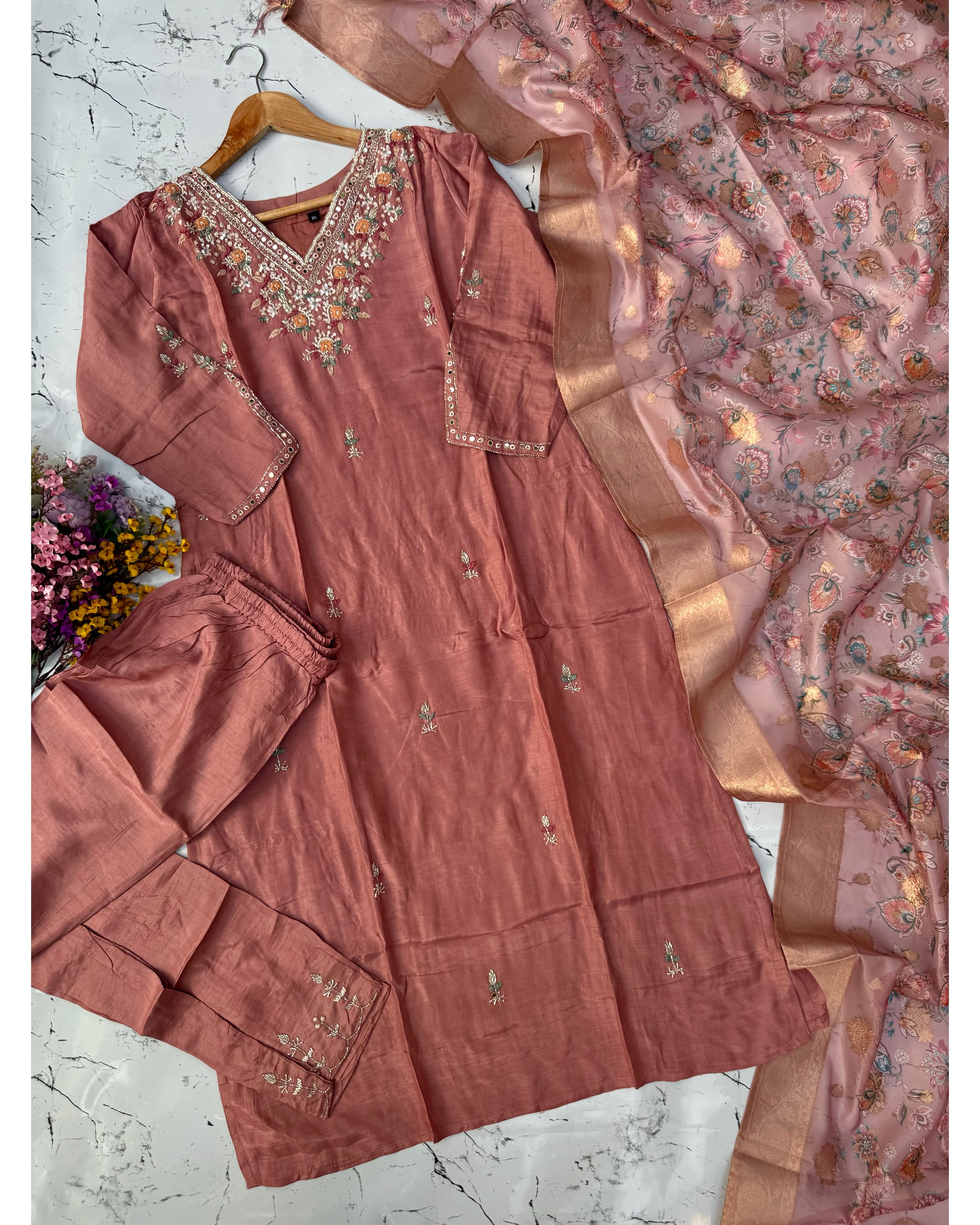 Dola silk kurti dupatta bottom set with handwork on the yoke and sleeves of the kurta with a beautiful contrast Printed Banarsi dupatta with a plane silk bottom with work
