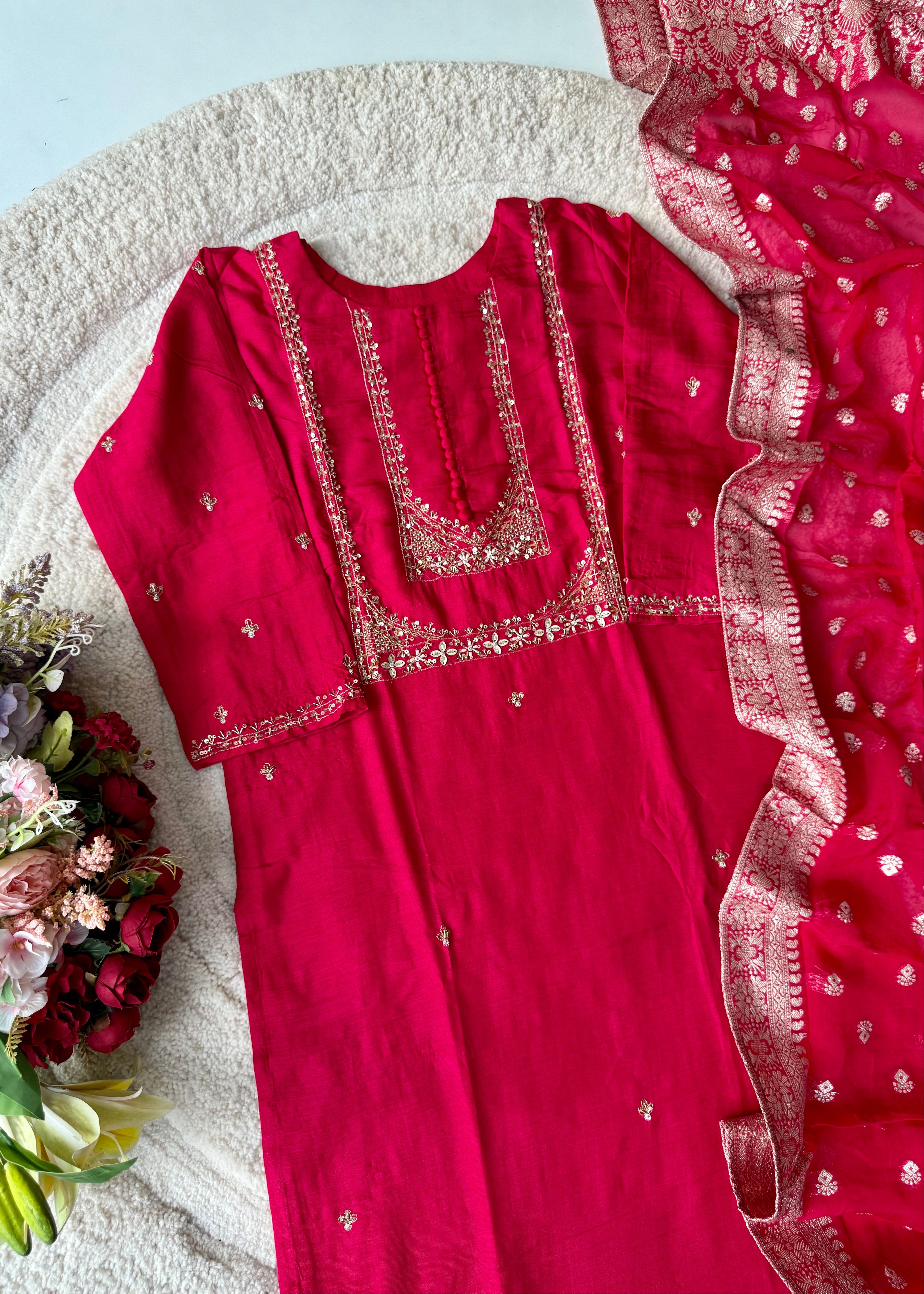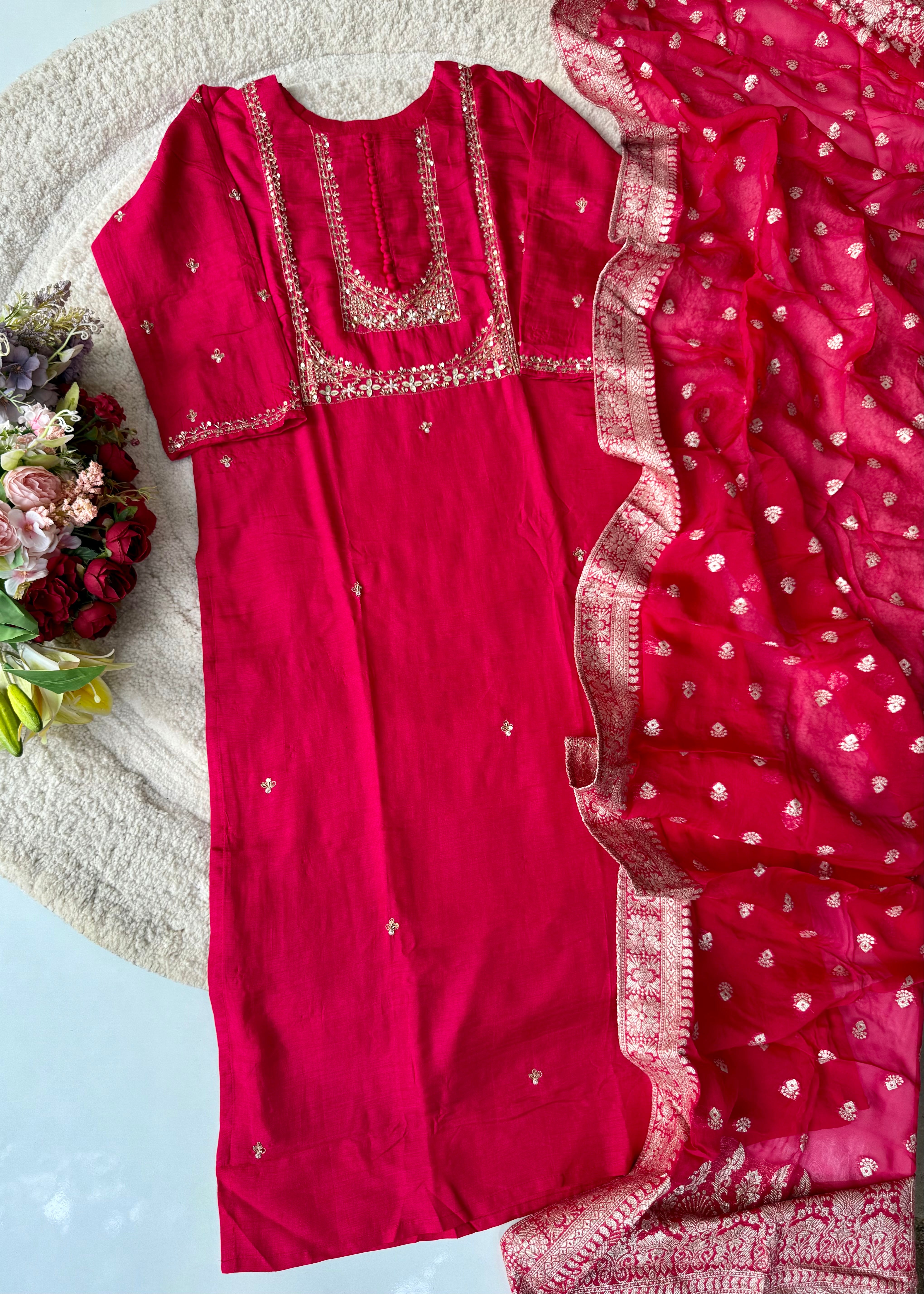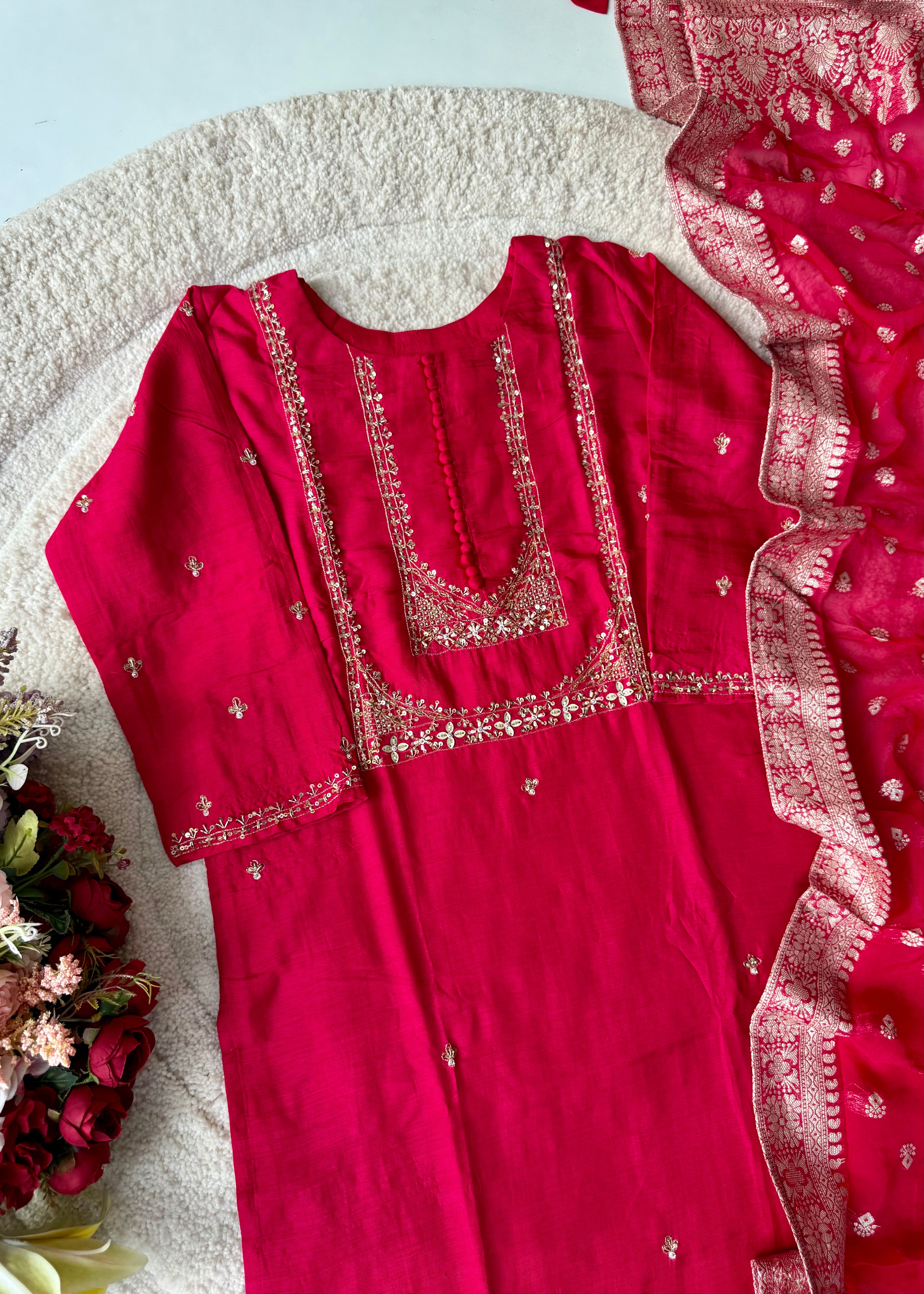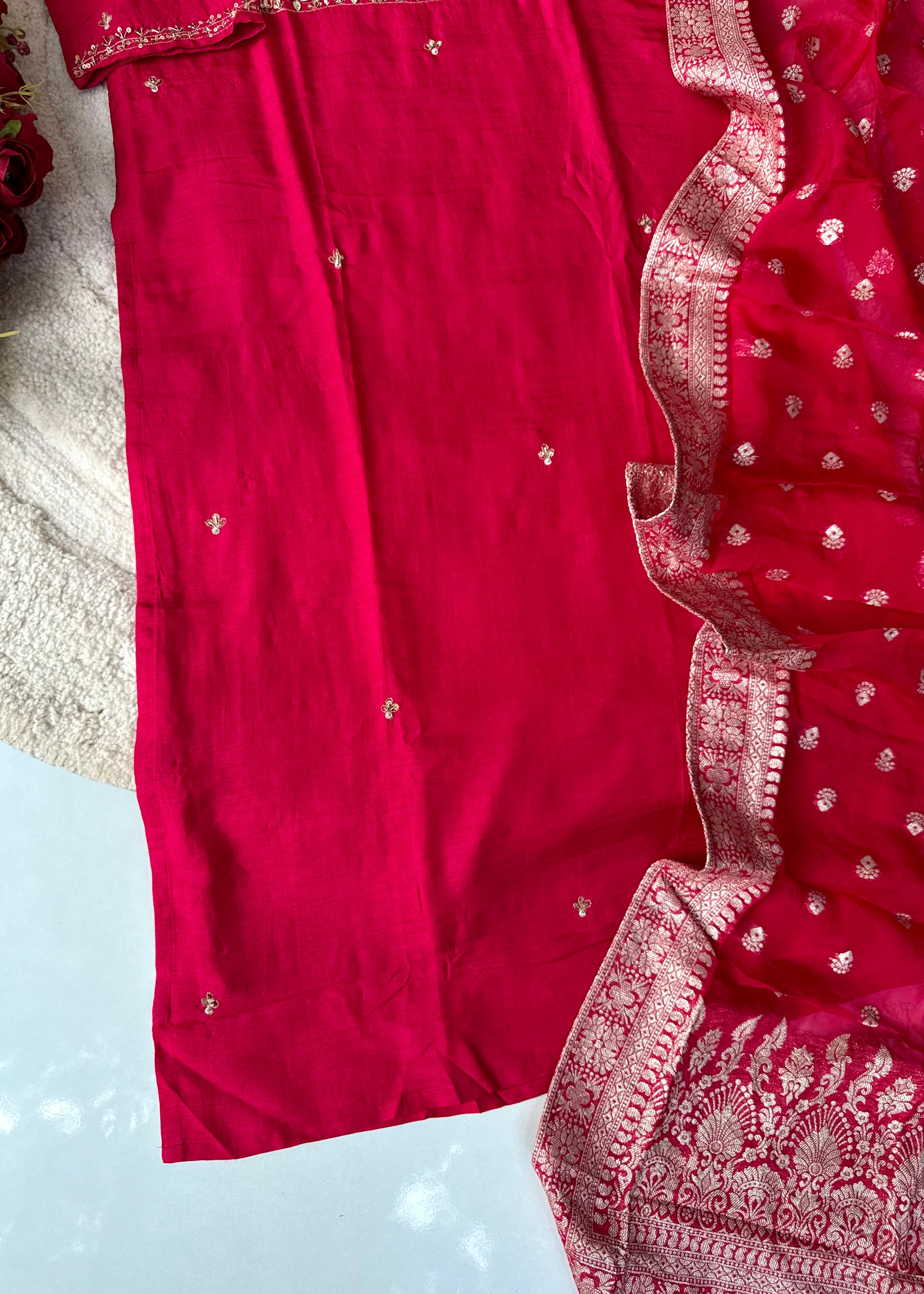 The kurta features delicate handwork on the yoke and sleeves, paired with a Dola silk bottom and a Banarasi weaving organza dupatta for a regal finishing touch.