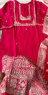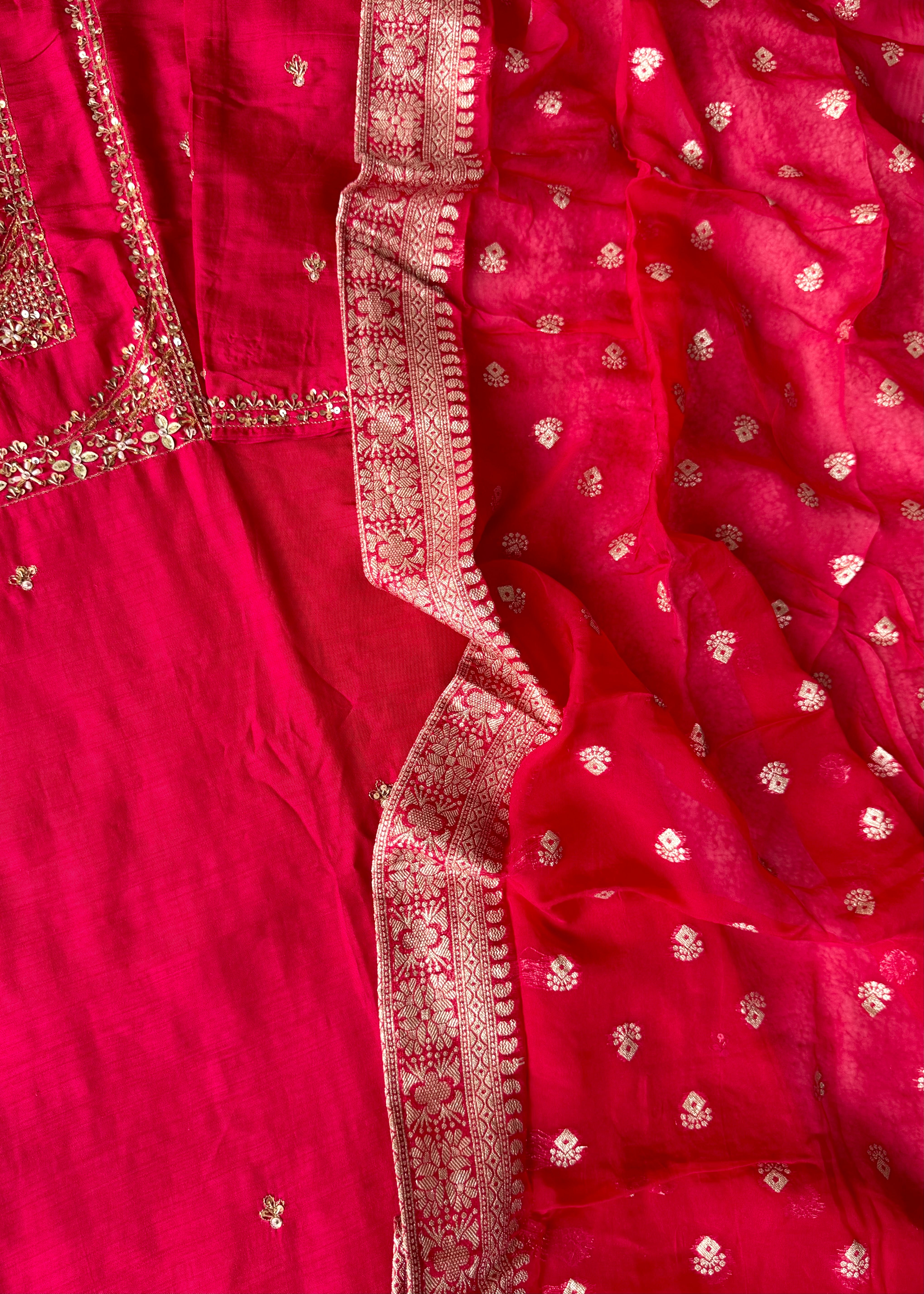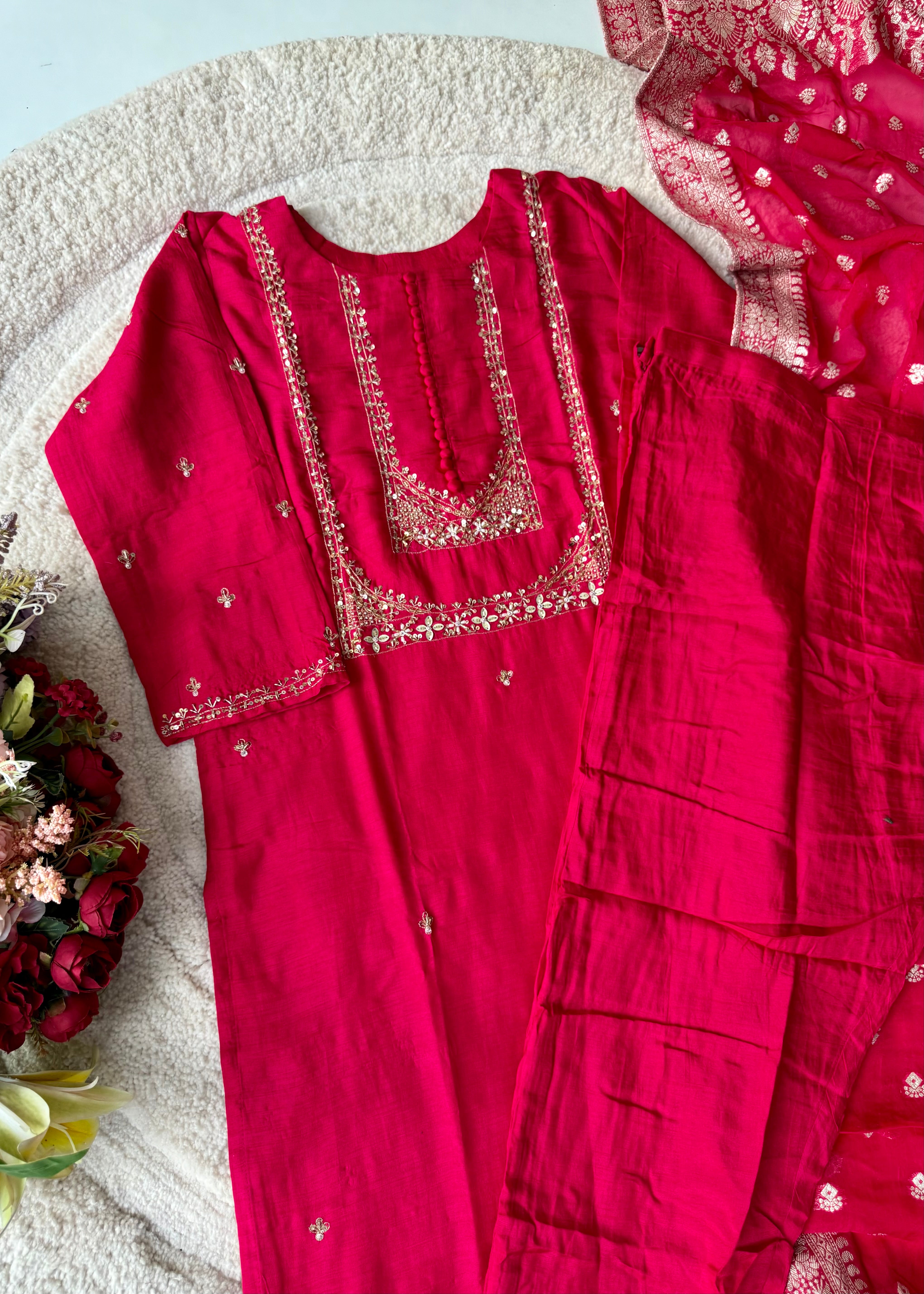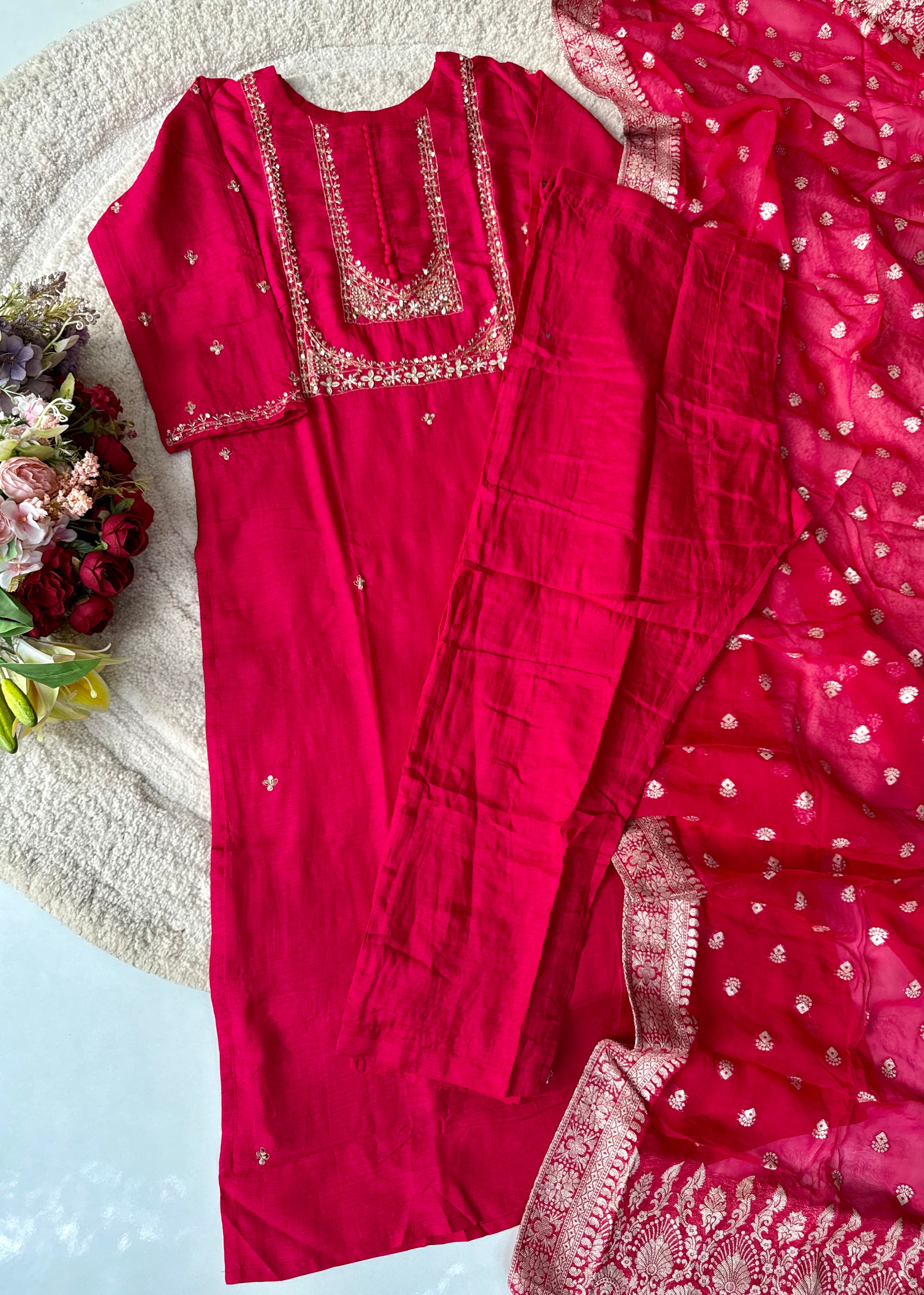 The kurta features delicate handwork on the yoke and sleeves, paired with a Dola silk bottom and a Banarasi weaving organza dupatta for a regal finishing touch.