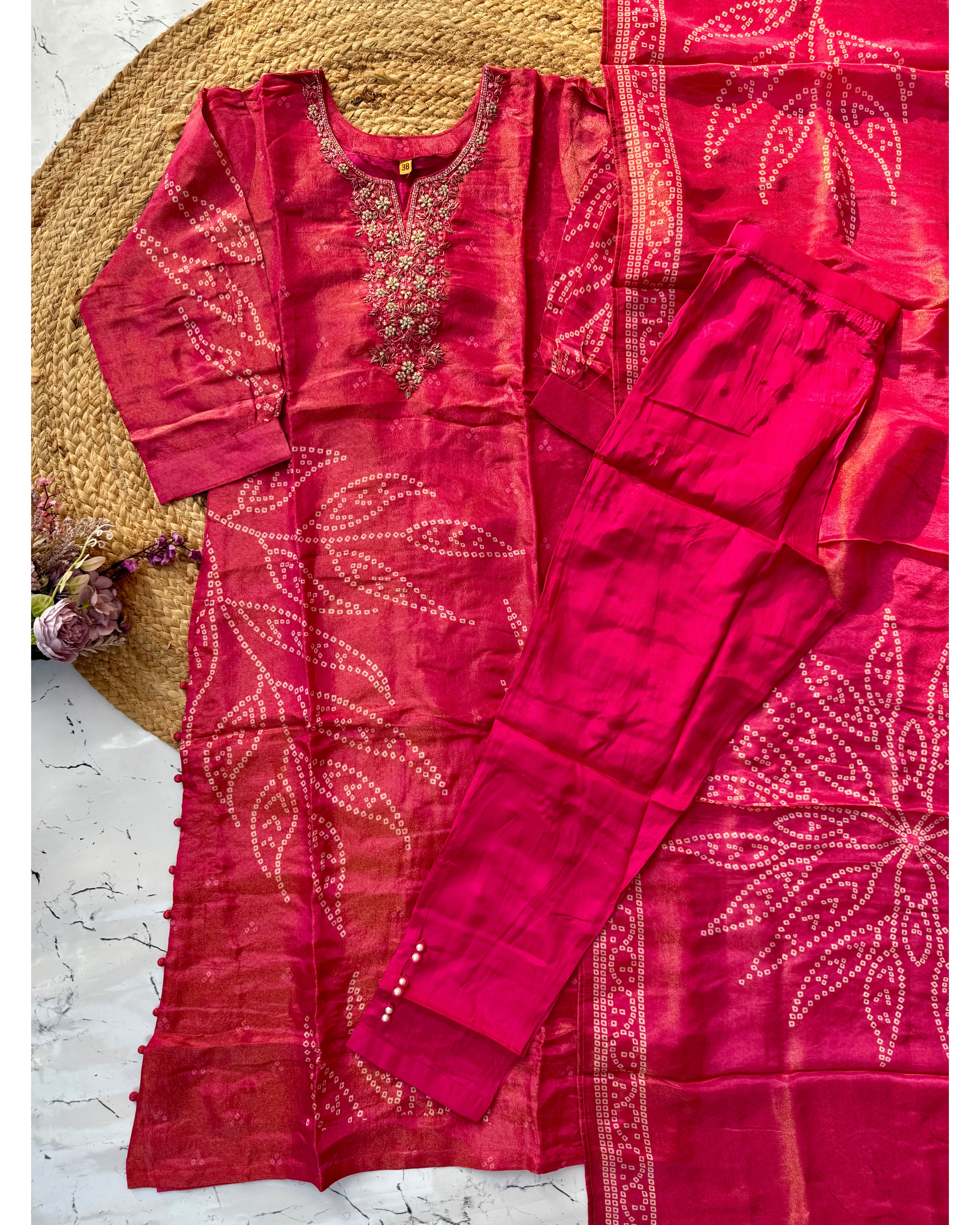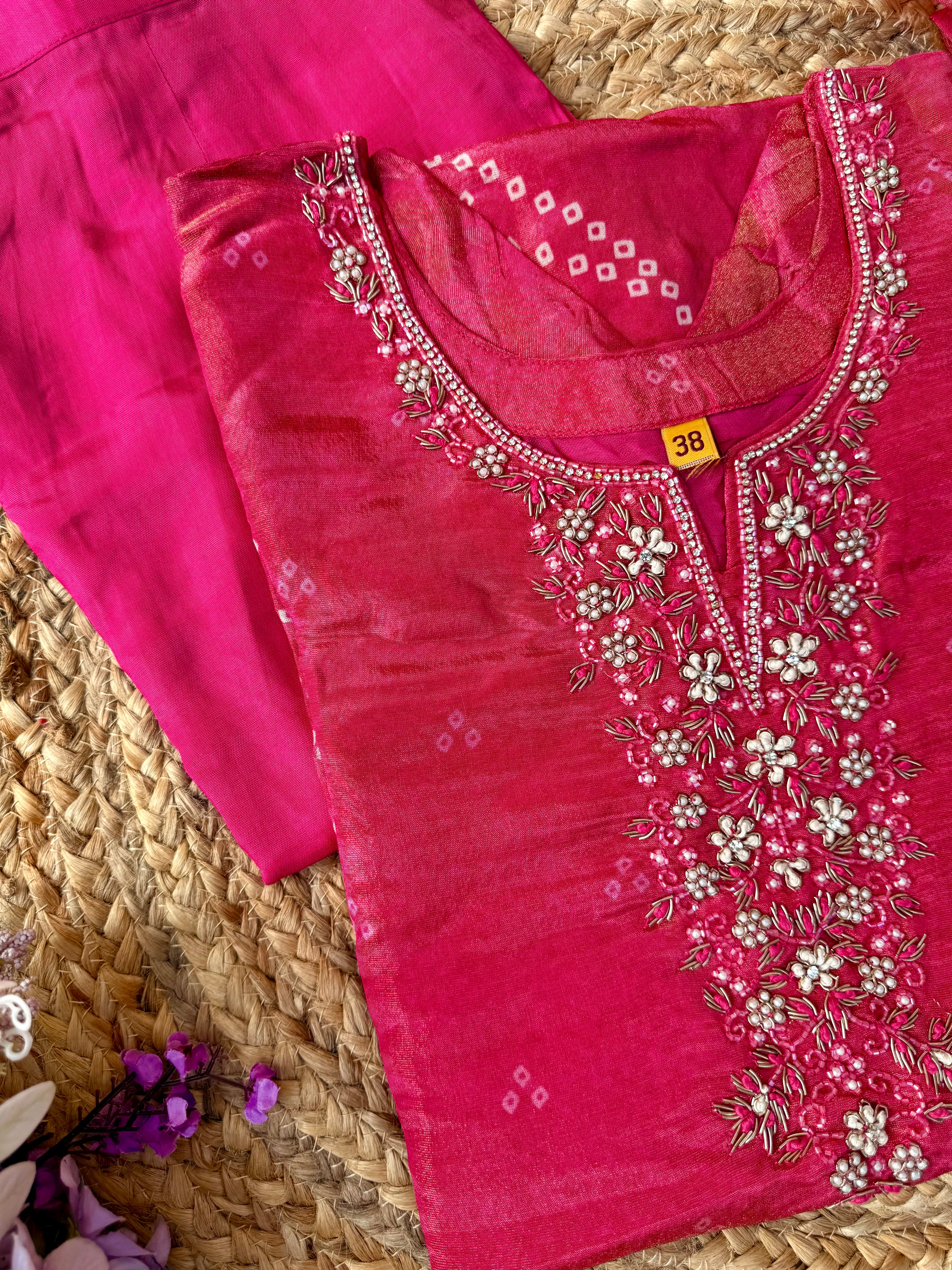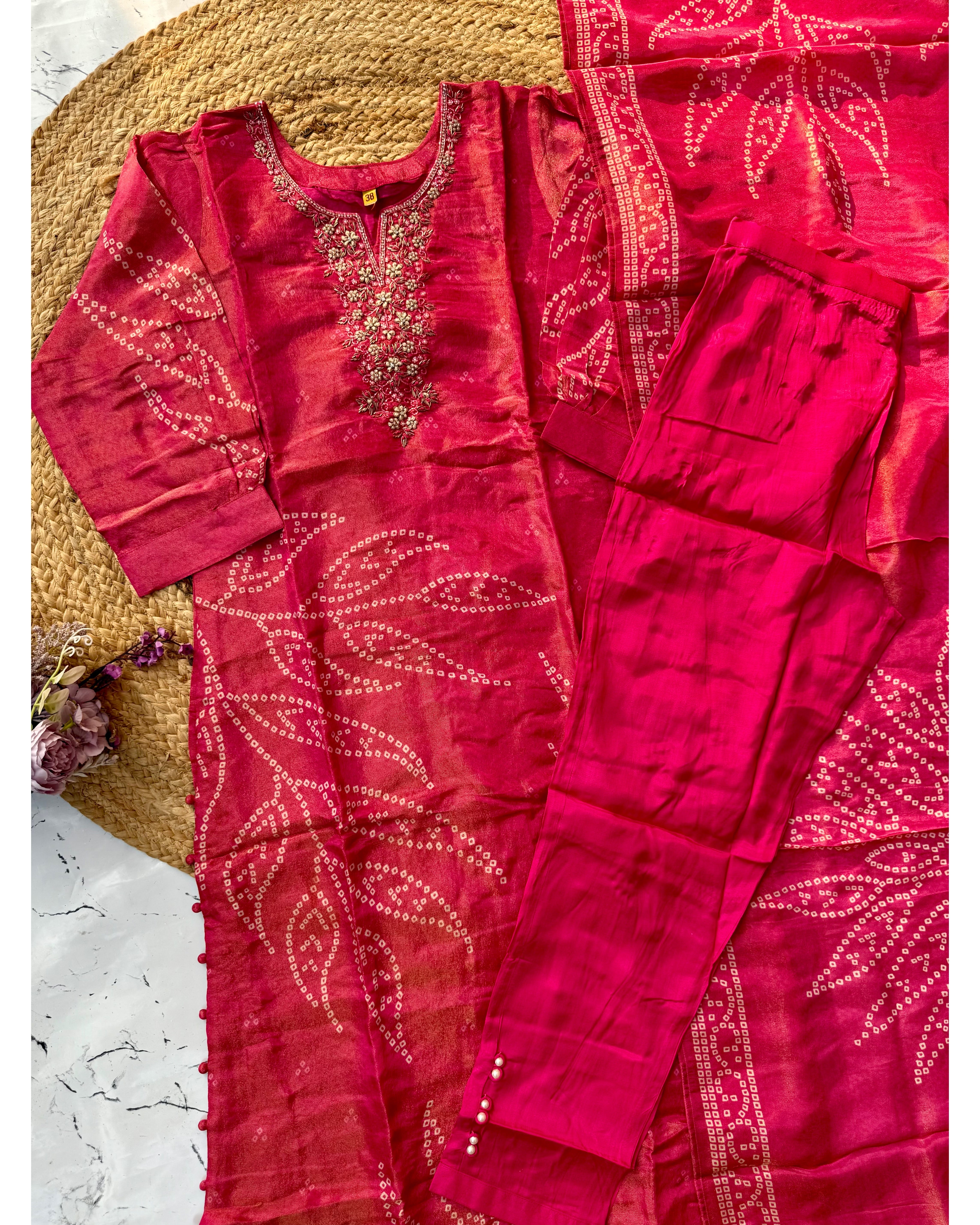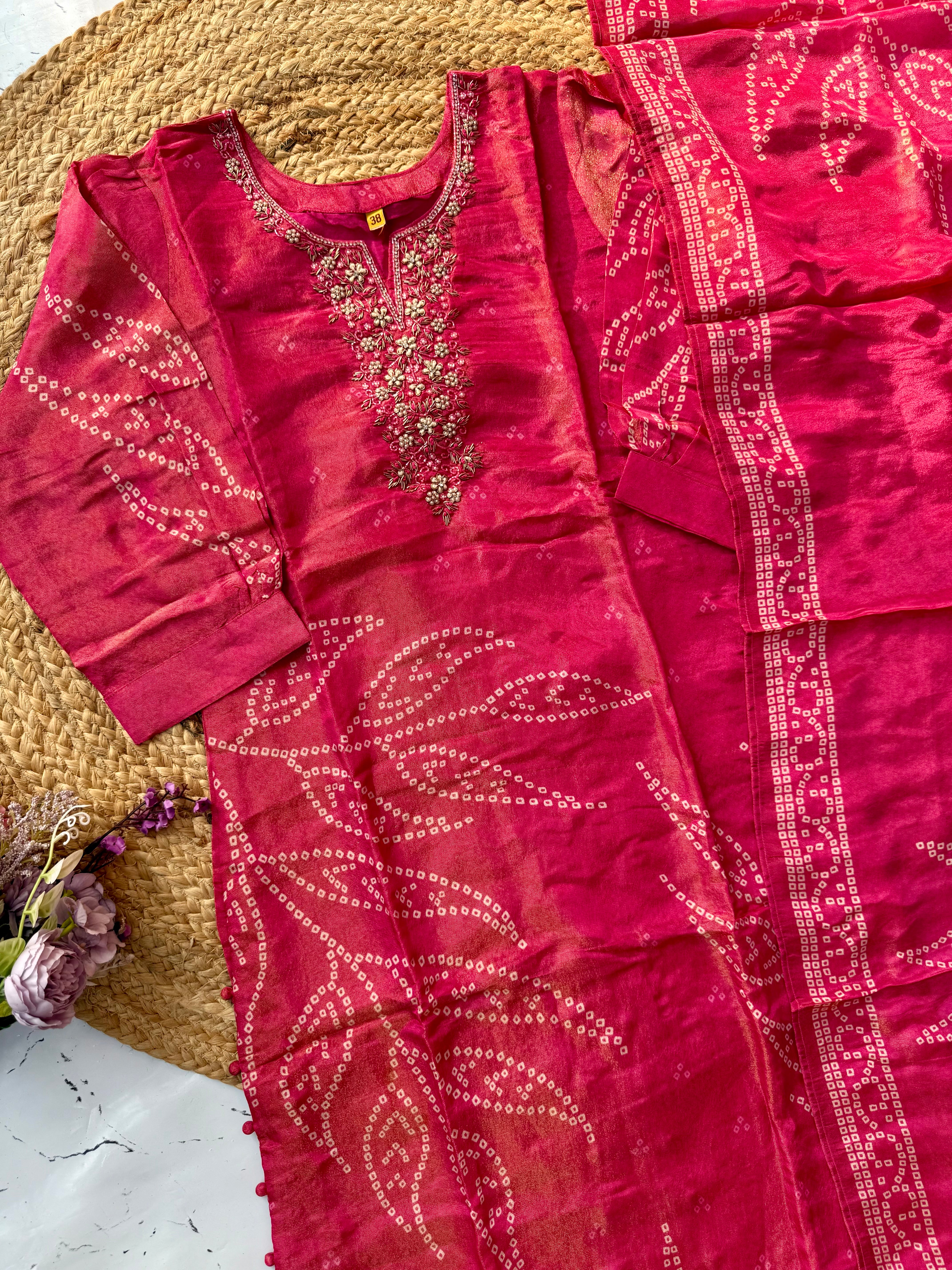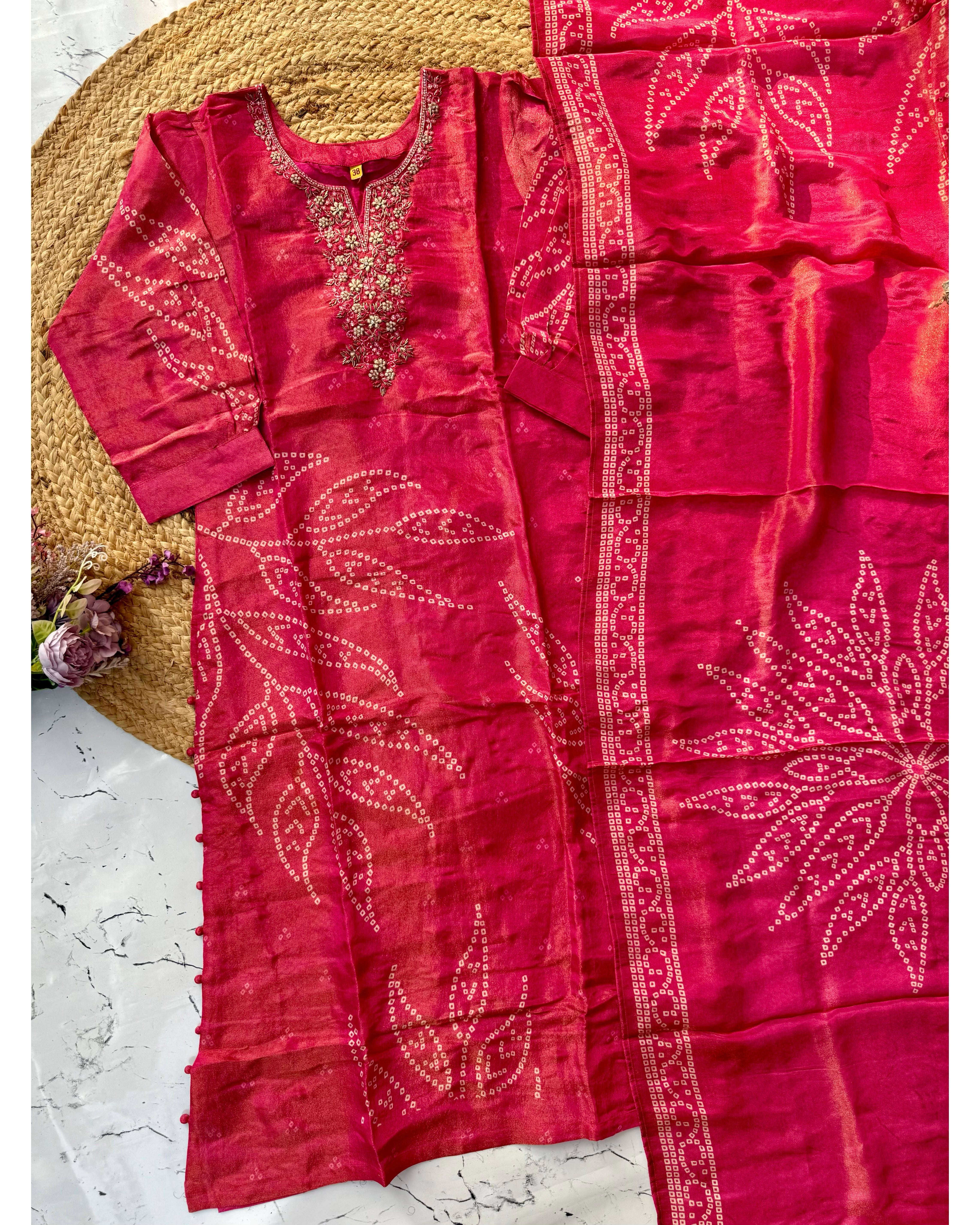 Printed Tissue silk set with handwork work on the yoke and front and back printed work of the kurta with a long Tissue printed dupatta with a silk bottom