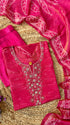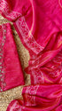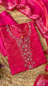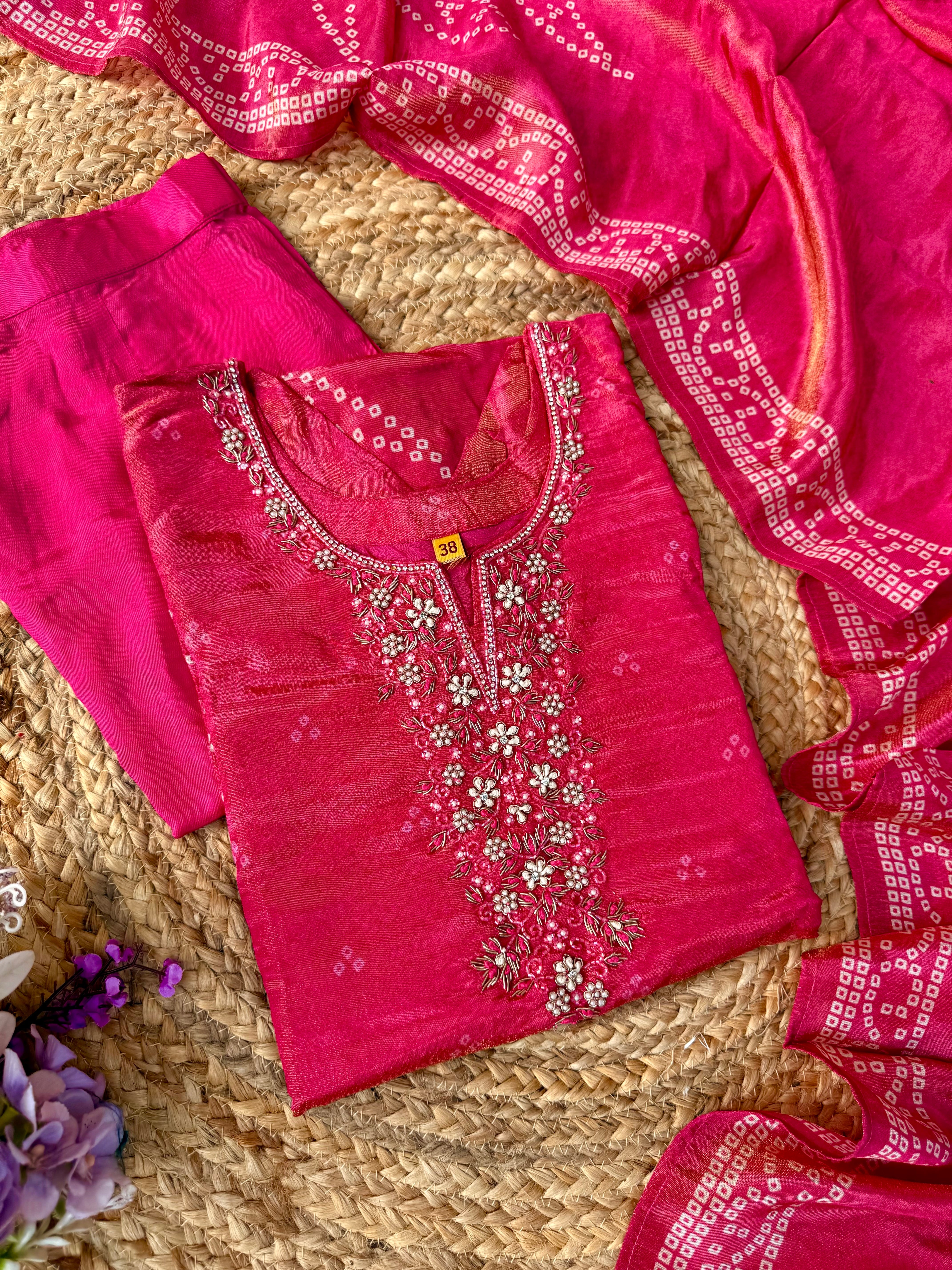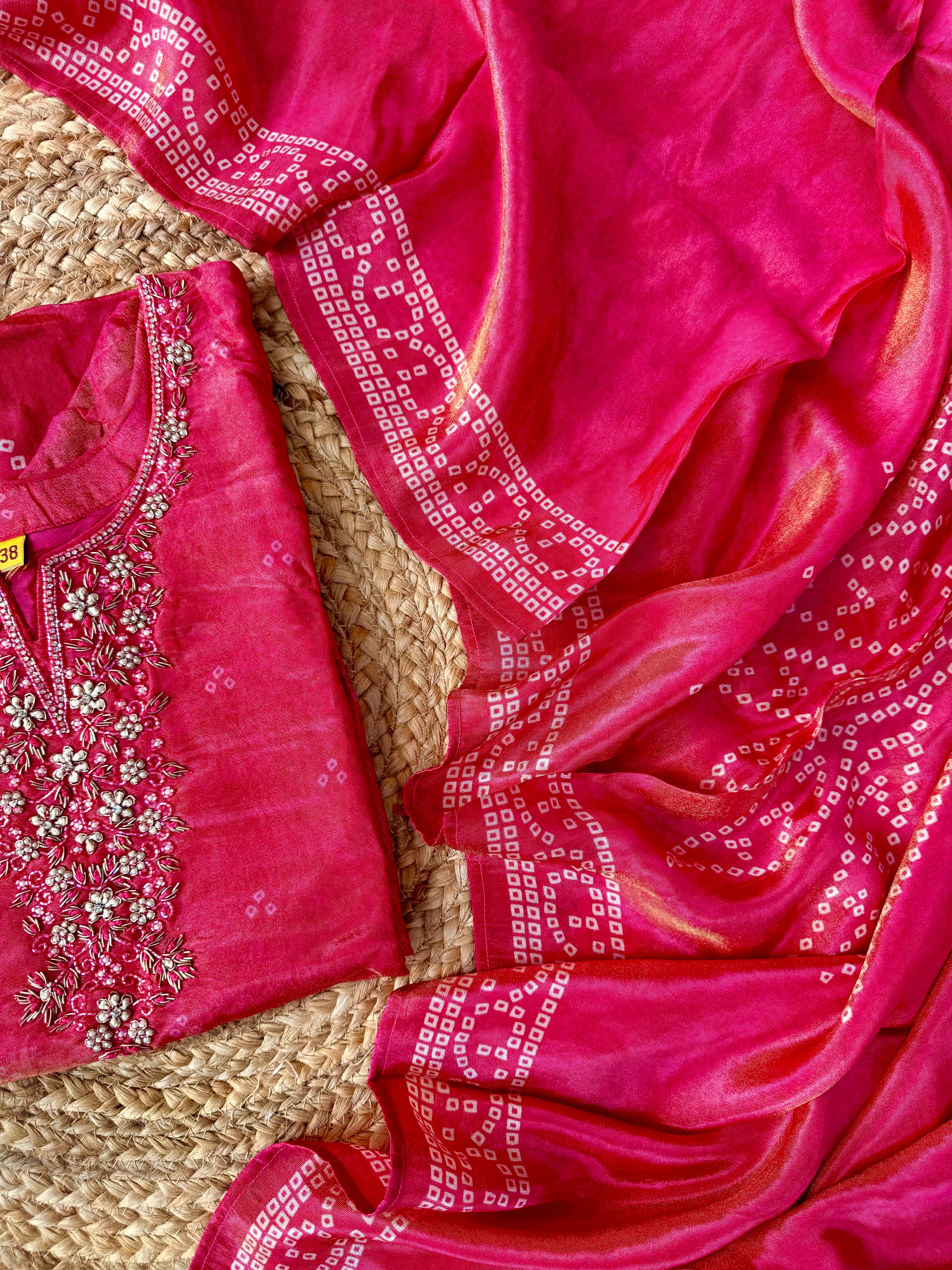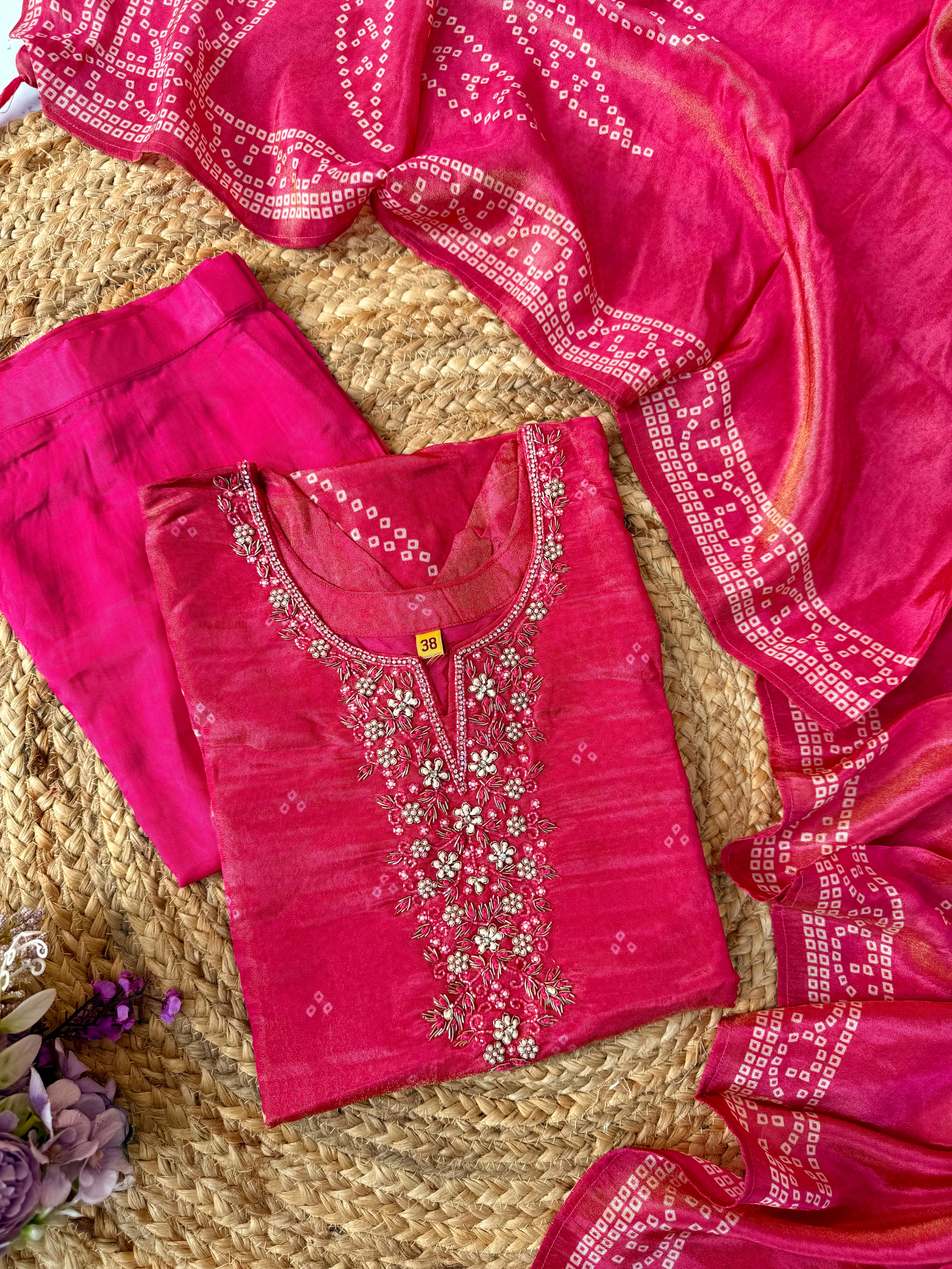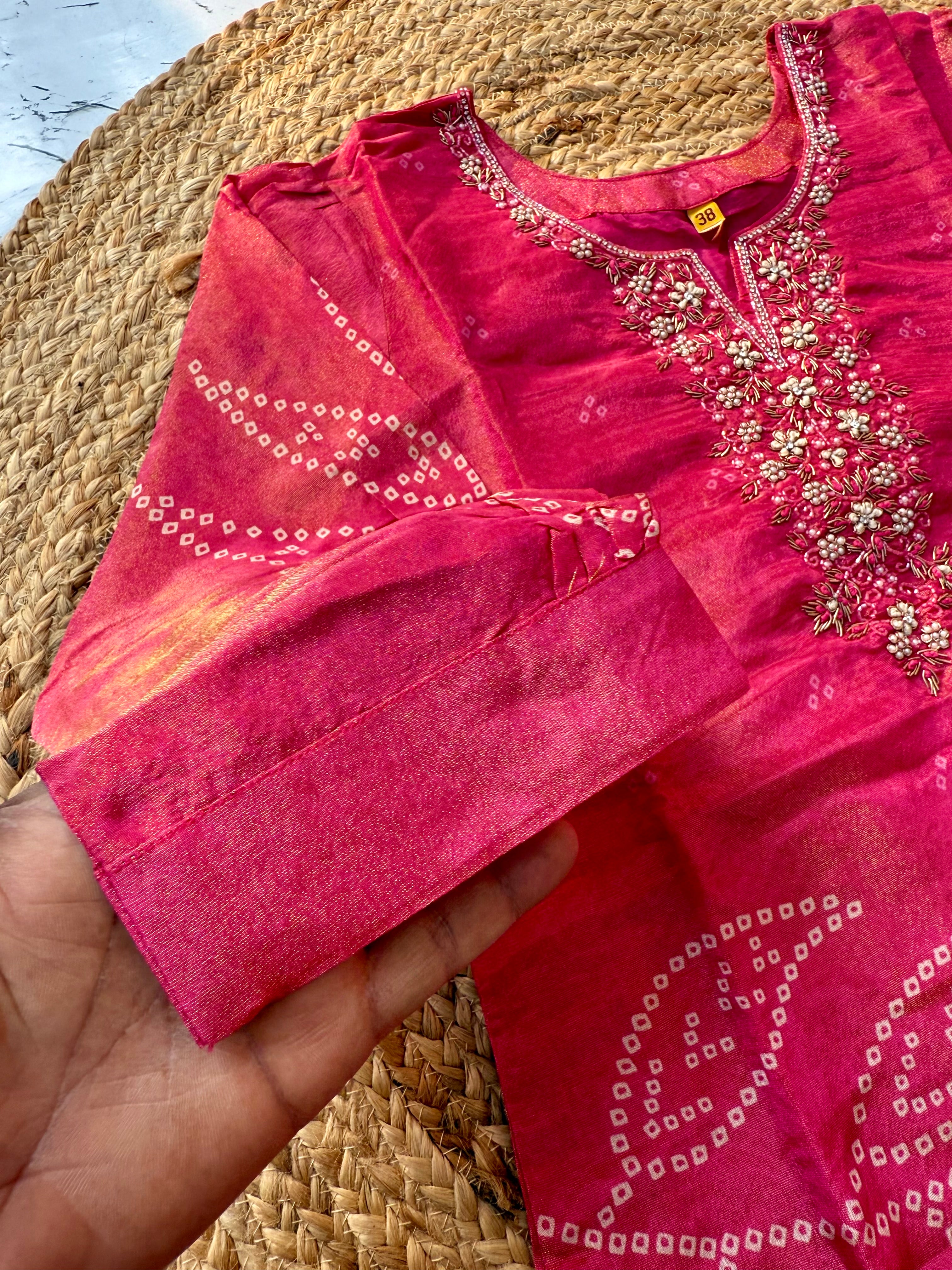 Printed Tissue silk set with handwork work on the yoke and front and back printed work of the kurta with a long Tissue printed dupatta with a silk bottom