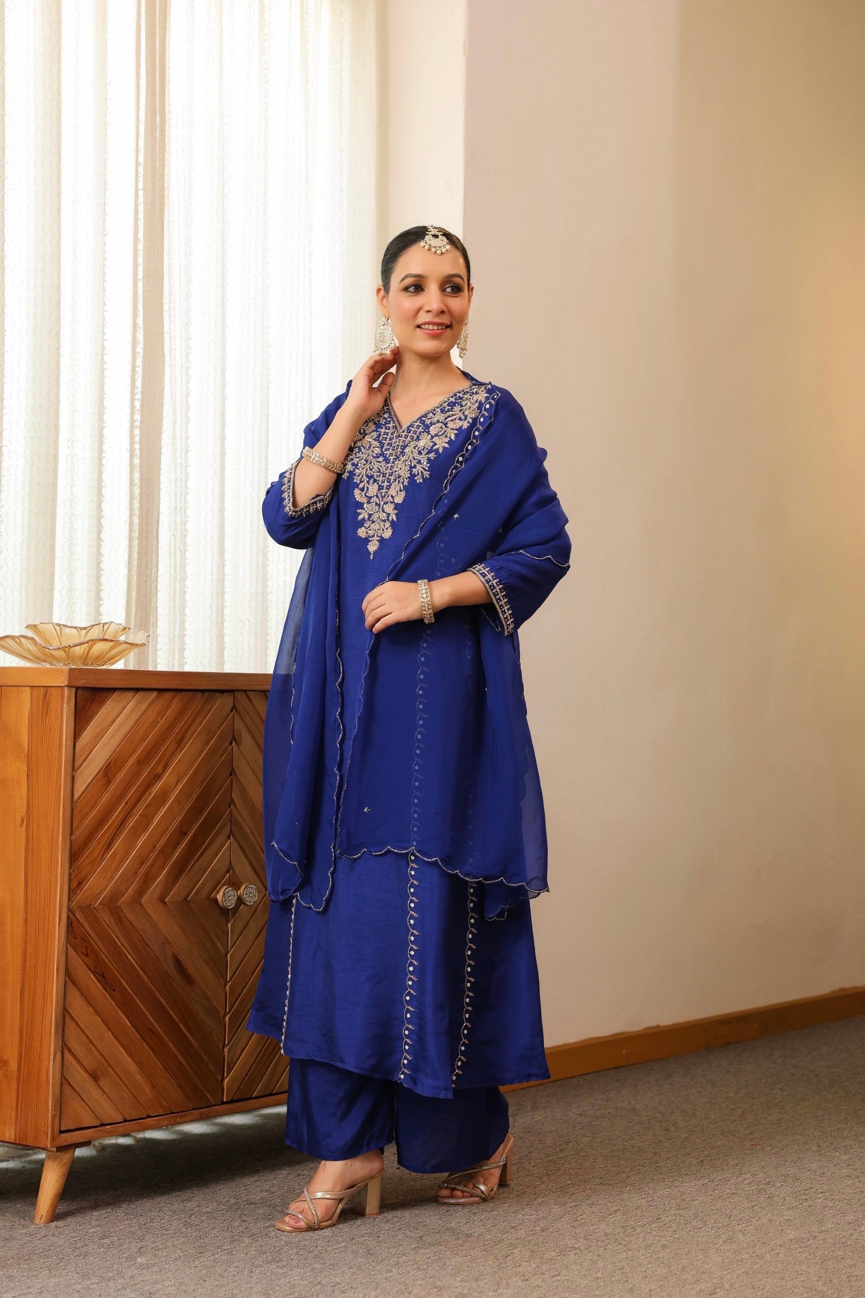 Aylize - Step into elegance with this luxurious Dola Silk Kurta Set adorned with intricate heavy handwork embroidery. The rich texture of silk blended with detailed embellishments makes this outfit a perfect choice for weddings, festive occasions, and grand celebrations.