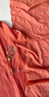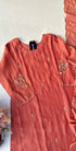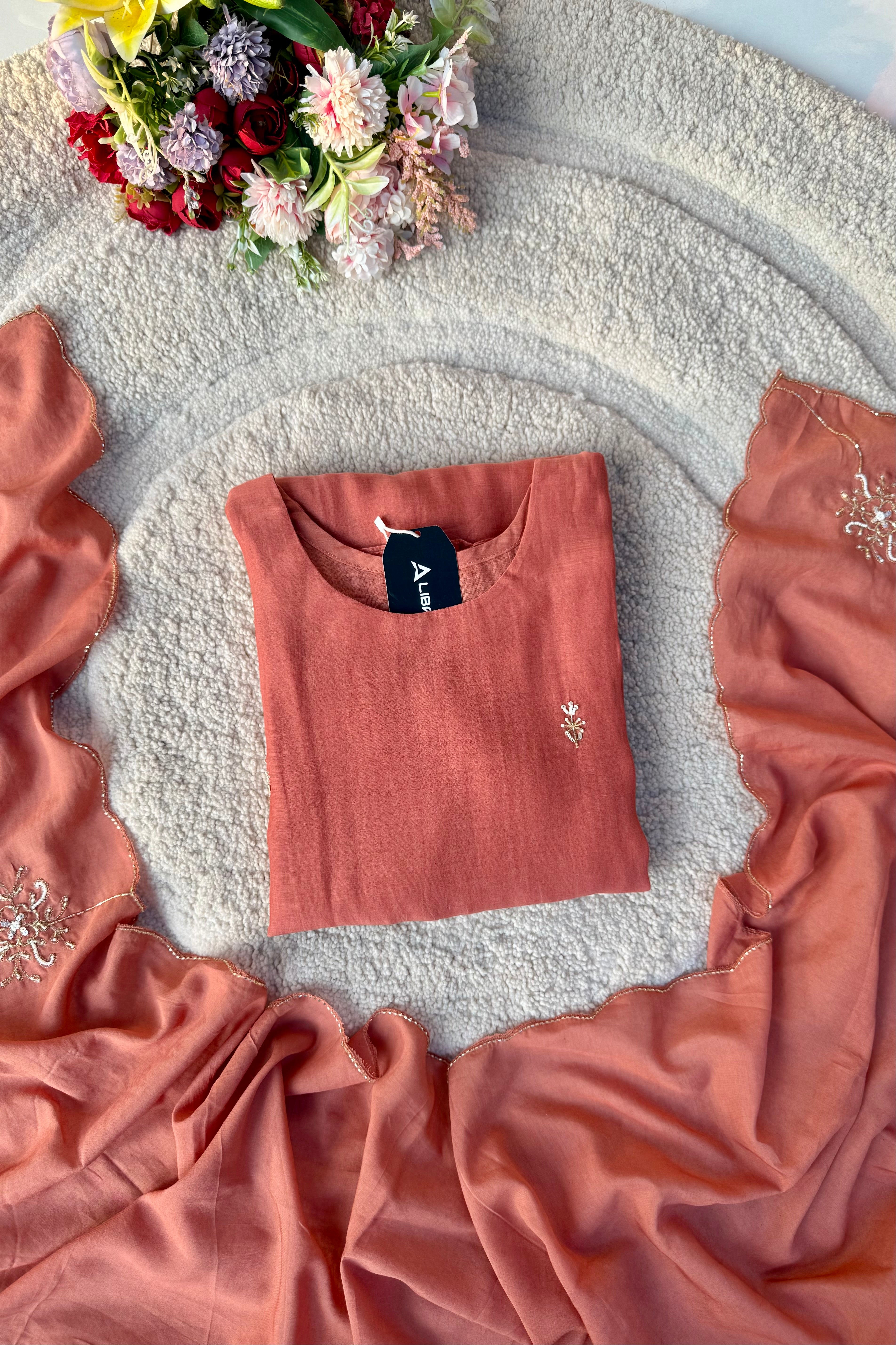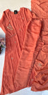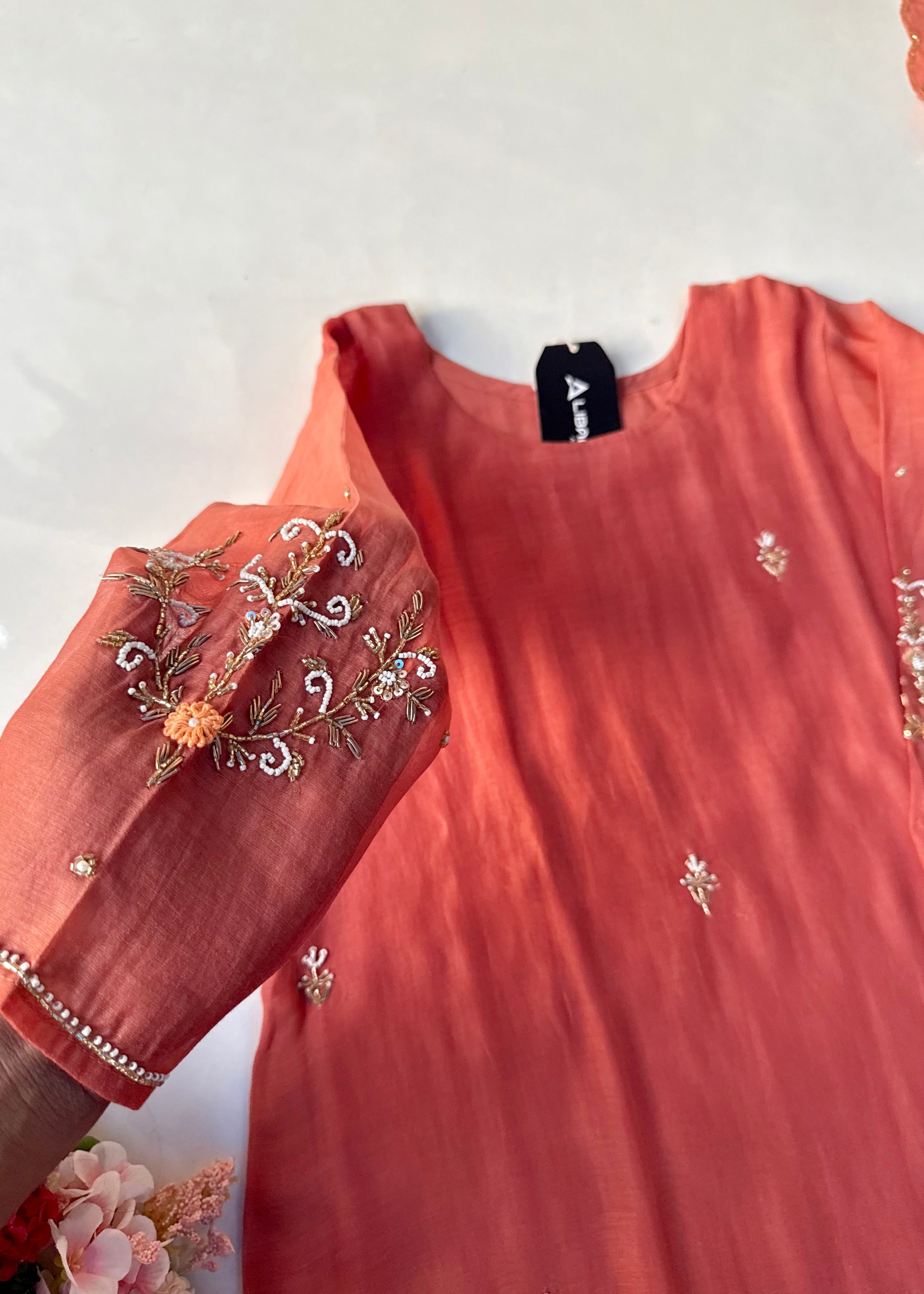 Beautiful premium mul chanderi kurti with Beautiful handwork attached all over the top with mul cotton lining, comfortable mul chanderi pants with cotton lining and full length soft mul chanderi dupatta covered with beautiful hand work.